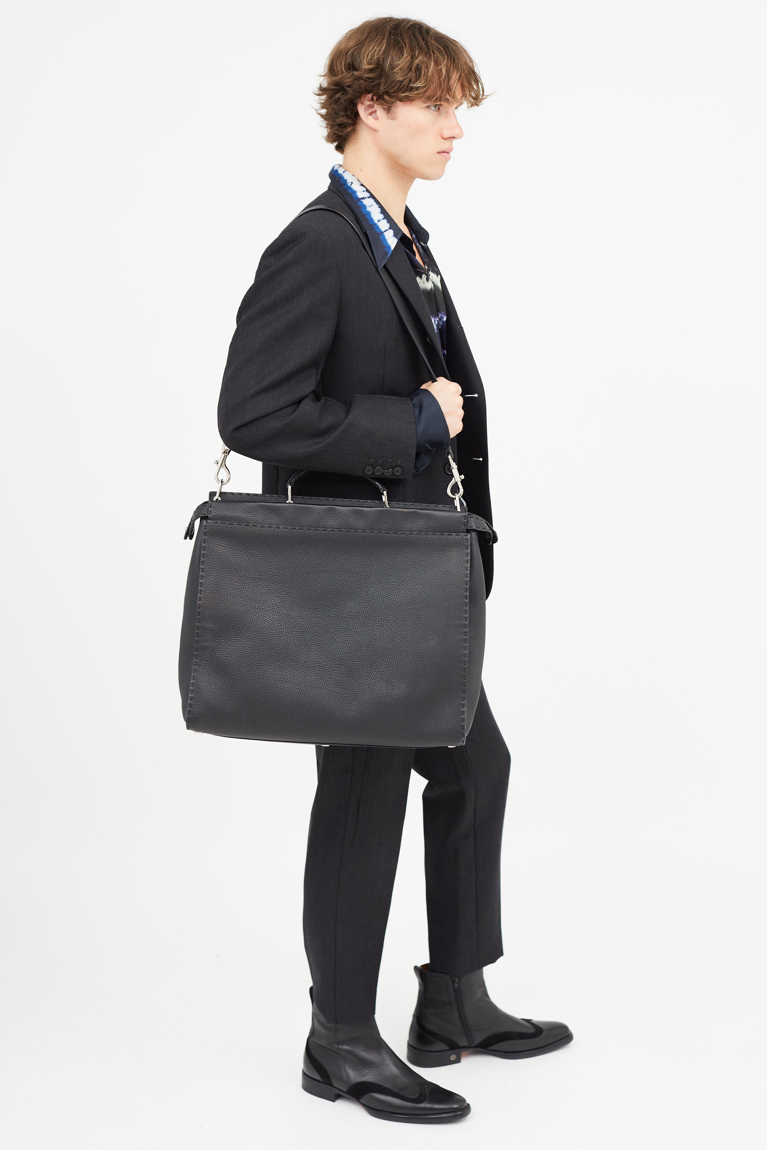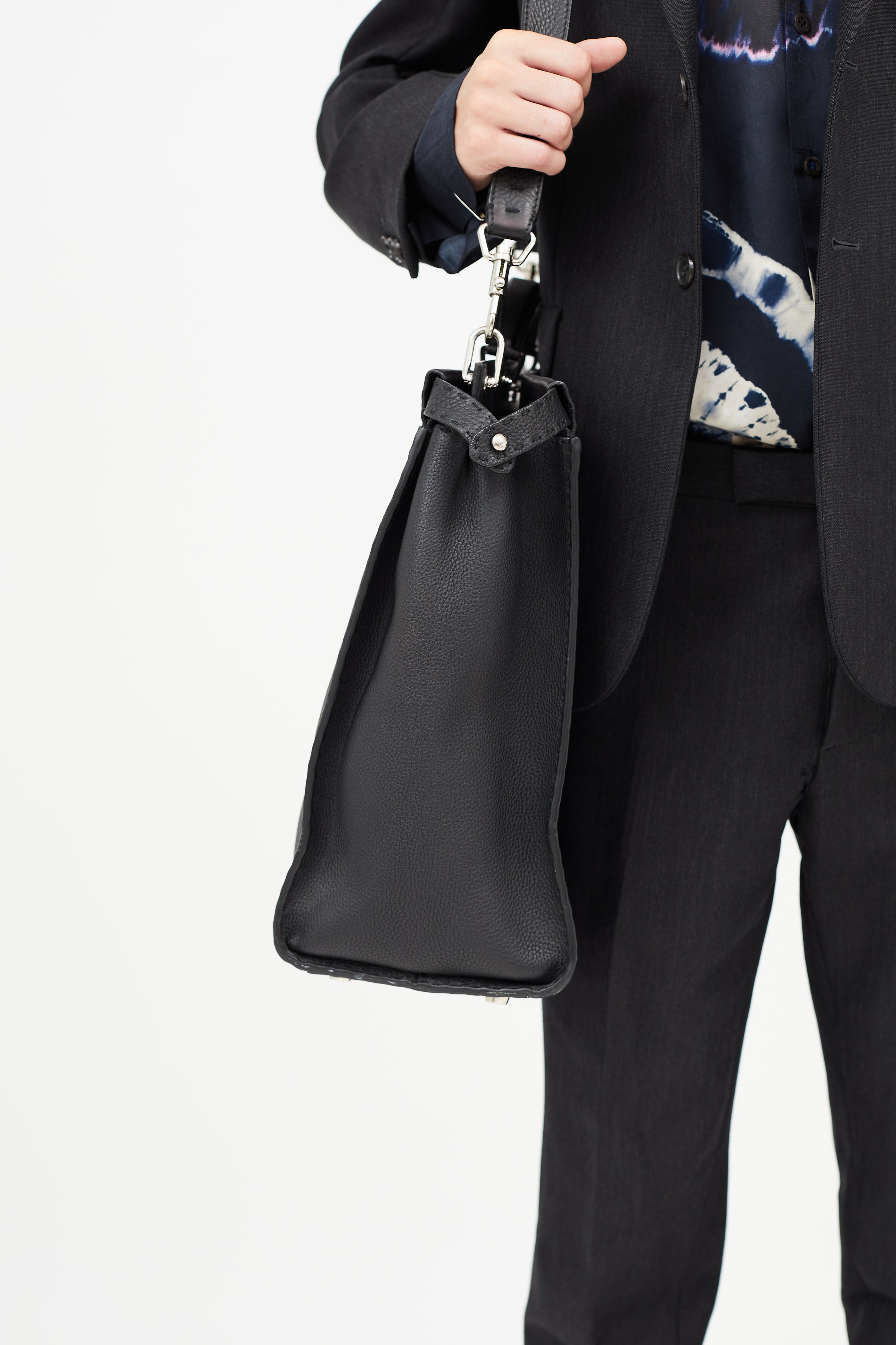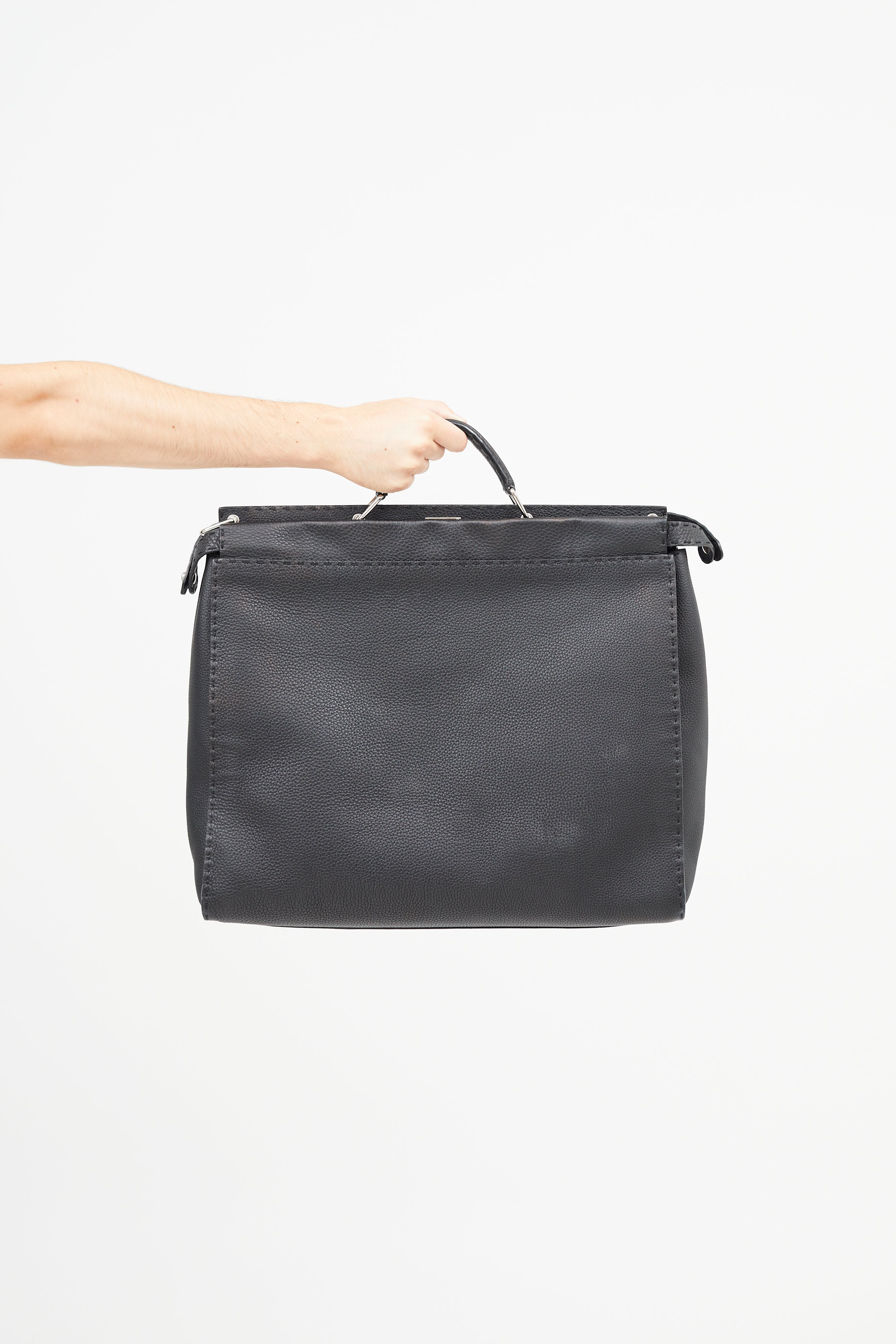 Pre-owned Fendi black Monster Selleria Peekaboo bag featuring structured top handle, detachable shoulder strap, tonal stitching throughout, clasp closure at front pocket, zip closure at back pocket, lined main compartment, and interior zip pocket. Comes with original dust bag. Entrupy Certificate included.
