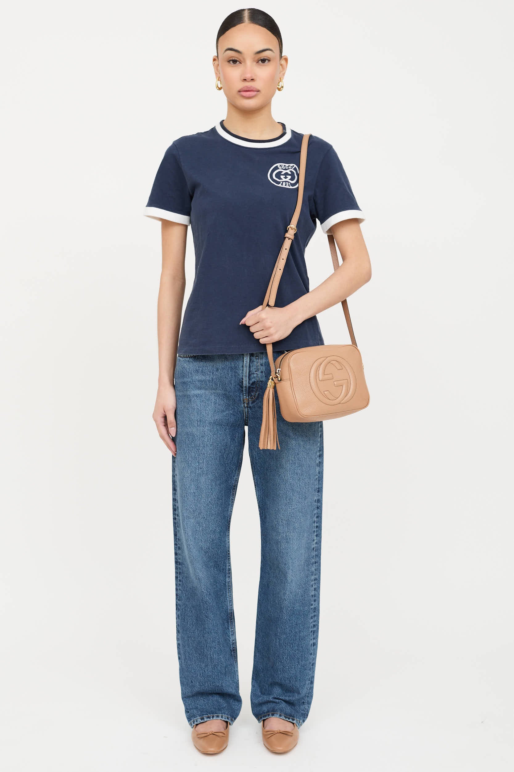 Pre-owned Gucci beige Soho Disco bag featuring interlocking GG embroidered at front, gold tone hardware, top zip closure with tassel charm, adjustable shoulder strap, and one lined main compartment with two slip pockets.