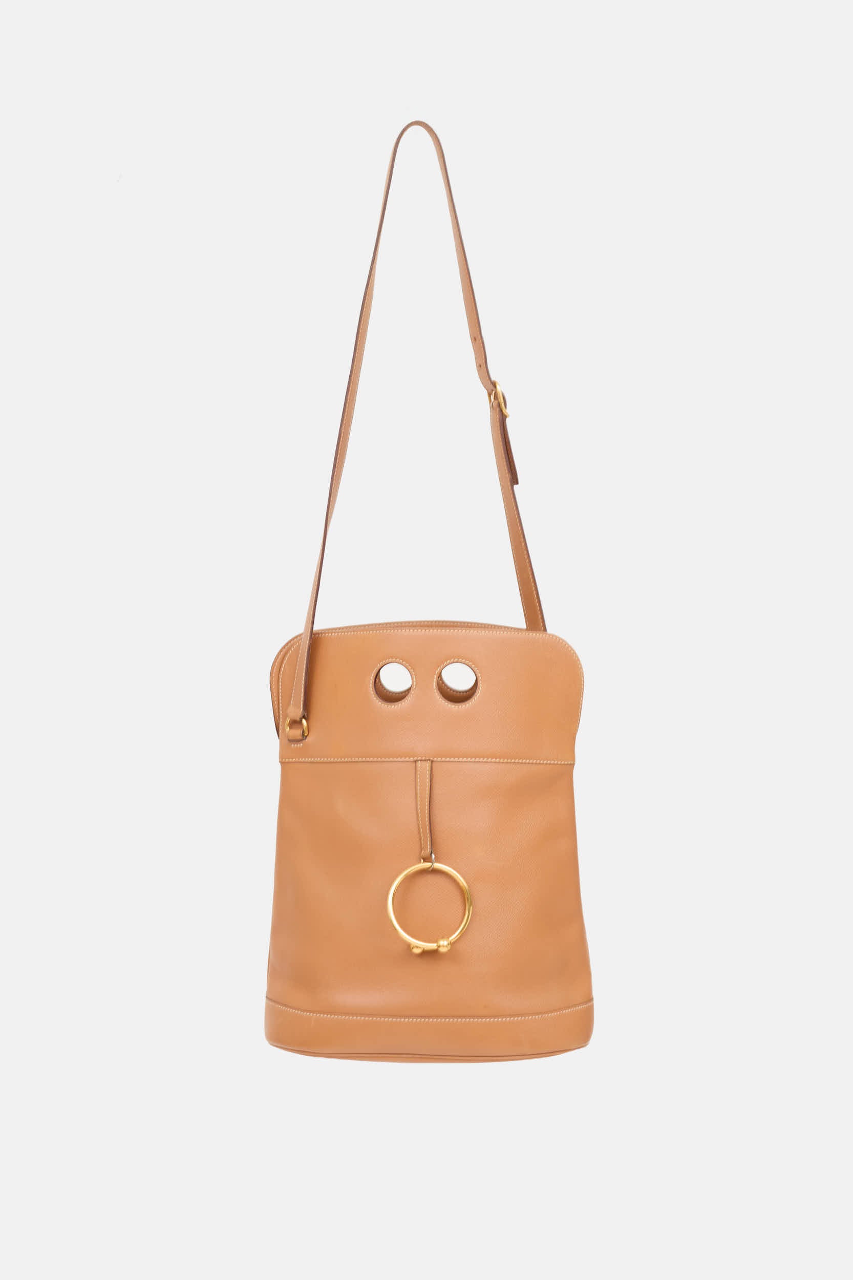 Pre-owned Hermès brown vintage 1998 Torque Crossbody bag featuring Courchevel leather body, crossbody strap with adjustable buckle, dual circular cut outs at opening, gold tone ring at face, and one main compartment with canvas lined walls and leather base. Includes original dust bag.