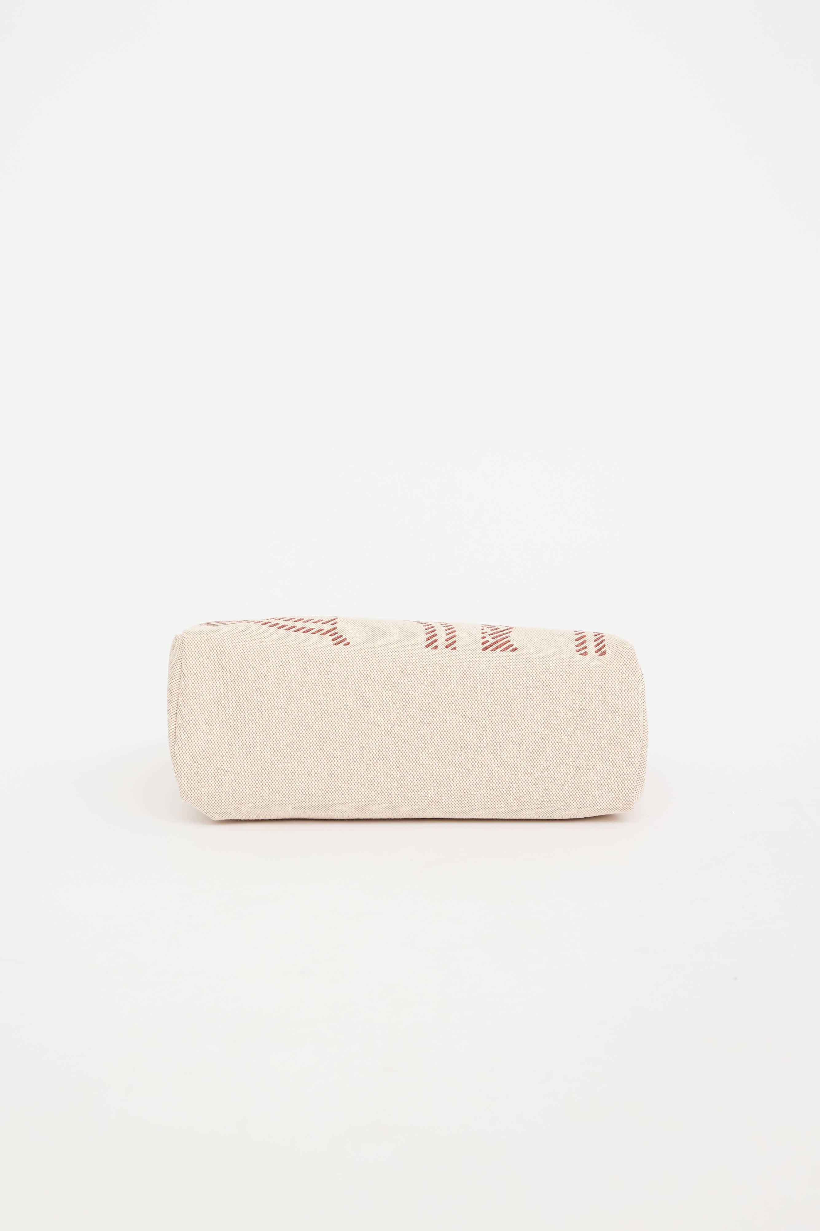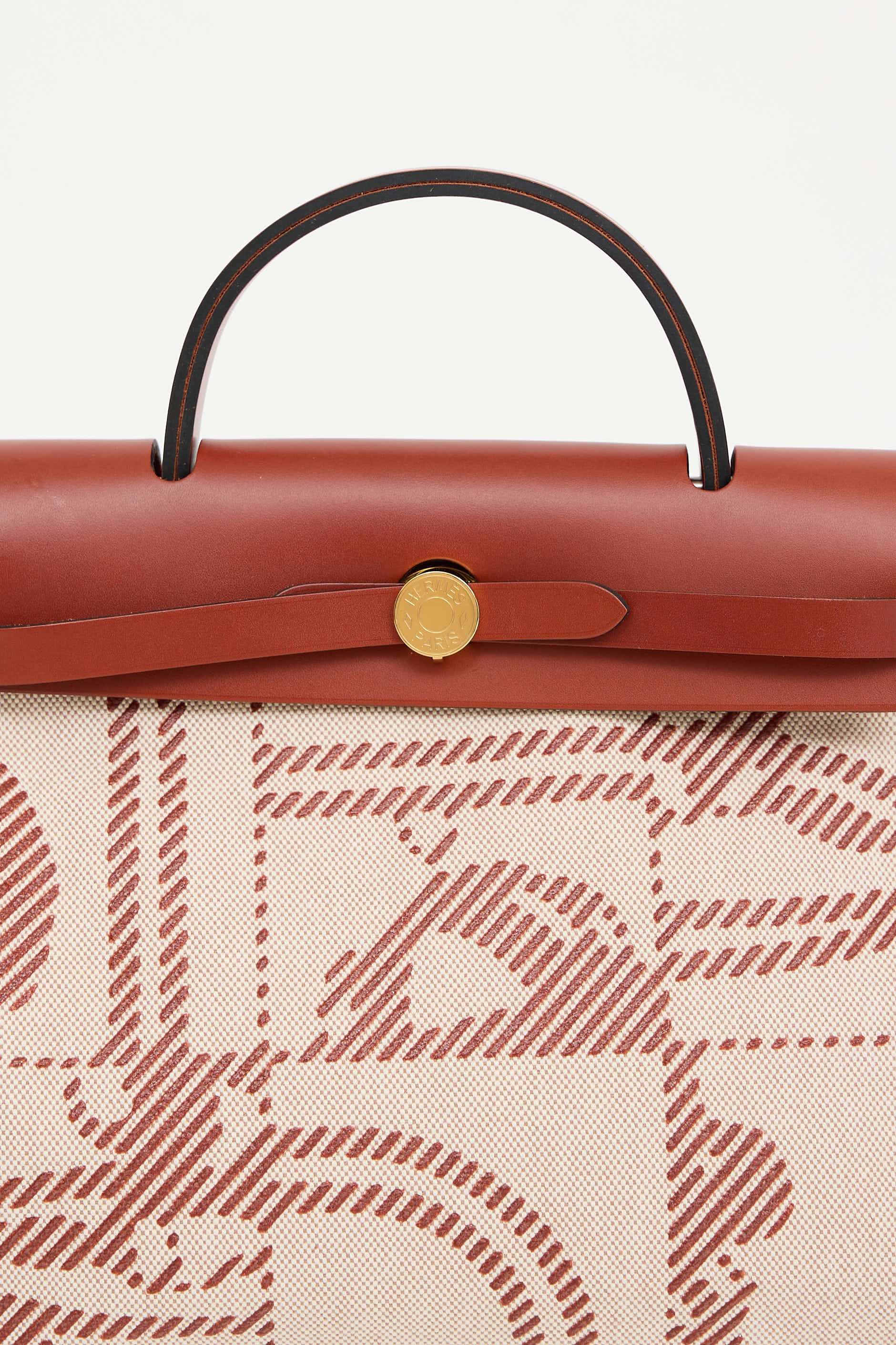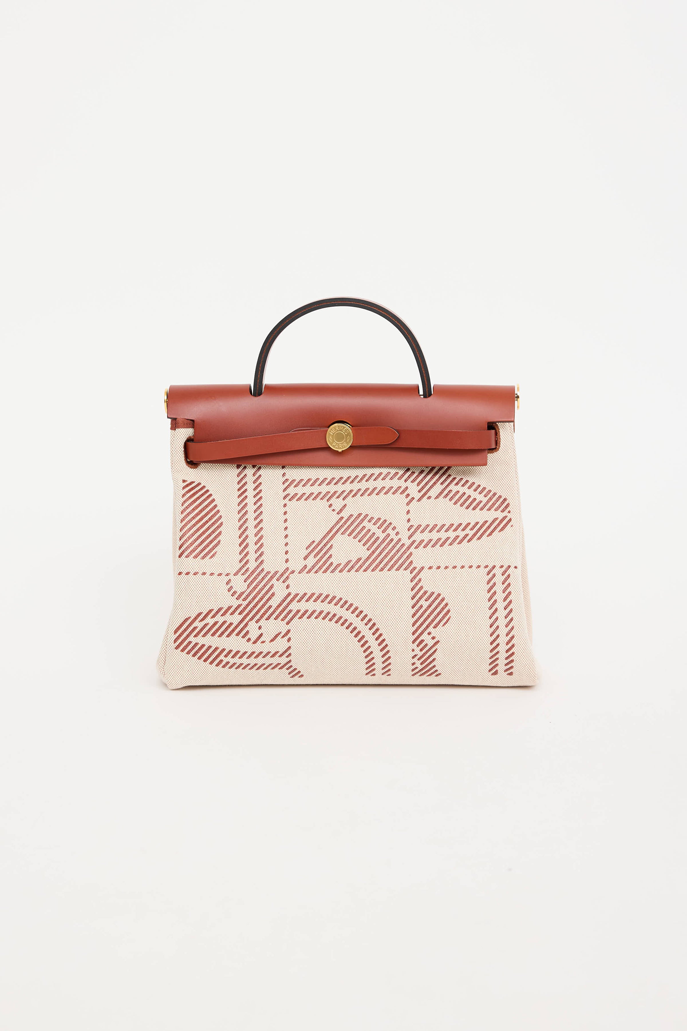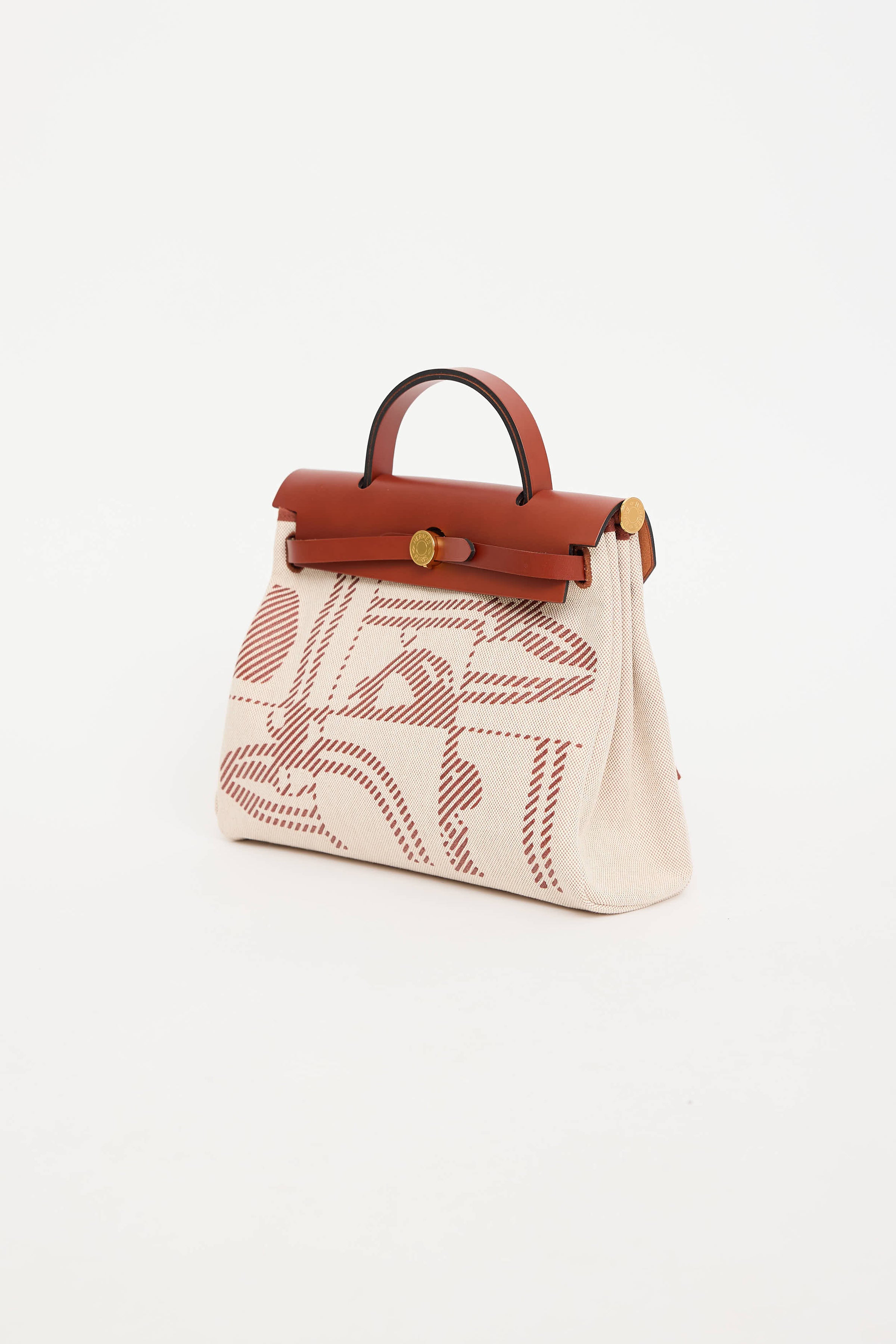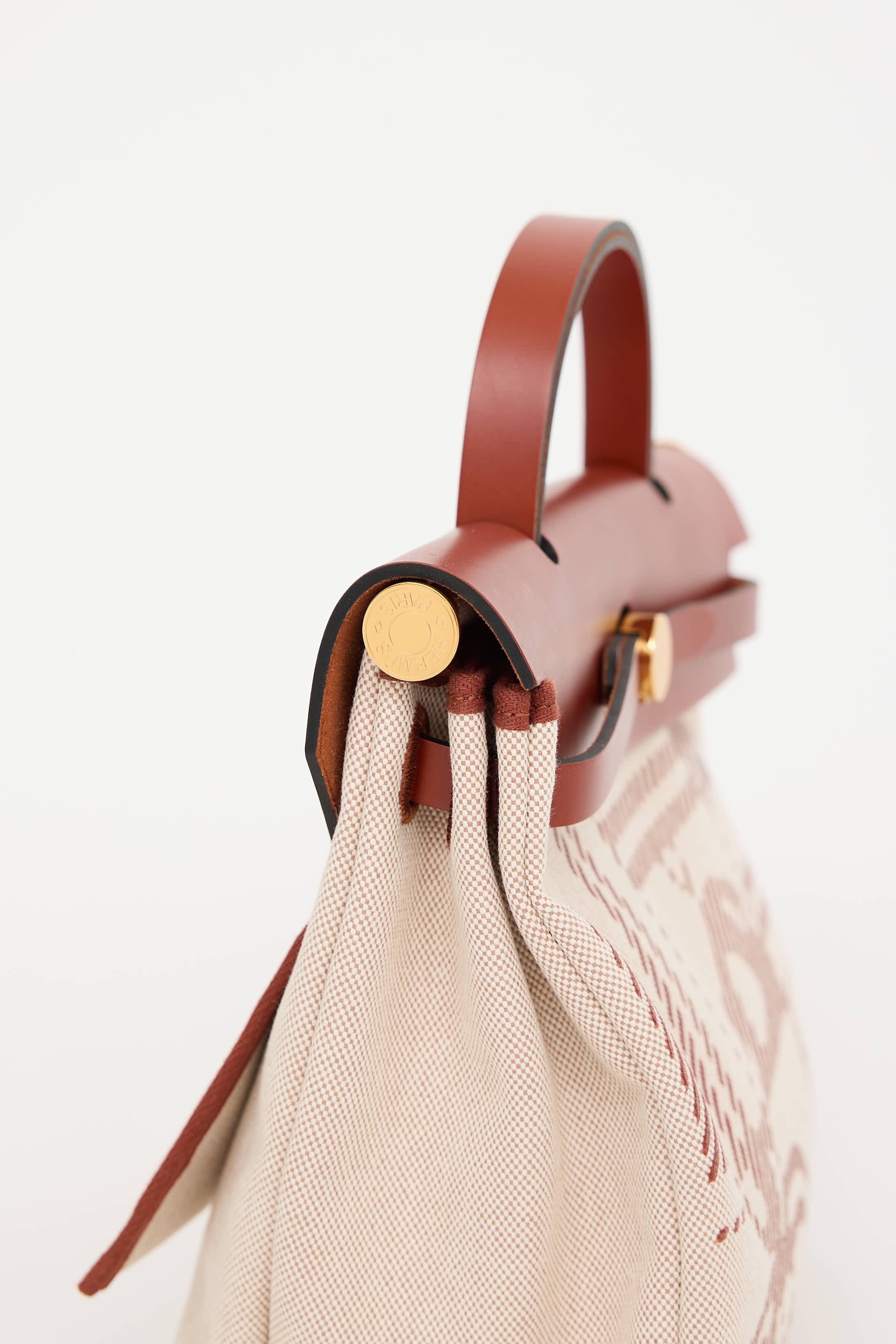 Pre-owned Hermès 2022 beige HerBag 31 bag featuring a canvas exterior, burgundy Brides de Gala pattern at face, detachable Fauve Hunter leather top flap, detachable top handle and shoulder strap, gusseted sides with Clou de Selle closure, one main compartment, stamped logo at back, engraved gold hardware and saddle studs, back zip pocket, detachable matching pouch, and clochette with padlock and key.