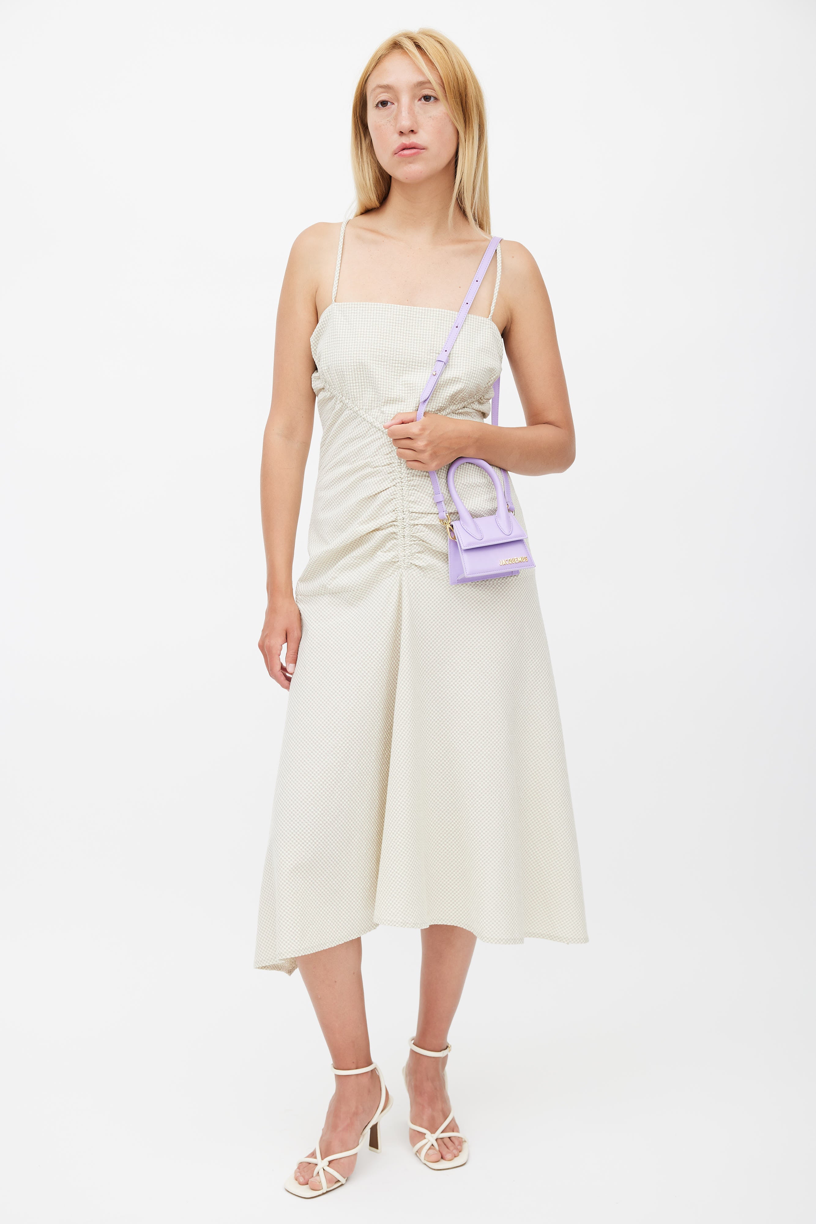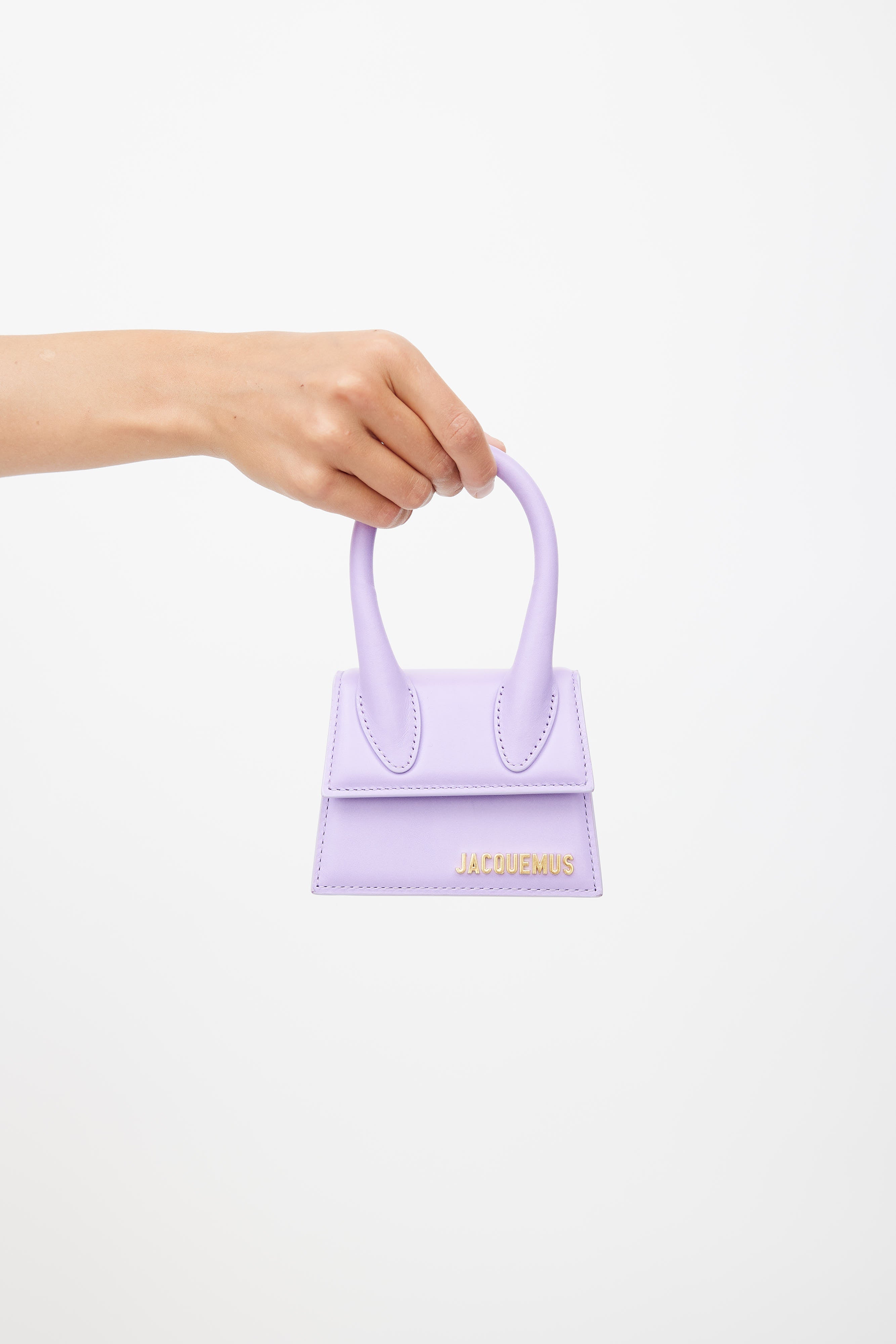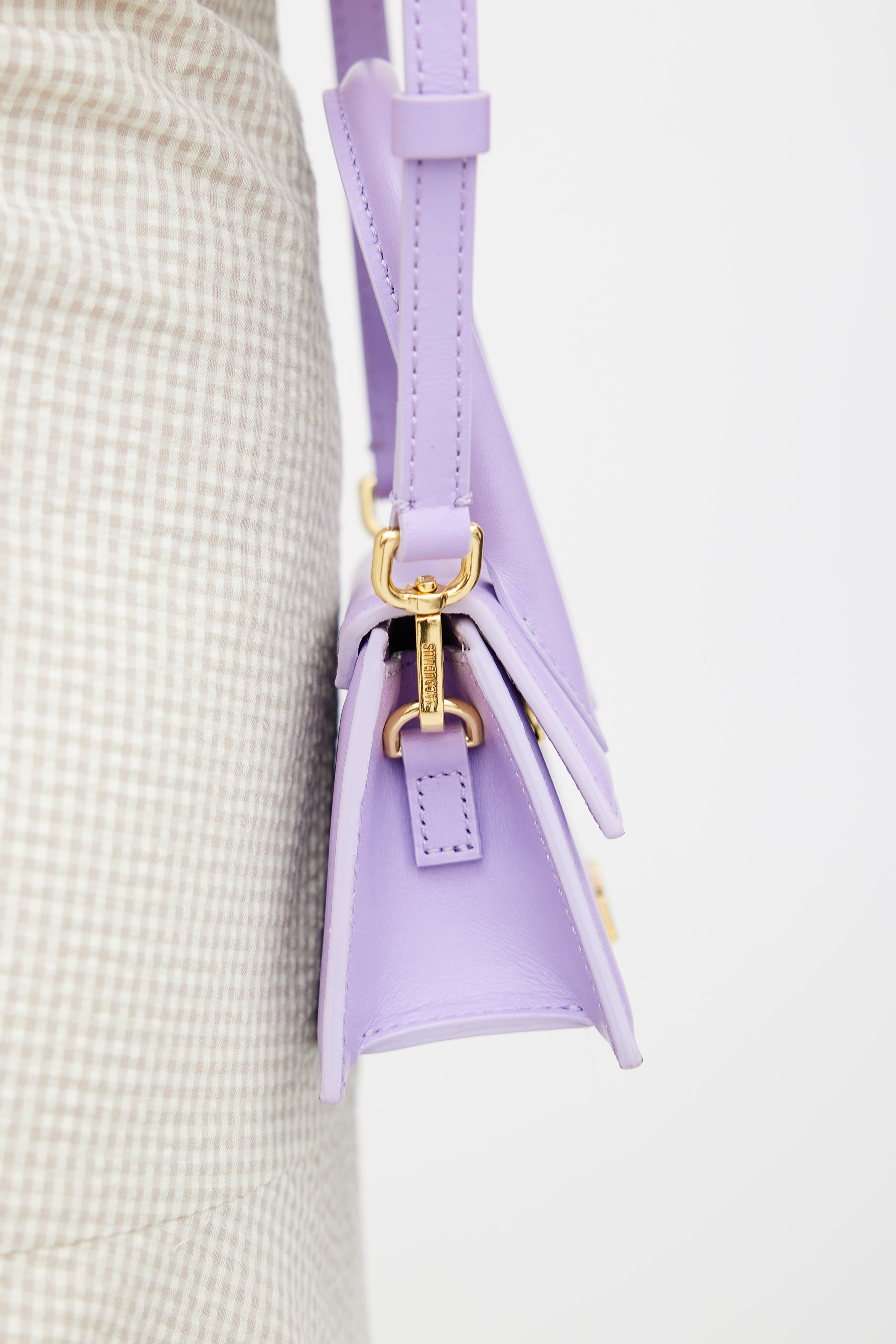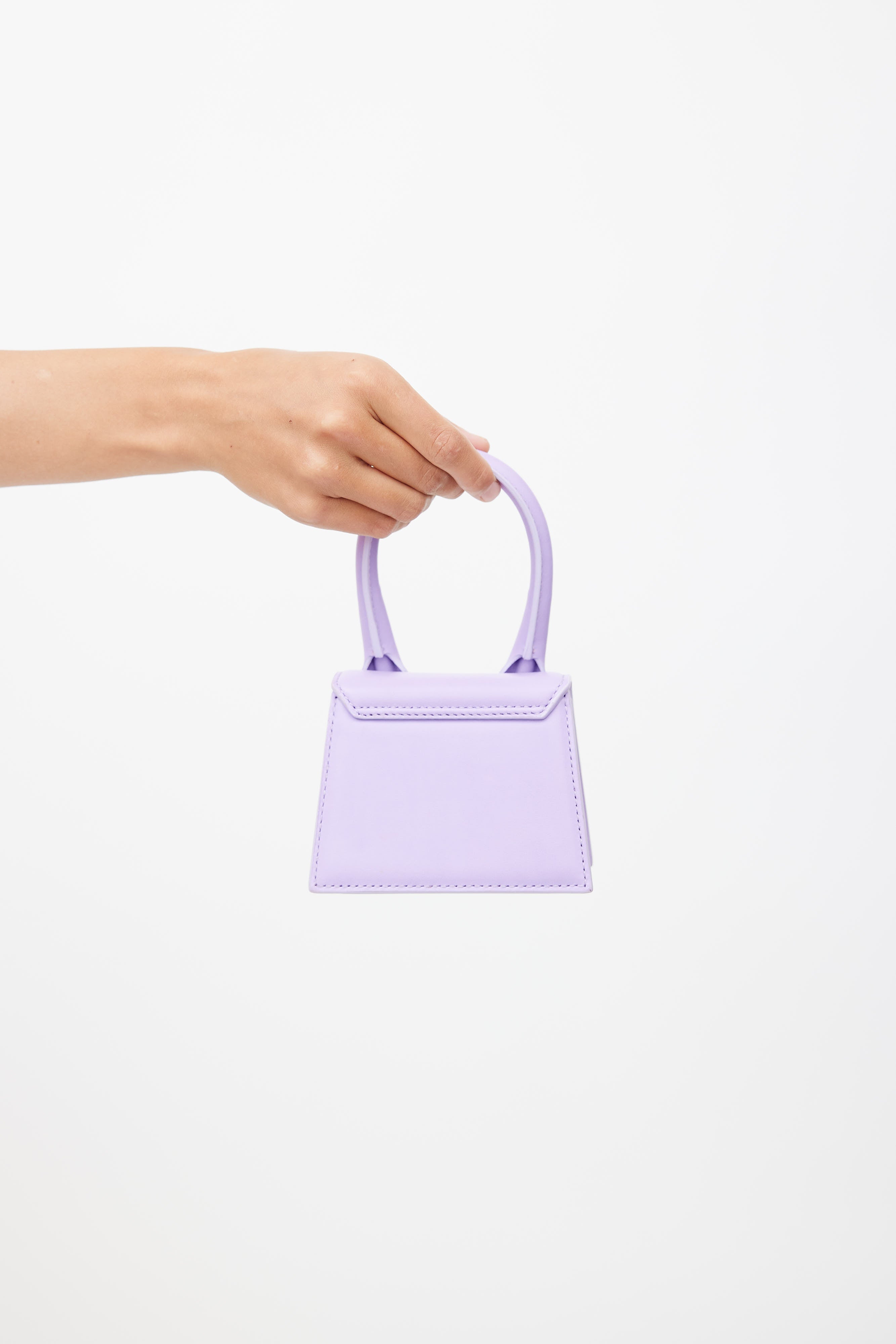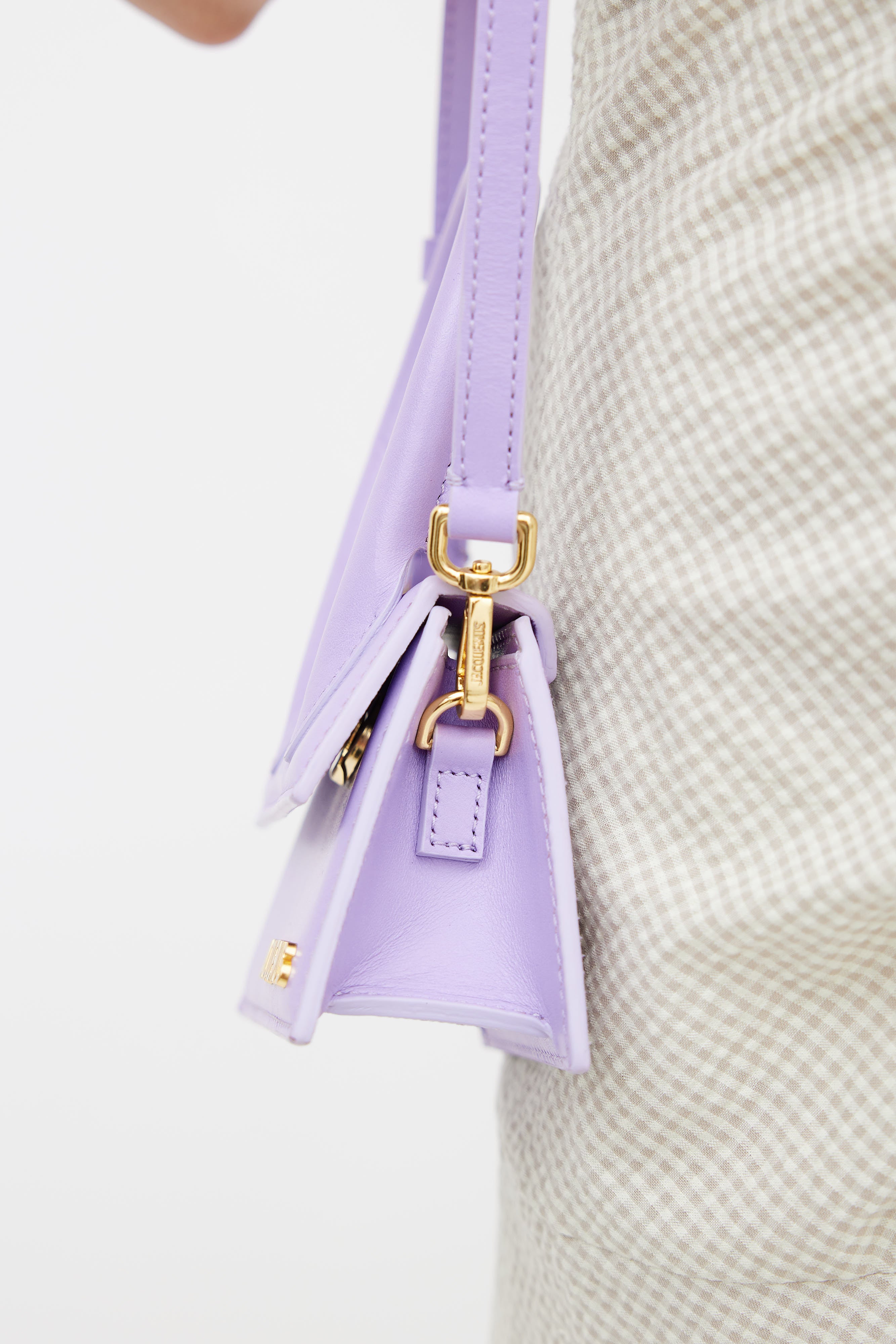 Pre-owned Jacquemus pastel purple Le Chiquito bag featuring exaggerated structured top handle, gold tone logo hardware at face, magnetic button closure, lined main compartment with logo tab, and detachable shoulder strap. Comes with original dust bag.