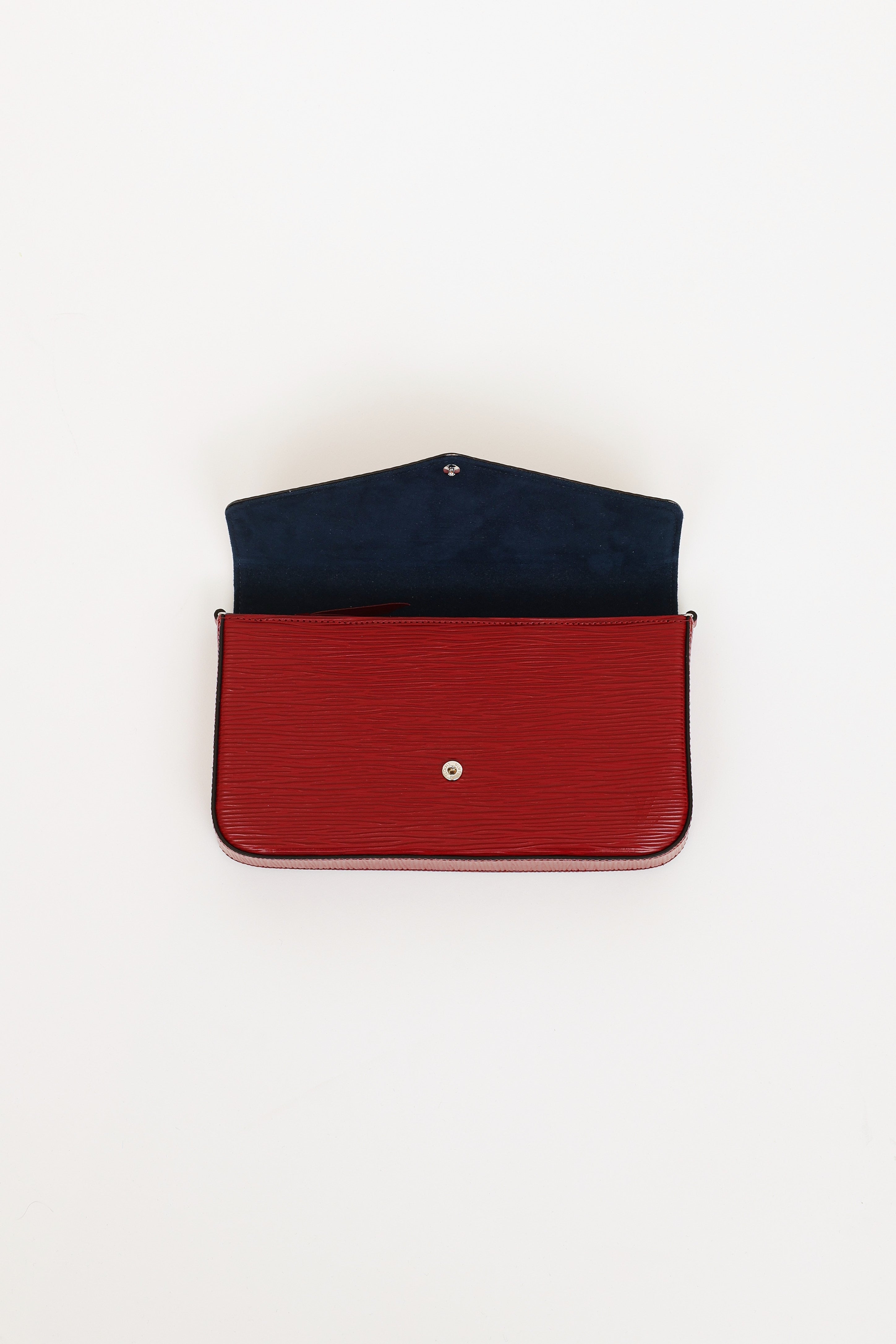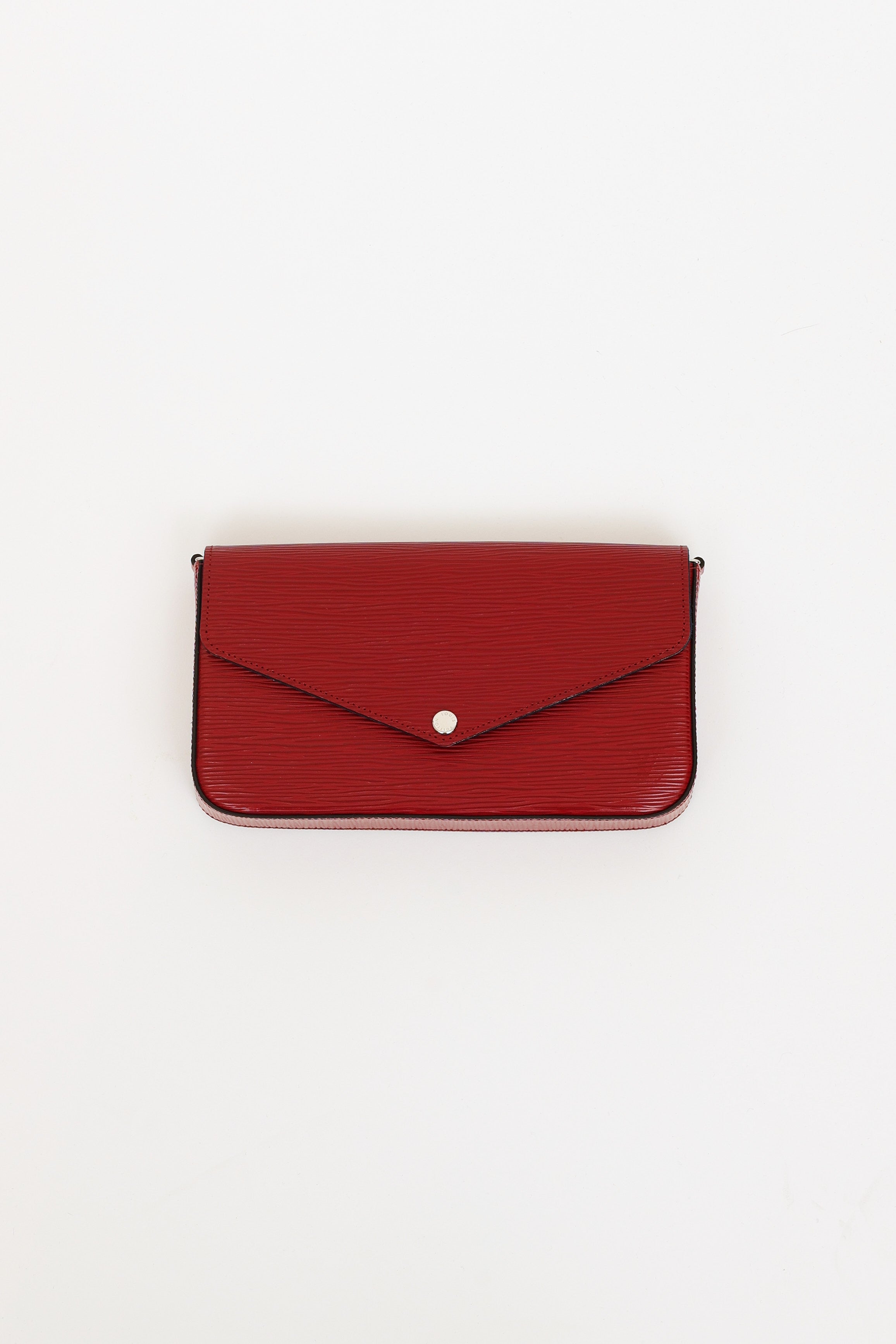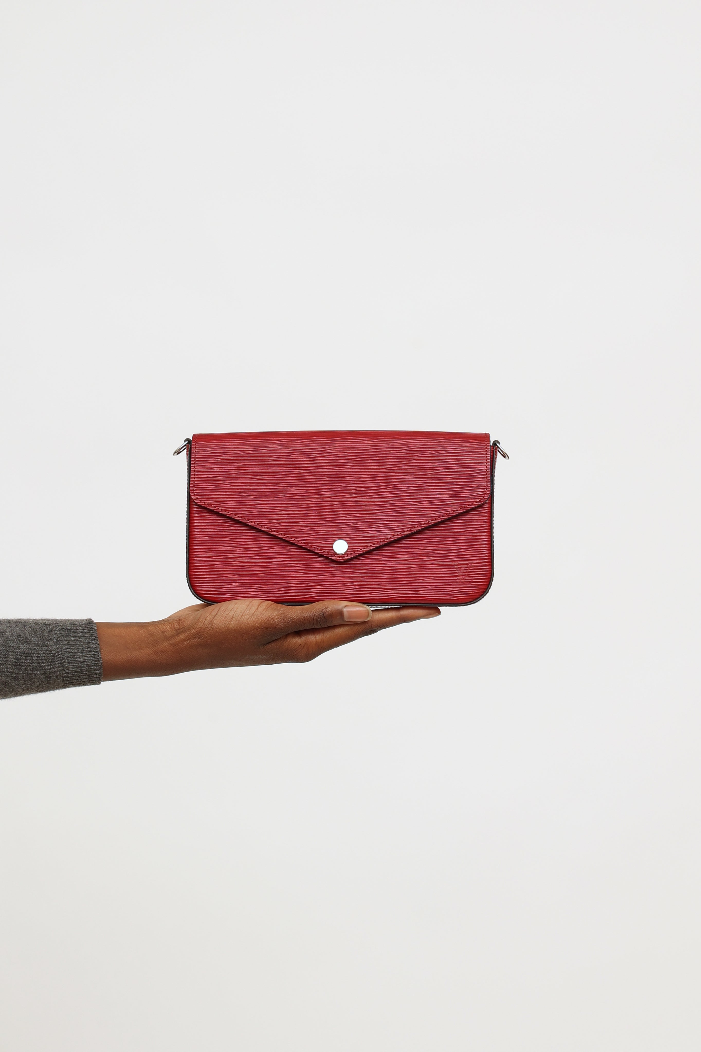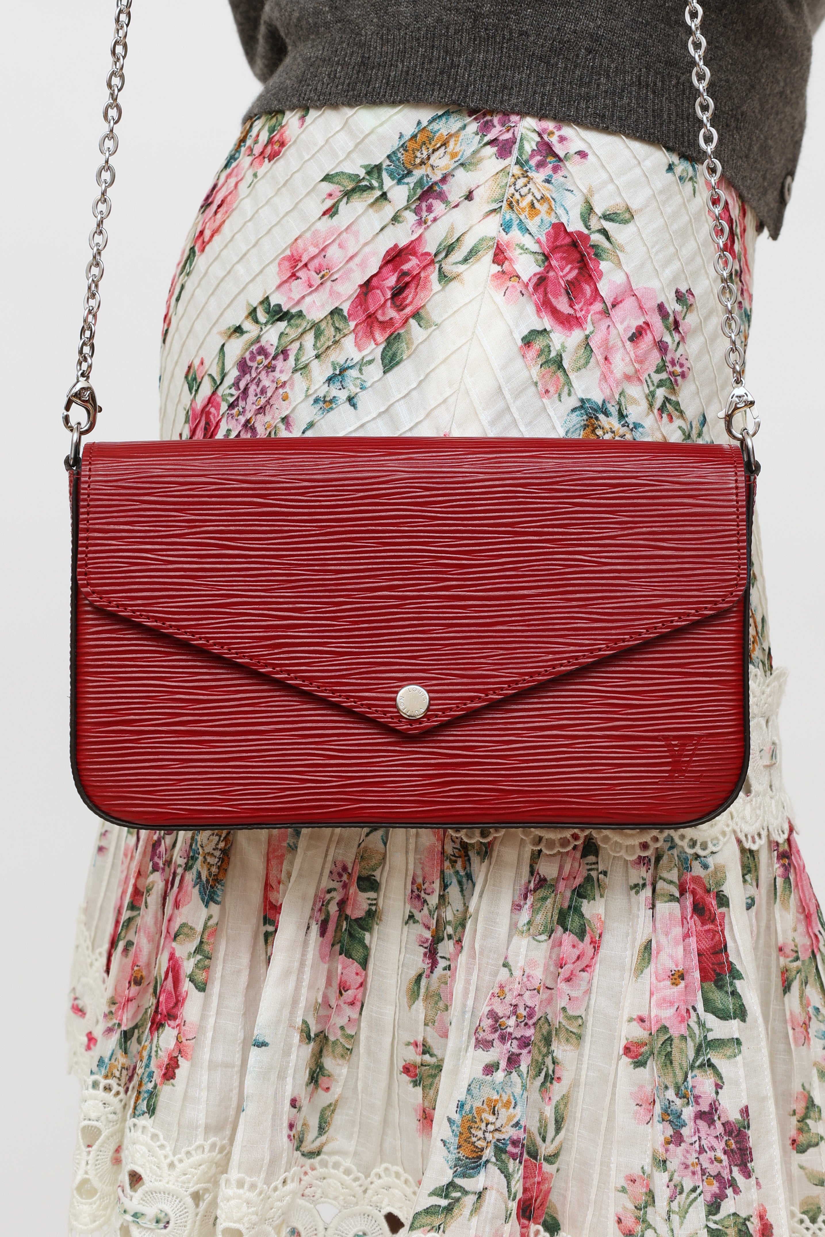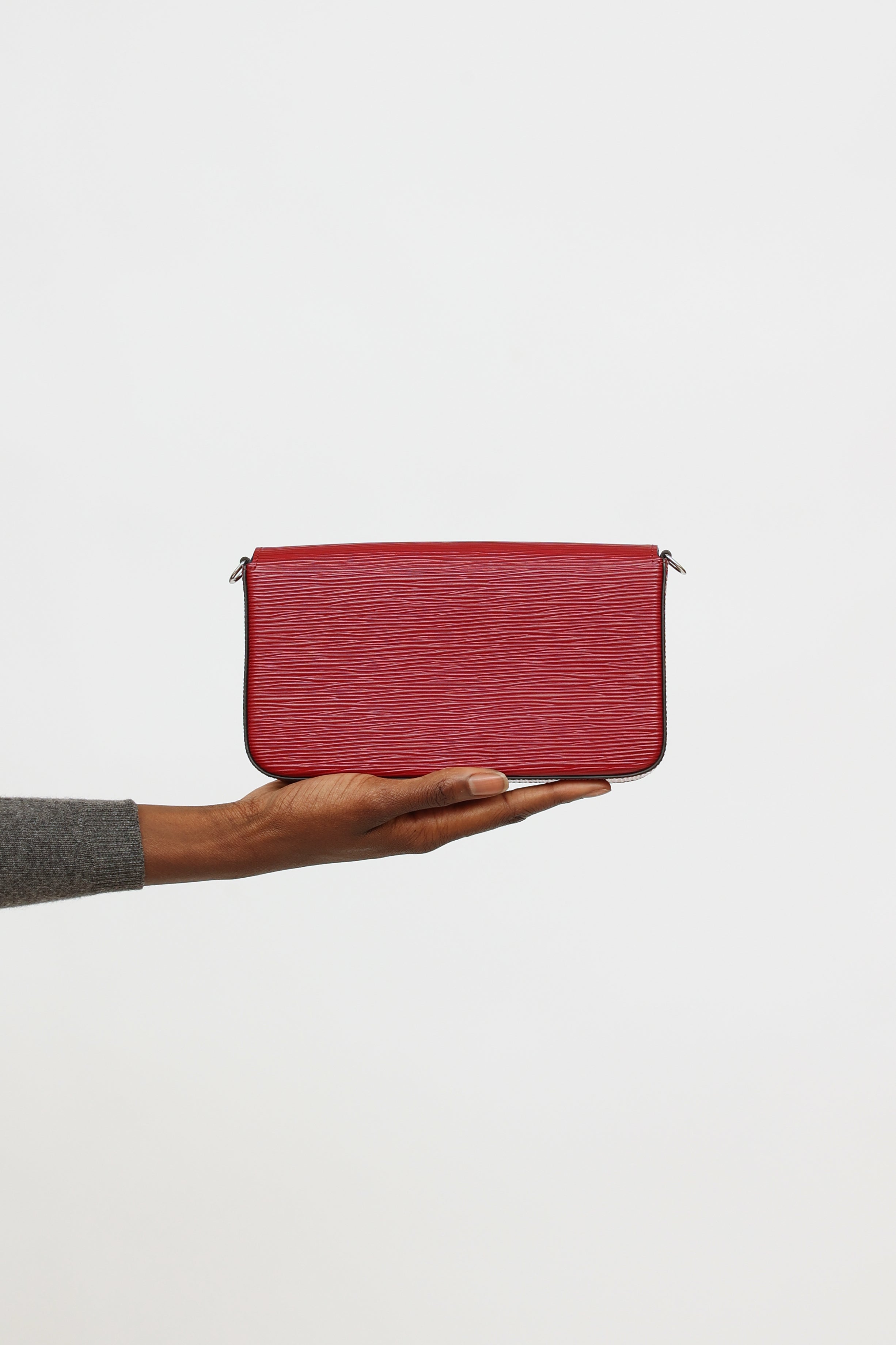 Pre-owned Louis Vuitton Epi Cherry Berry Félicie Pochette bag featuring red Epi leather grained rectangular body, flap with press stud closure, cowhide leather trim, tonal stitching, silver-tone hardware, 1 interior side pocket, and man-made navy textile lining. 1 red Epi leather zip pouch. 1 red grained leather pouch insert with 8 card slots. Red logo embossed patch at interior and logo embossed at bottom right exterior of body and Epi insert. Removable silver crossbody chain link chain. Can be worn crossbody, over the shoulder, or as a clutch. From the 2019 collection.