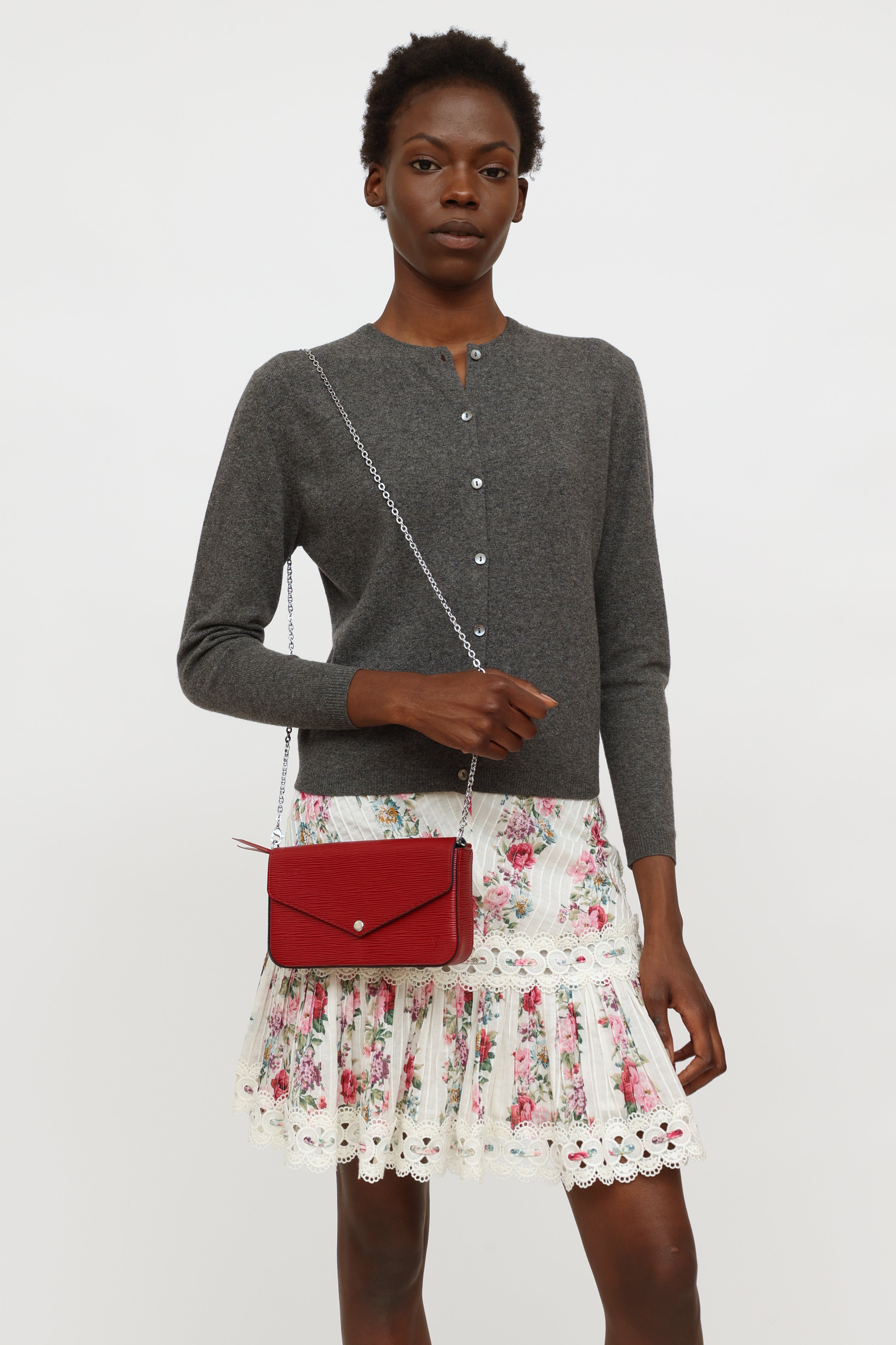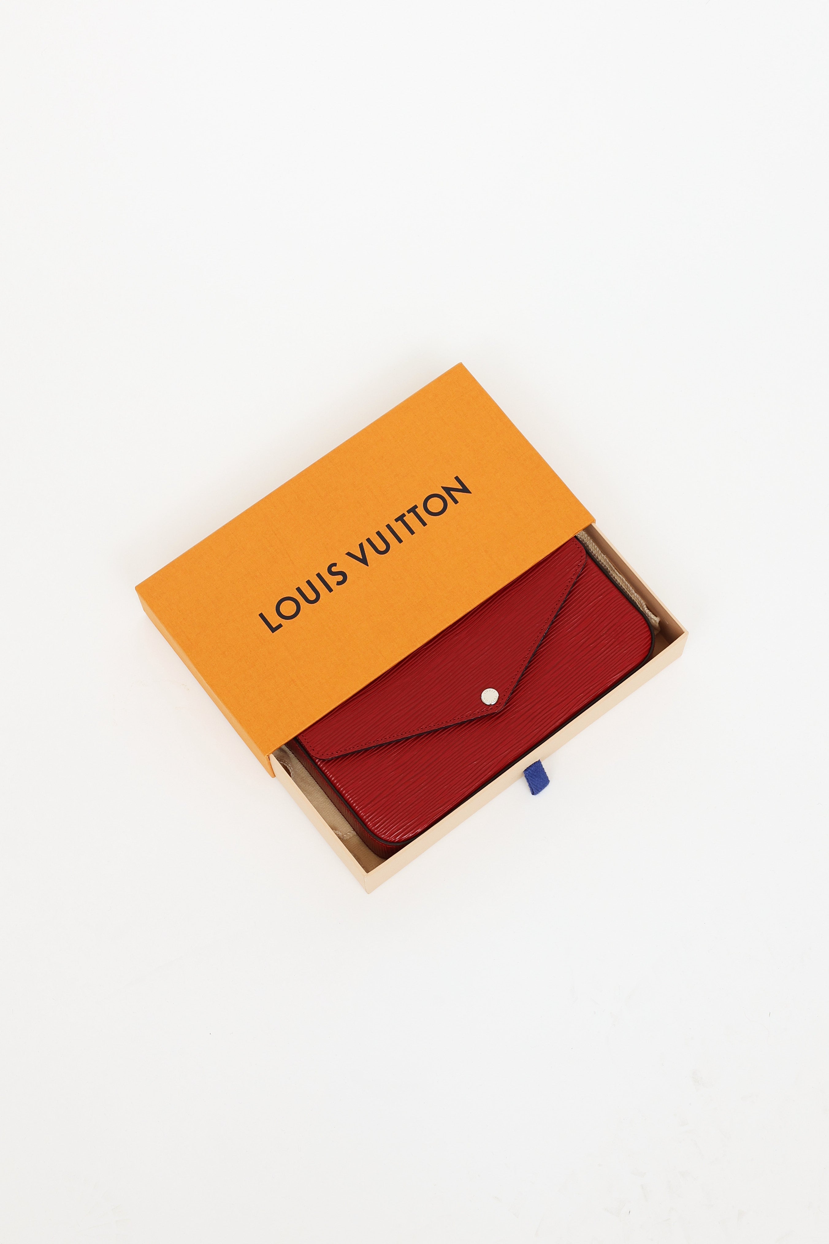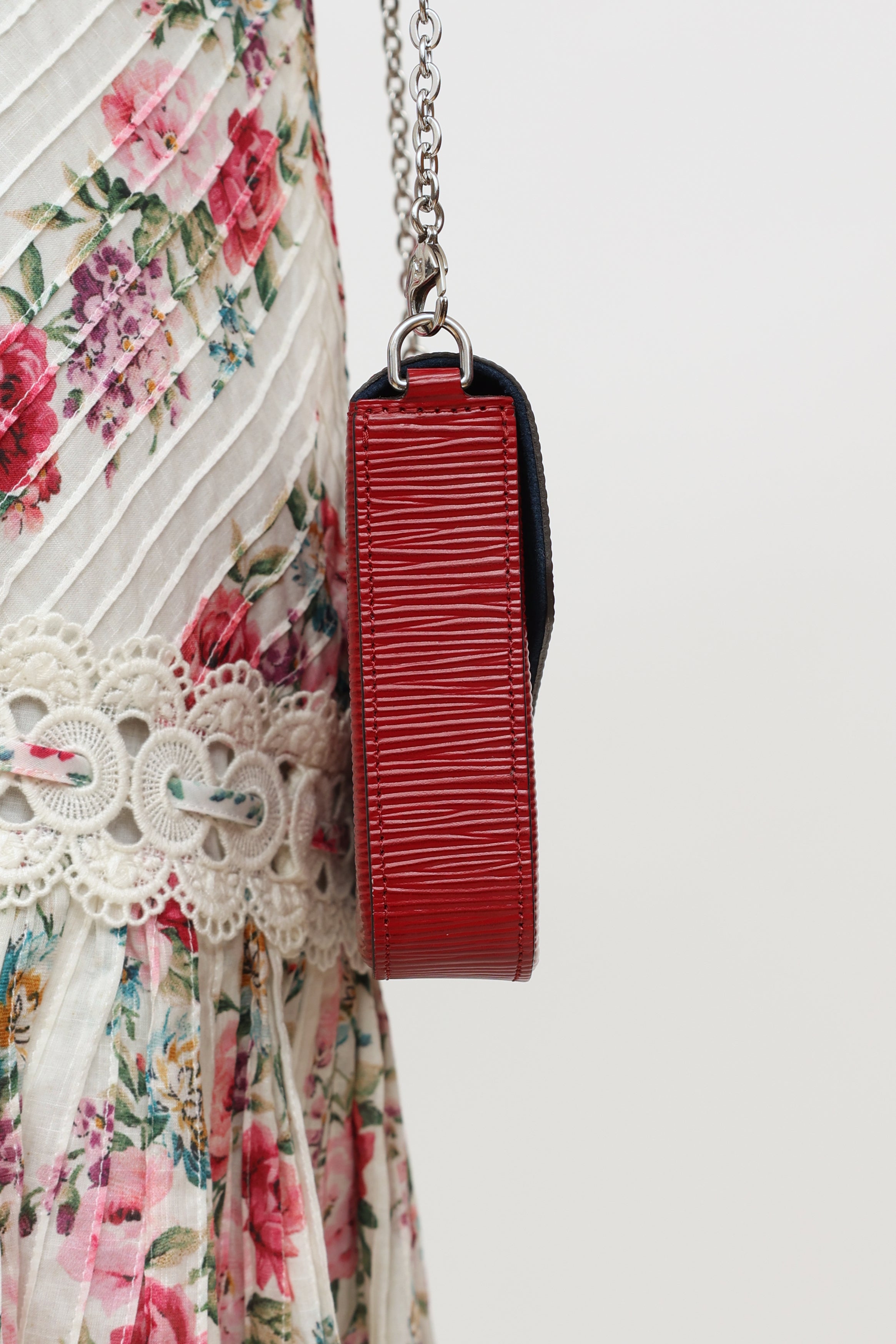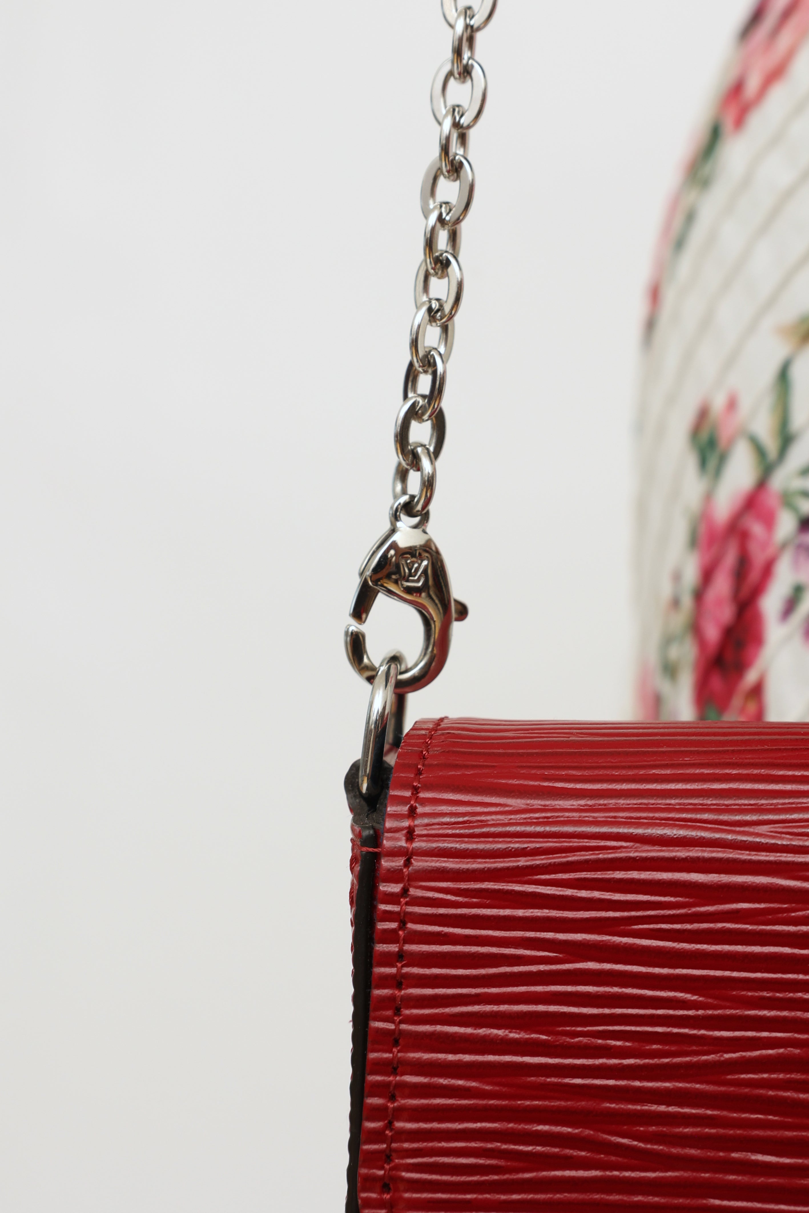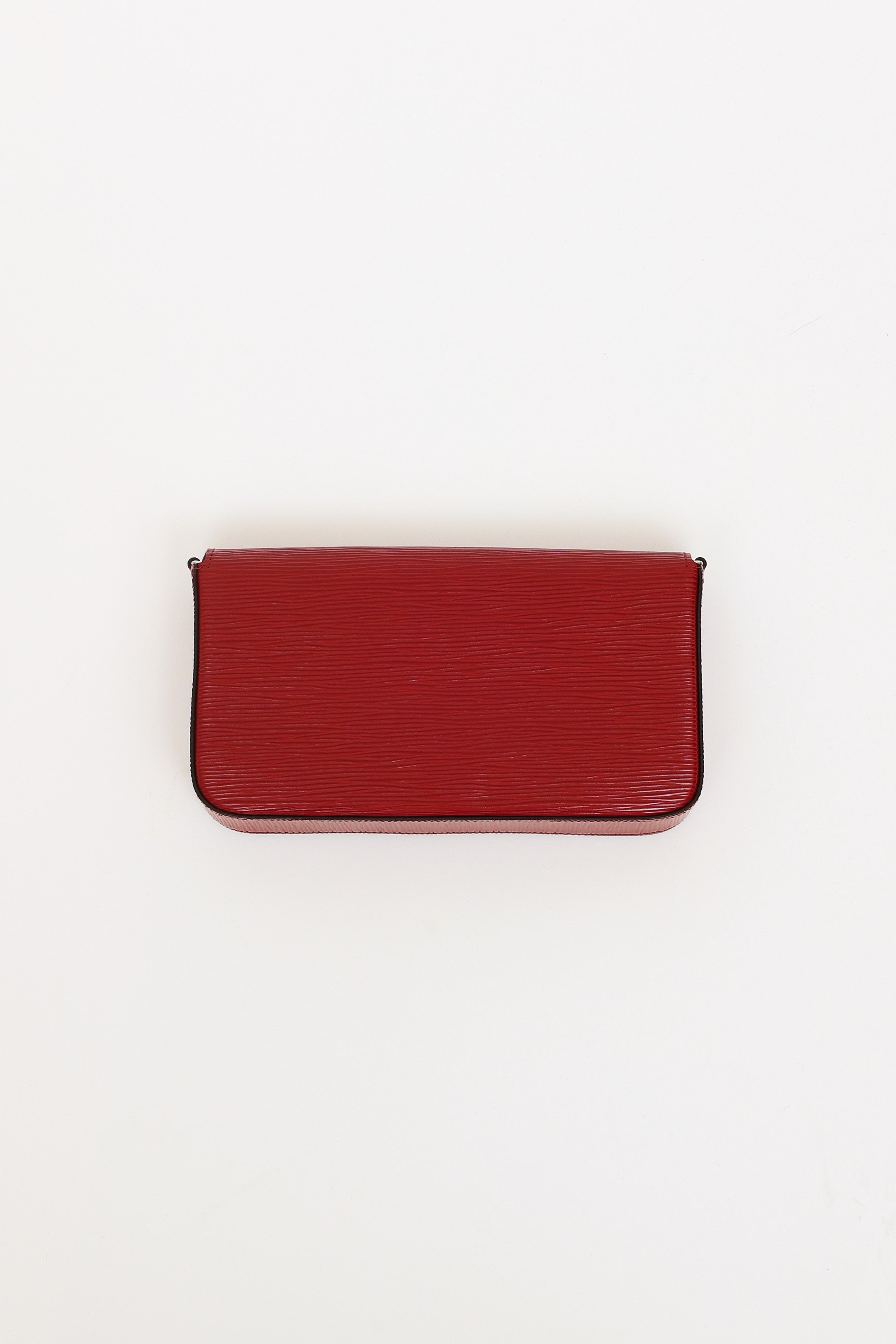 Pre-owned Louis Vuitton Epi Cherry Berry Félicie Pochette bag featuring red Epi leather grained rectangular body, flap with press stud closure, cowhide leather trim, tonal stitching, silver-tone hardware, 1 interior side pocket, and man-made navy textile lining. 1 red Epi leather zip pouch. 1 red grained leather pouch insert with 8 card slots. Red logo embossed patch at interior and logo embossed at bottom right exterior of body and Epi insert. Removable silver crossbody chain link chain. Can be worn crossbody, over the shoulder, or as a clutch. From the 2019 collection.