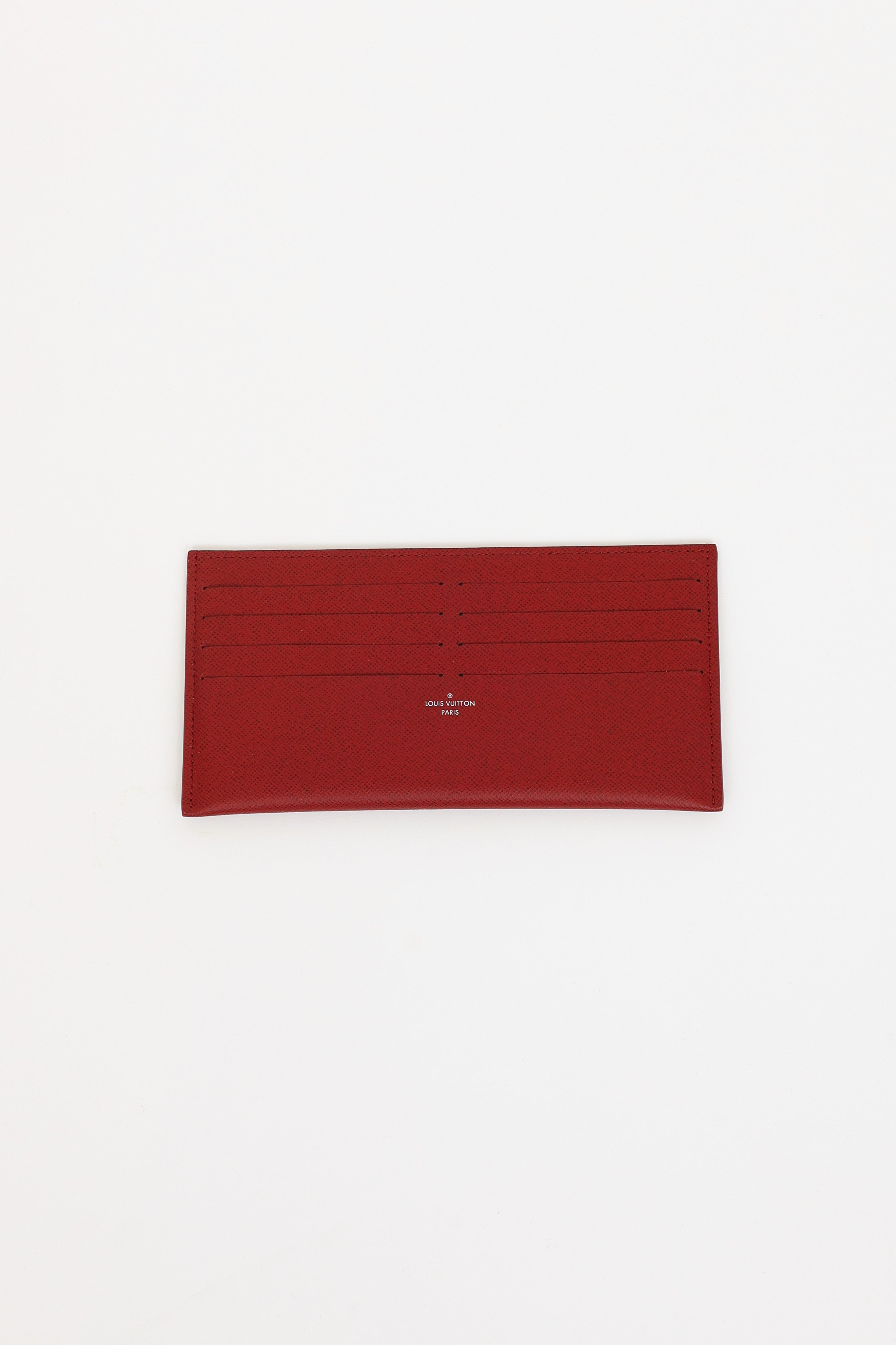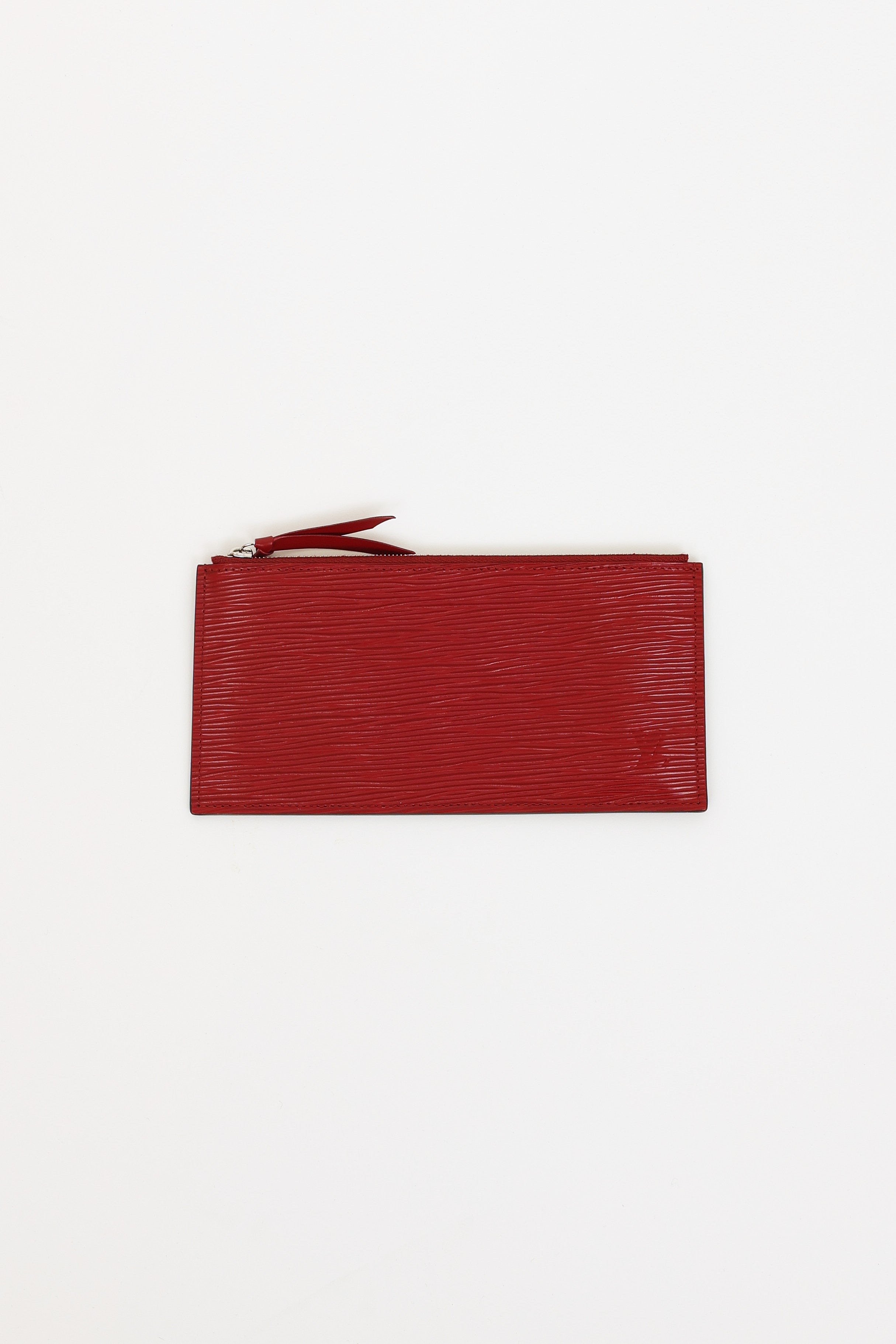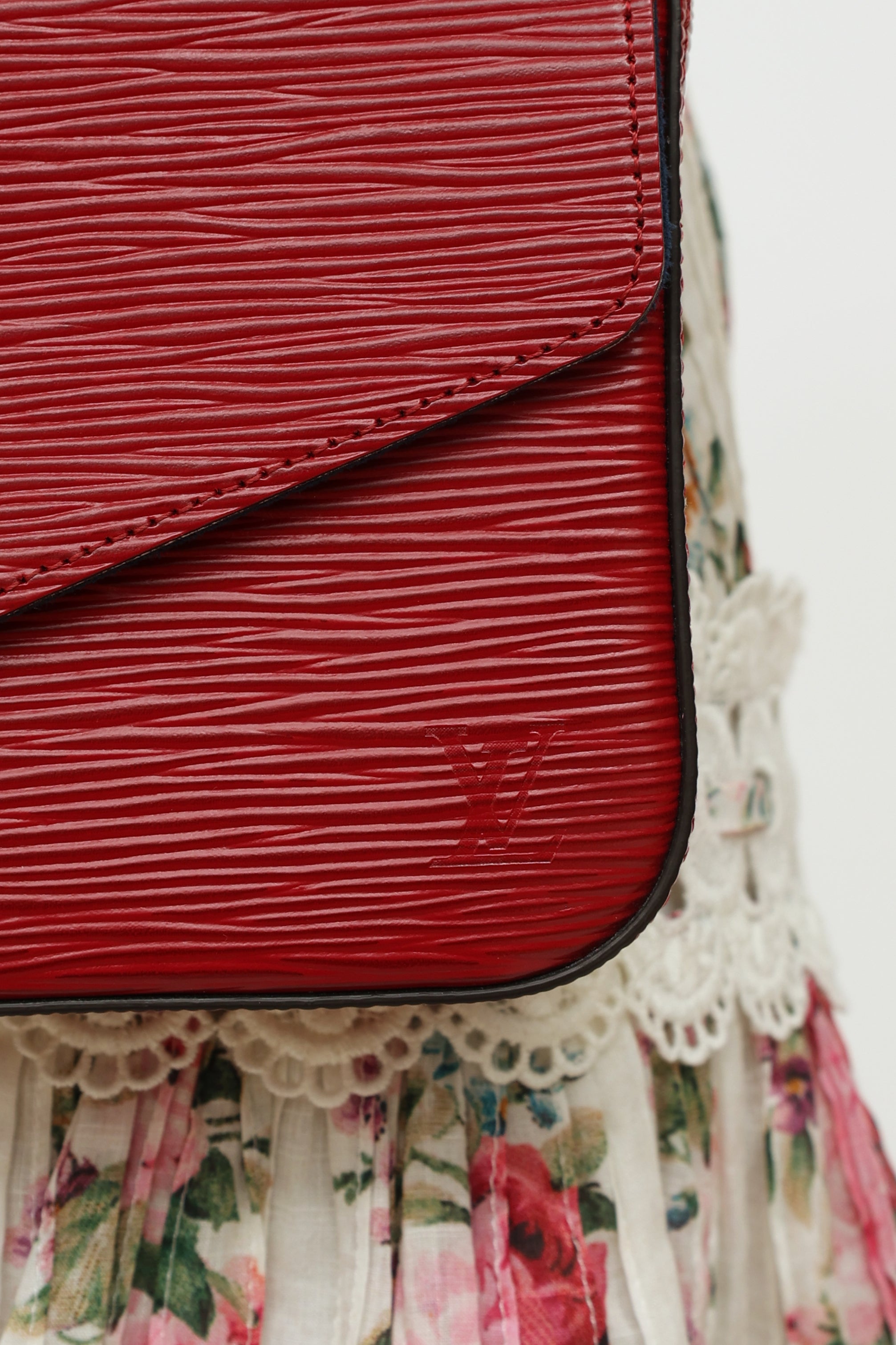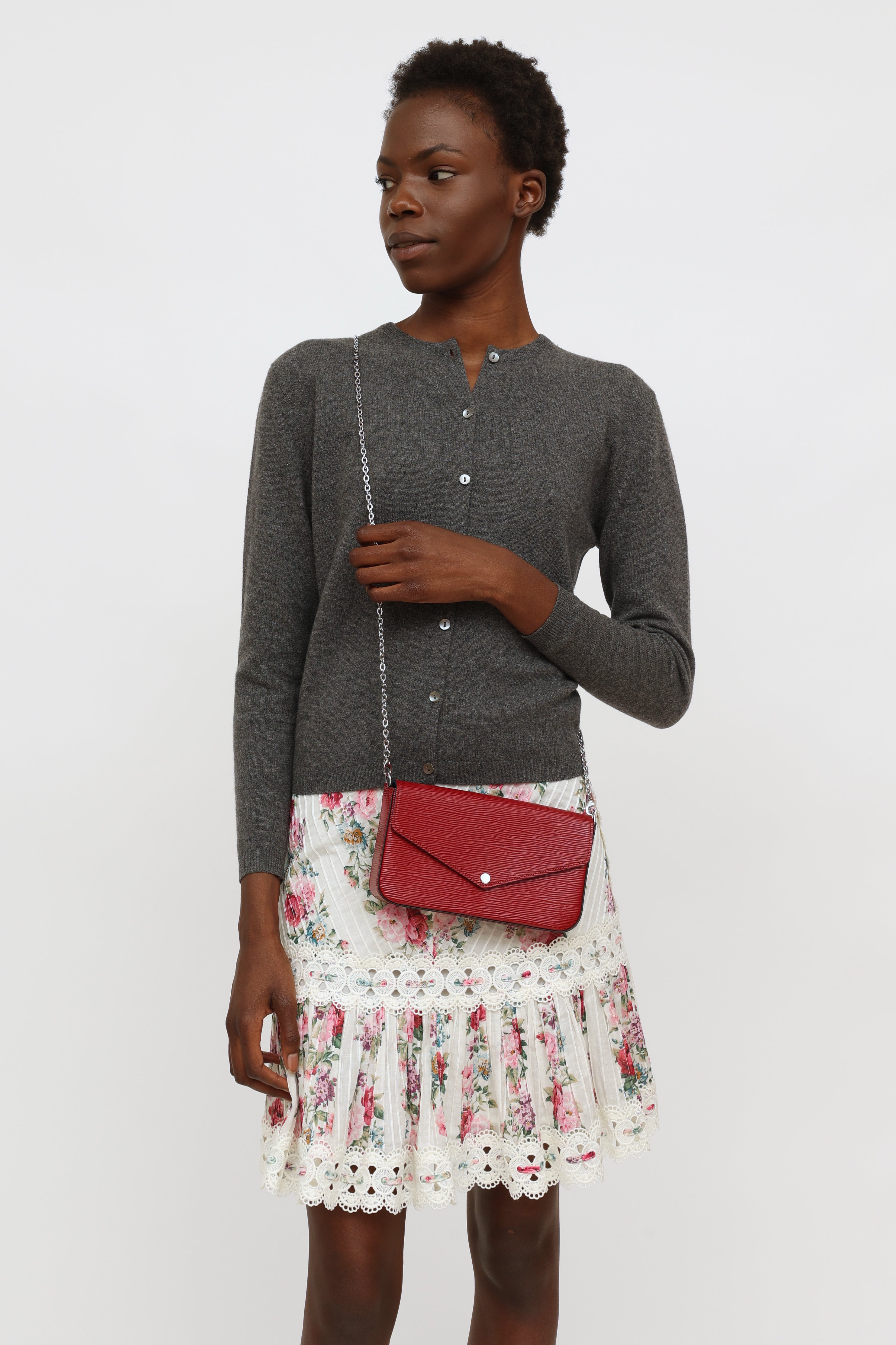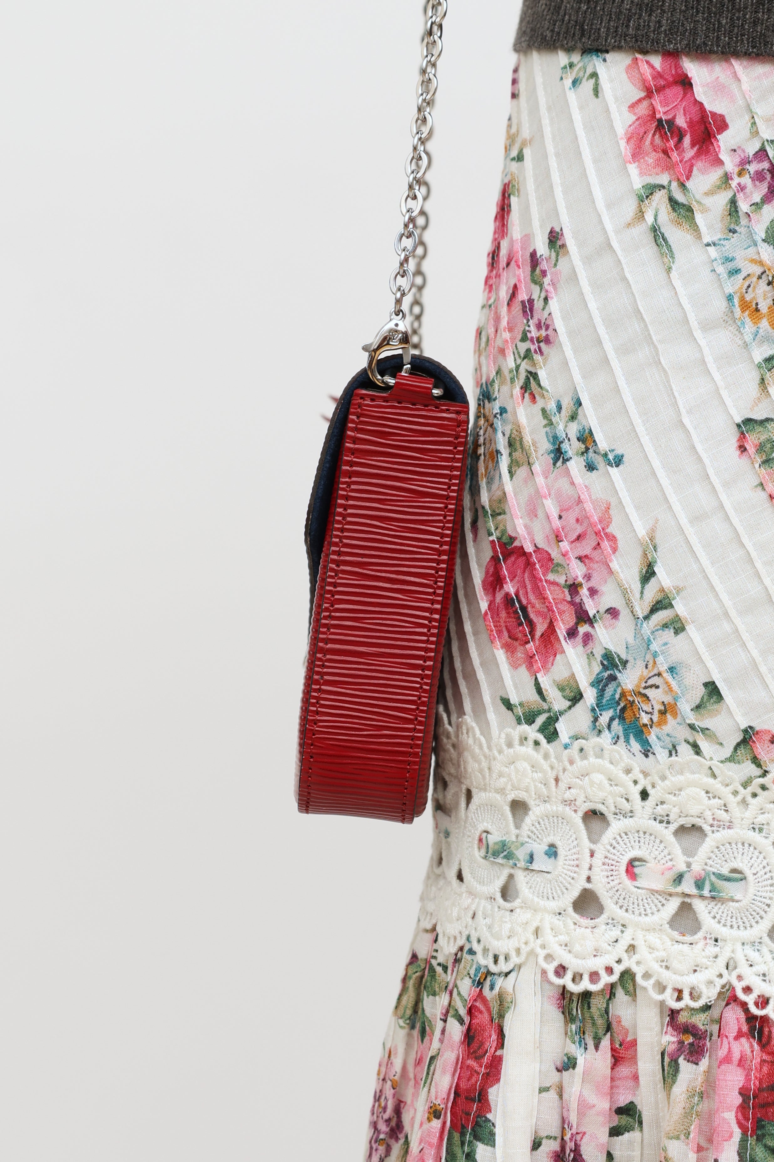 Pre-owned Louis Vuitton Epi Cherry Berry Félicie Pochette bag featuring red Epi leather grained rectangular body, flap with press stud closure, cowhide leather trim, tonal stitching, silver-tone hardware, 1 interior side pocket, and man-made navy textile lining. 1 red Epi leather zip pouch. 1 red grained leather pouch insert with 8 card slots. Red logo embossed patch at interior and logo embossed at bottom right exterior of body and Epi insert. Removable silver crossbody chain link chain. Can be worn crossbody, over the shoulder, or as a clutch. From the 2019 collection.