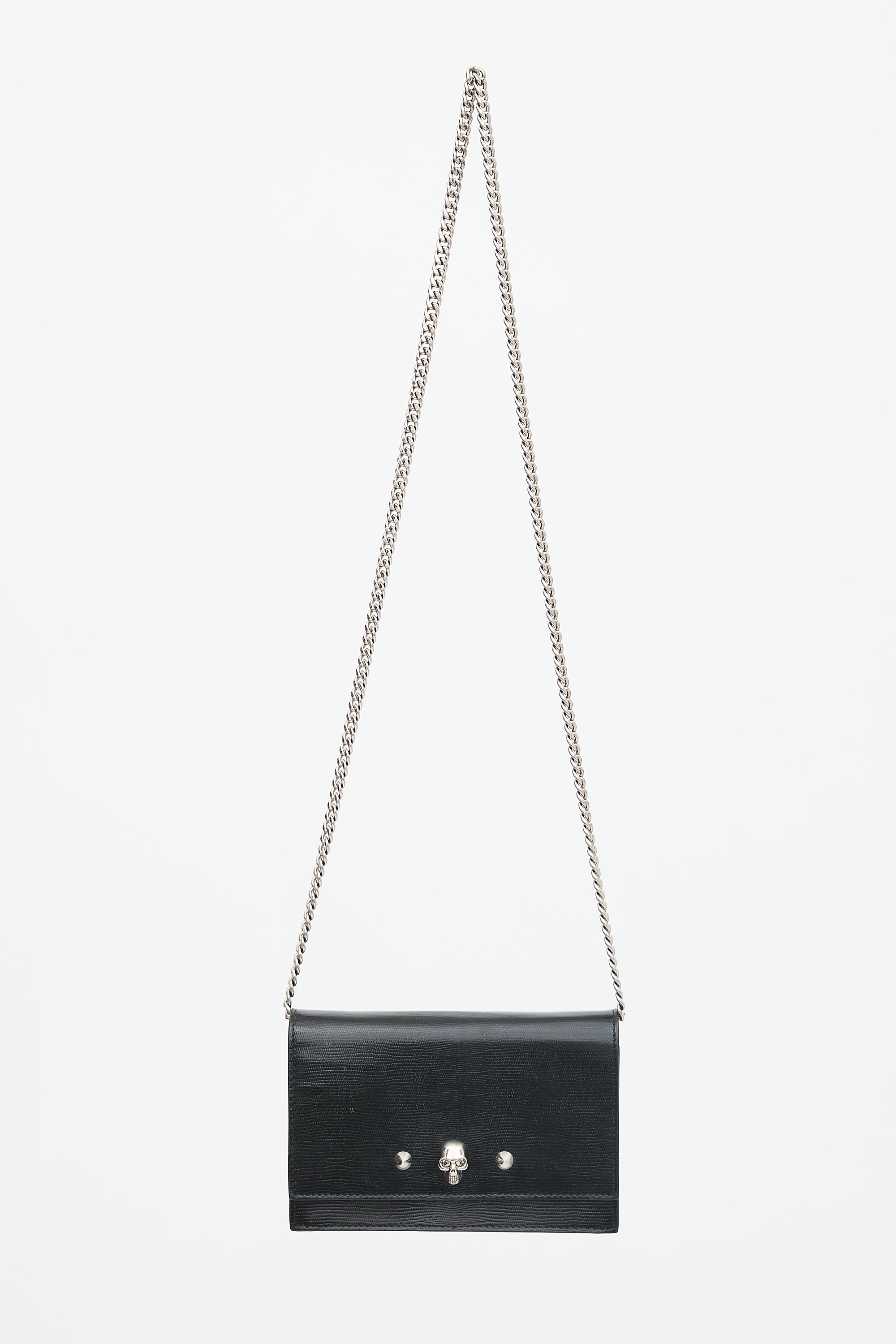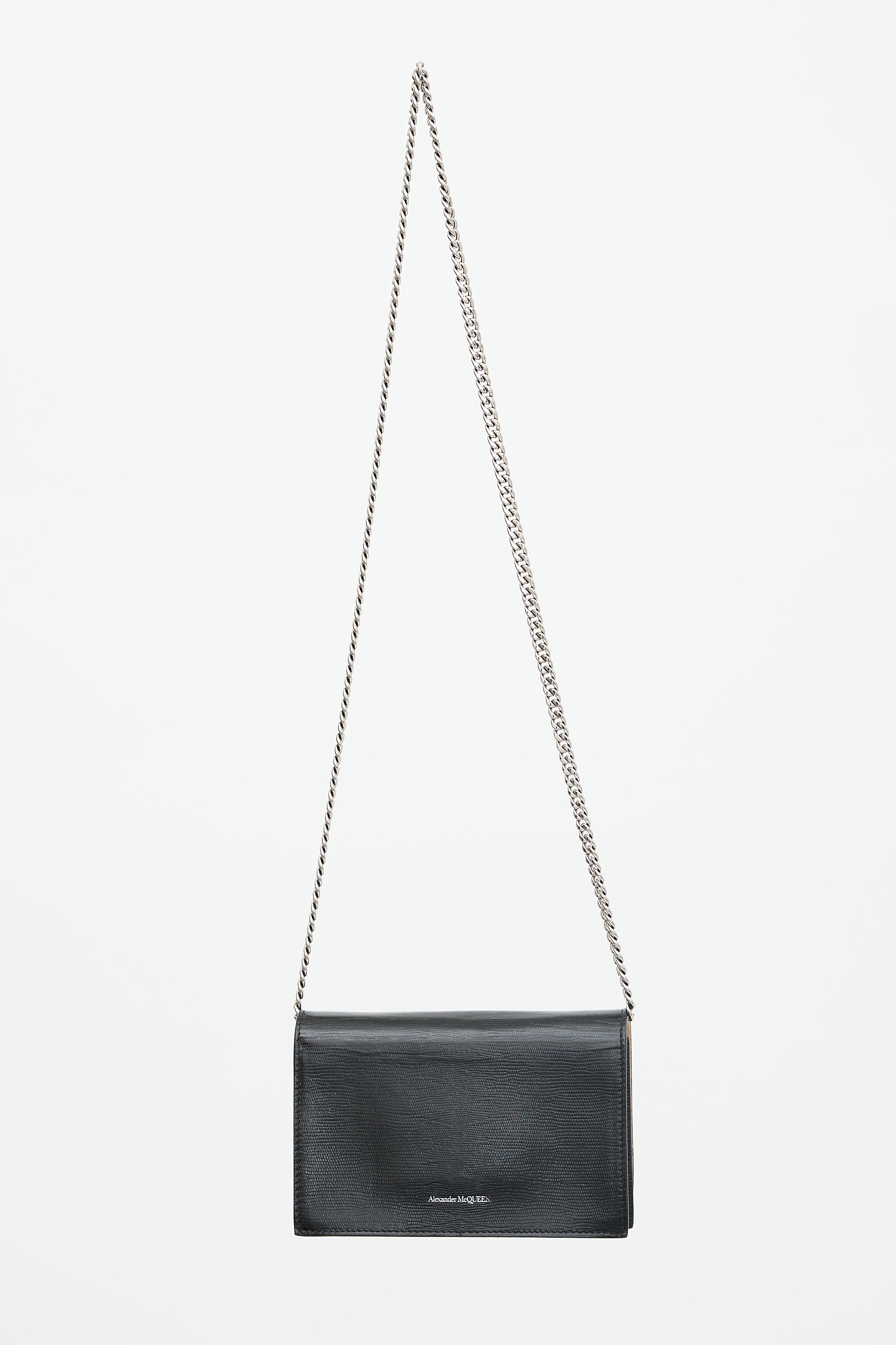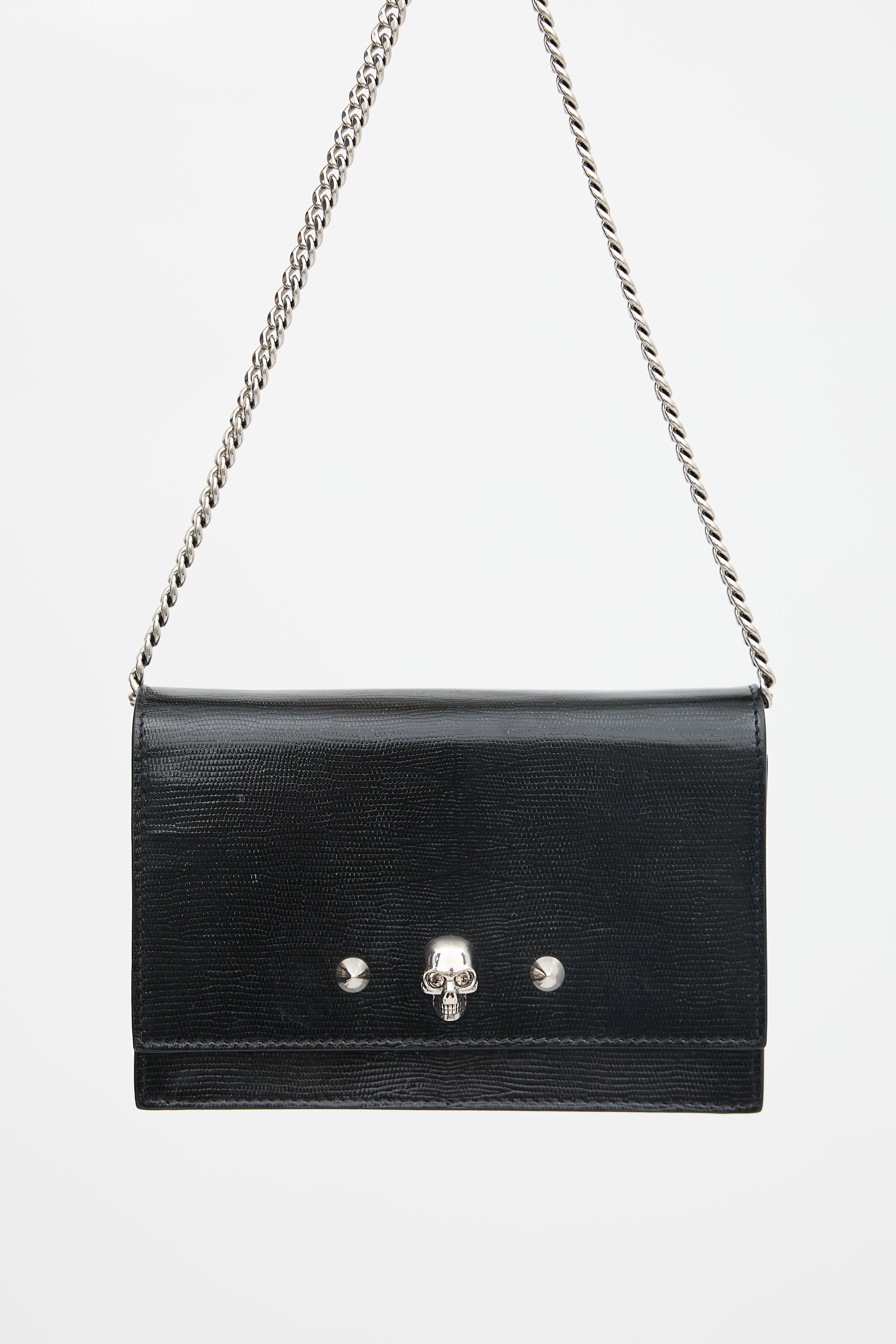 Pre-owned McQueen black leather small crossbody bag featuring lizard effect throughotu surface, silver tone hardware, silver tone printed logo at bottom back, chain shoulder strap, front flap with two studs and skull embellishment, magnetic closure, and one lined main compartment with one slip pocket. Comes with care guide.