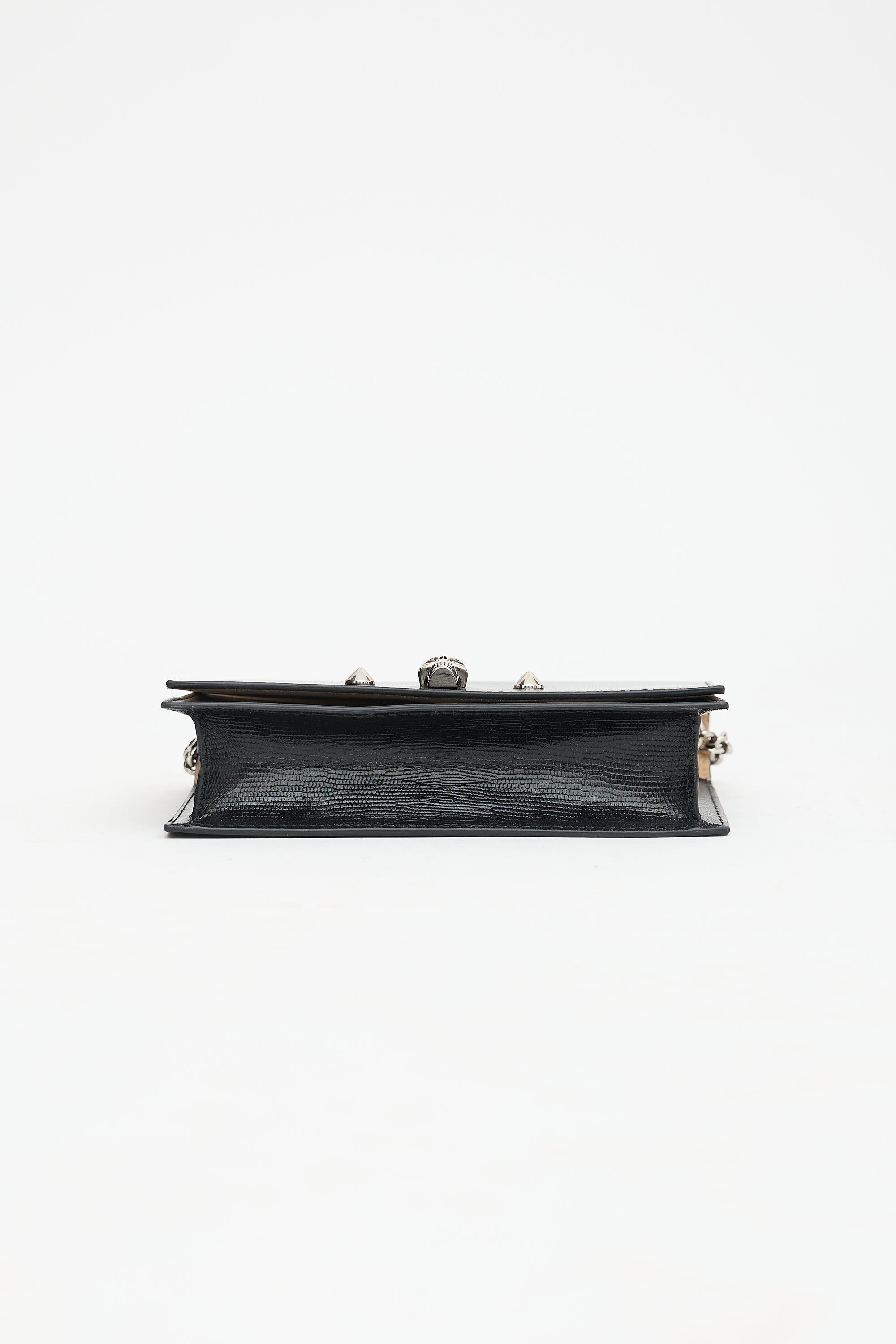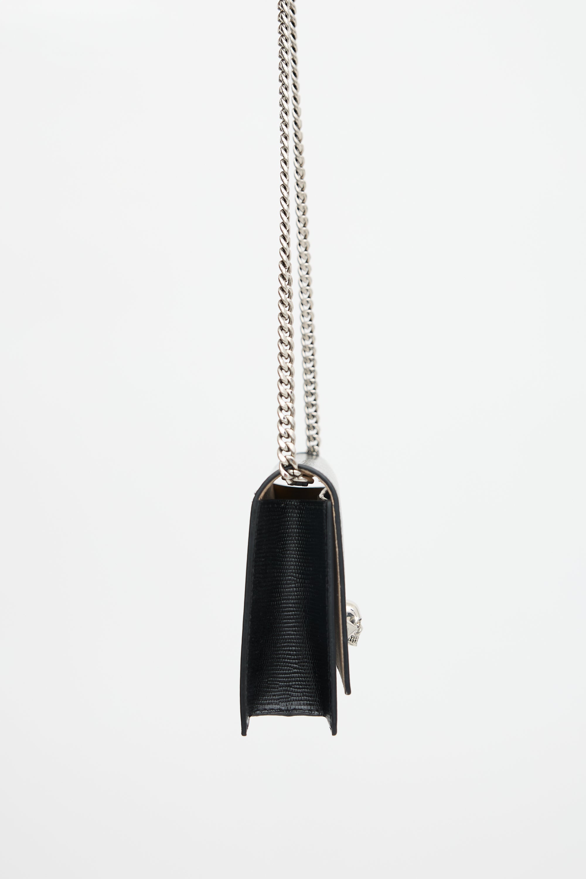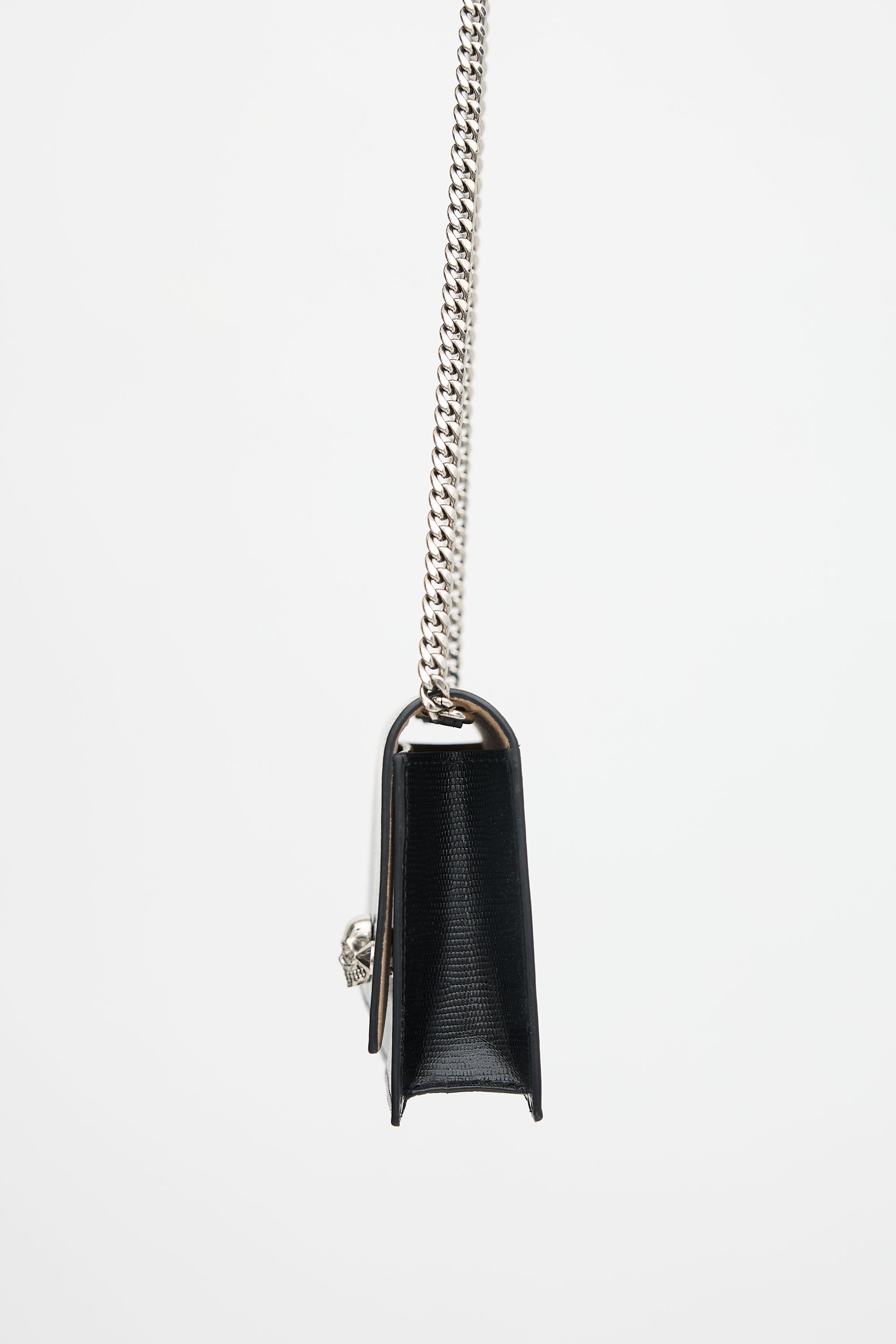 Pre-owned McQueen black leather small crossbody bag featuring lizard effect throughotu surface, silver tone hardware, silver tone printed logo at bottom back, chain shoulder strap, front flap with two studs and skull embellishment, magnetic closure, and one lined main compartment with one slip pocket. Comes with care guide.
