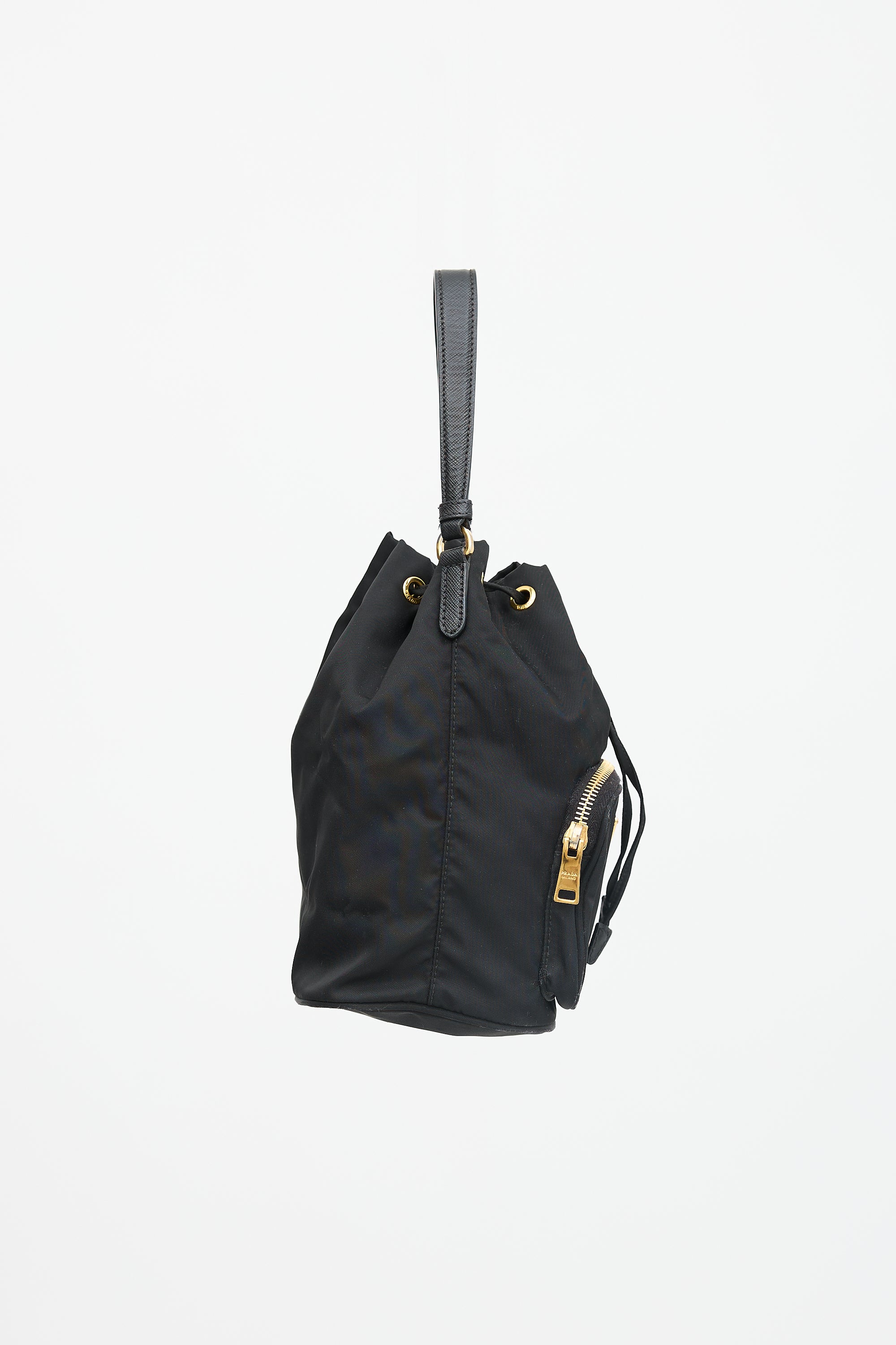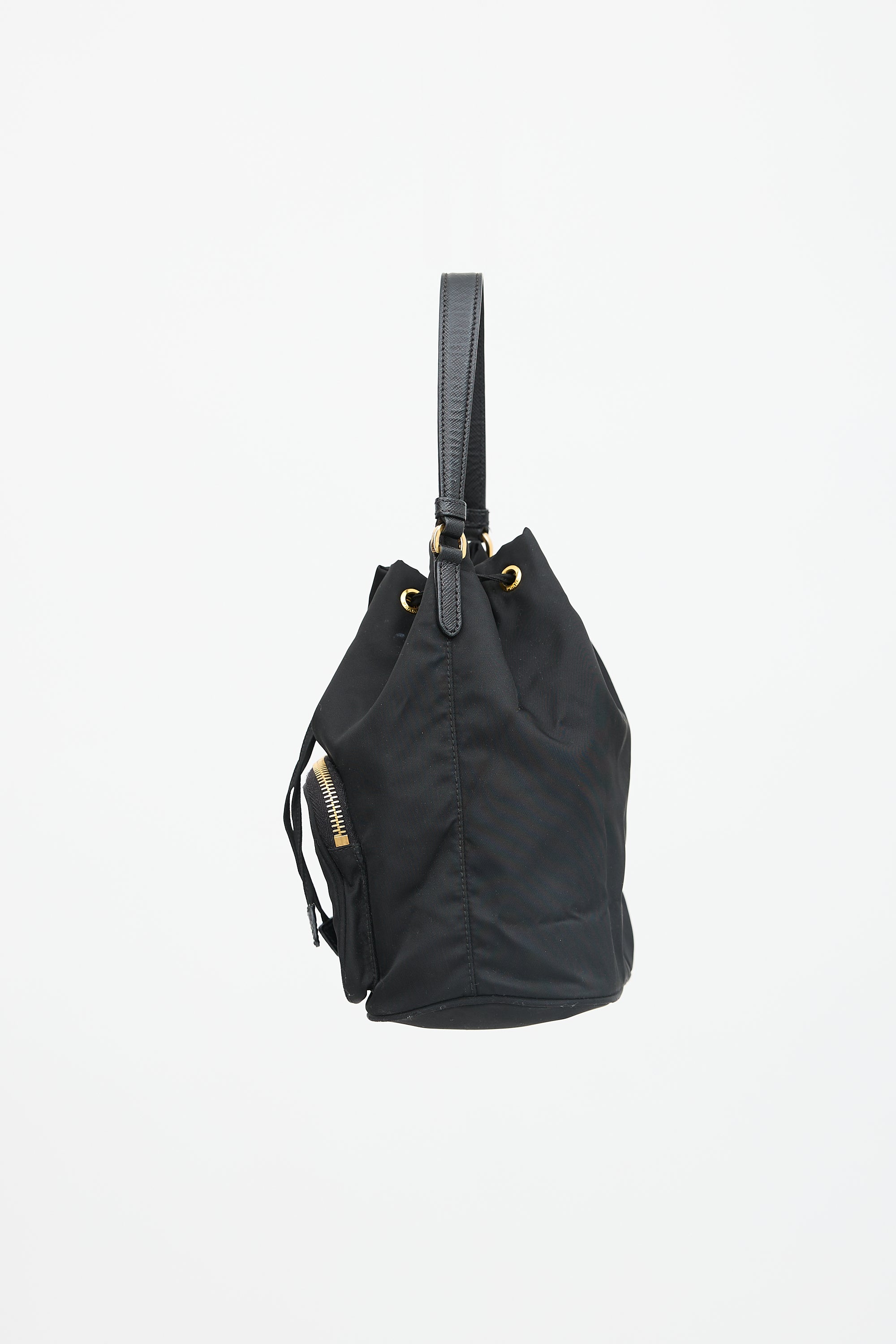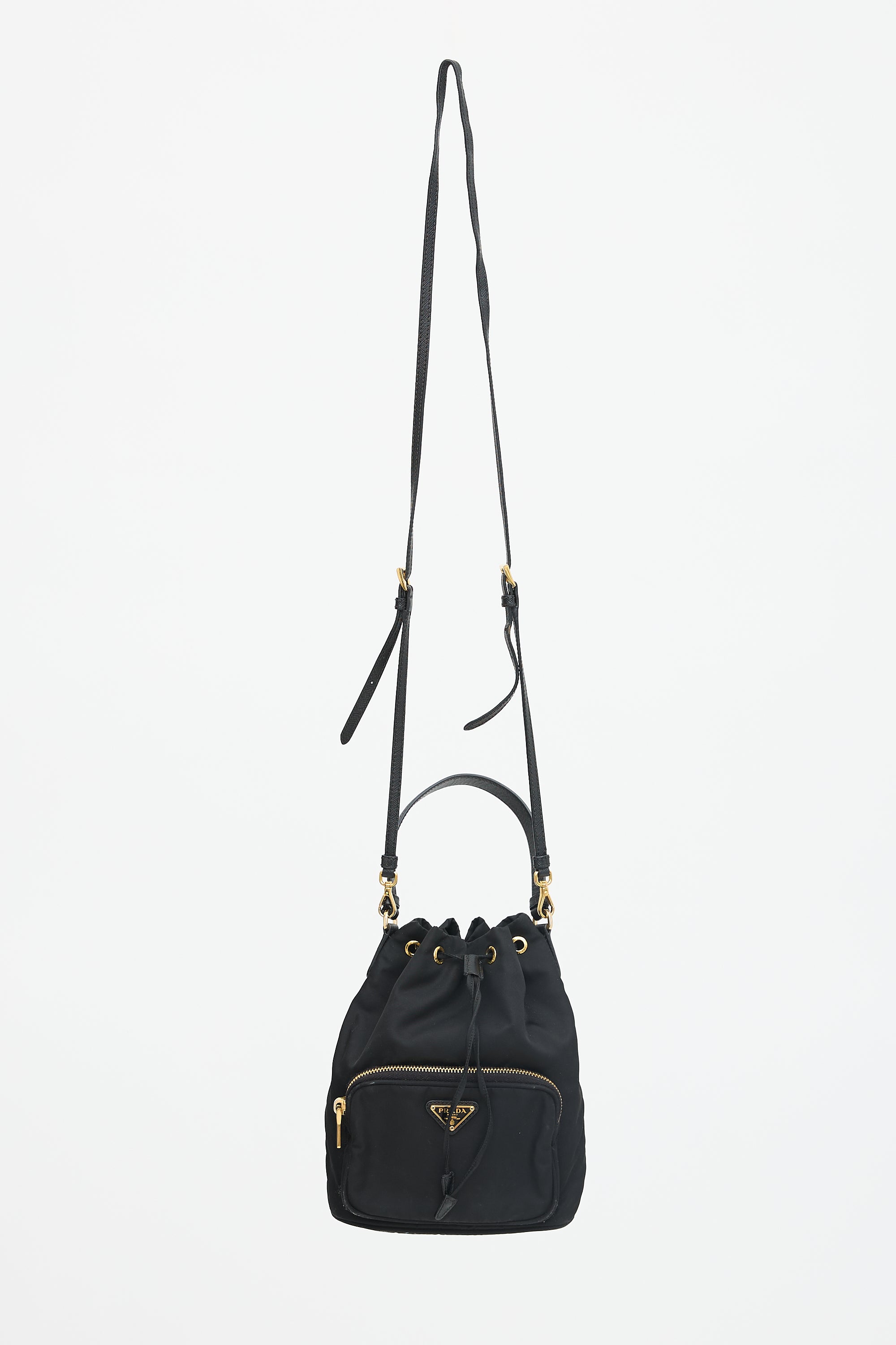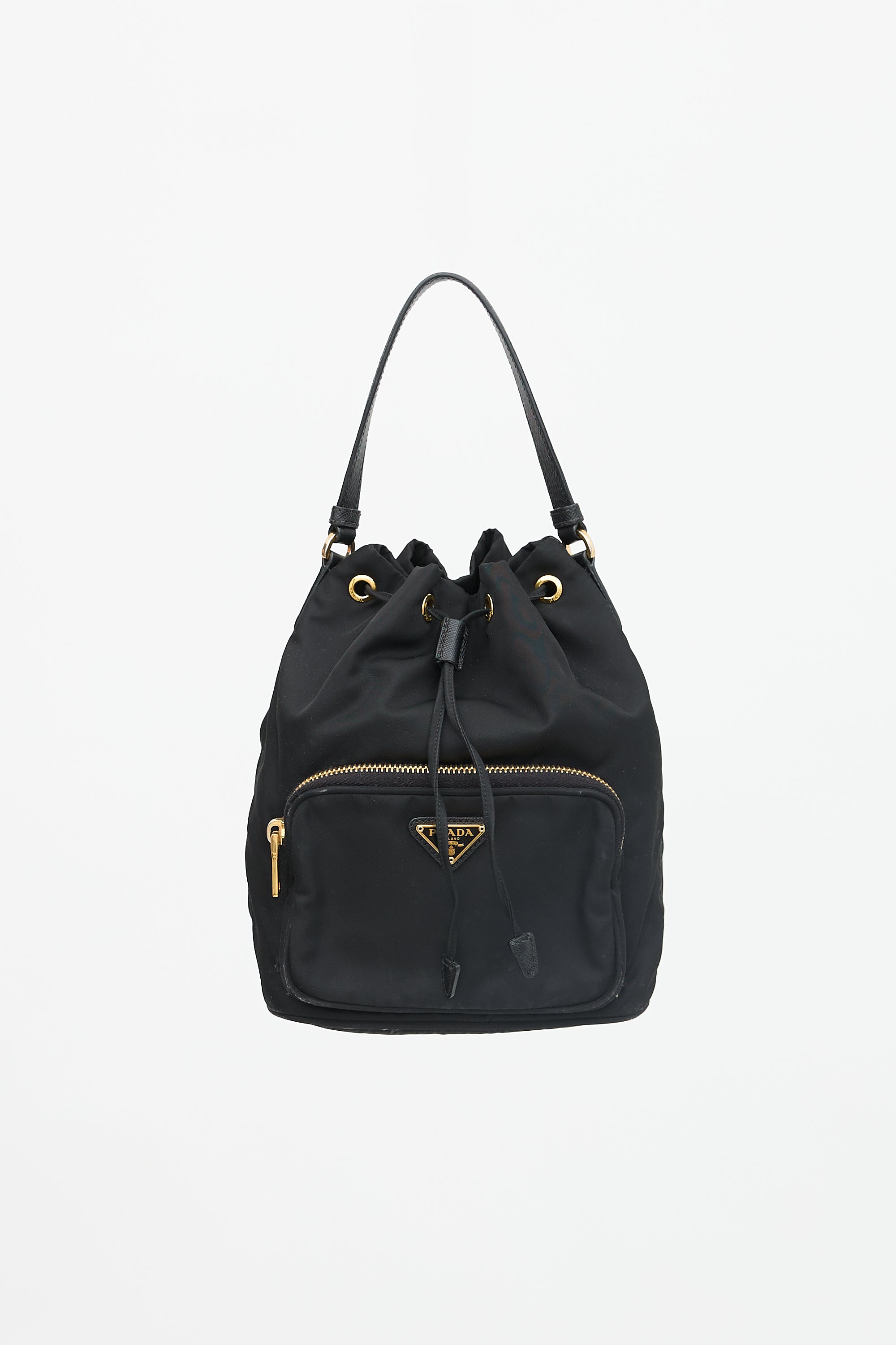 Pre-owned Prada black nylon small Duet bucket bag featuring Saffiano leather trim, gold tone hardware, front zip compartment with triangle logo plaque, single top handle, removable and adjustable shoulder strap, drawstring top closure, and one lined main compartment. Comes with original dust bag and care guide.