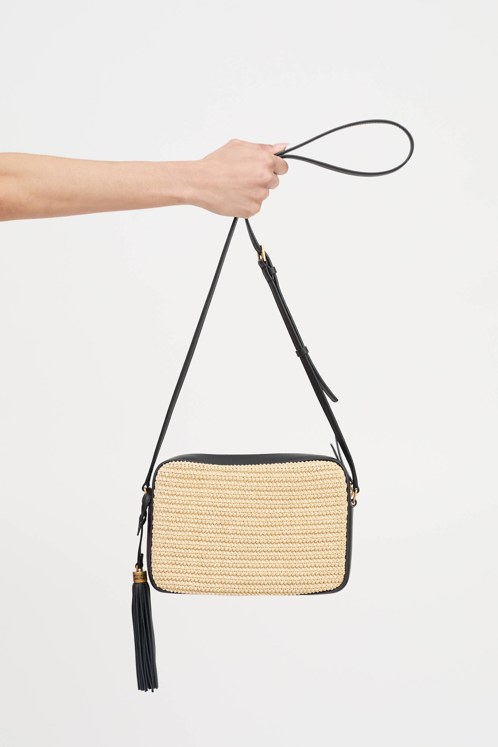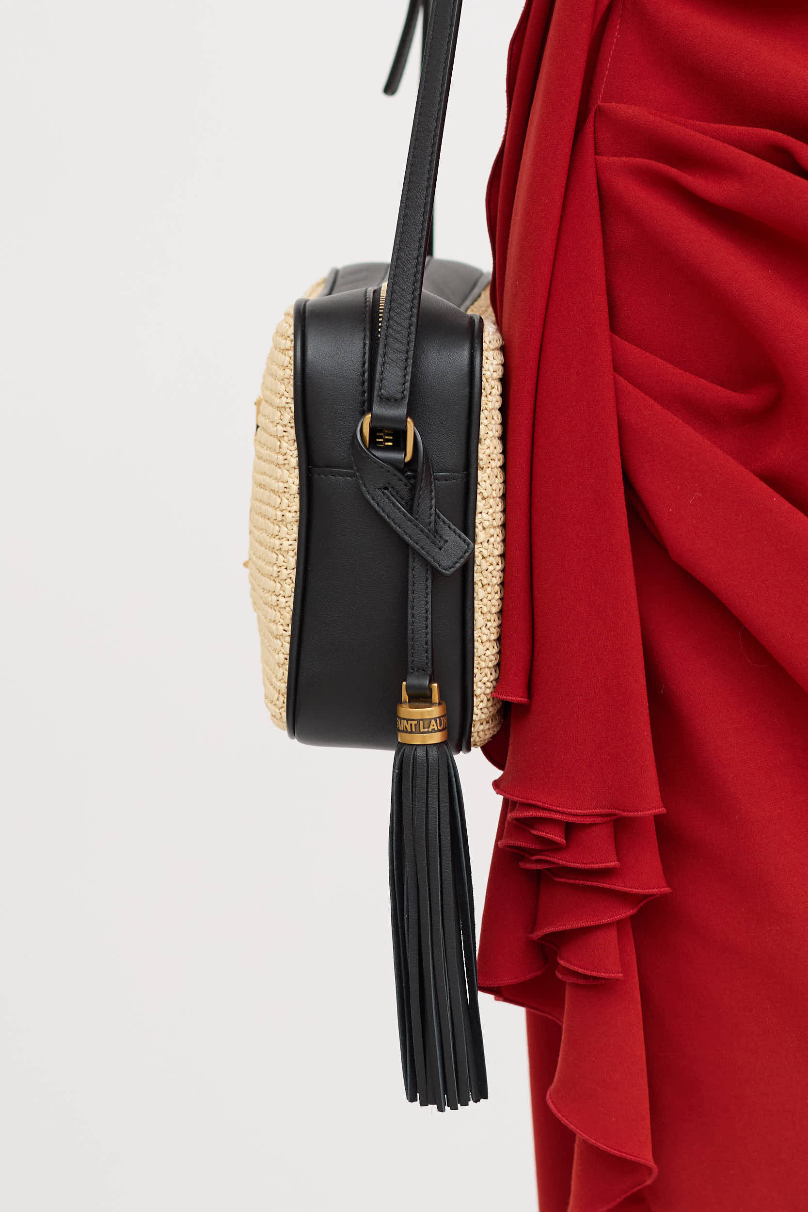 Pre-owned Saint Laurent beige and black Raffia Lou Camera bag featuring black leather trim and flat adjustable crossbody strap, removable logo leather tassel, gold tone hardware and logo at front, top zip closure, textile lined interior, and one slip pocket.