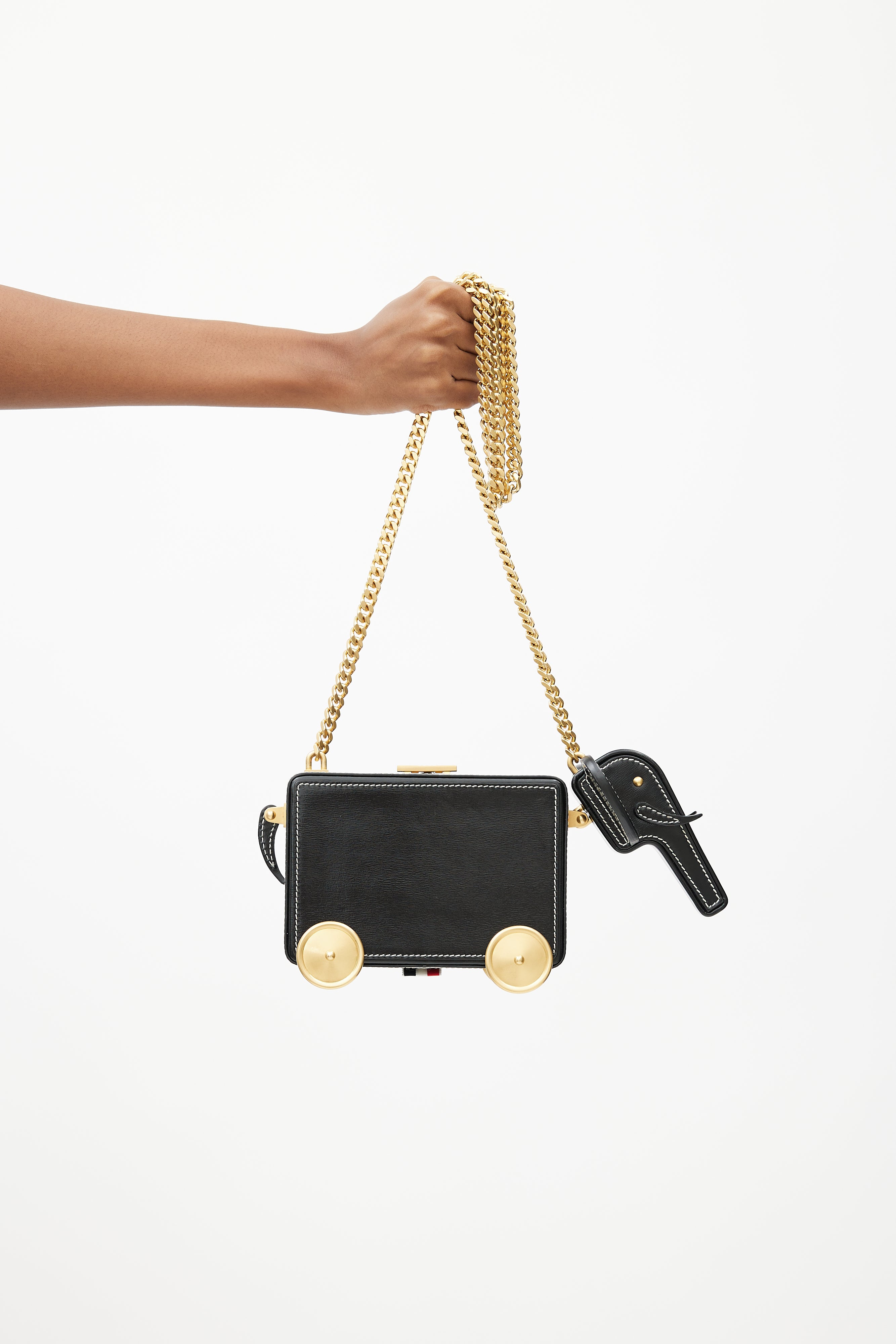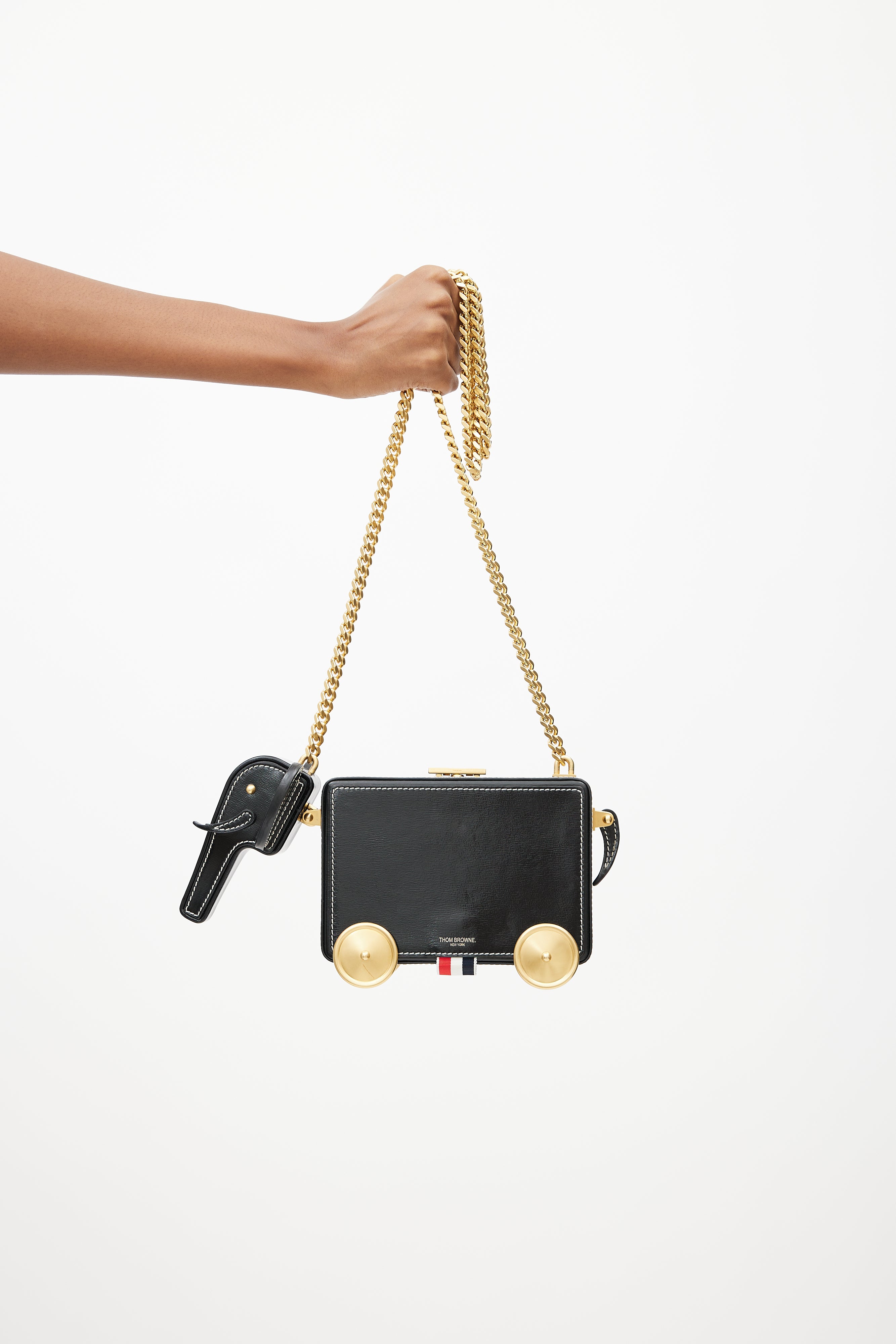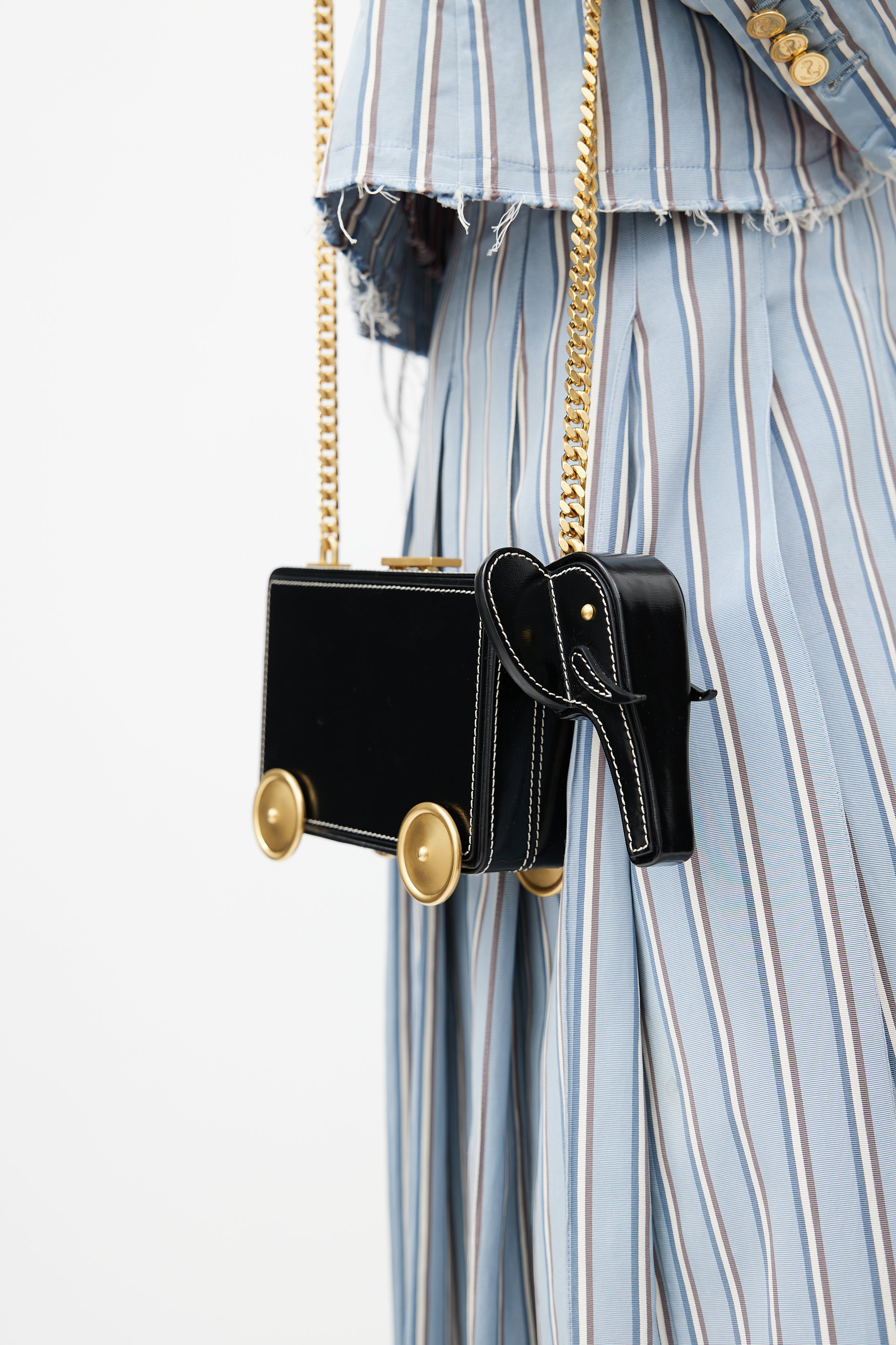 Pre-owned Thom Browne black Elephant crossbody bag featuring contrast stitch, gold tone hardware, four wheels, chain shoulder strap, hinged elephant head, push lock closure, signature red, white, blue tab, gold stamped logo, and one lined main compartment. Comes with original dust bag.