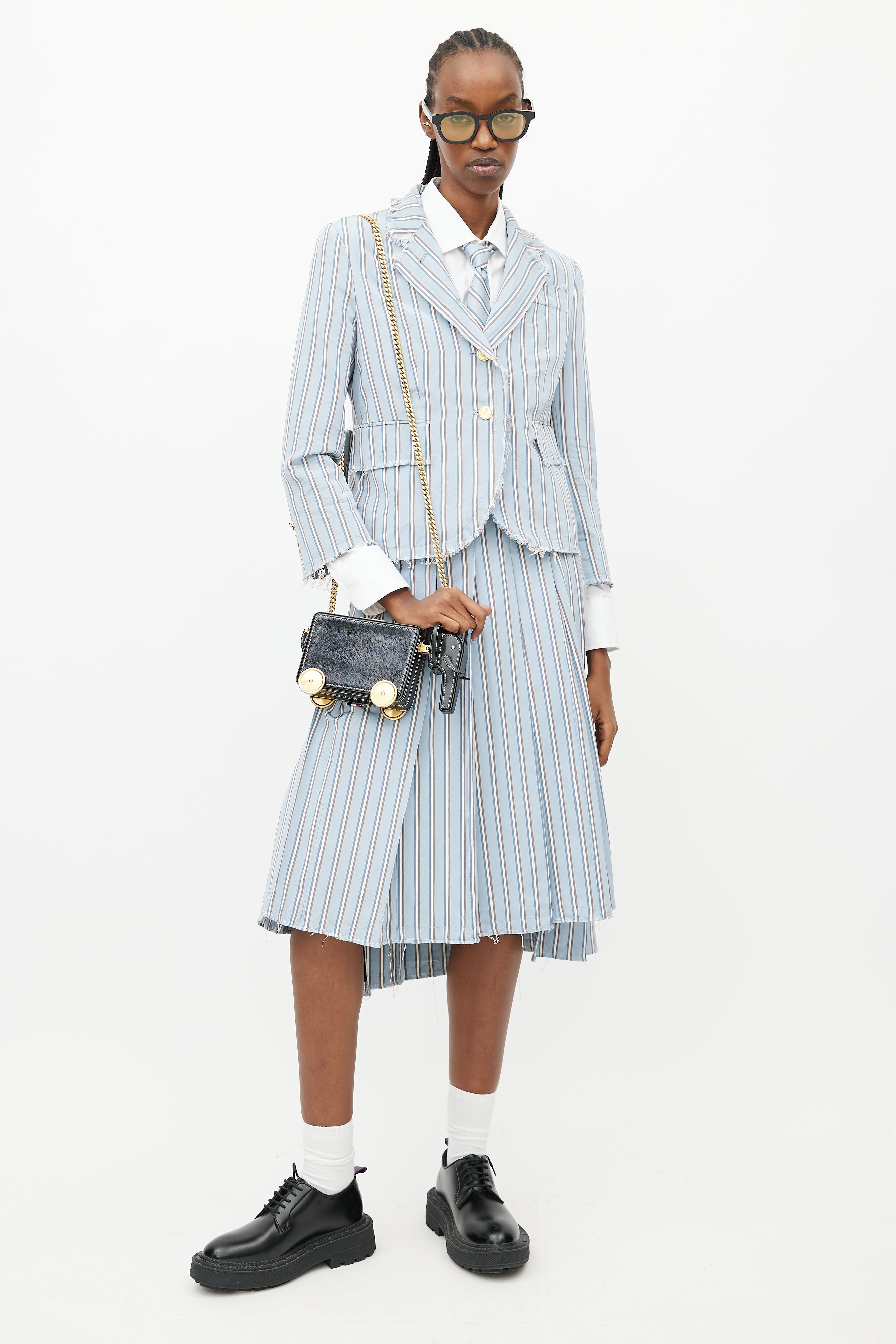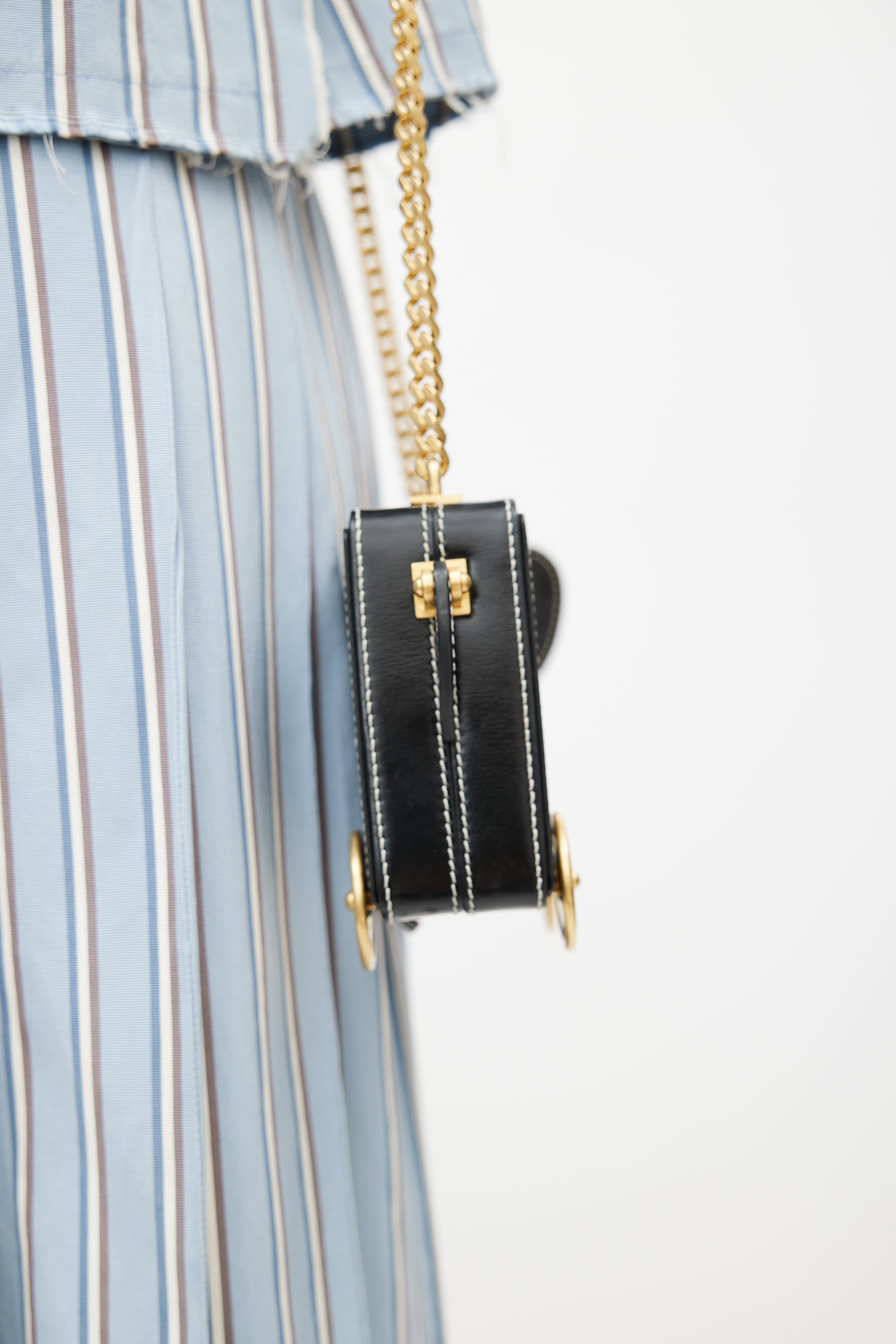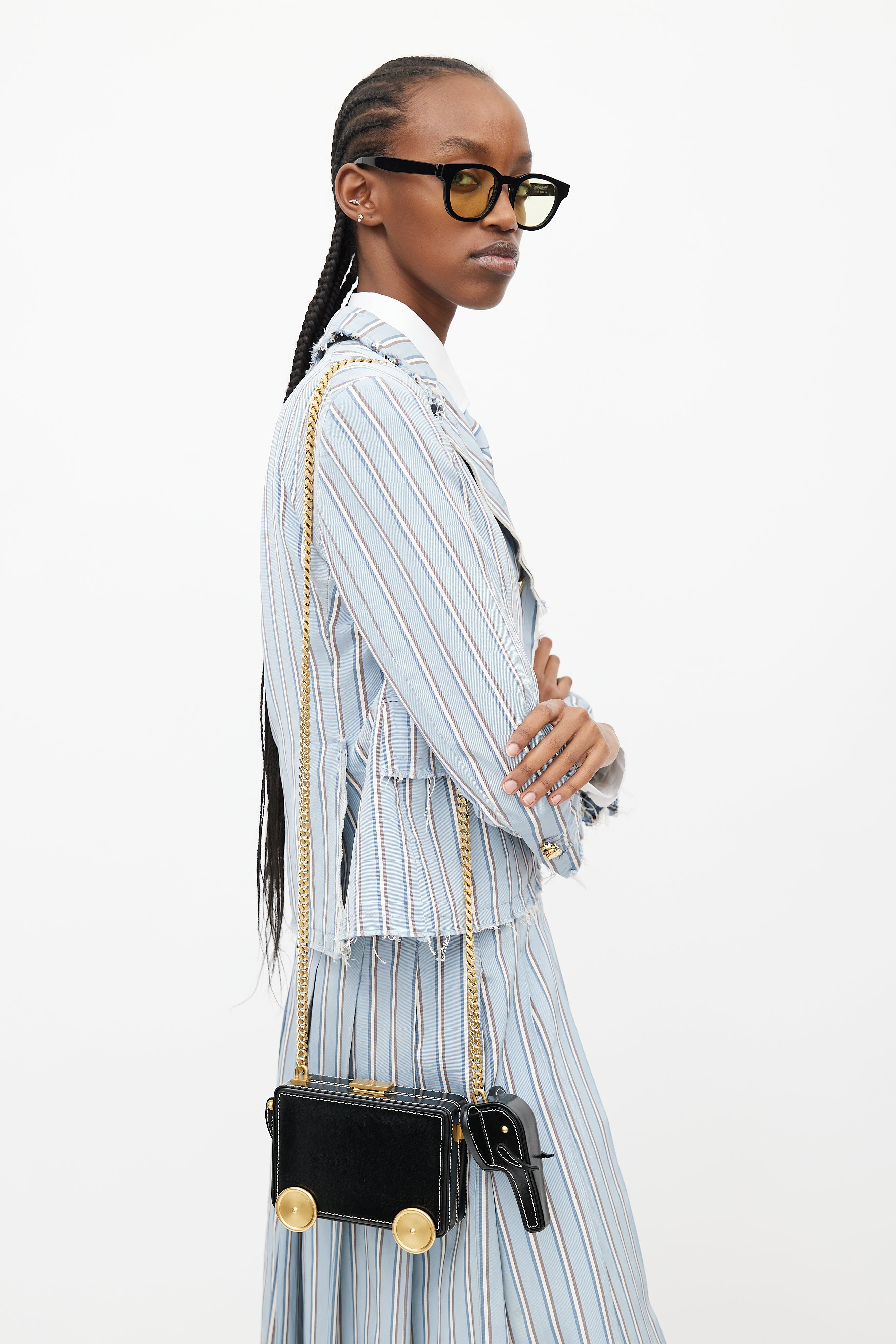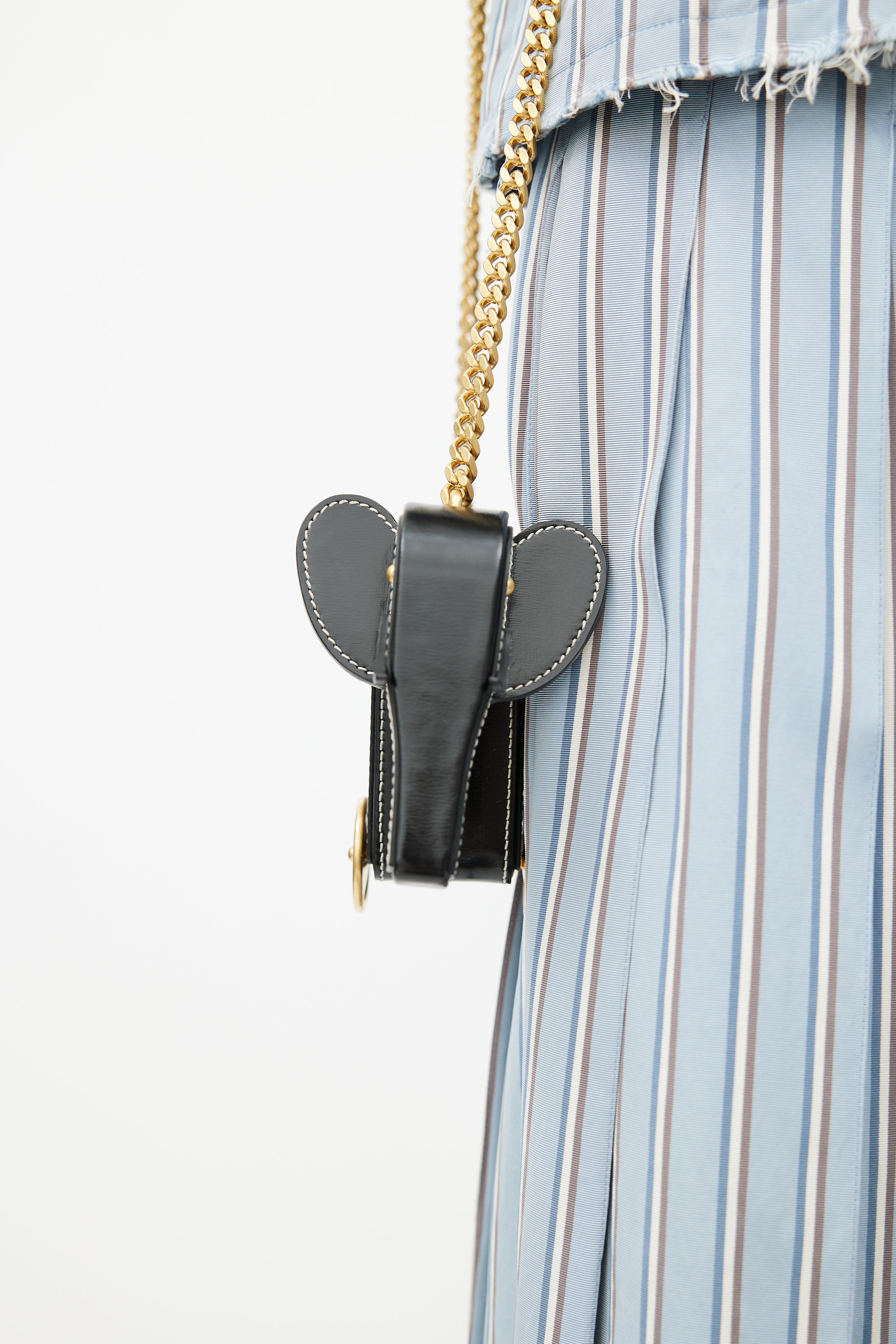 Pre-owned Thom Browne black Elephant crossbody bag featuring contrast stitch, gold tone hardware, four wheels, chain shoulder strap, hinged elephant head, push lock closure, signature red, white, blue tab, gold stamped logo, and one lined main compartment. Comes with original dust bag.