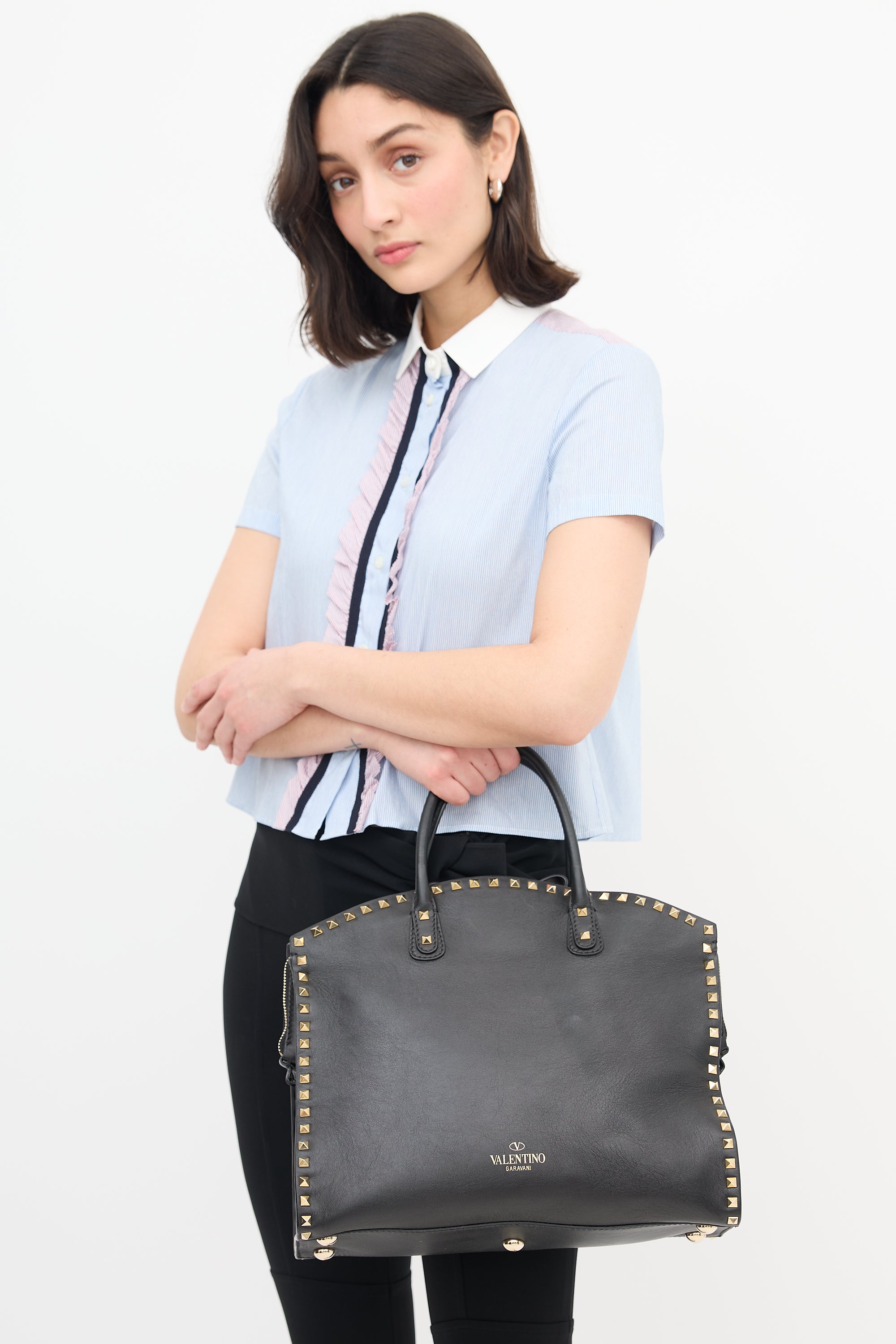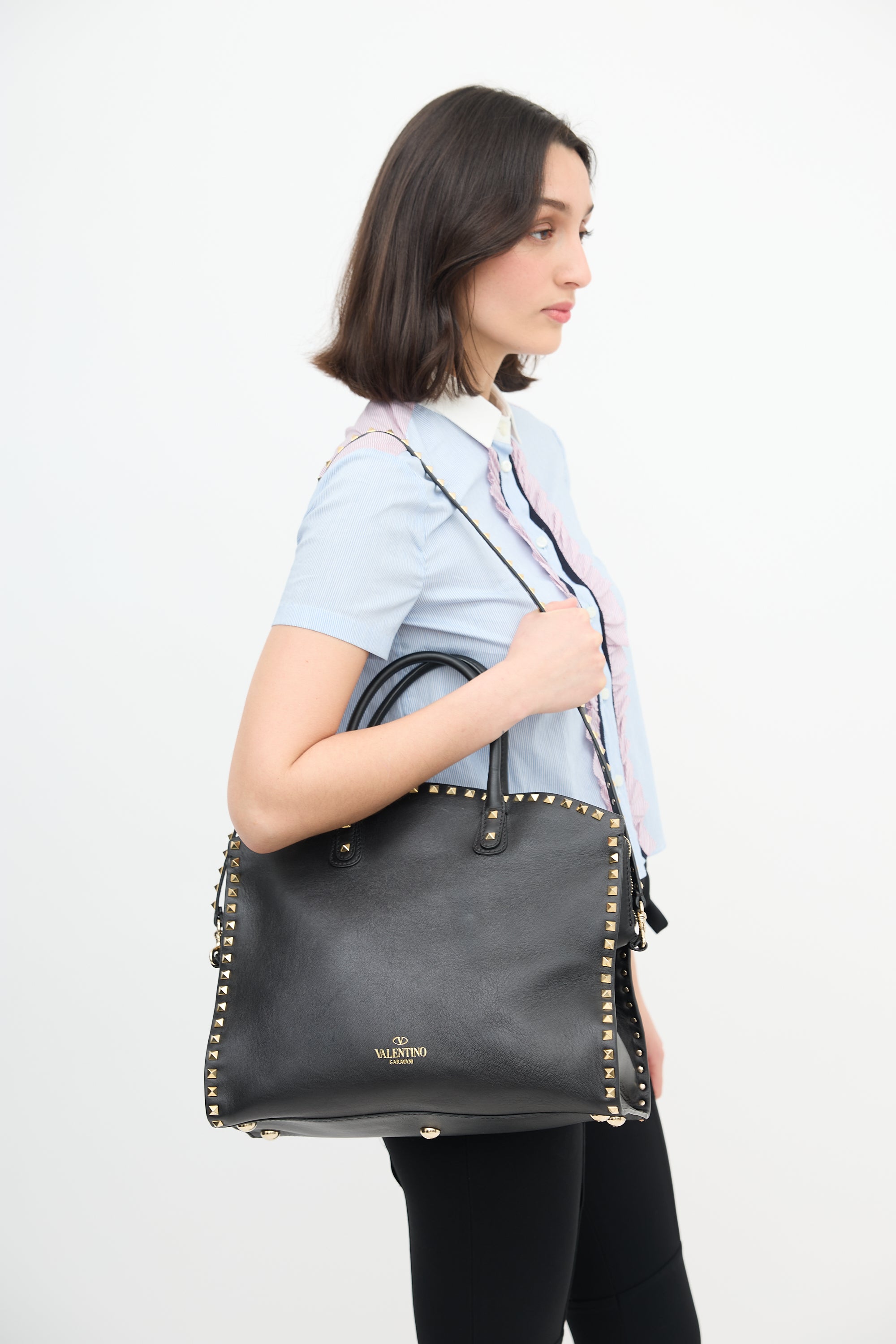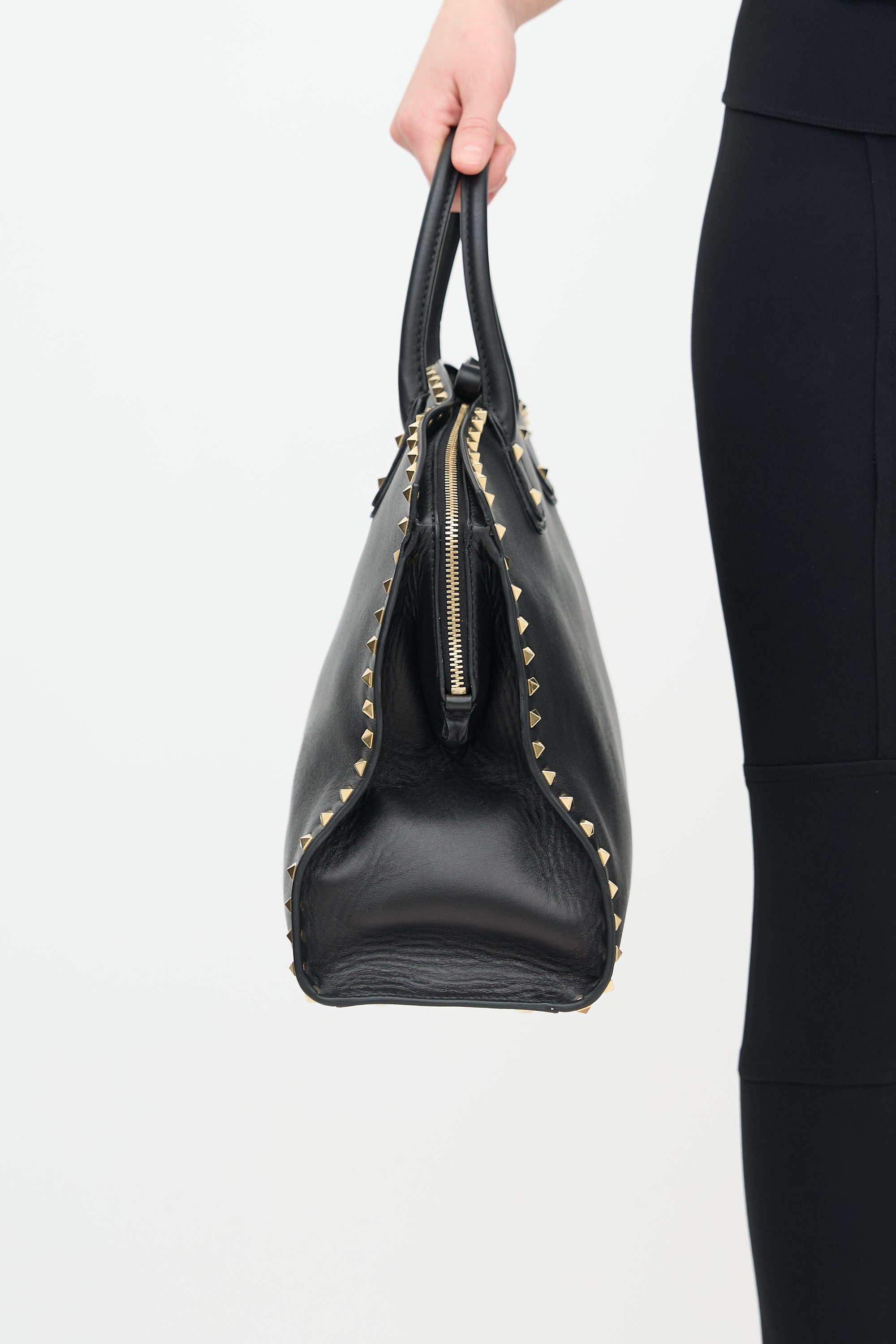 Pre-owned Valentino black leather Dome bag featuring dual rolled top handles, gold tone hardware, Rockstud embellishment throughout, stamped logo at front, zip closure at top, metal protective feet, detachable fixed crossbody strap, canvas lining, and one zip and two slip pockets inside. Comes with original dust bag.