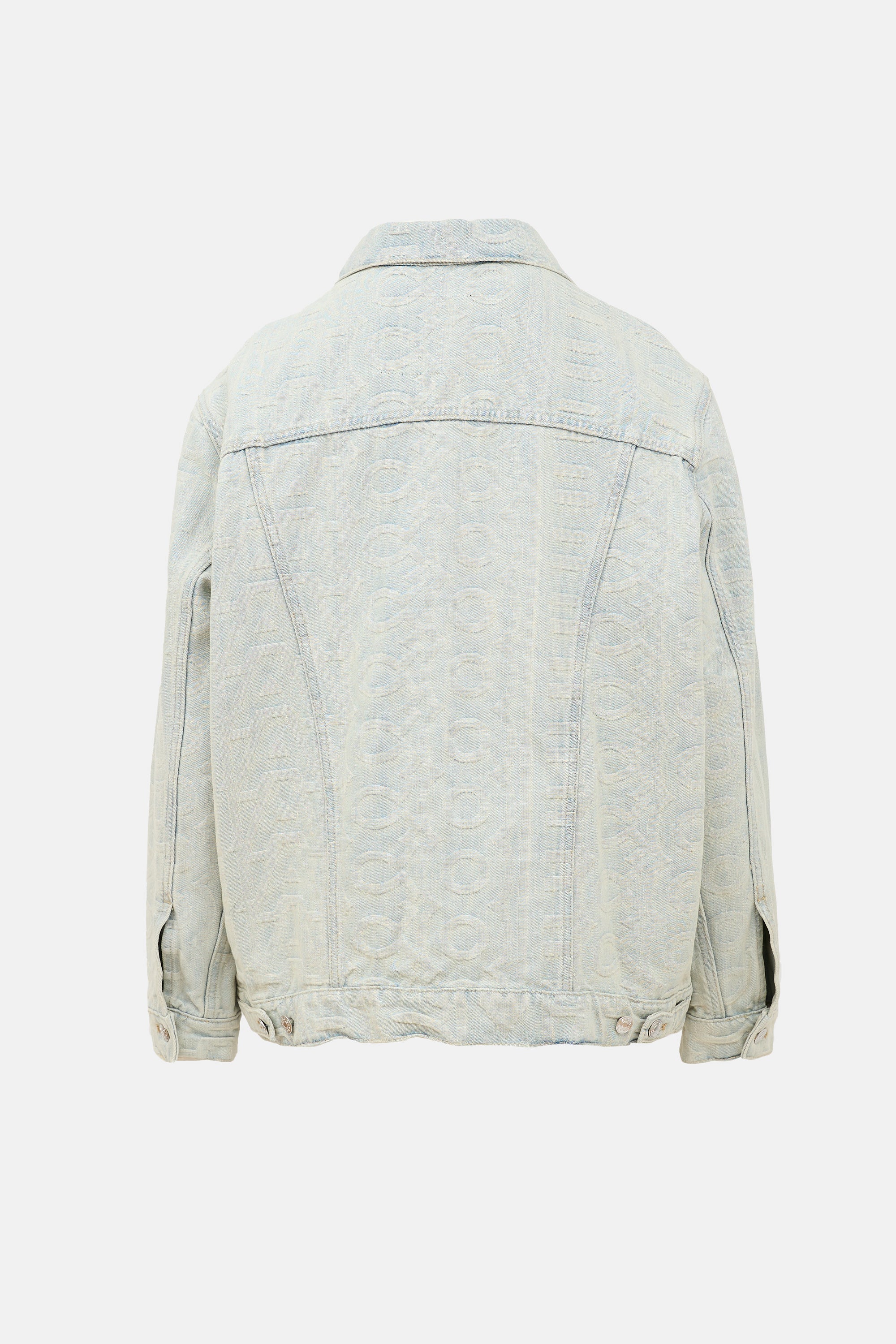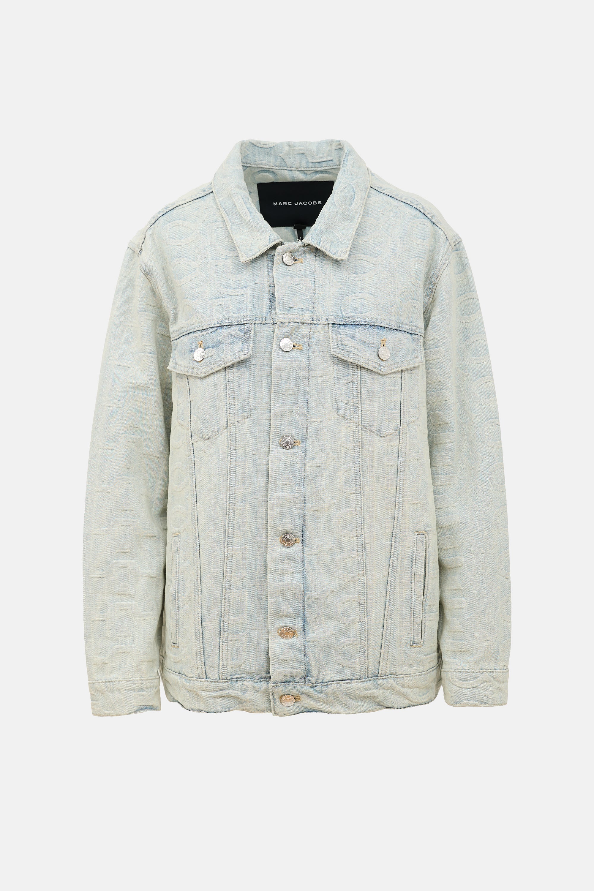 Pre-owned Marc Jacobs light wash jacket featuring classic collar, monogram pattern, button front, two flap chest pockets, two slash hip pockets, and buttoned cuffs.