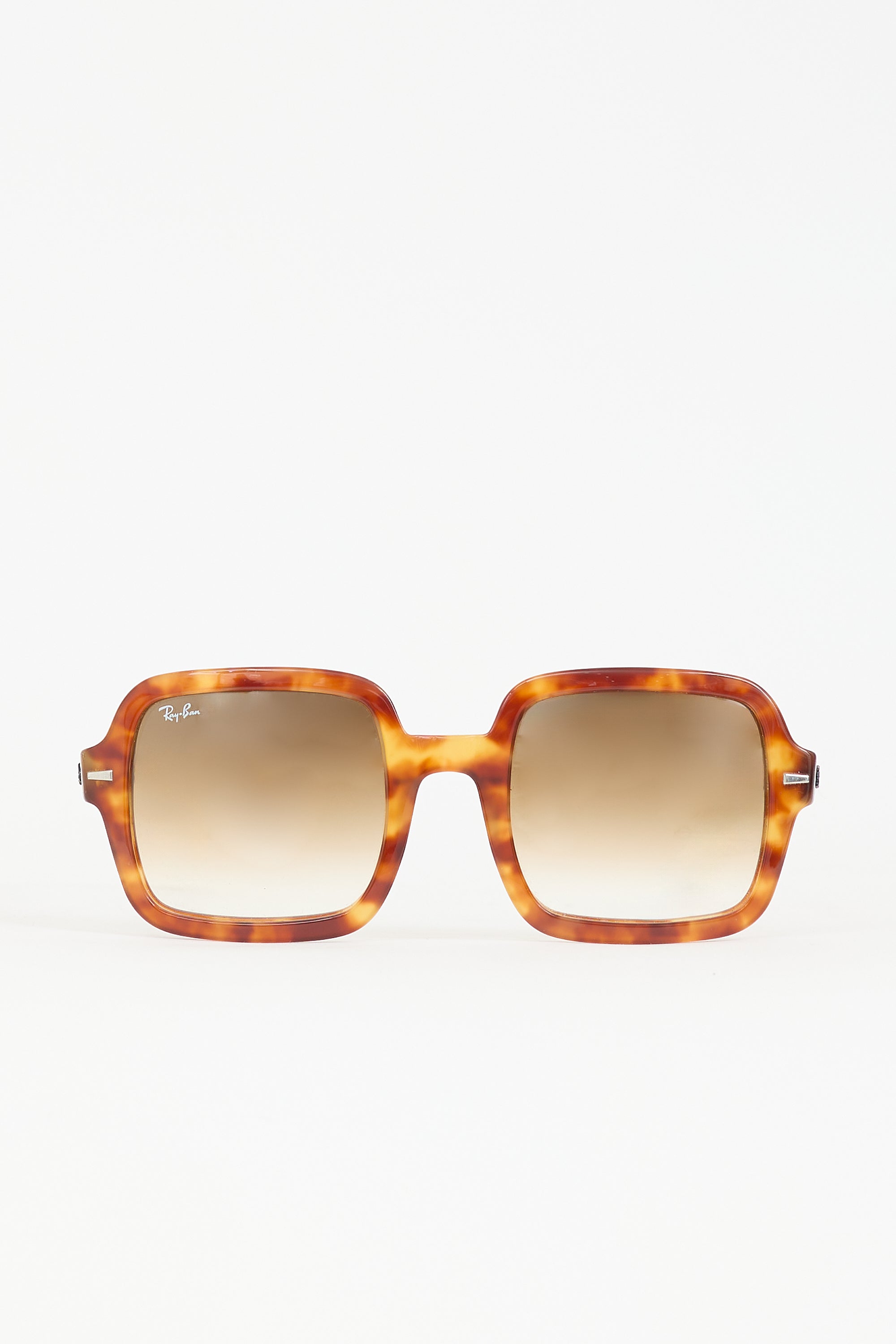 Pre-owned Ray-Ban RB2188 sunglasses featuring tortoiseshell square frame, brown gradient tinted lenses, saddle nose bridge, silver tone embossed logo at temples. Comes with original case.