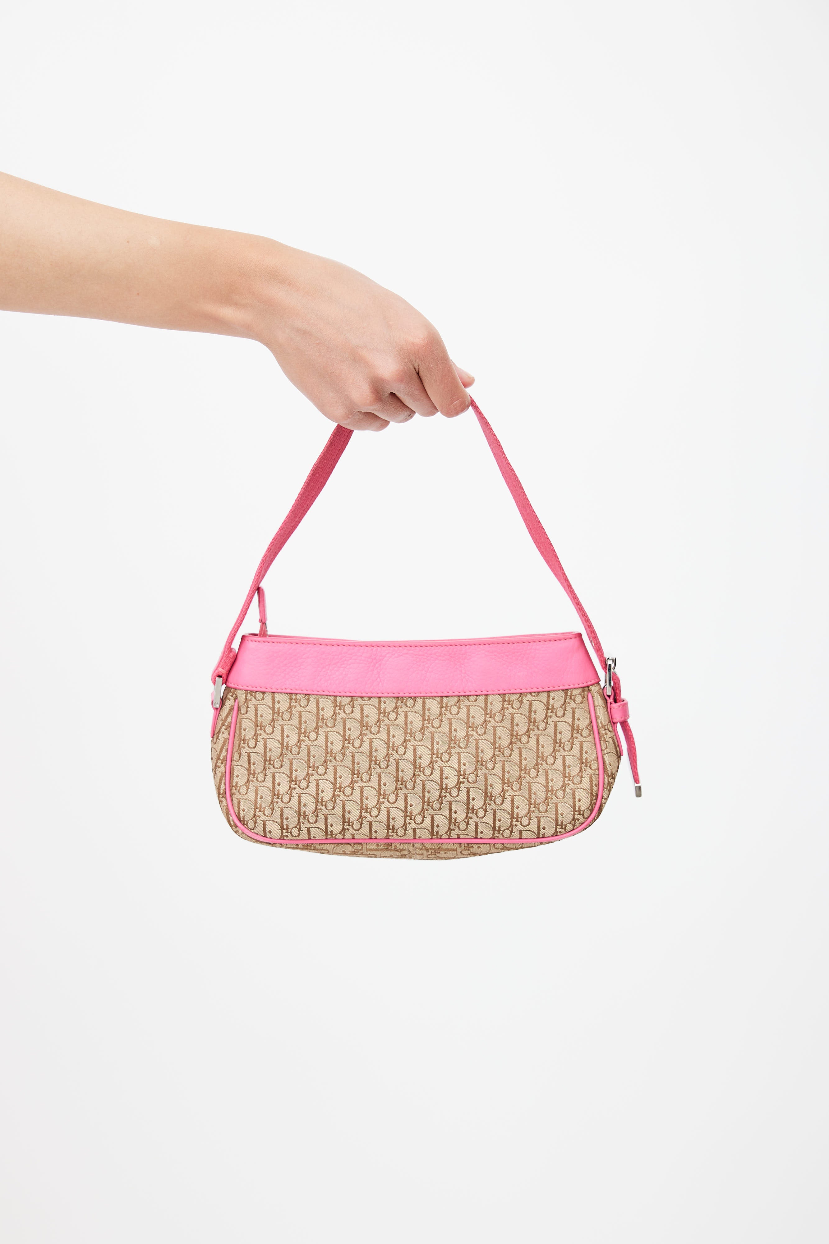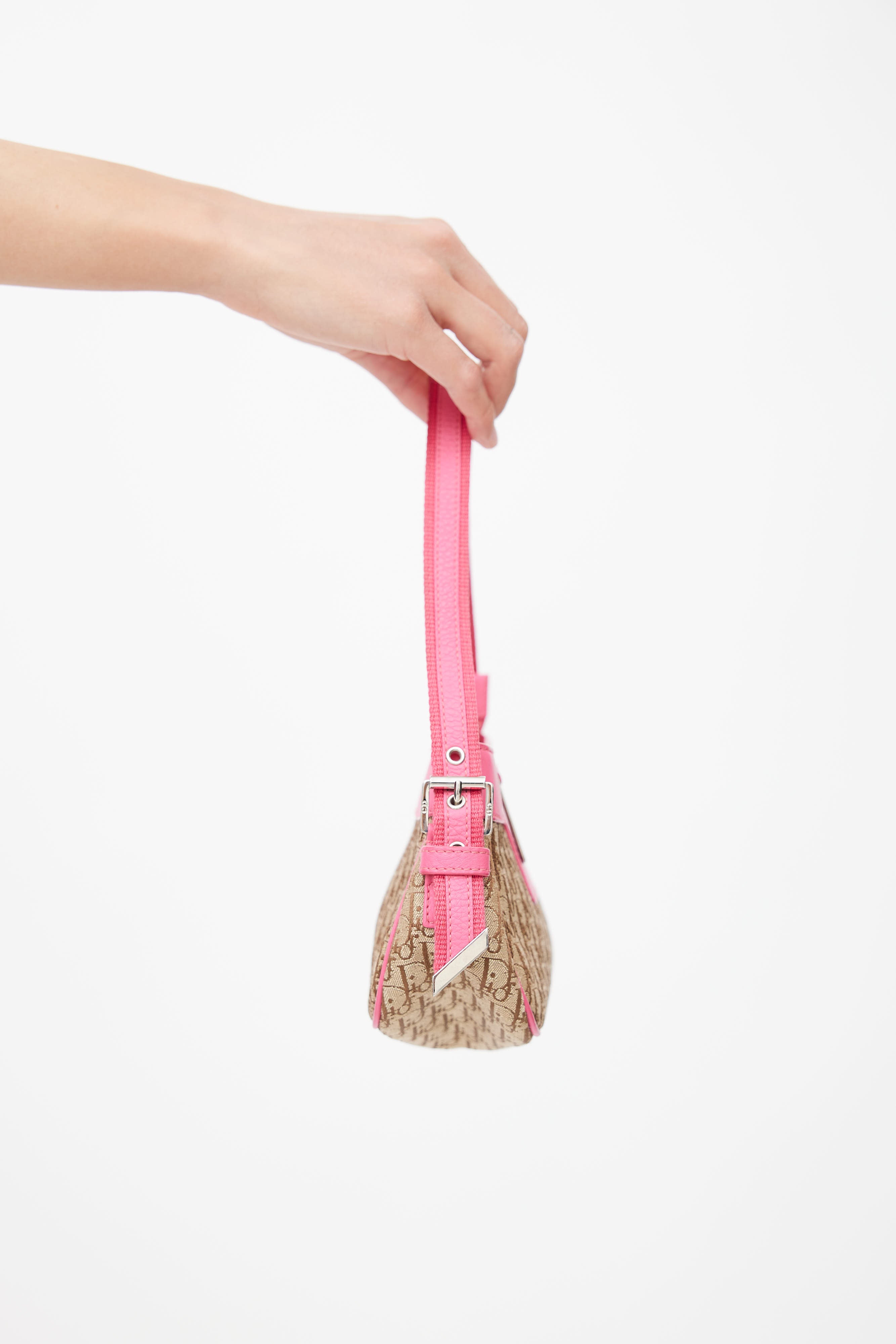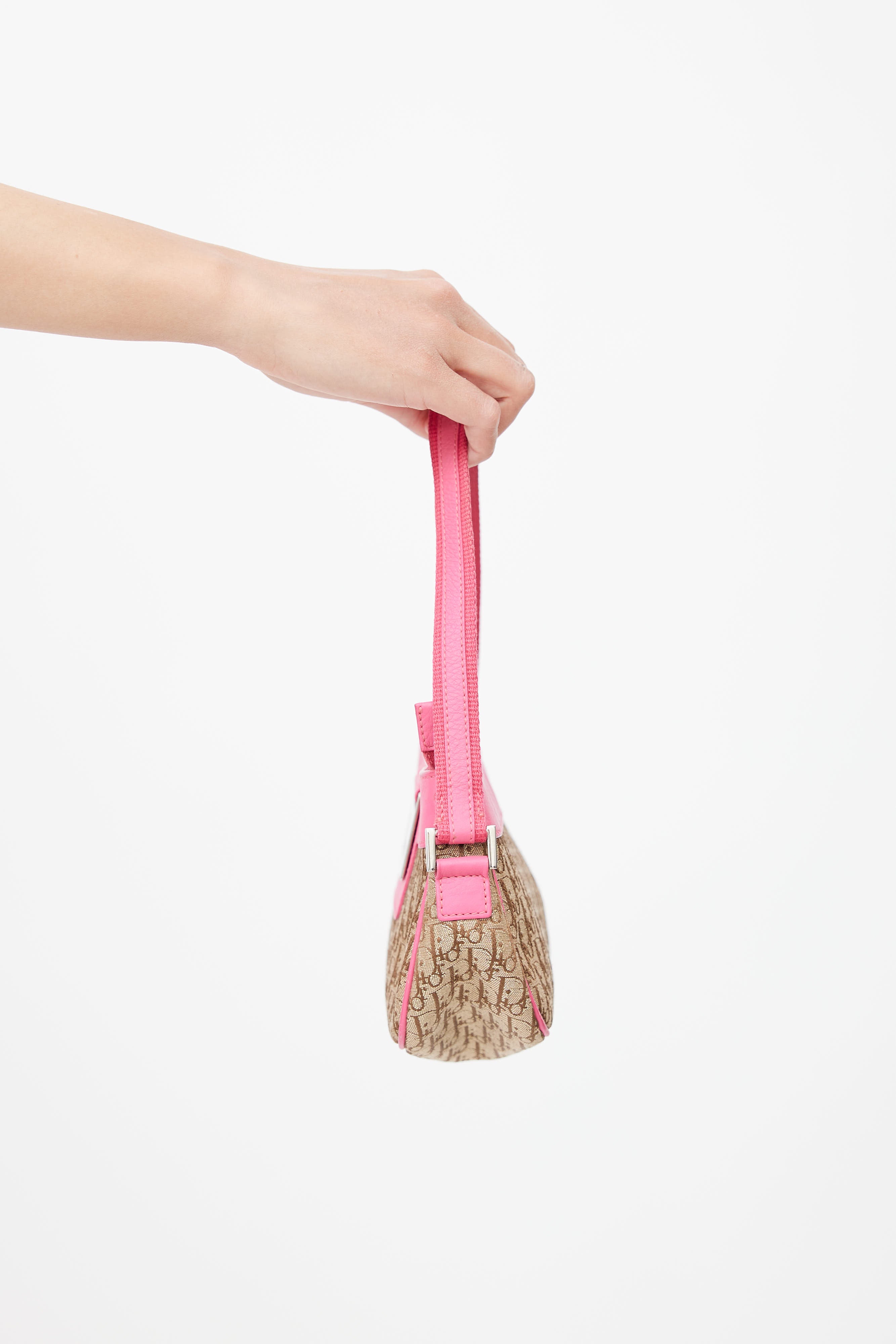 Pre-owned 2005 Dior pochette featuring beige Diorissimo monogram, pink leather trim, silver tone logo hardware at face, adjustable shoulder strap, top zip closure, nylon main compartment, and interior zip pocket.