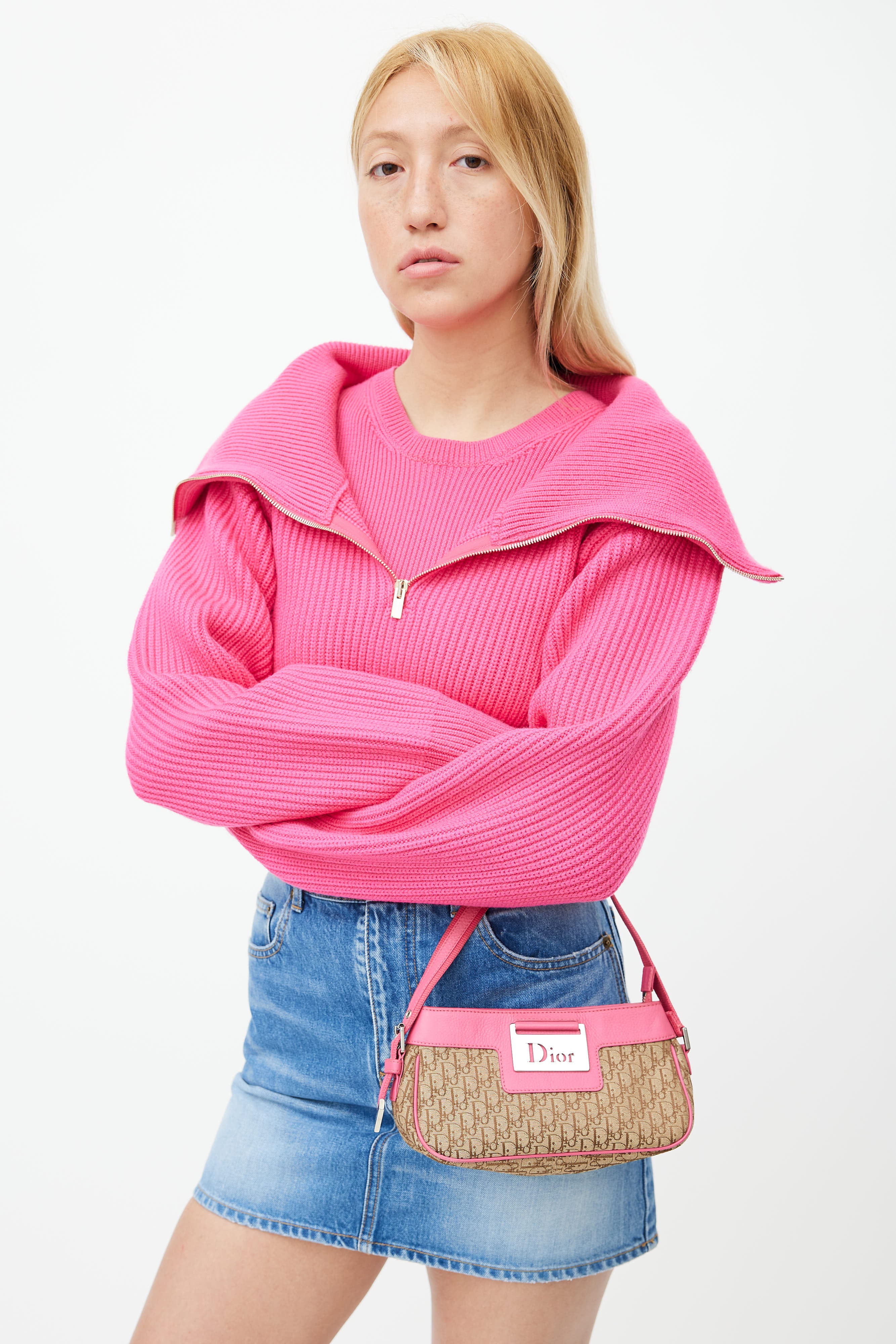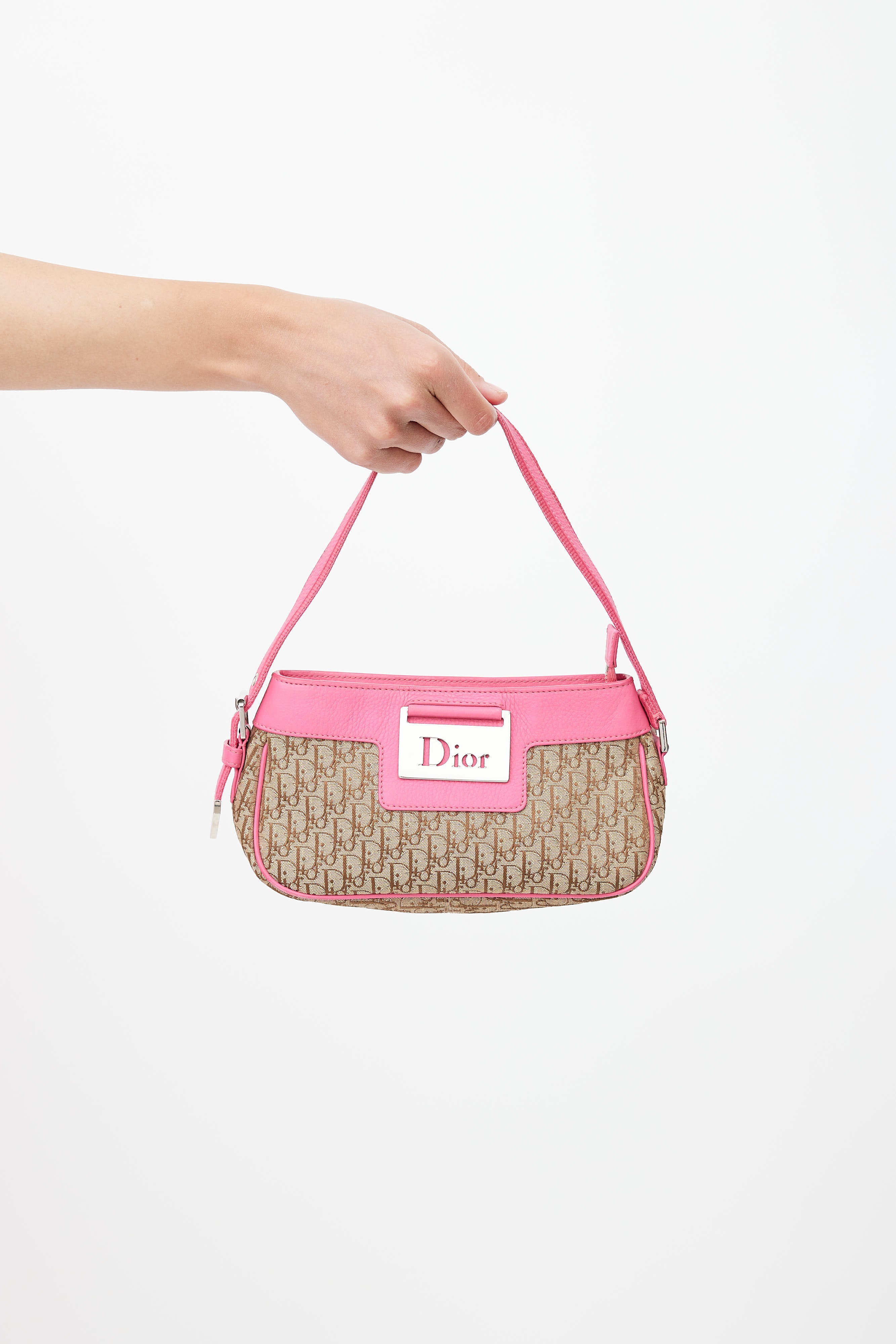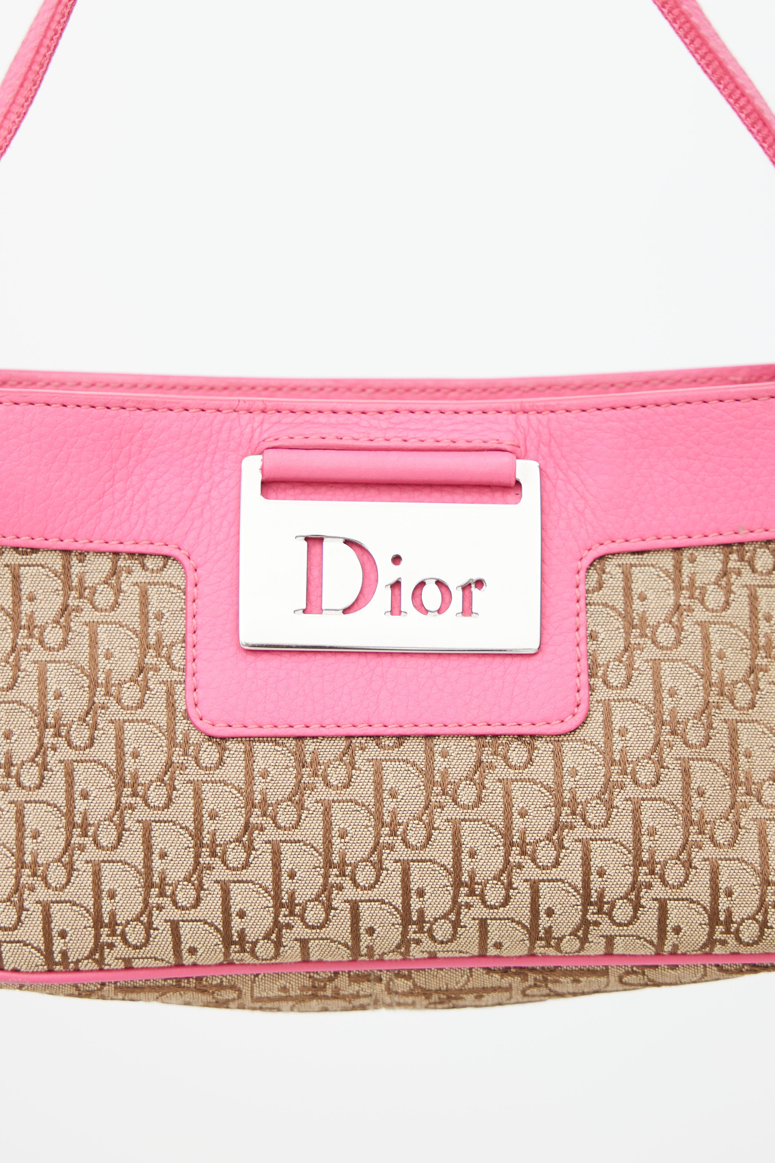 Pre-owned 2005 Dior pochette featuring beige Diorissimo monogram, pink leather trim, silver tone logo hardware at face, adjustable shoulder strap, top zip closure, nylon main compartment, and interior zip pocket.