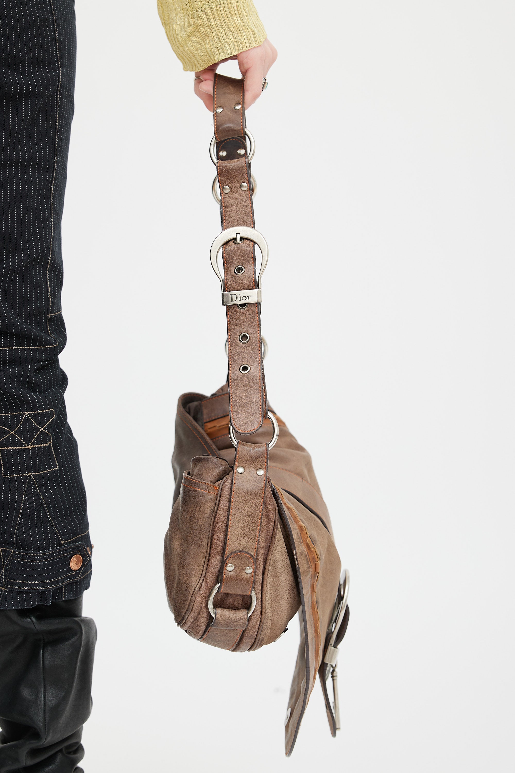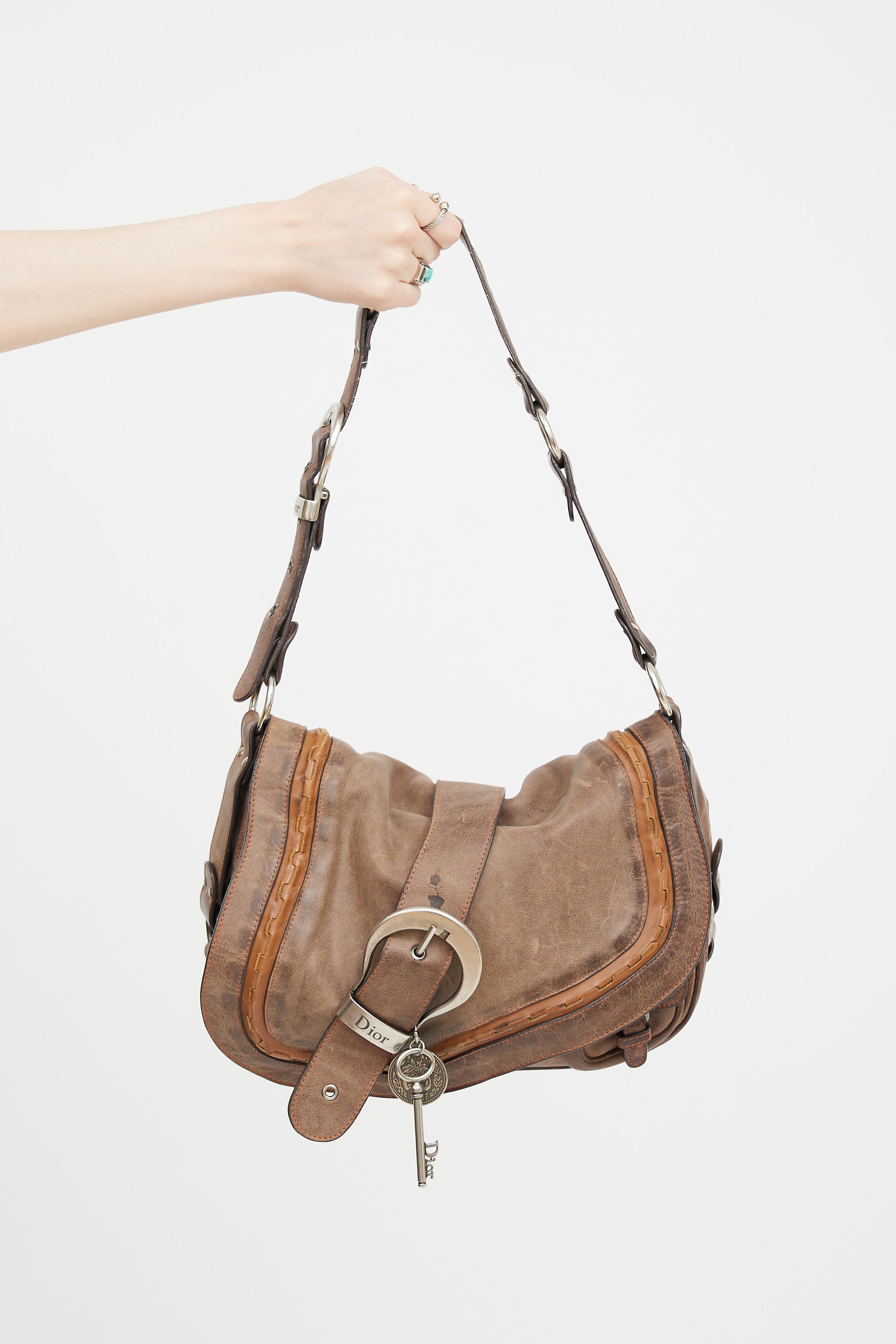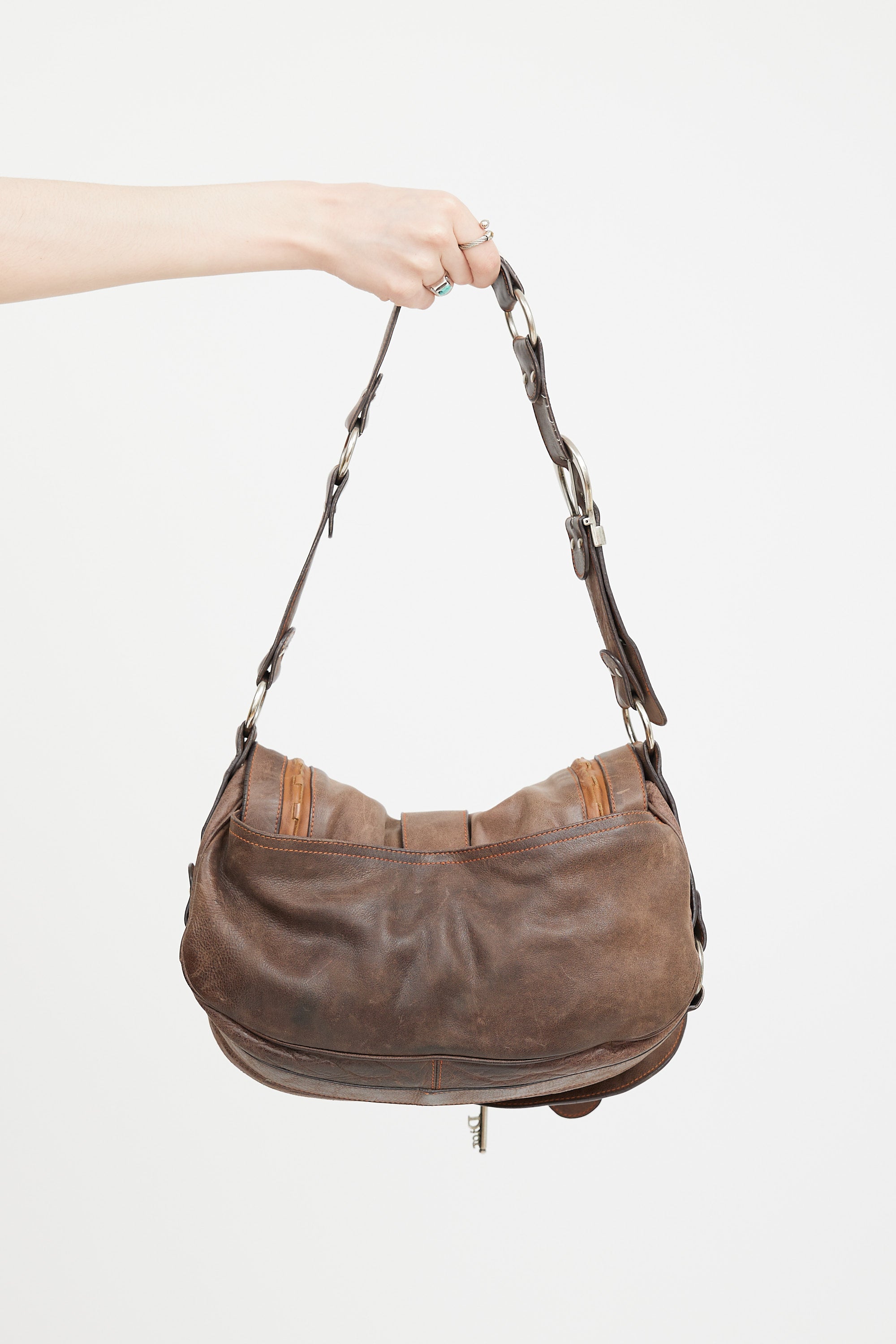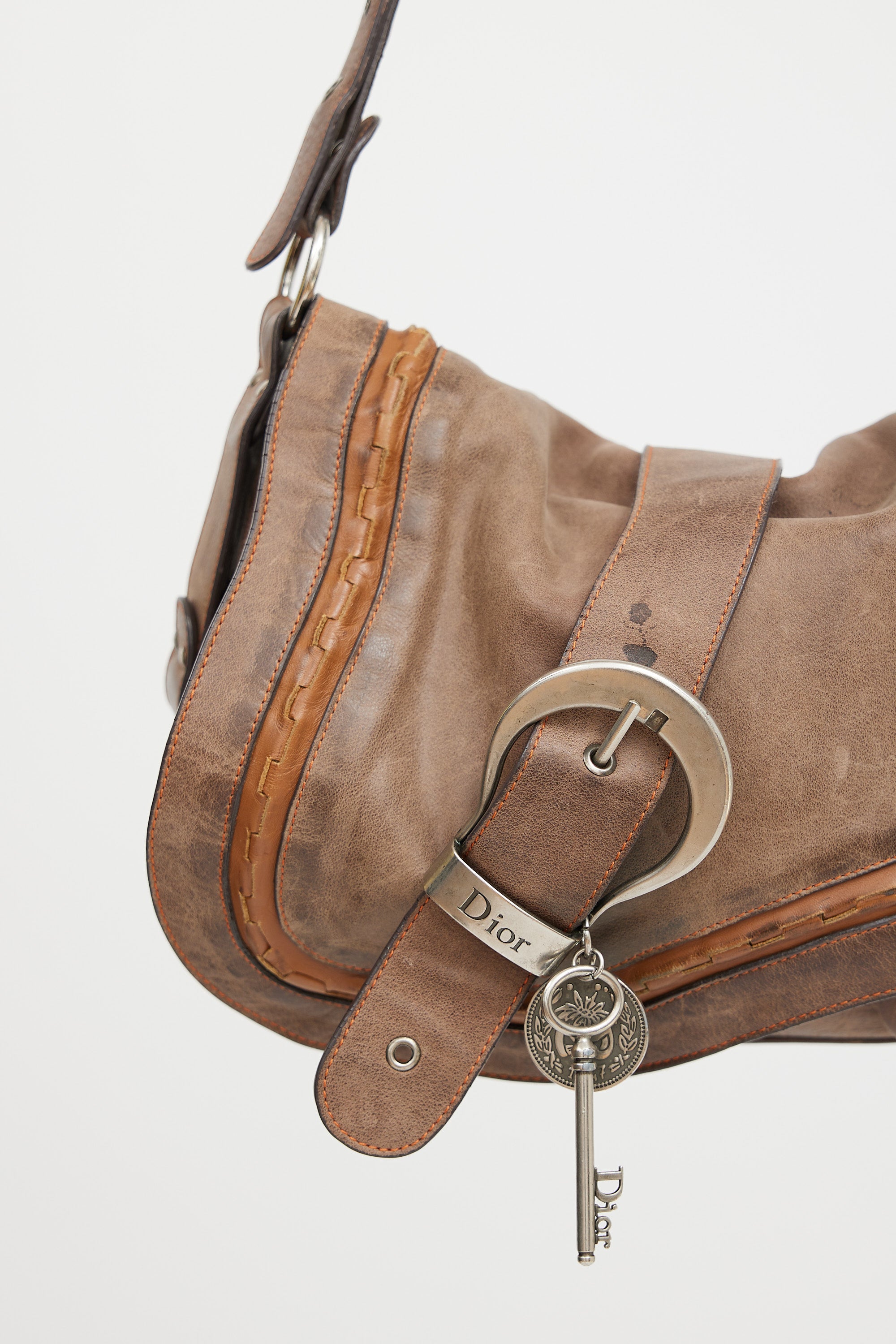 Pre-owned Christian Dior SS 2006 brown leather Gaucho Saddle shoulder bag featuring distressed leather, oversized buckle detail at front with key and coin charm, magnetic button closure, adjustable shoulder strap with metal rings, brushed silver tone hardware, slip pocket at back, one small pocket under top flap, monogram canvas lining, and one zip pocket inside. John Galliano era design.