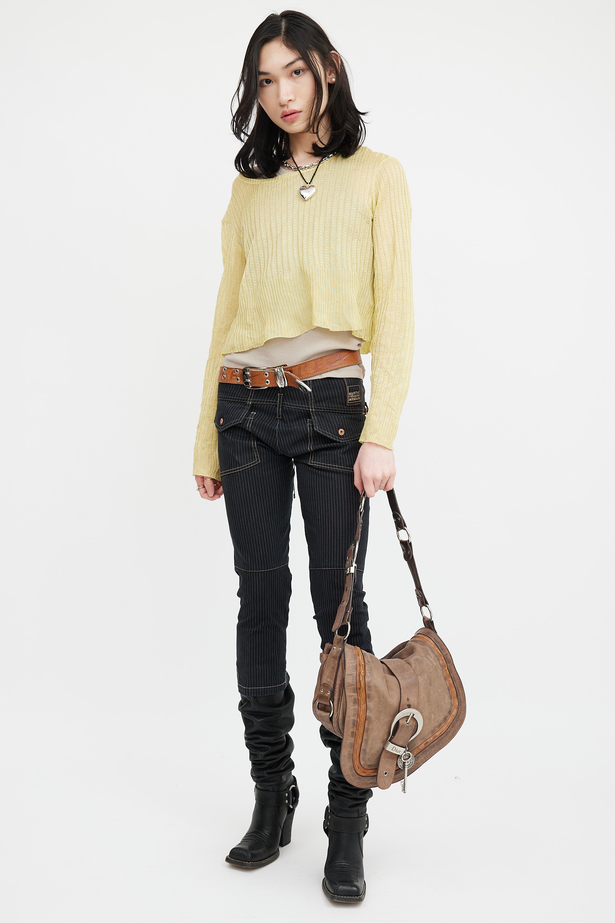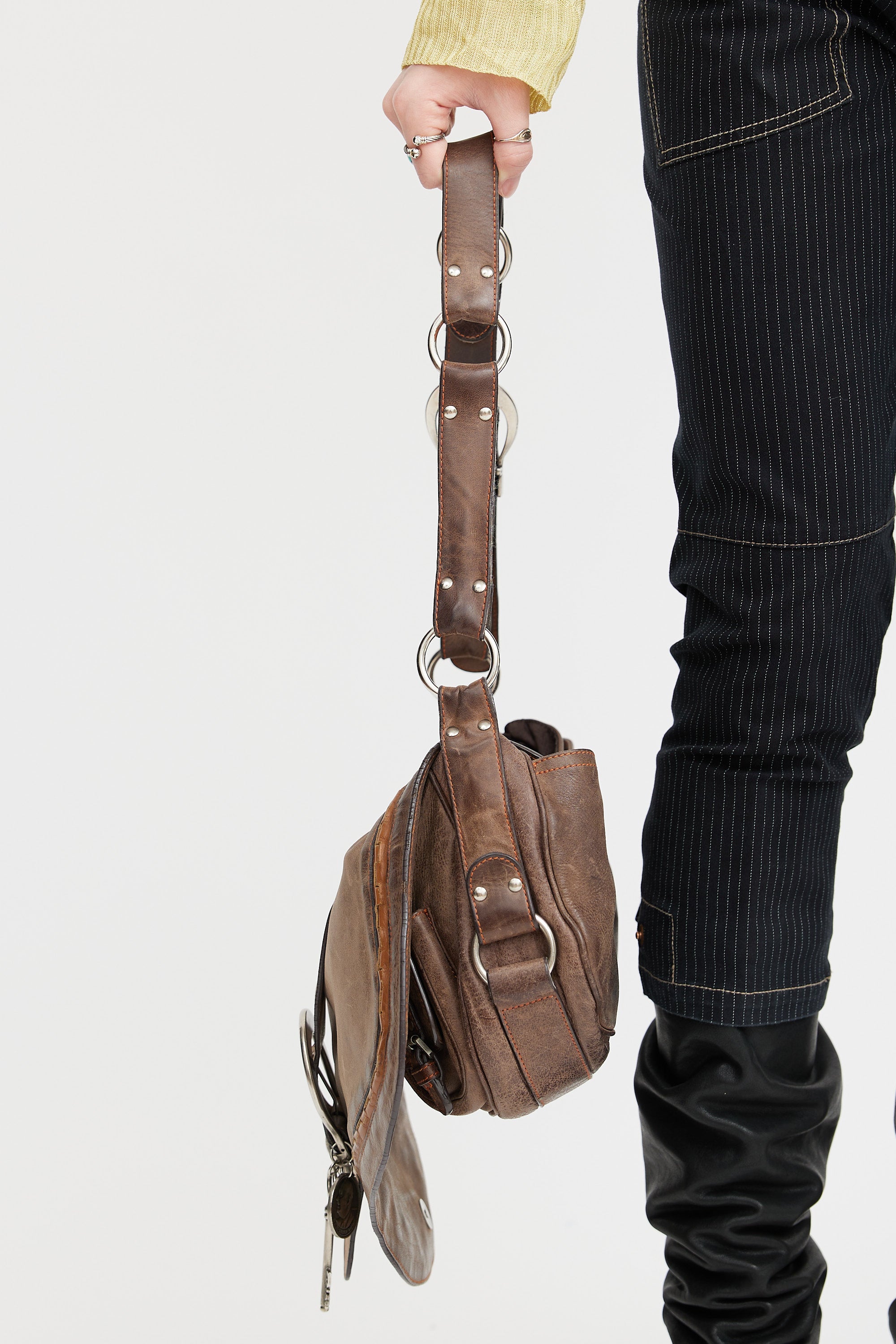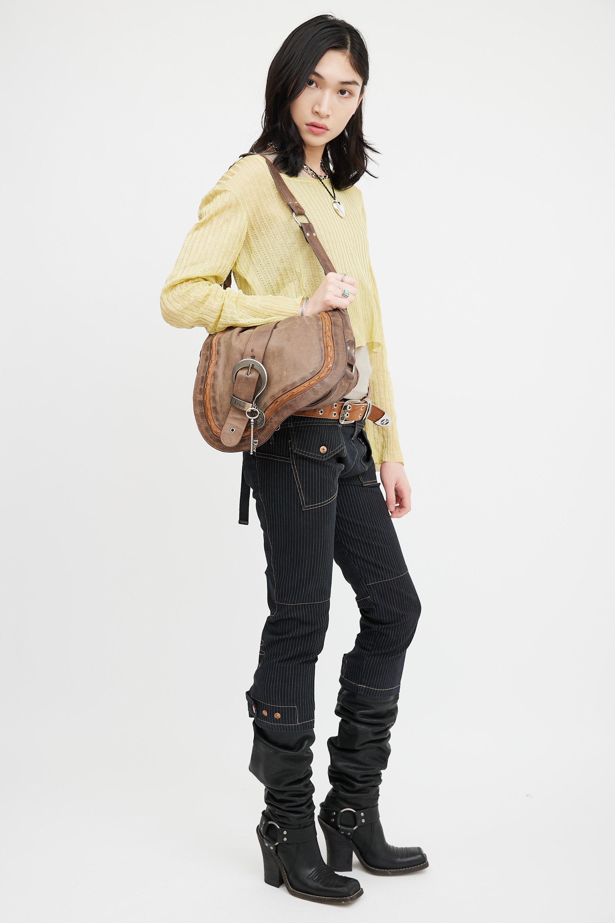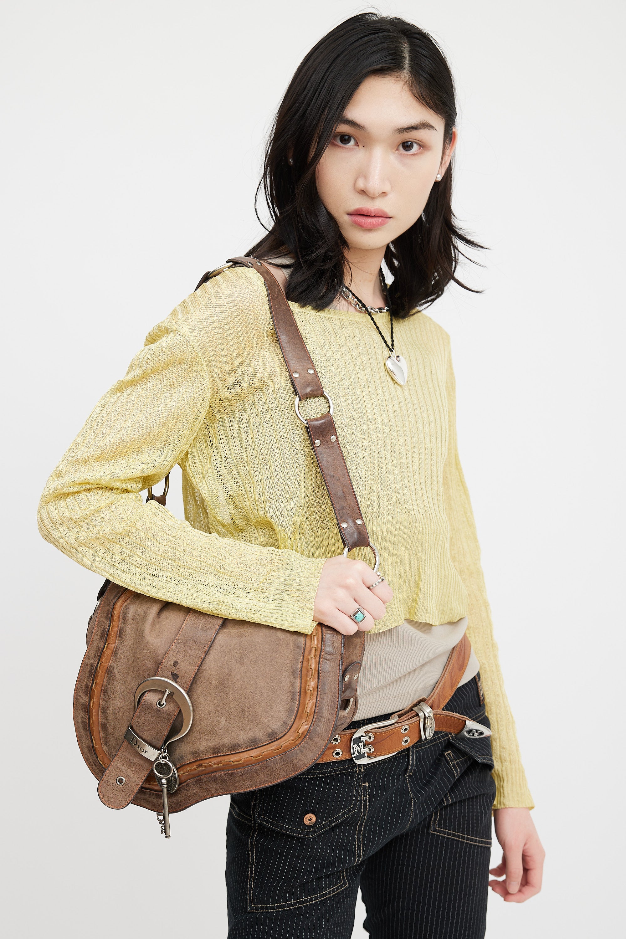 Pre-owned Christian Dior SS 2006 brown leather Gaucho Saddle shoulder bag featuring distressed leather, oversized buckle detail at front with key and coin charm, magnetic button closure, adjustable shoulder strap with metal rings, brushed silver tone hardware, slip pocket at back, one small pocket under top flap, monogram canvas lining, and one zip pocket inside. John Galliano era design.