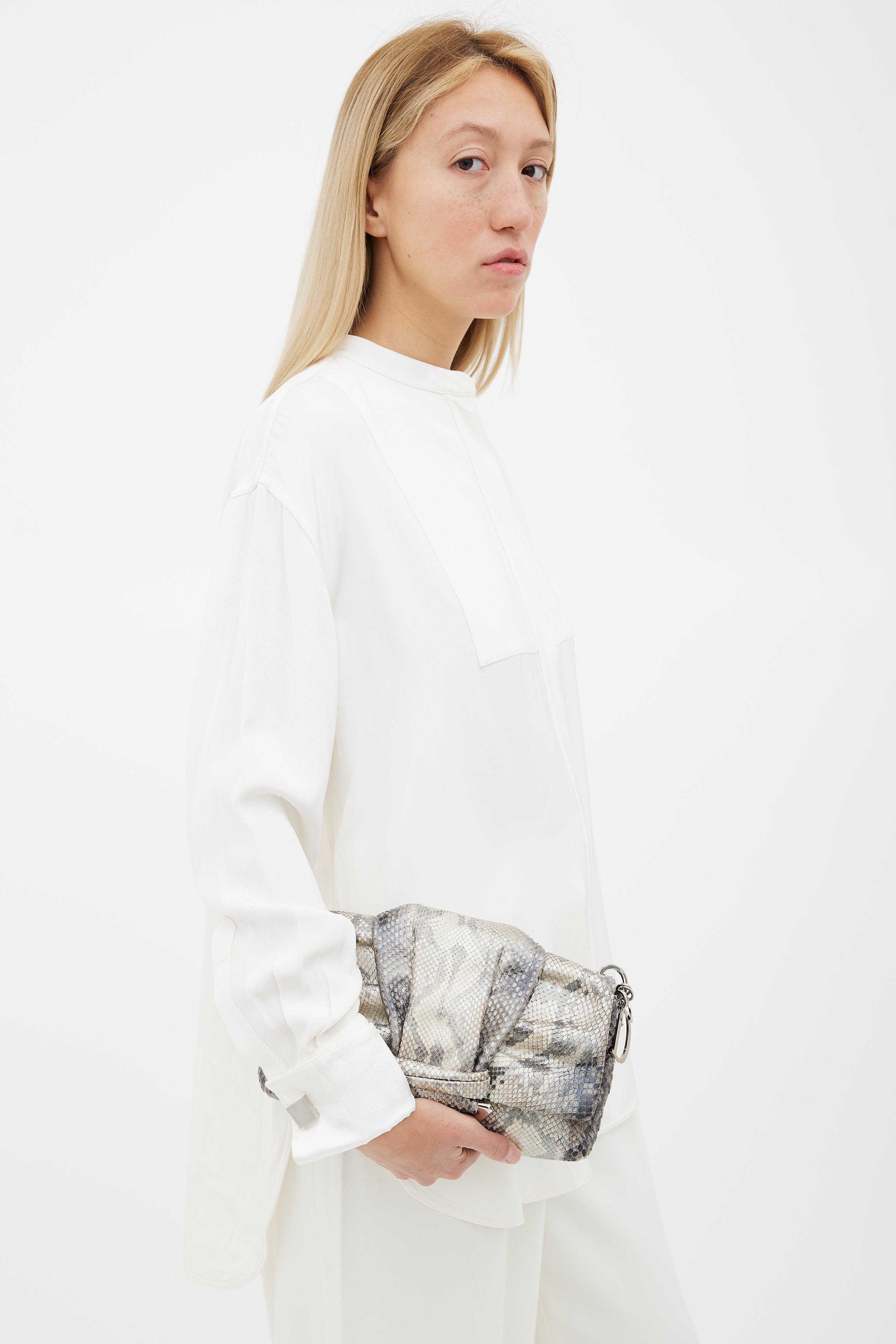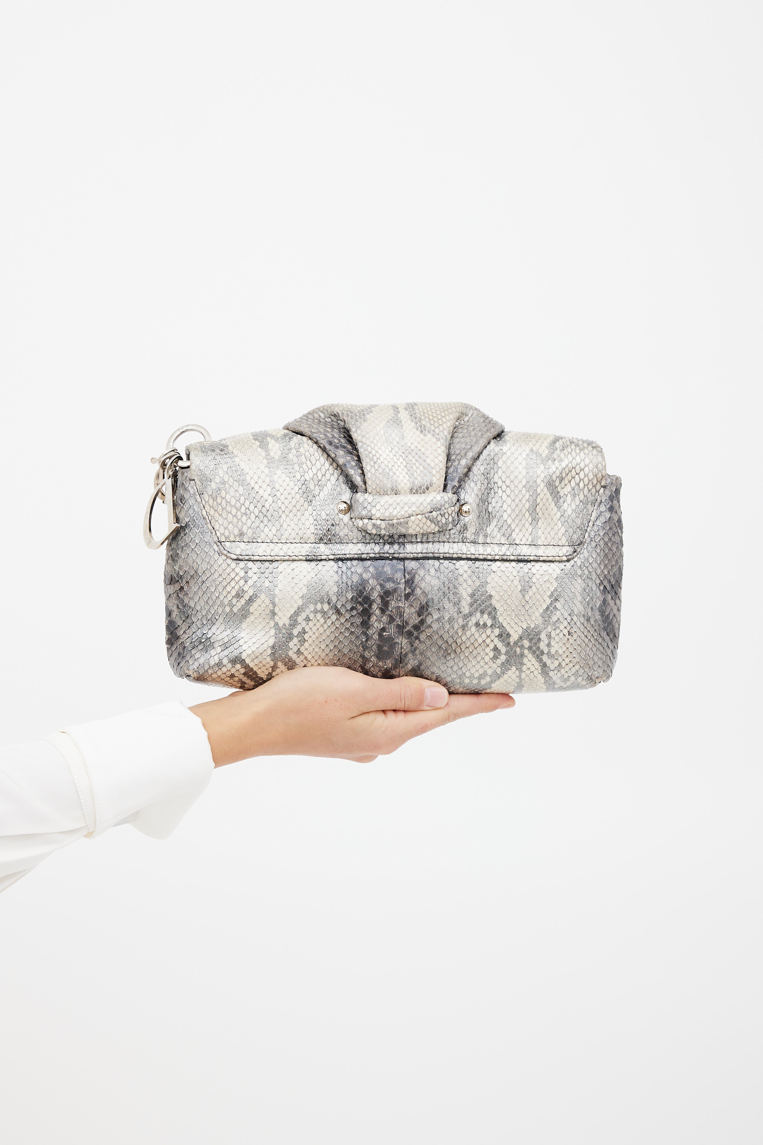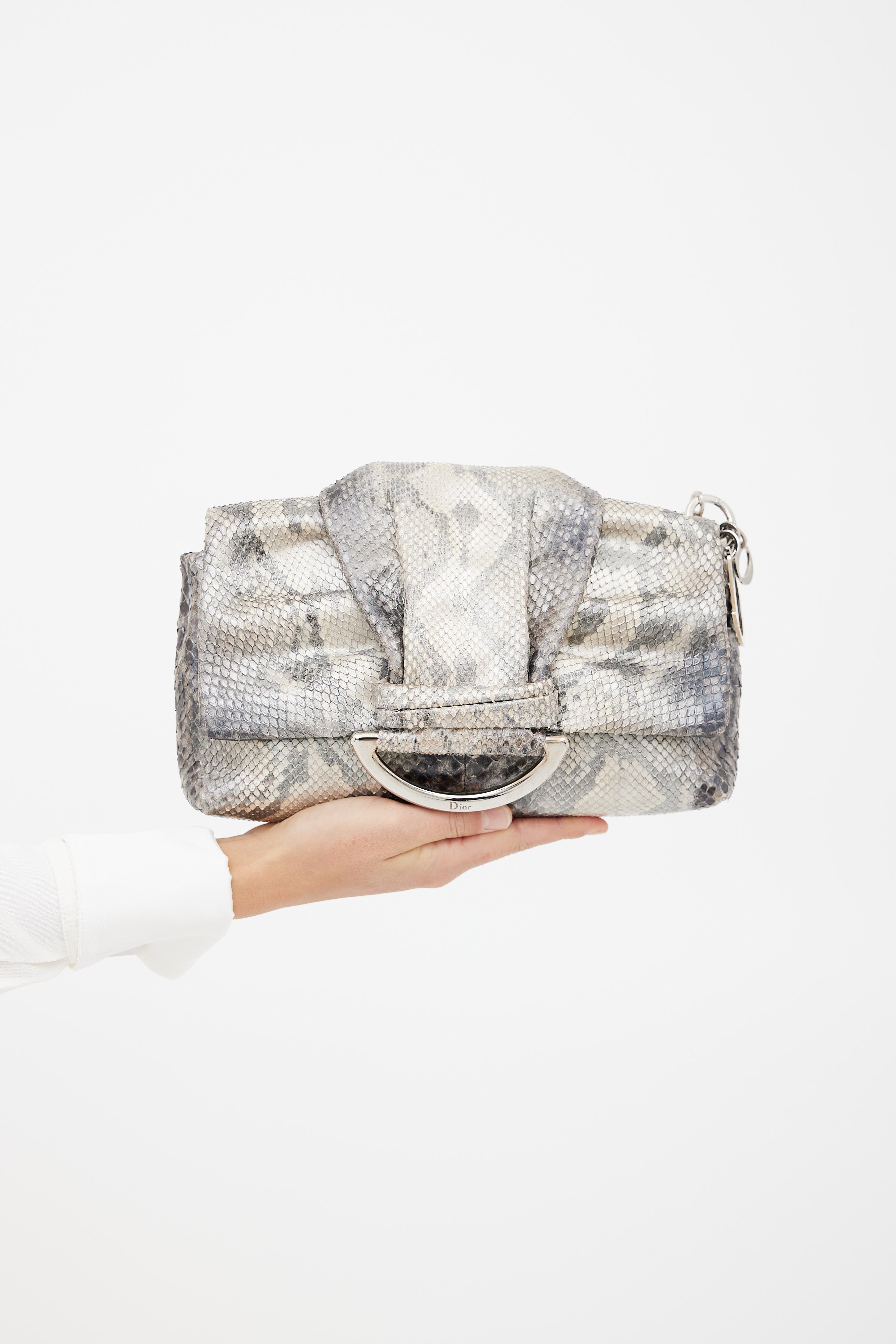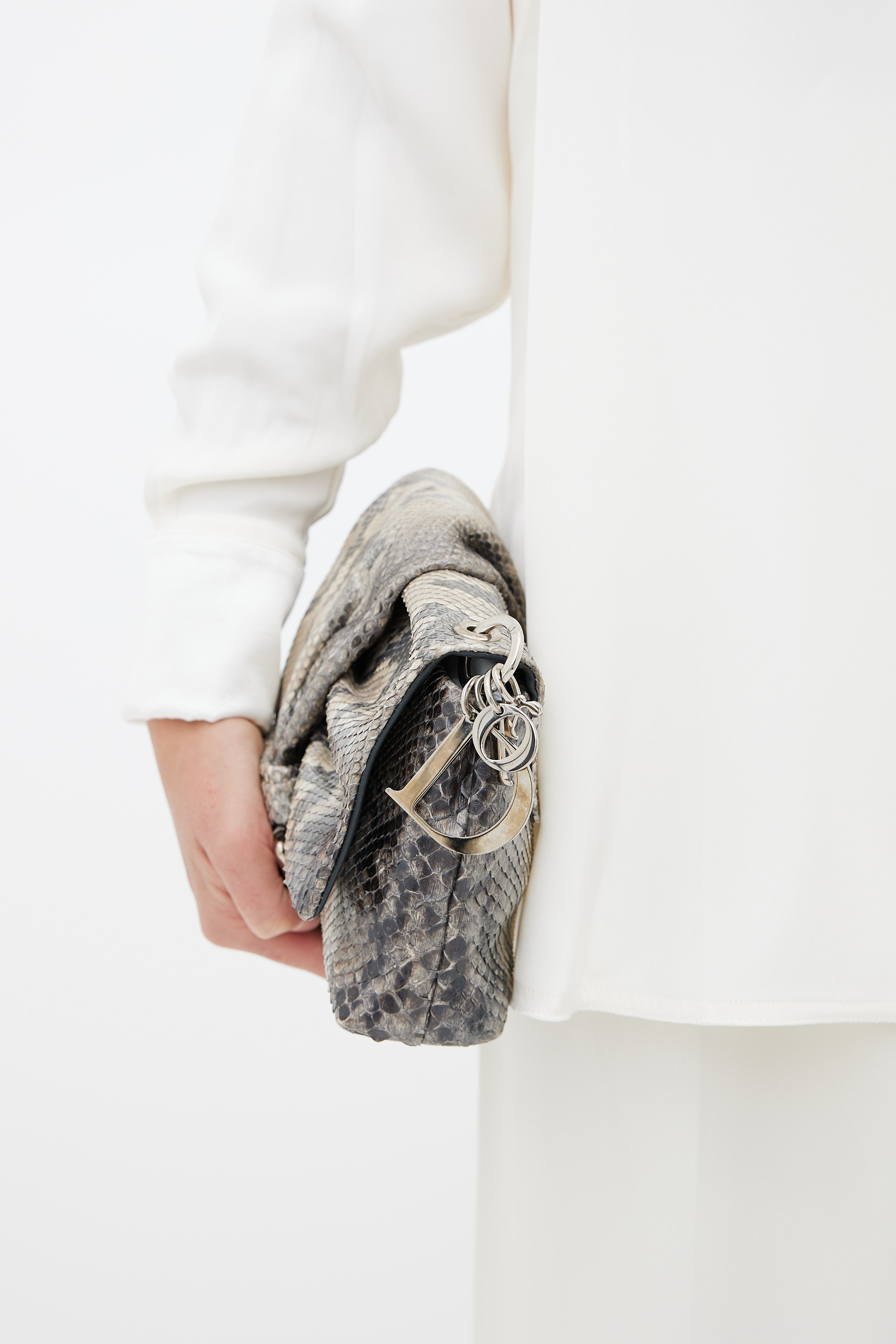 Pre-owned 2009 Dior Demi Lune clutch featuring grey python base, silver-tone hardware, magnetic closure, silver-tone logo charm, single main compartment design, and zippered side pocket with python trim and logo tab. Original dust bag included.
