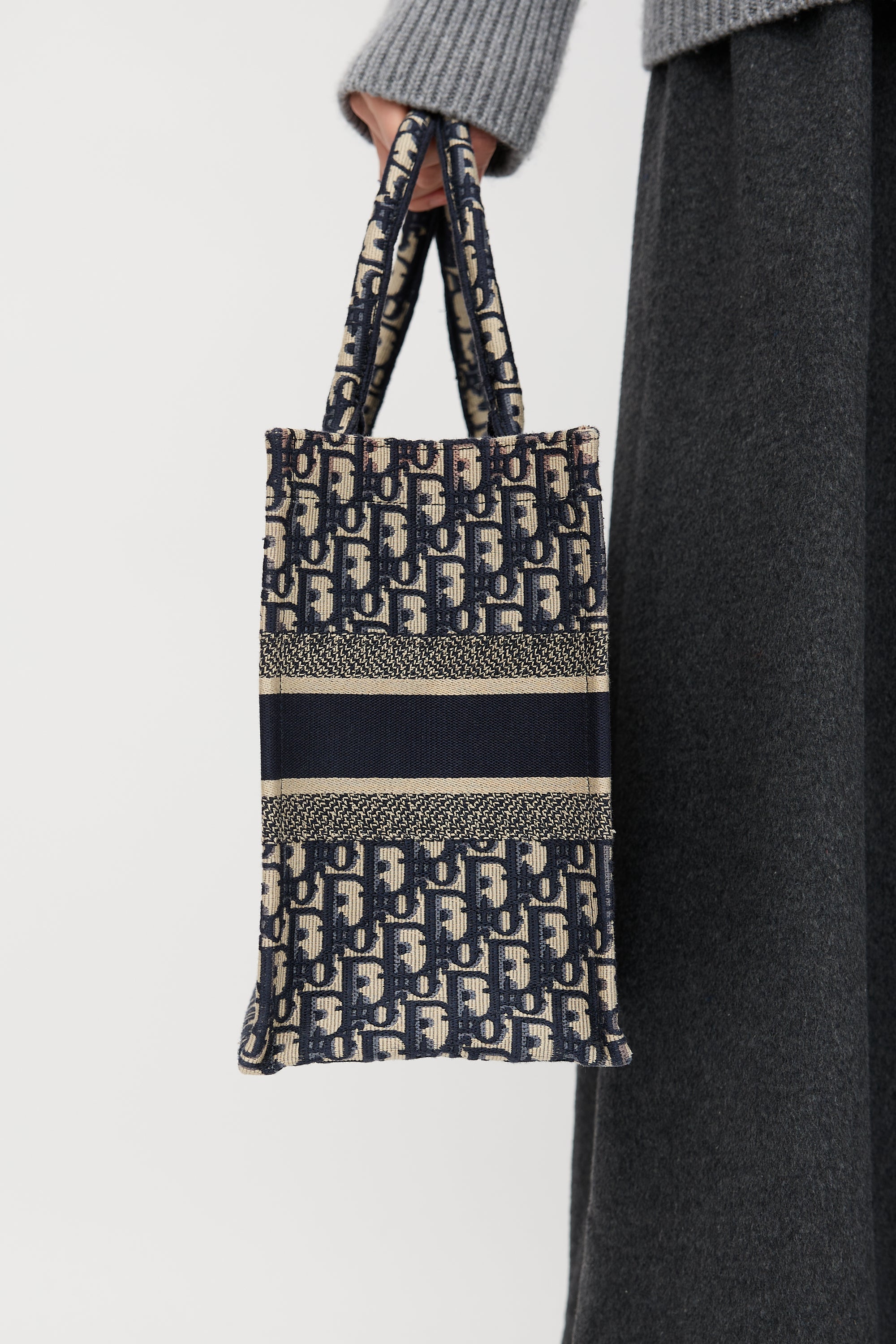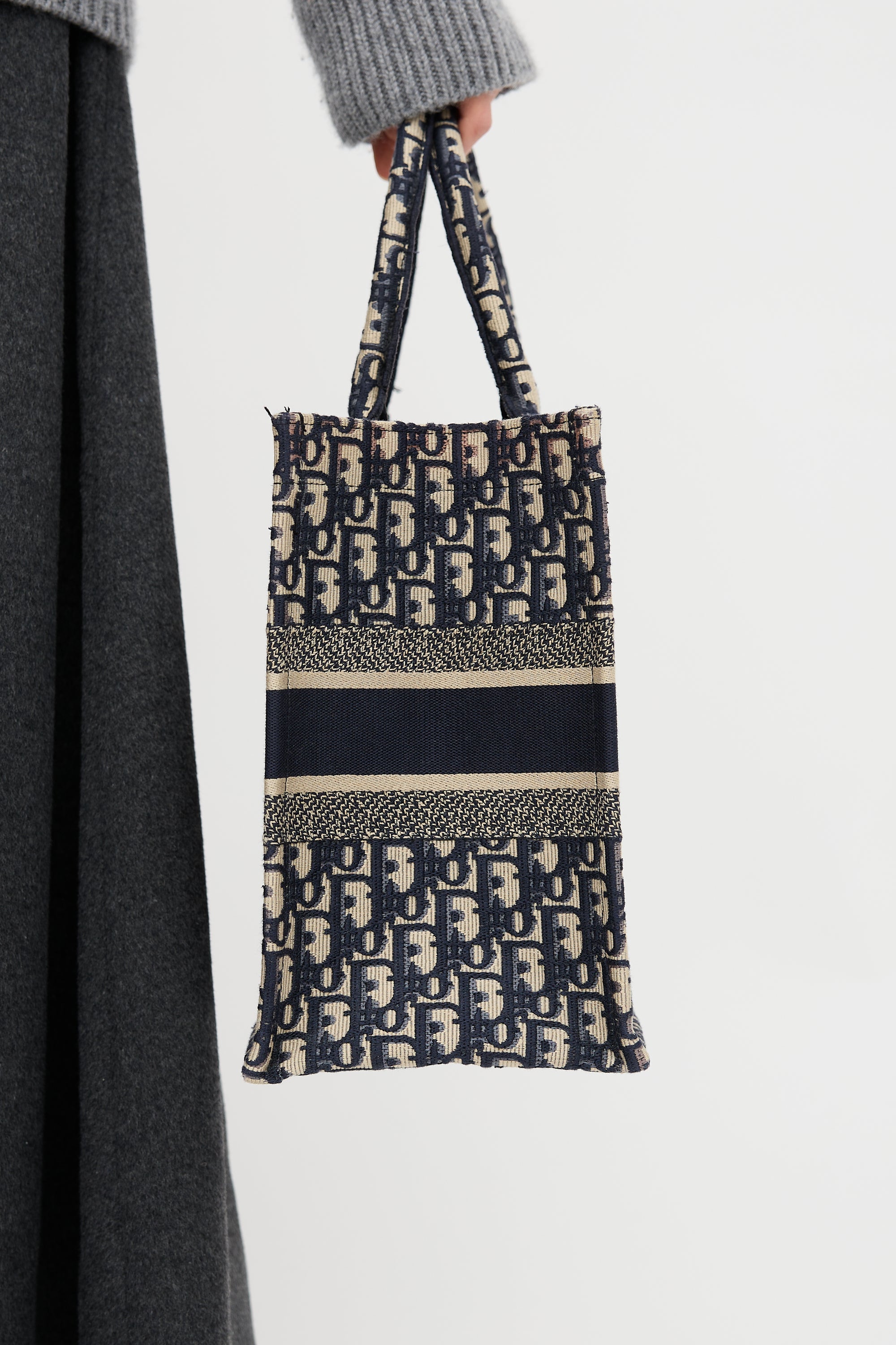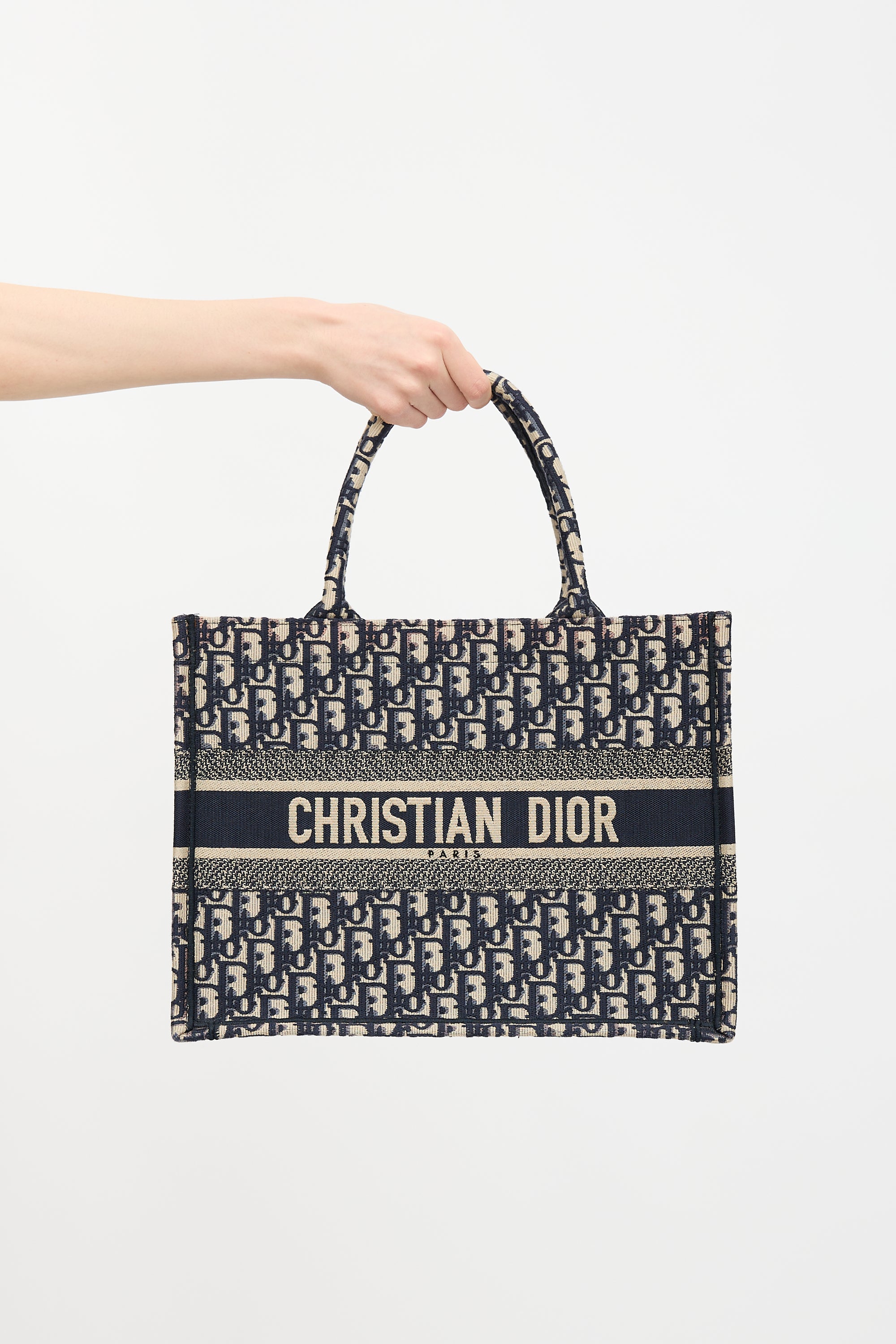Pre-owned Dior 2019 navy and beige Medium Book Tote bag featuring a signature Oblique jacquard, woven logo stripe panel at front face, customized woven script at back, dual rolled top handles, open top, and one main compartment.