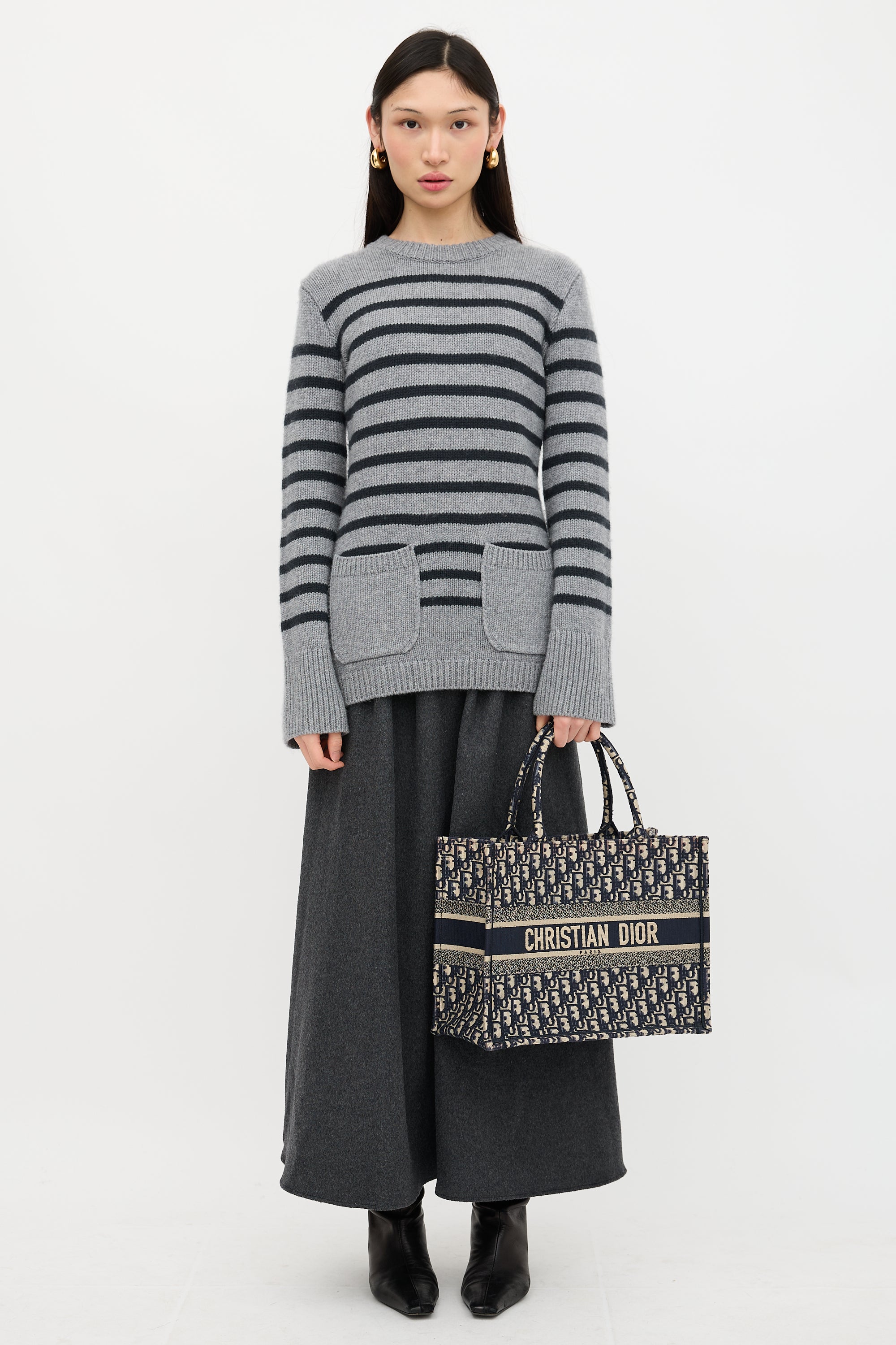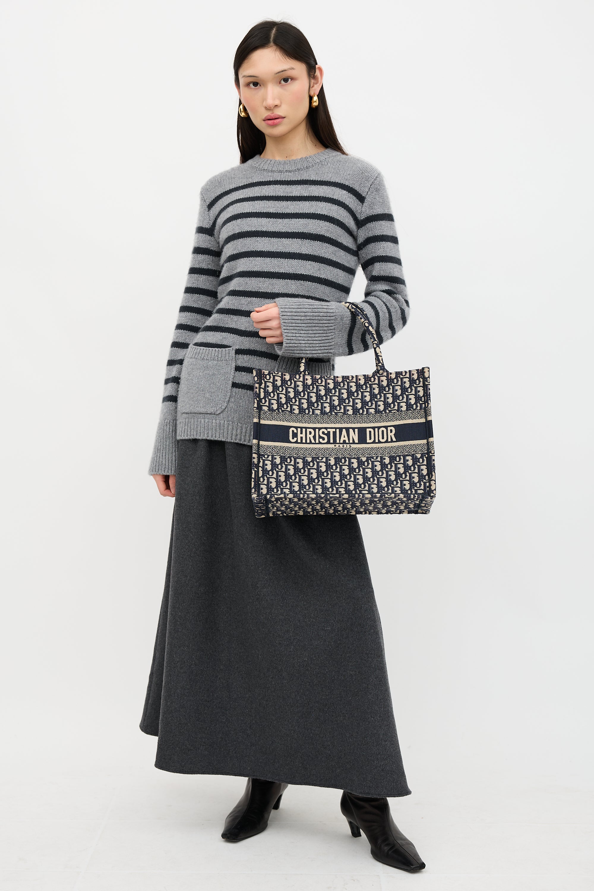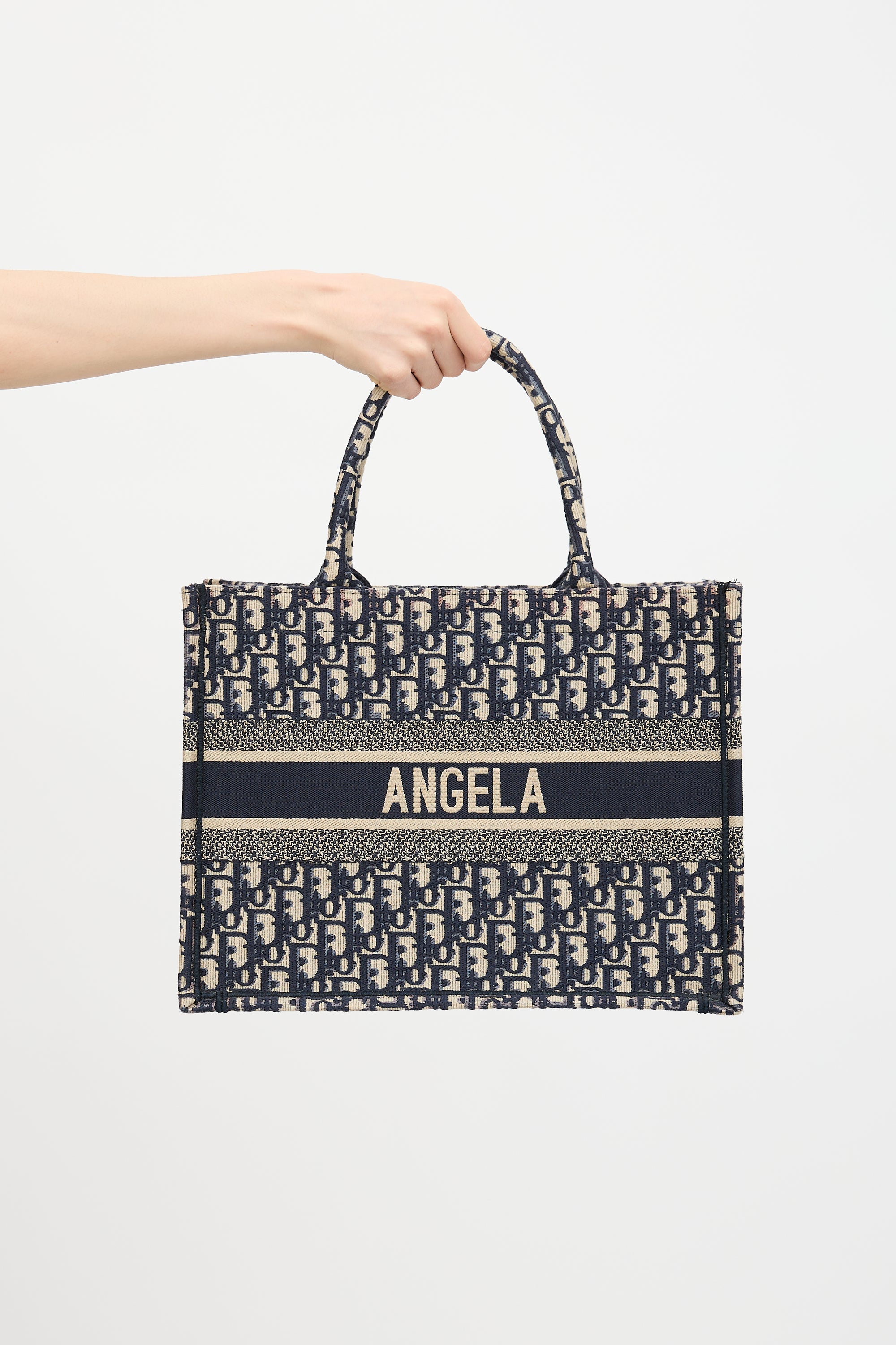 Pre-owned Dior 2019 navy and beige Medium Book Tote bag featuring a signature Oblique jacquard, woven logo stripe panel at front face, customized woven script at back, dual rolled top handles, open top, and one main compartment.