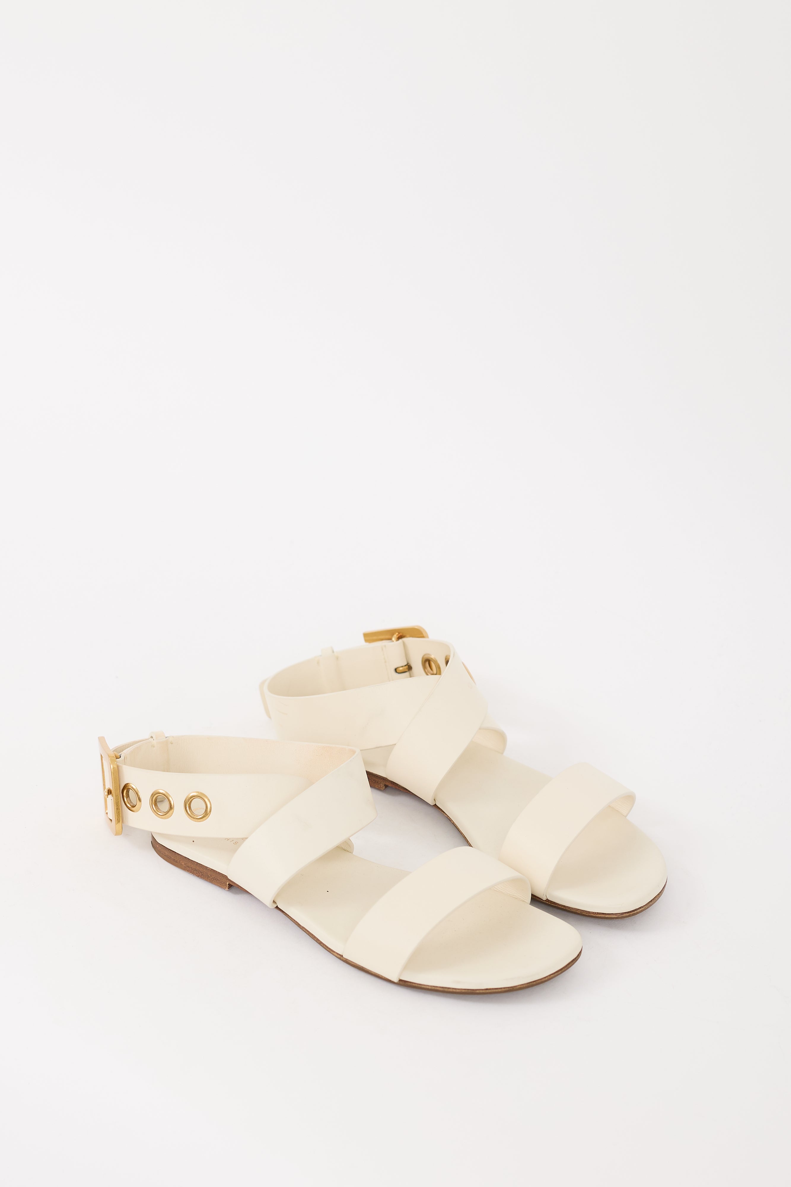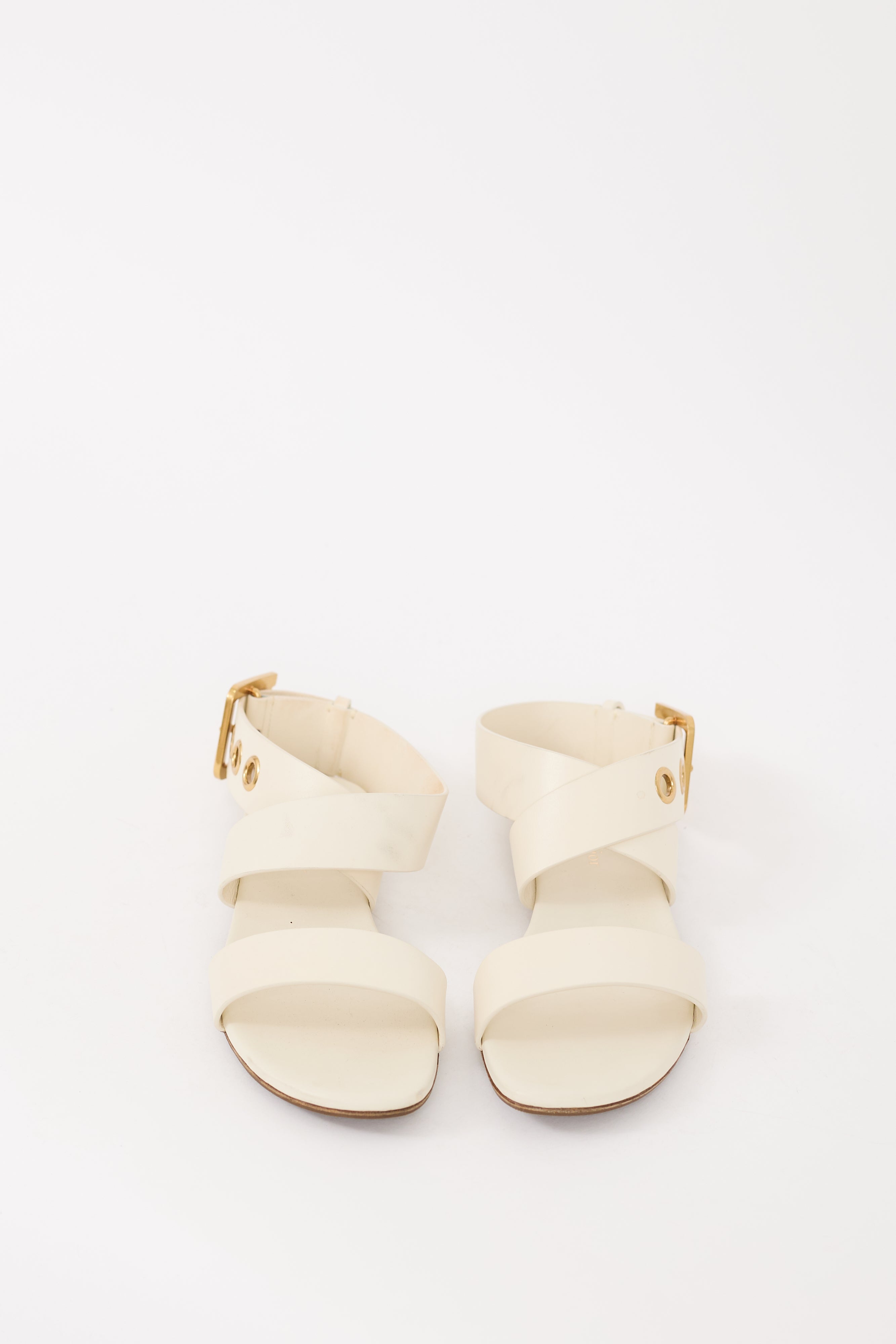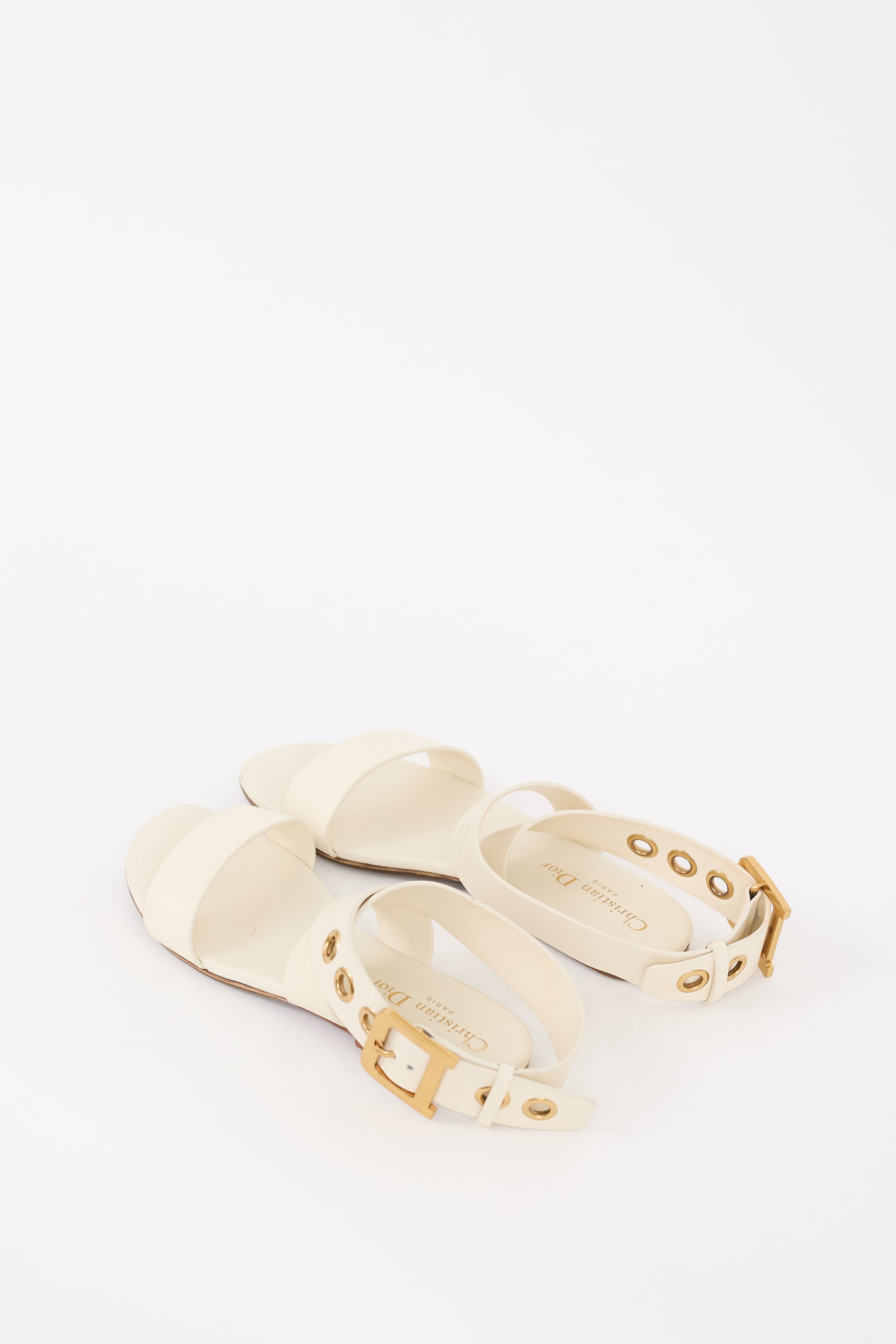 Pre-owned Christian Dior white leather sandals featuring an open rounded toe, strap across vamp, adjustable wraparound ankle strap with gold tone hardware, and wooden base. Comes with original dust bag.