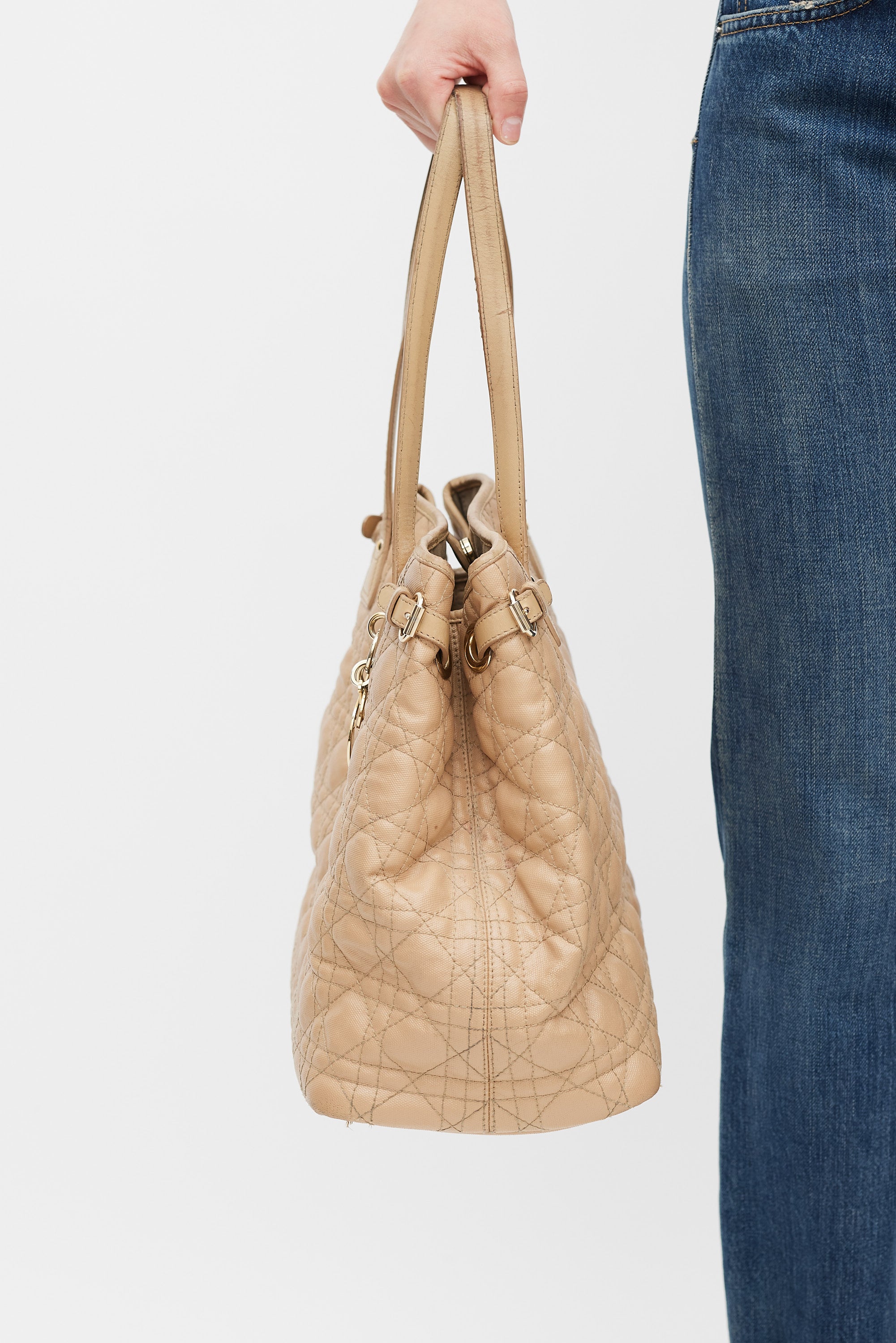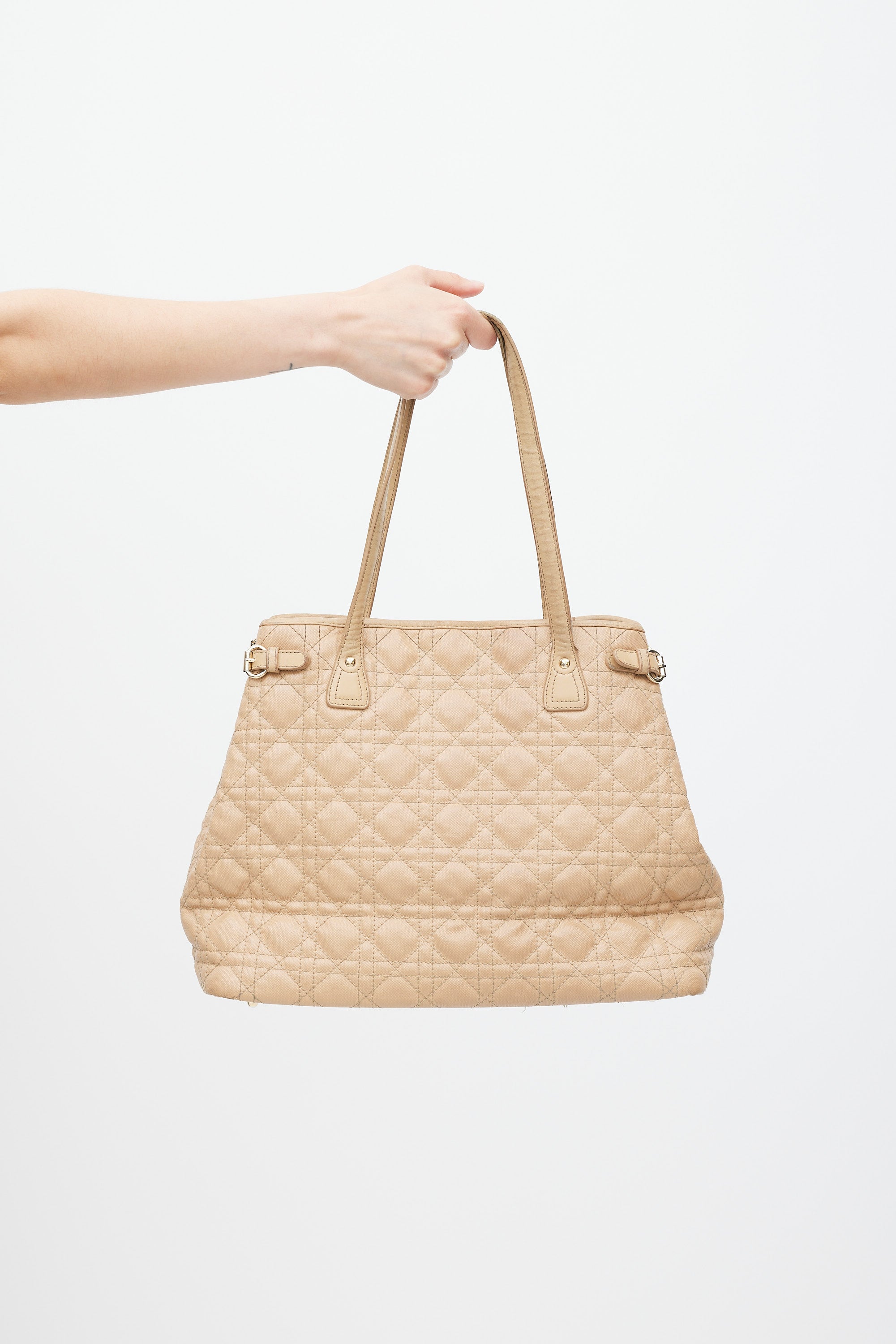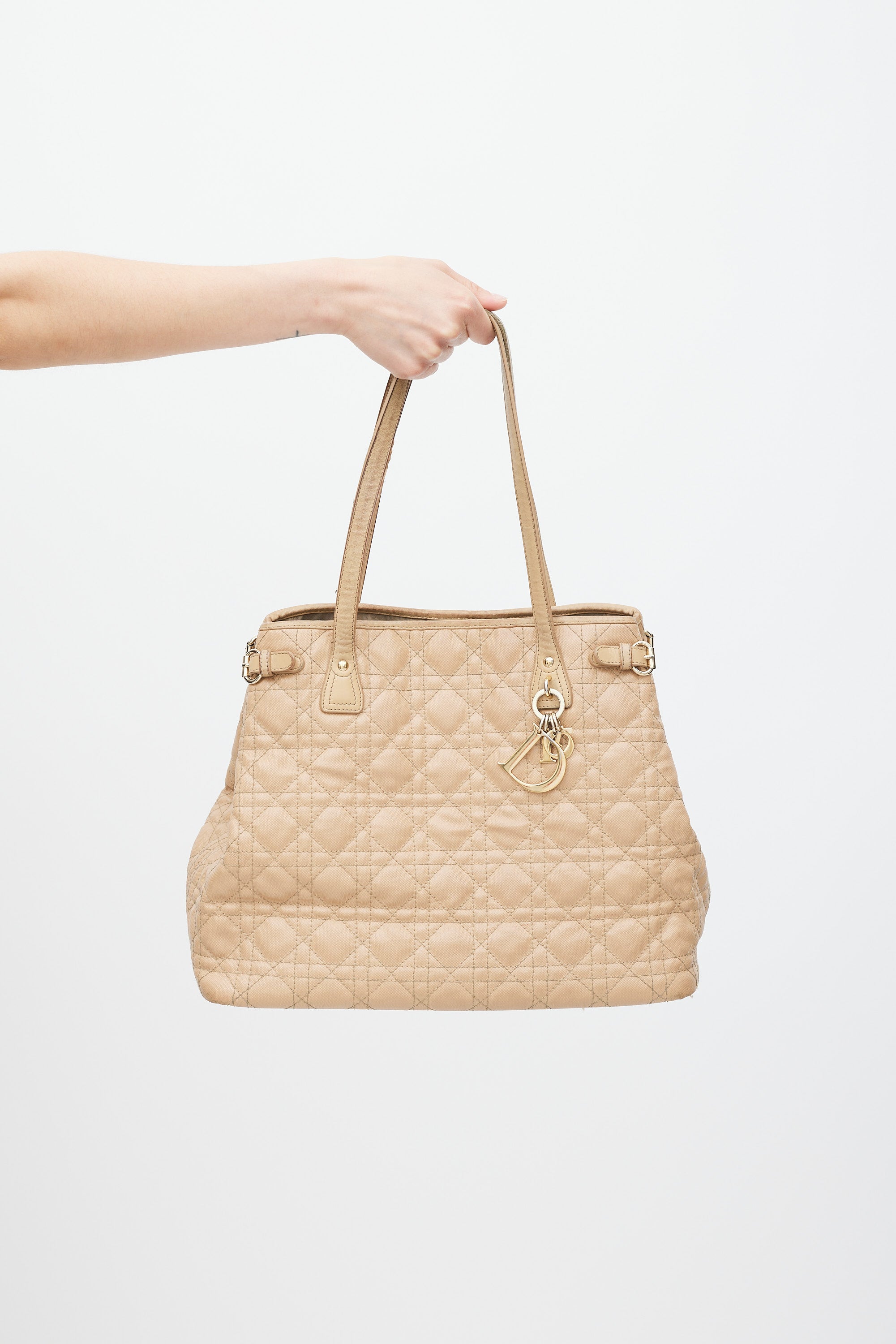 Pre-owned Dior beige Panarea tote in Cannage quilted canvas featuring two top handles, gold tone logo charms at front, one main compartment with two slip pockets and one zip pocket, buckles at sides, and magnetic top closure. Comes with original dust bag.