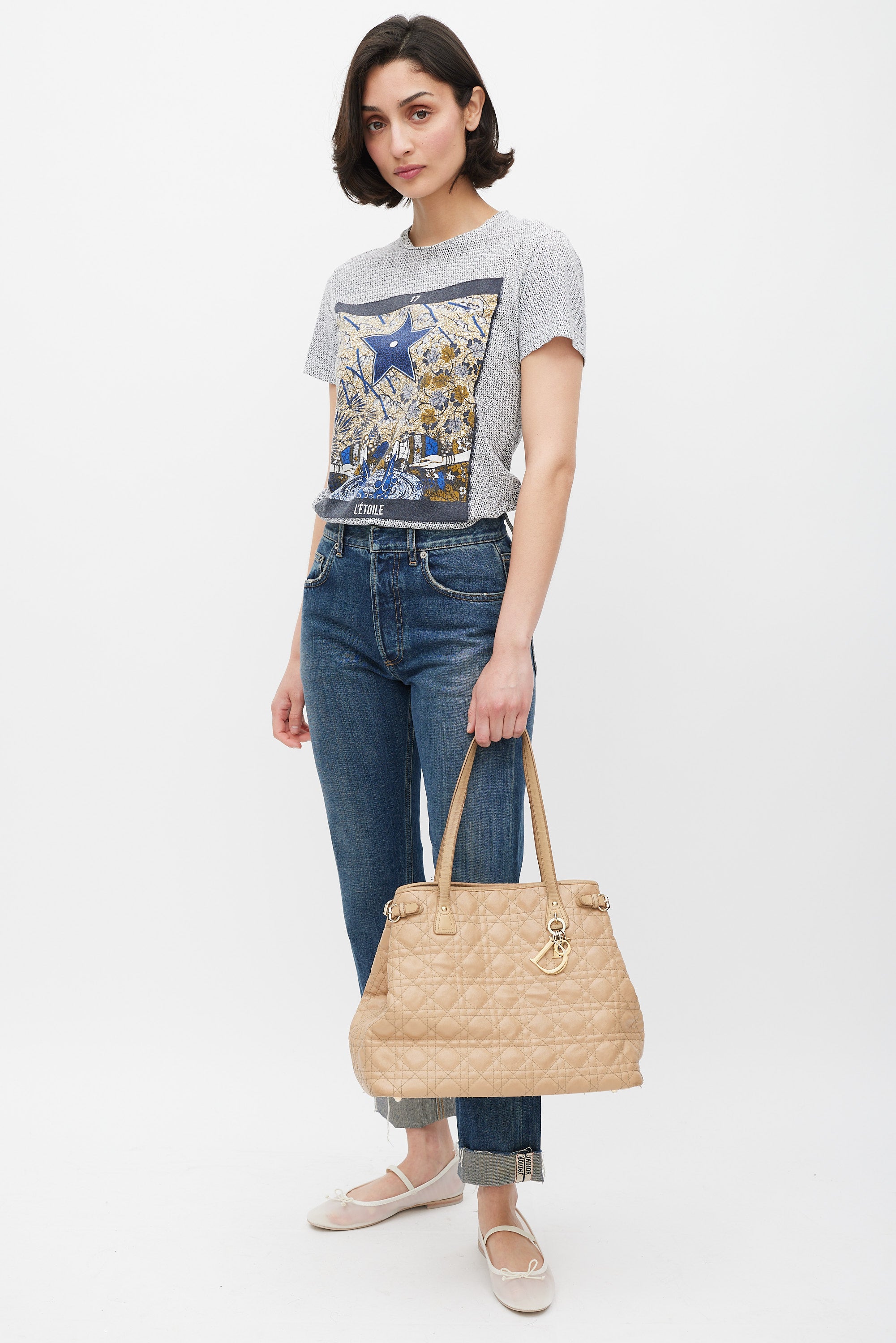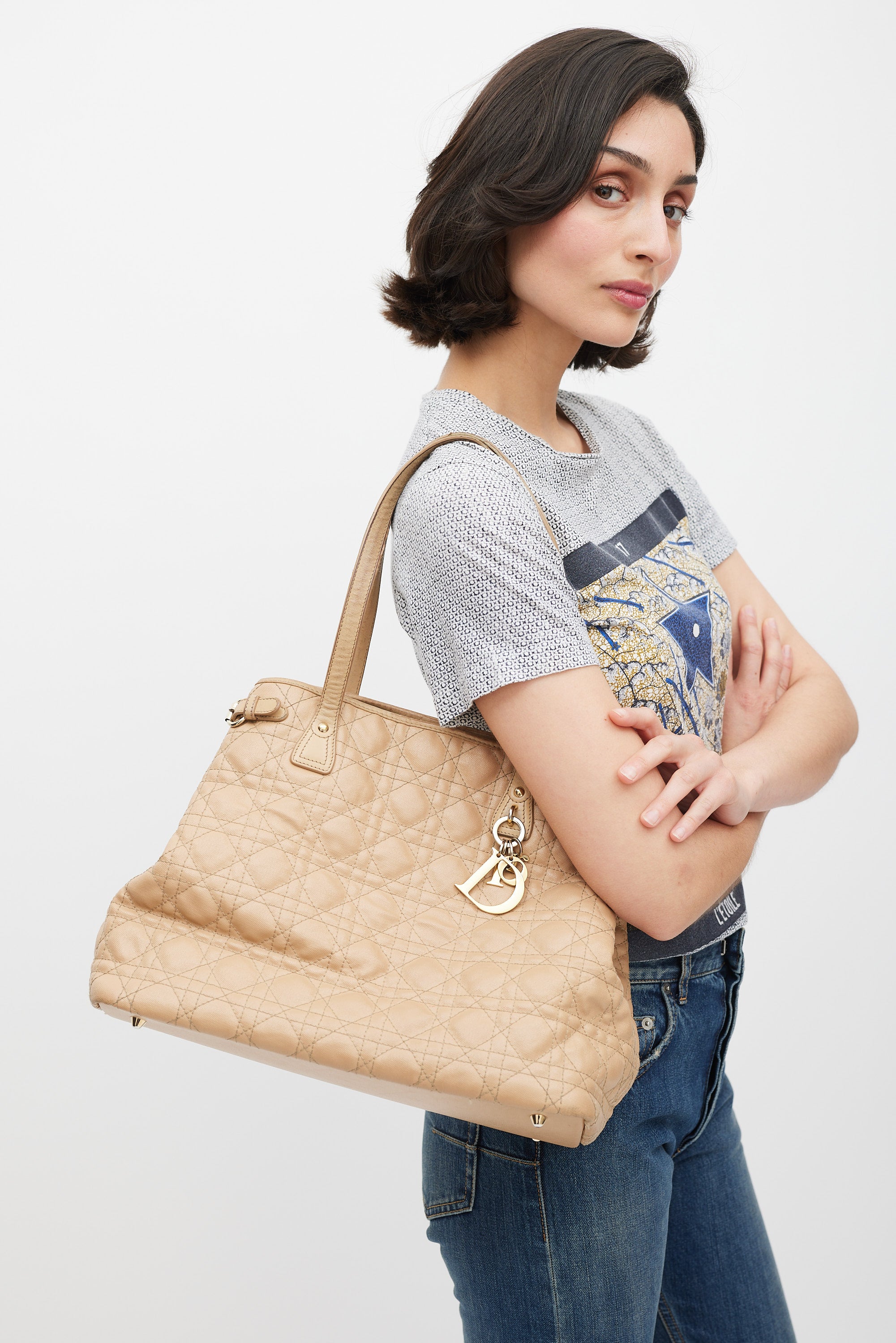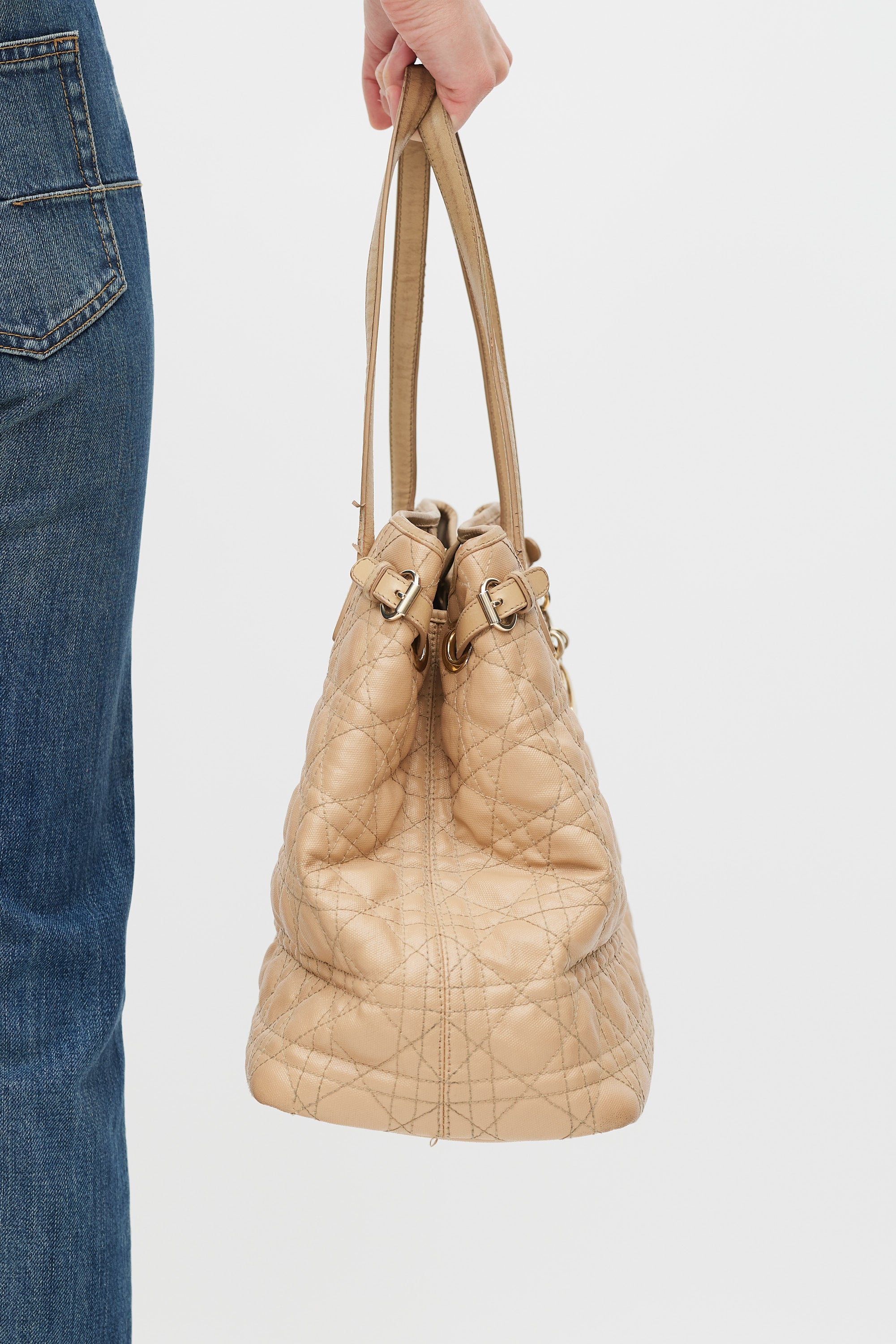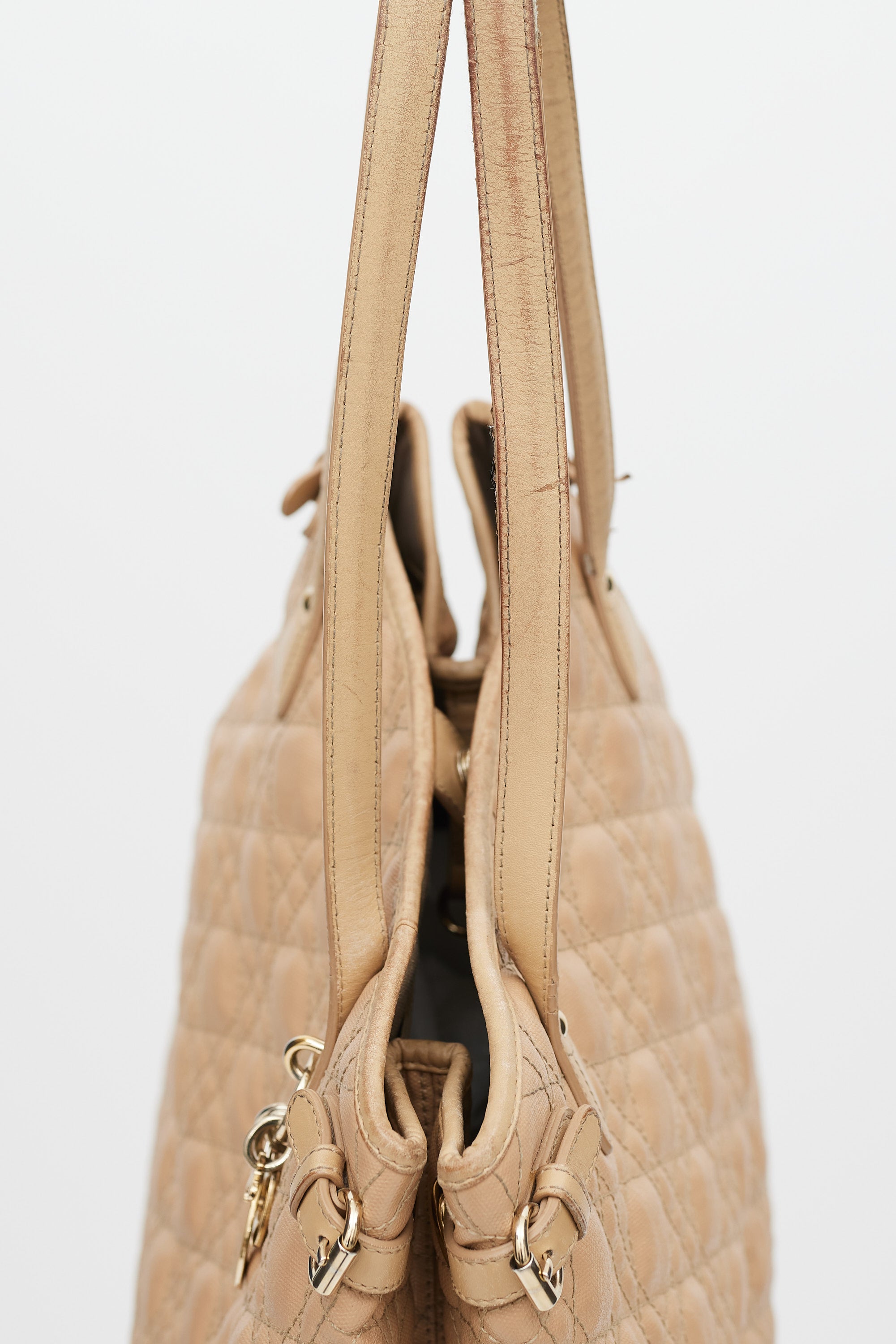 Pre-owned Dior beige Panarea tote in Cannage quilted canvas featuring two top handles, gold tone logo charms at front, one main compartment with two slip pockets and one zip pocket, buckles at sides, and magnetic top closure. Comes with original dust bag.
