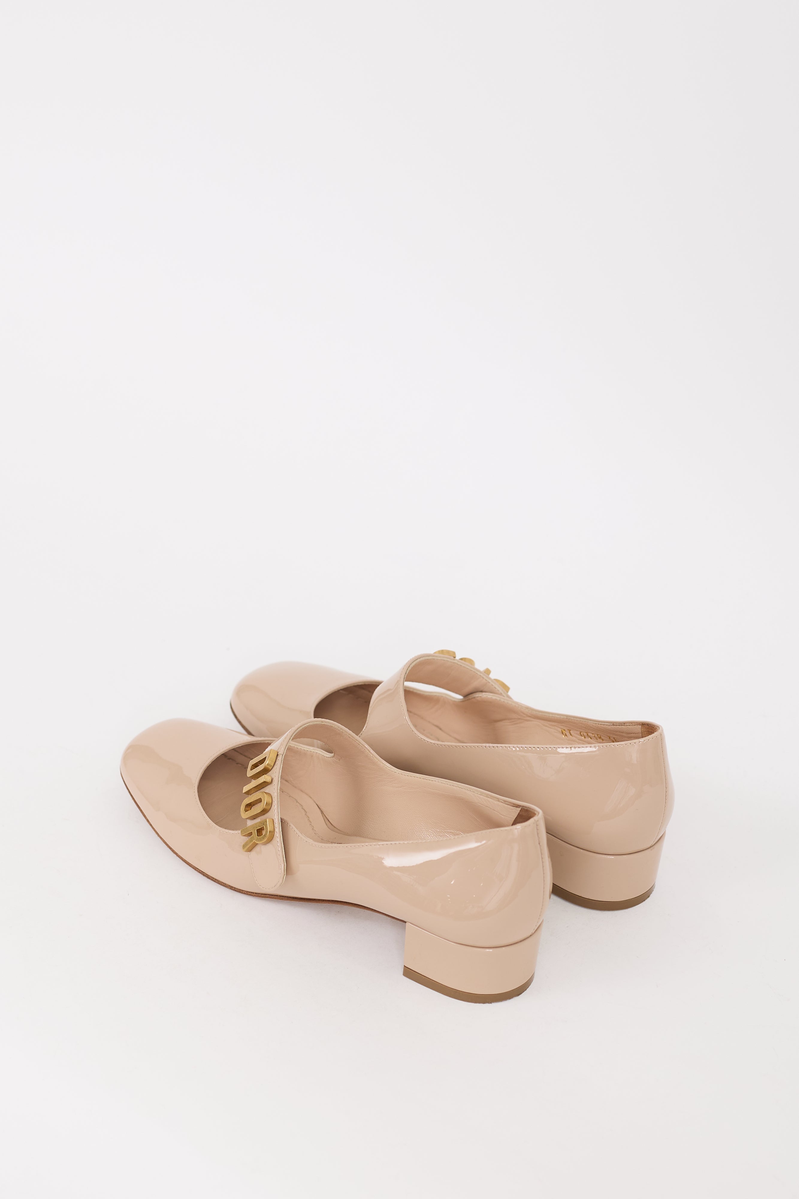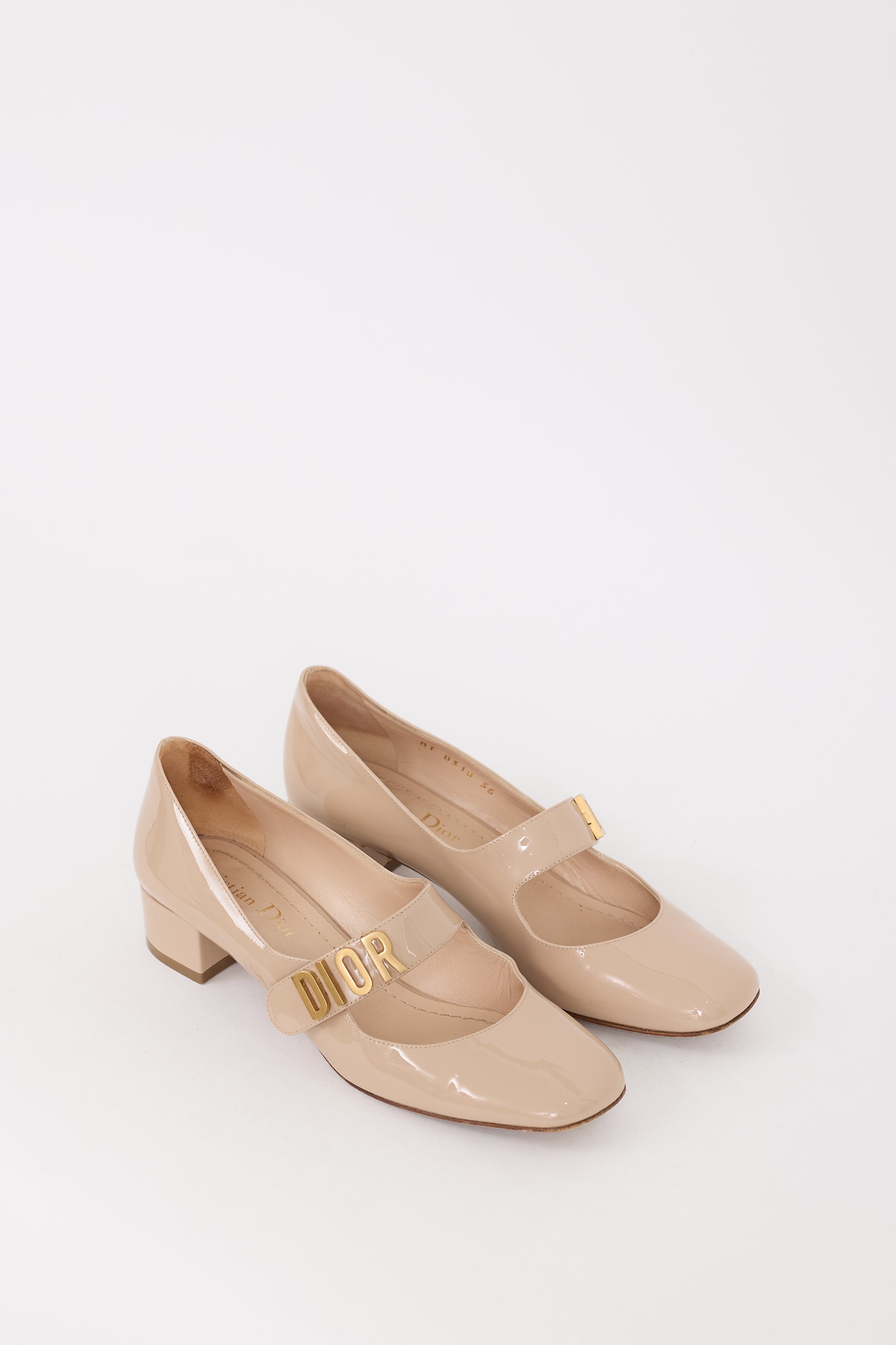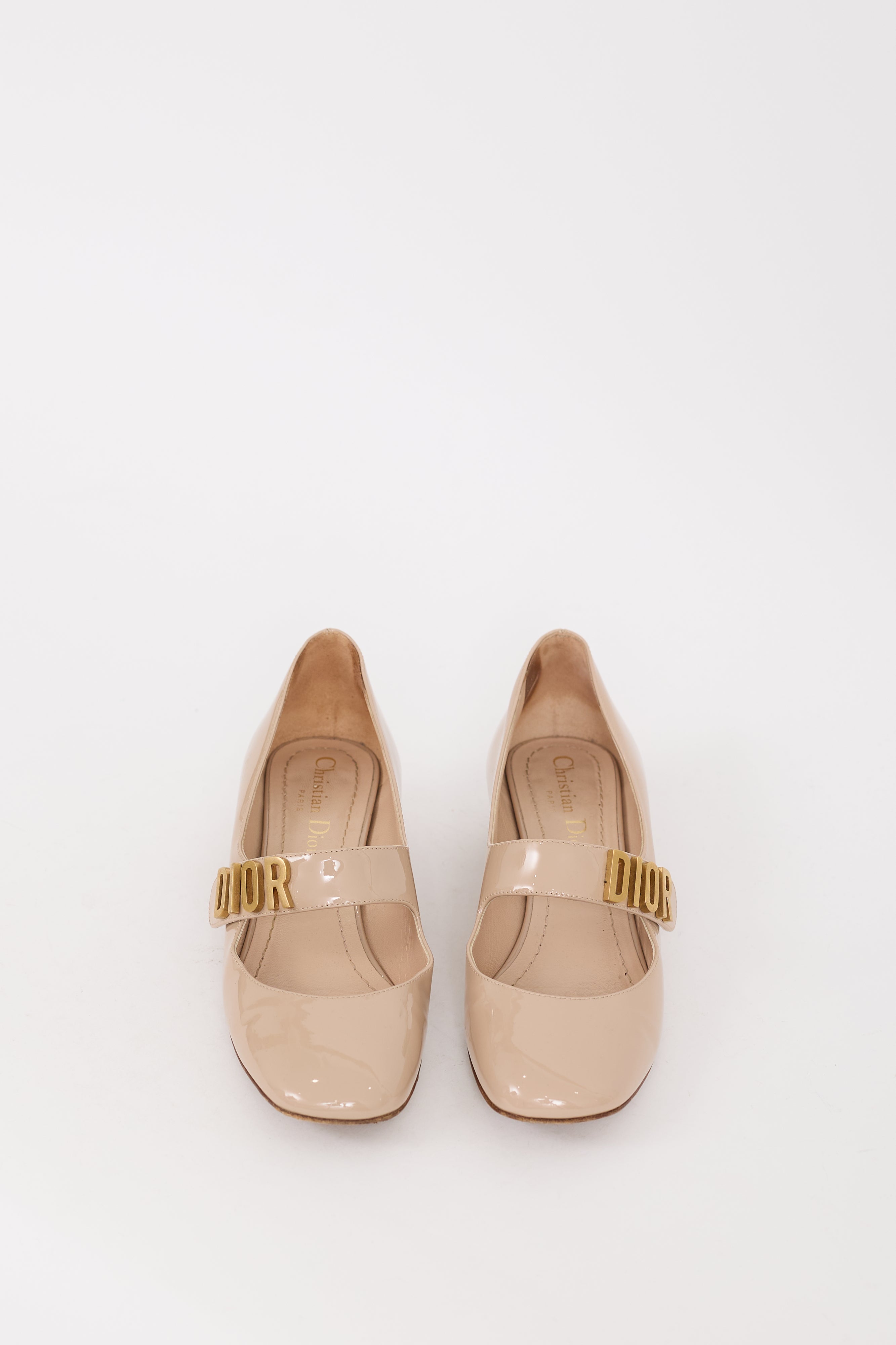 Pre-owned Dior beige patent leather Baby D pumps featuring tapered square toe, slip one entry, strap across vamp with gold tone logo hardware, and covered block heel.