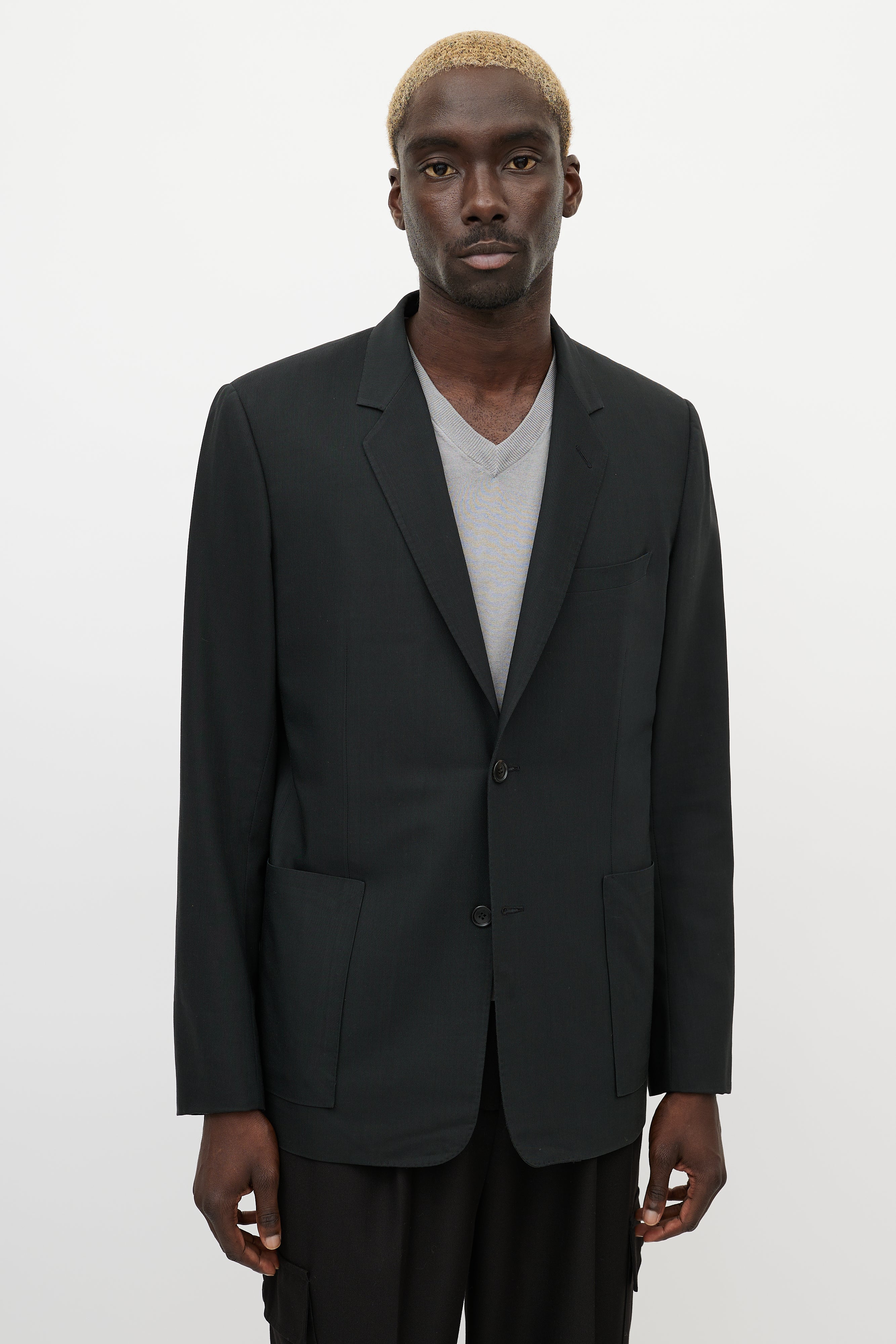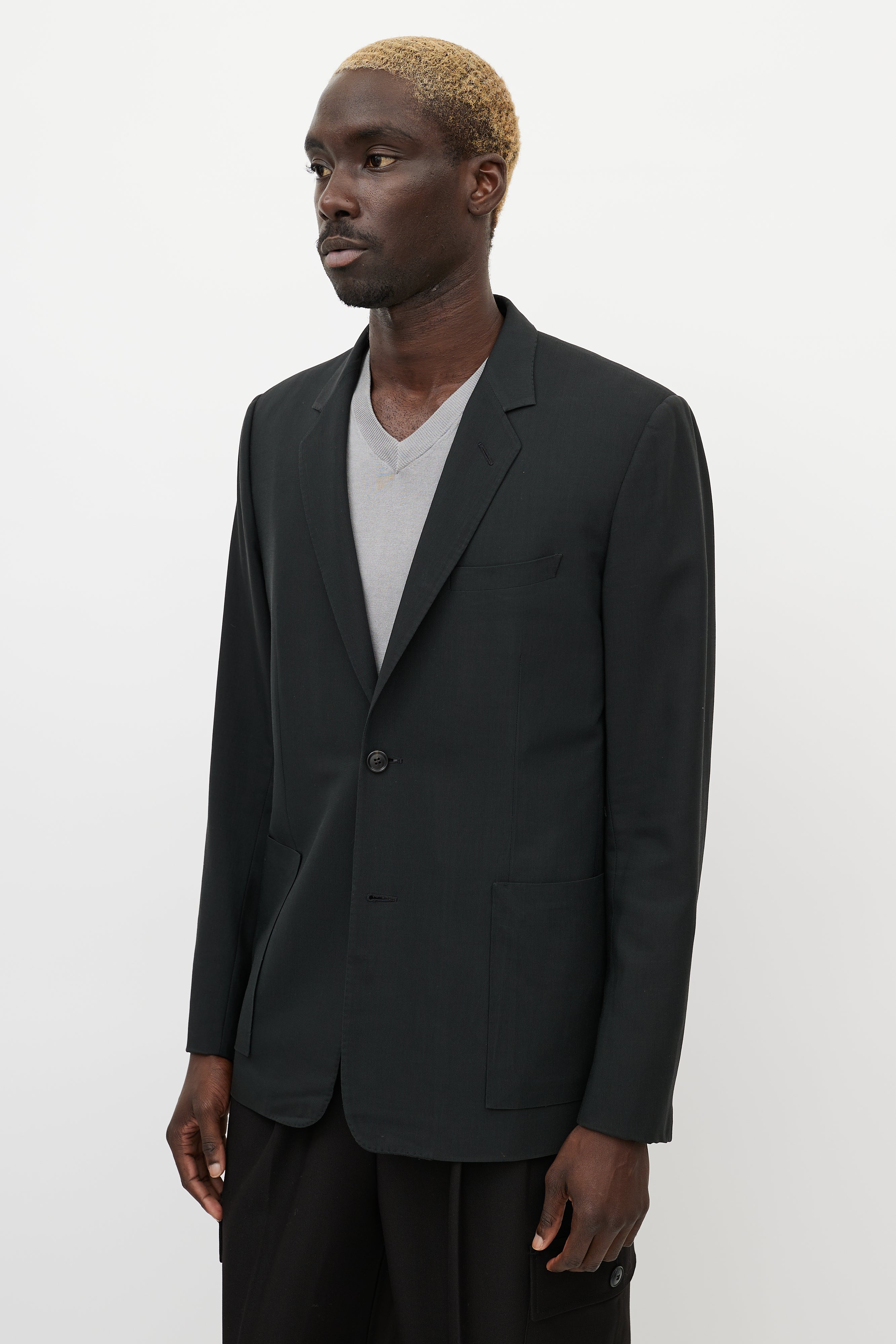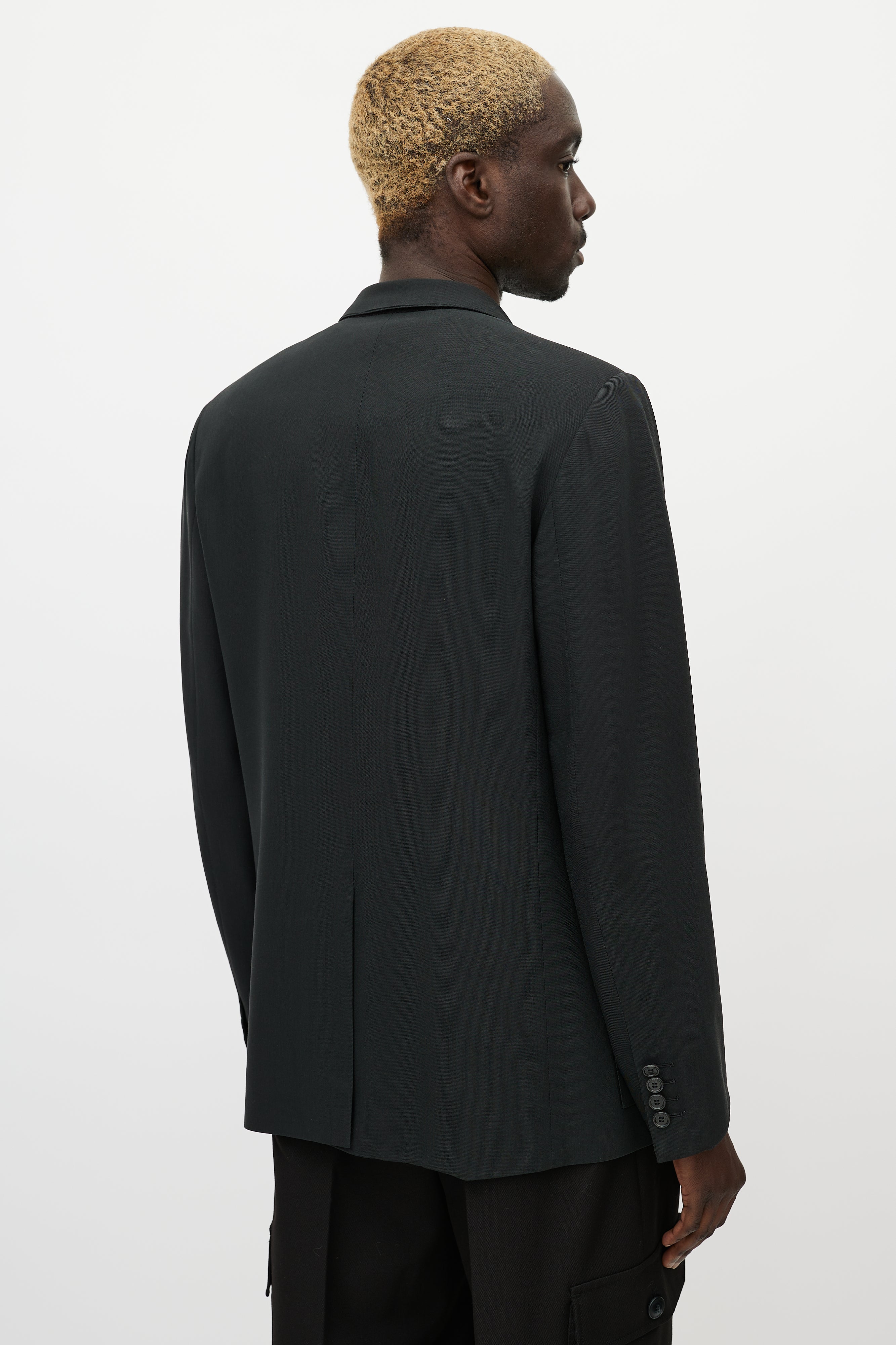 Pre-owned Dior black cashmere blazer featuring notch lapel, button up front, one welt pocket at chest, two patch pockets at hips, buttoned cuffs, and back vent.