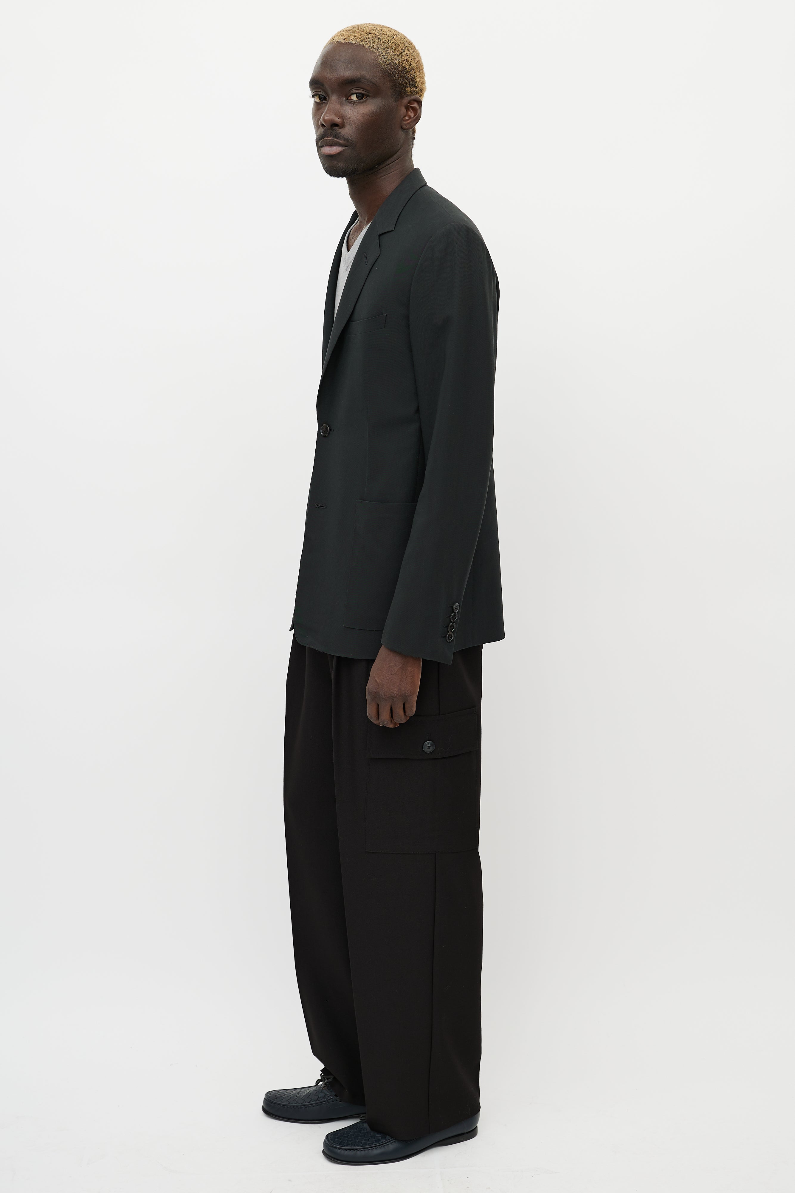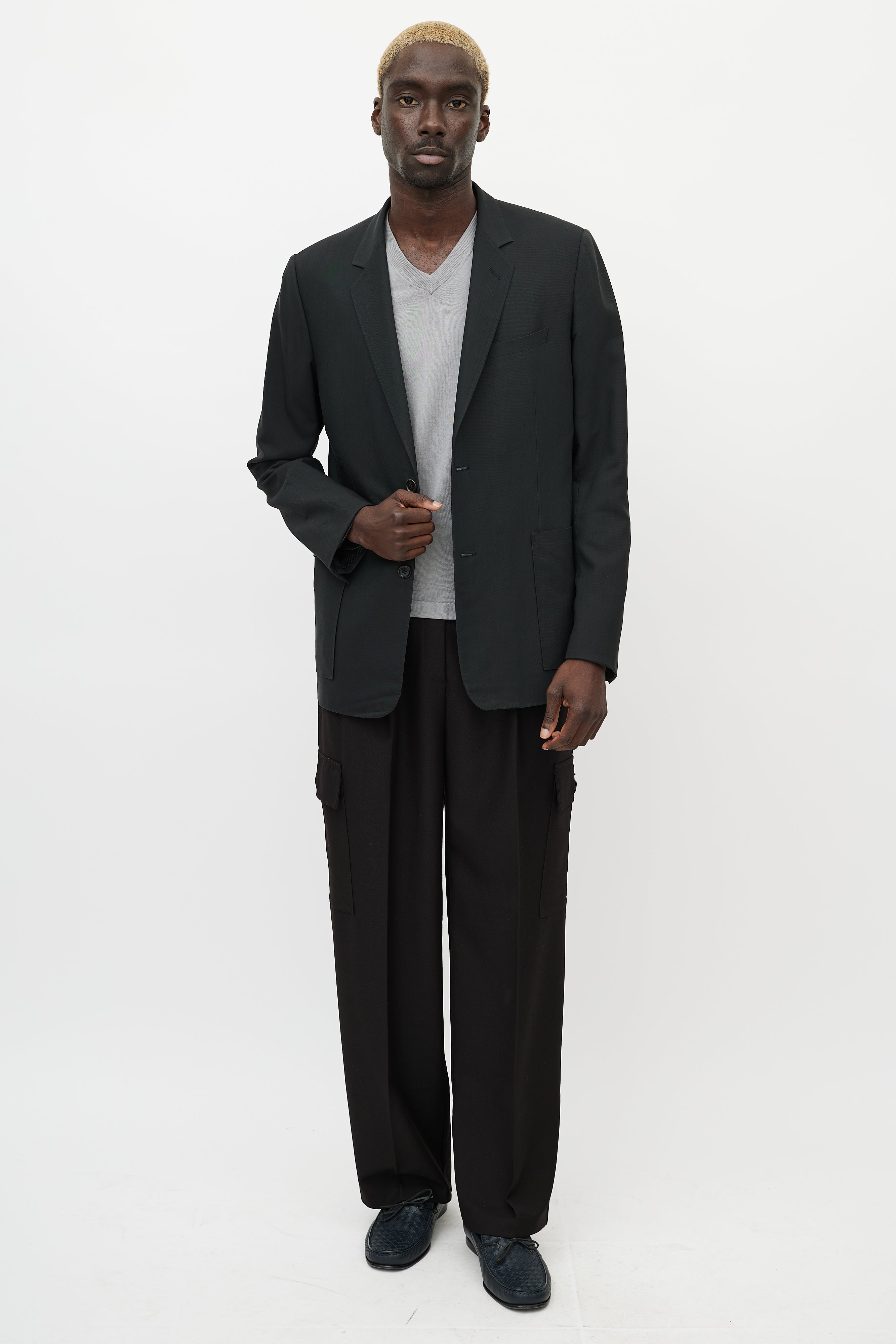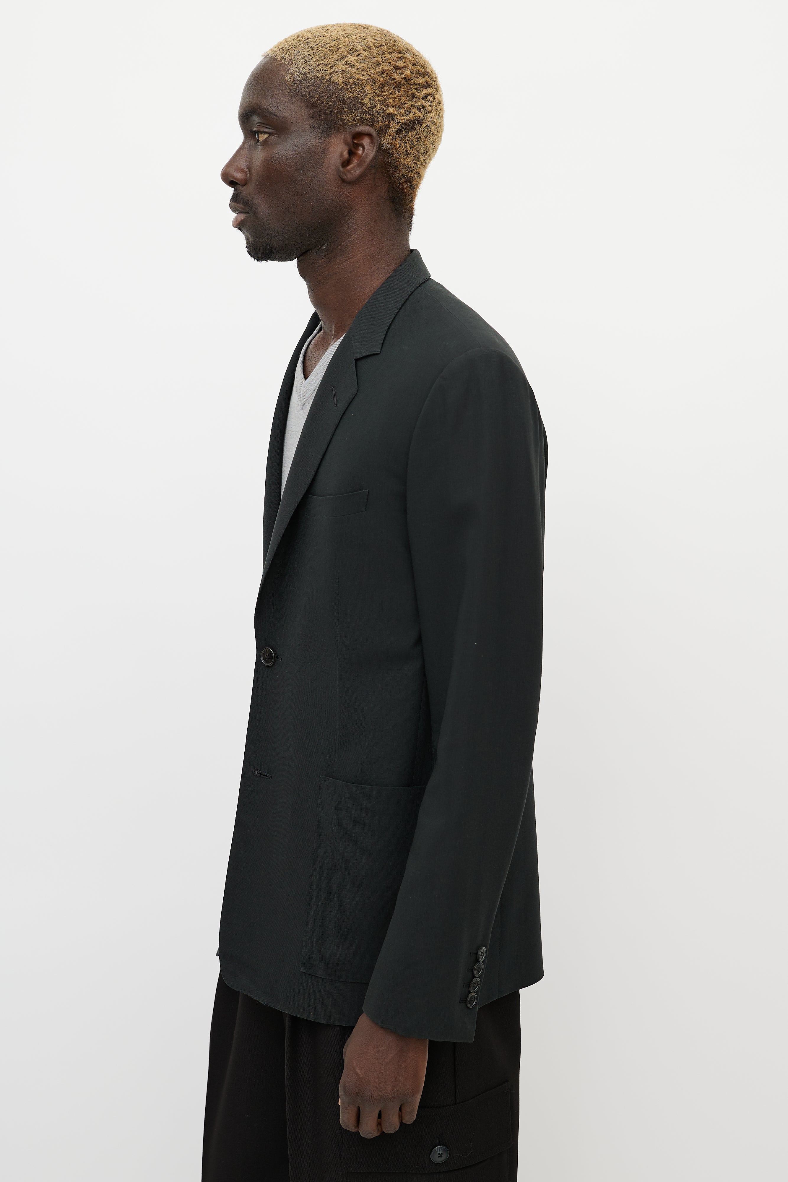 Pre-owned Dior black cashmere blazer featuring notch lapel, button up front, one welt pocket at chest, two patch pockets at hips, buttoned cuffs, and back vent.