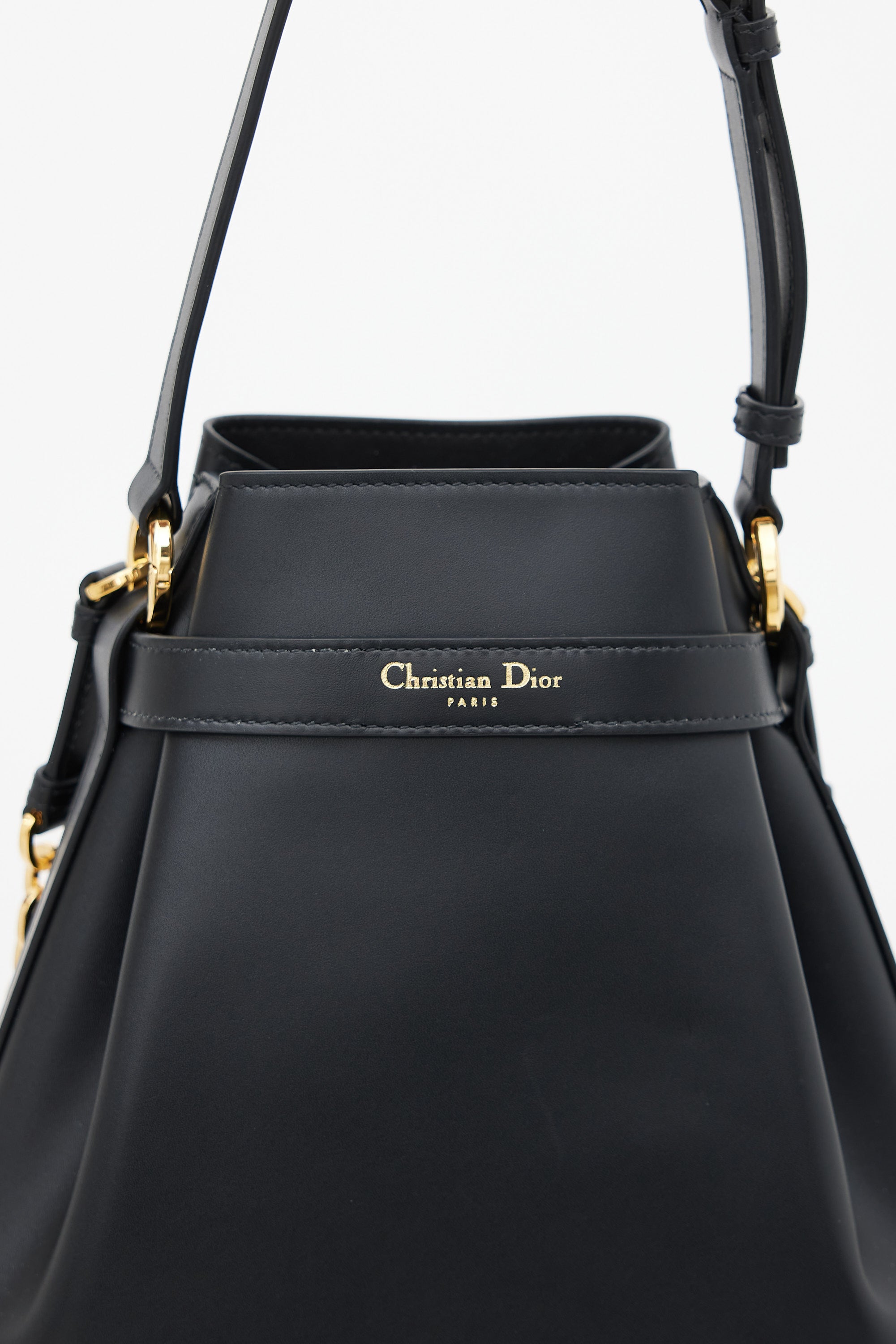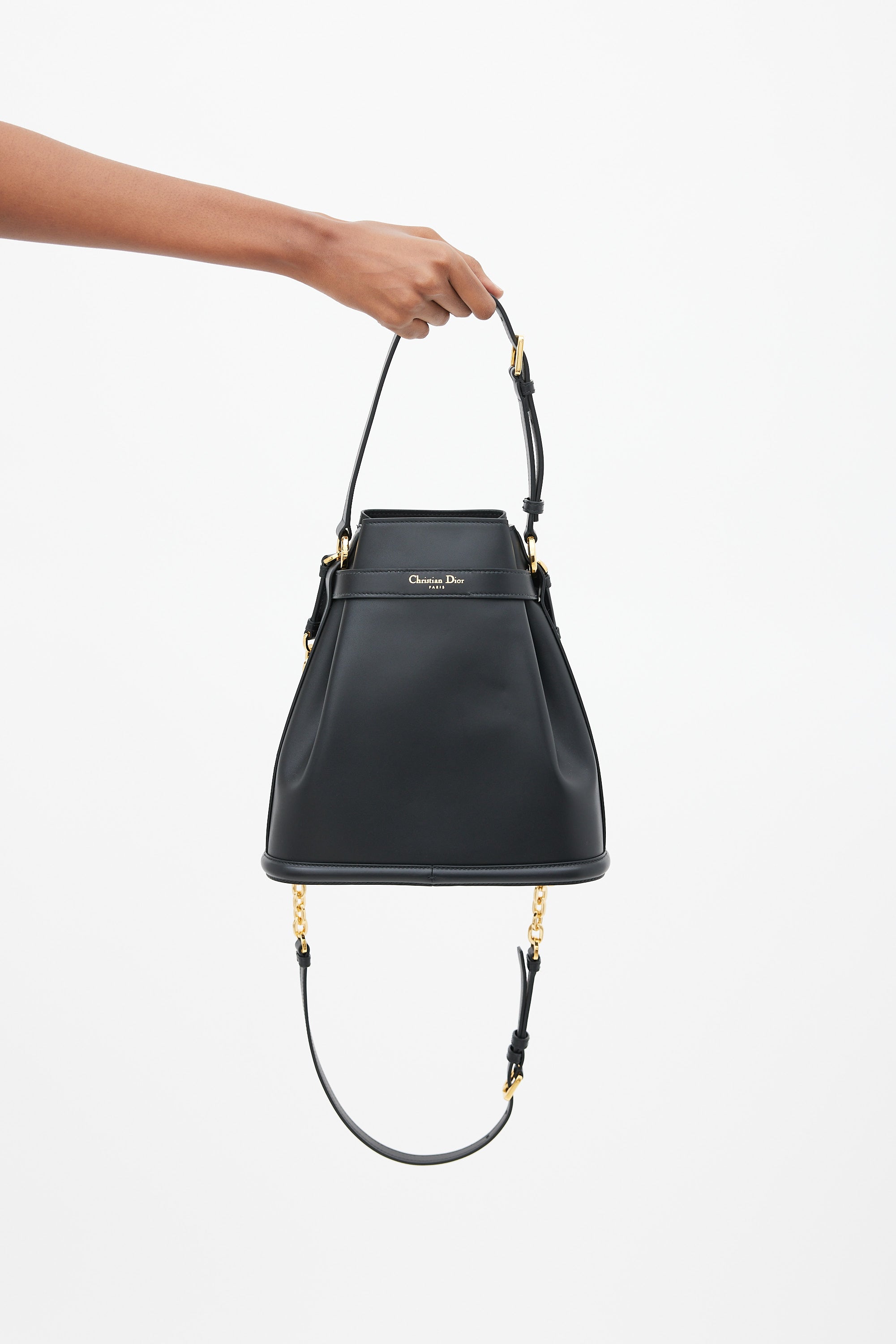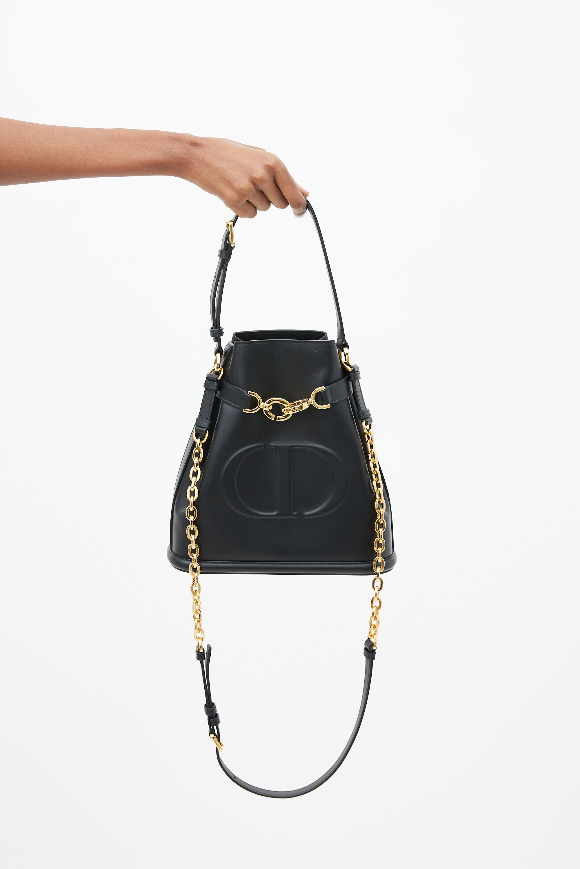 Pre-owned Dior black leather C'est Dior bag featuring tonal stitching, gold tone hardware, four protective feet at base, front embossed CD logo, strap around top of bag with back gold tone foil logo and front CD twist lock fastening, single flat adjustable top handle, detachable and adjustable chain and leather strap, and one lined main compartment with single slip pocket. Comes with original box and dust bag.