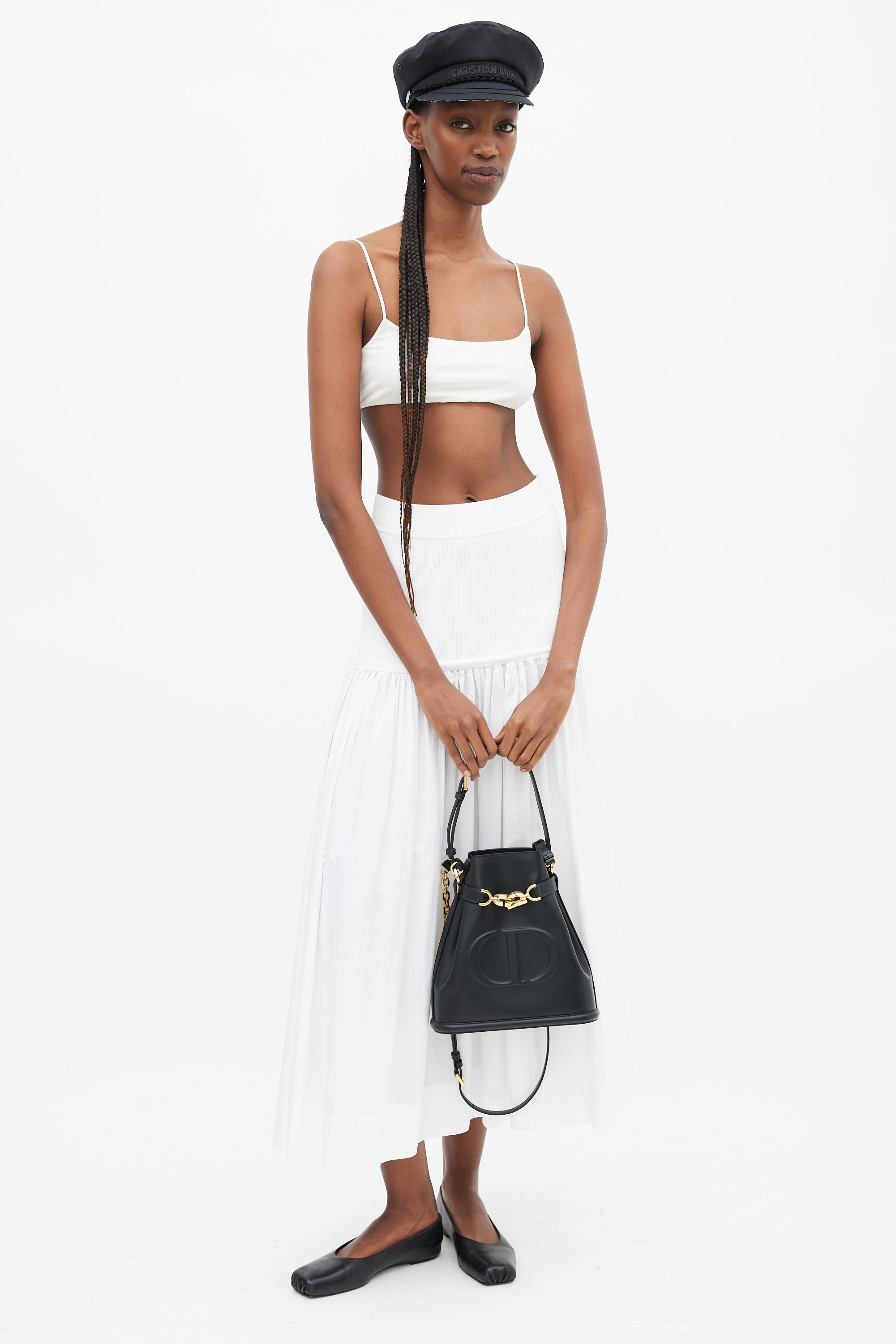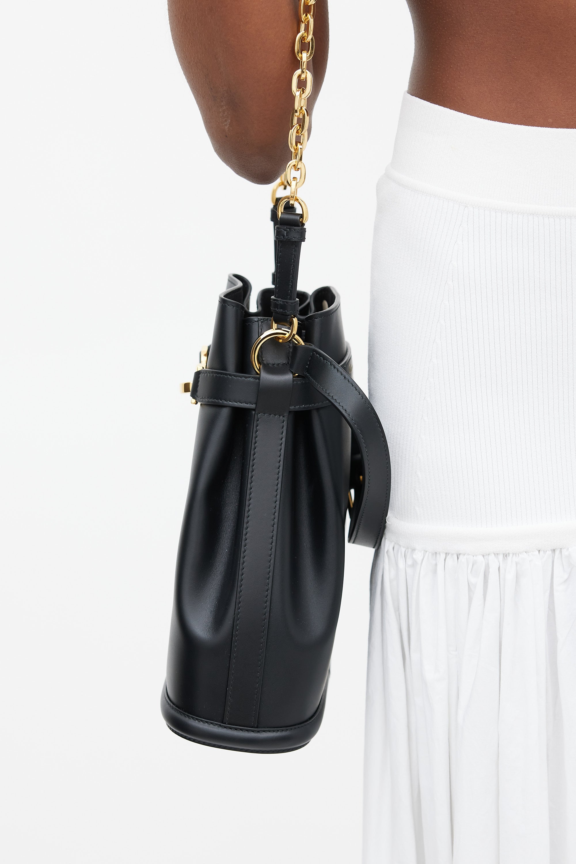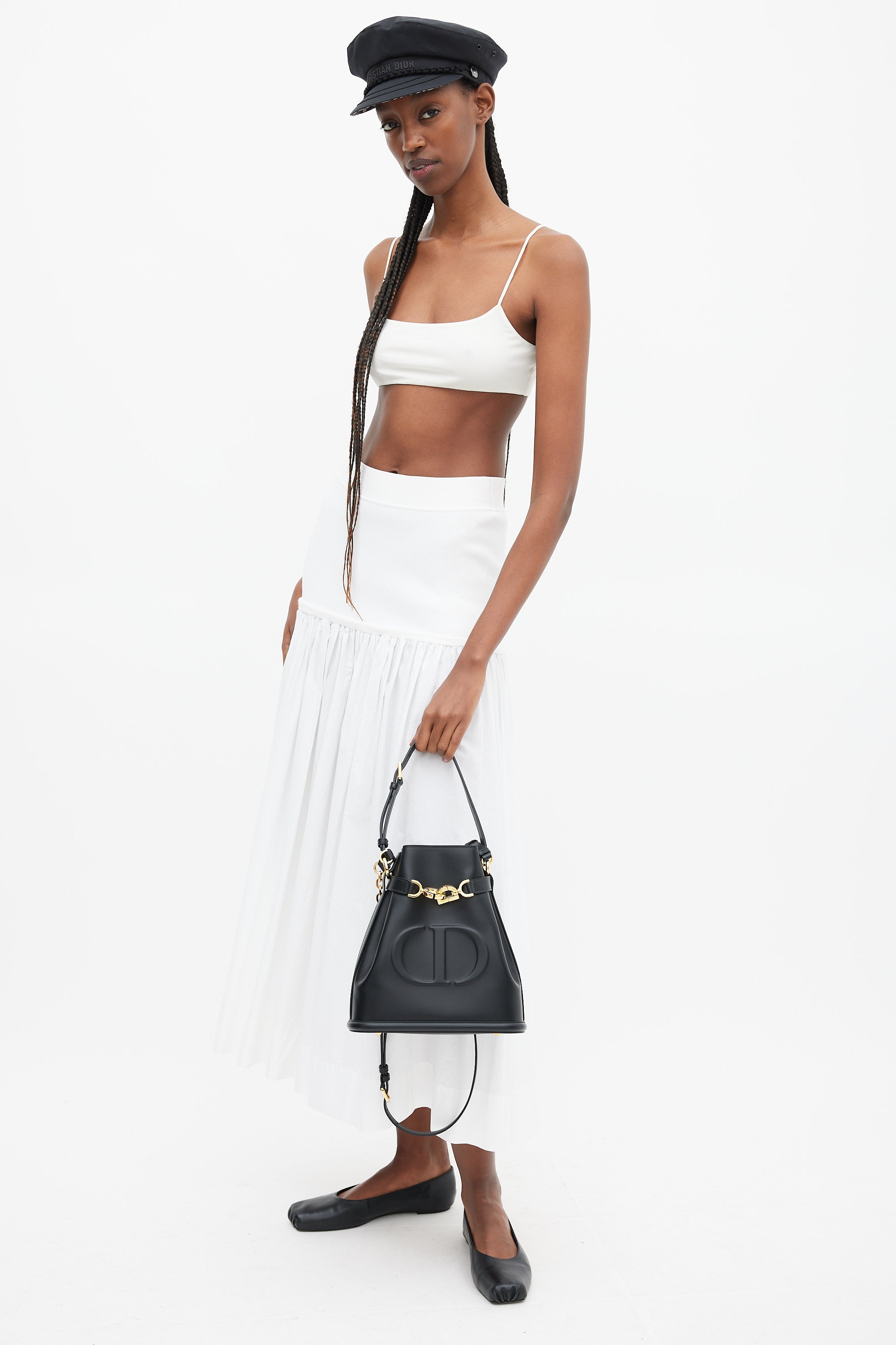 Pre-owned Dior black leather C'est Dior bag featuring tonal stitching, gold tone hardware, four protective feet at base, front embossed CD logo, strap around top of bag with back gold tone foil logo and front CD twist lock fastening, single flat adjustable top handle, detachable and adjustable chain and leather strap, and one lined main compartment with single slip pocket. Comes with original box and dust bag.