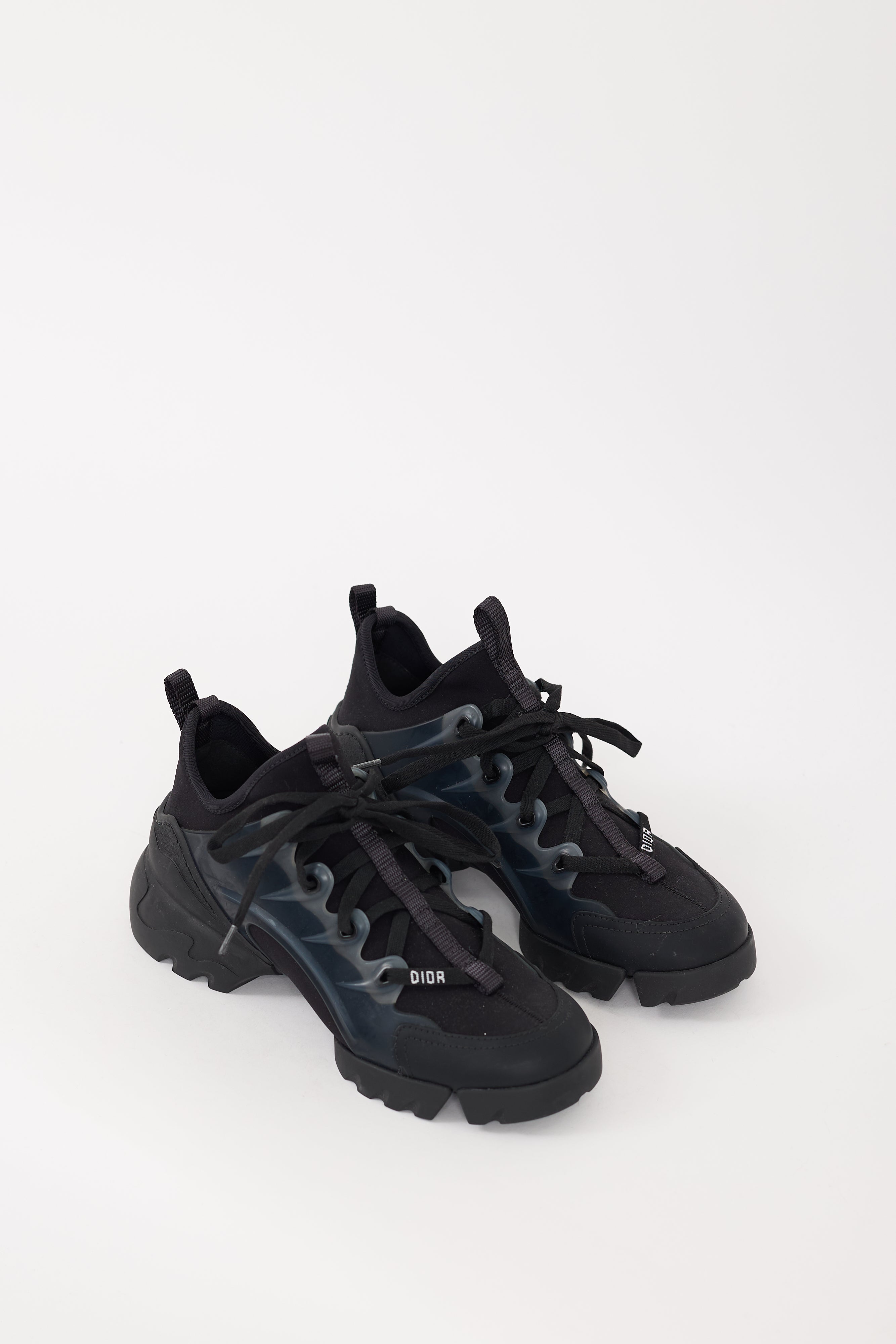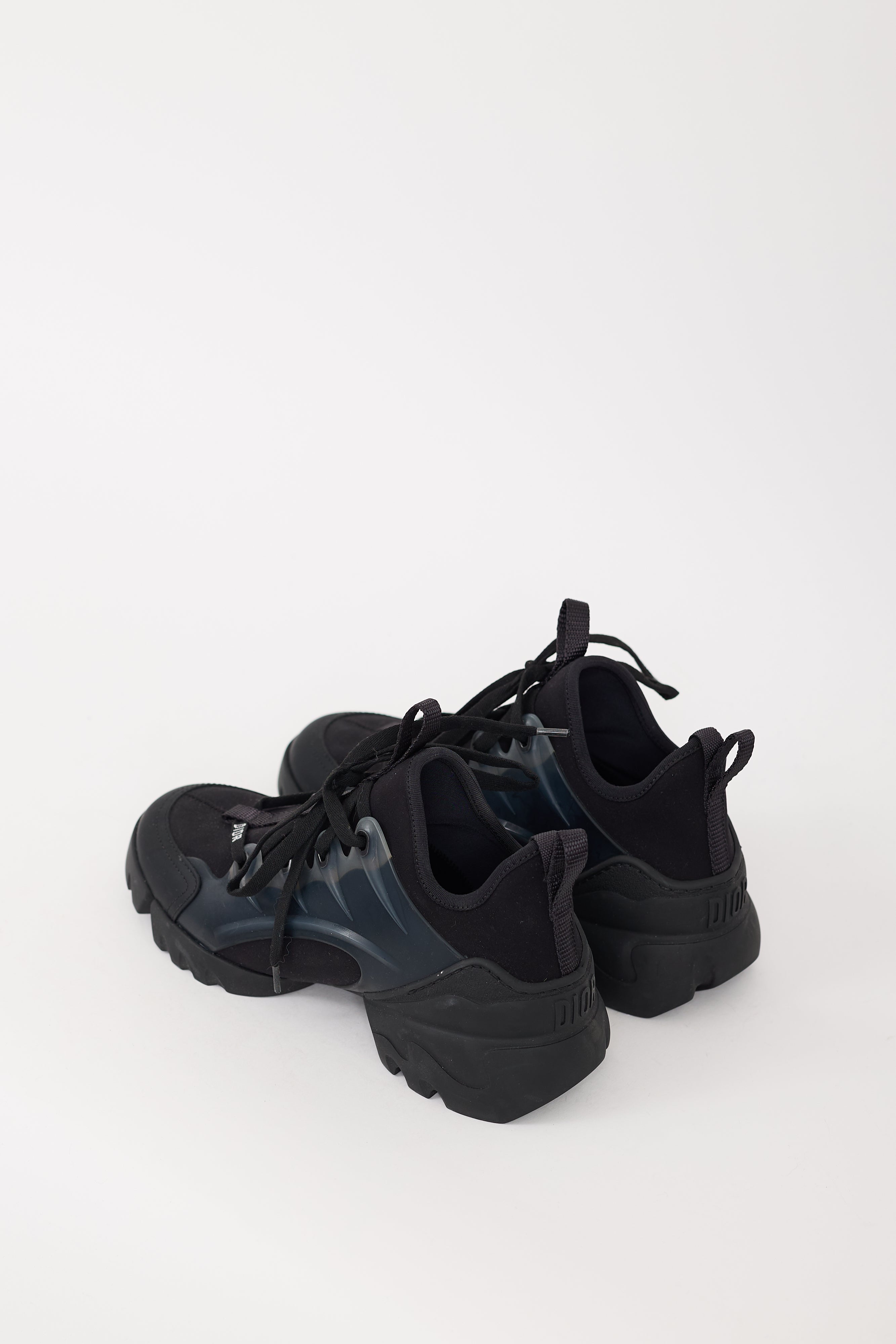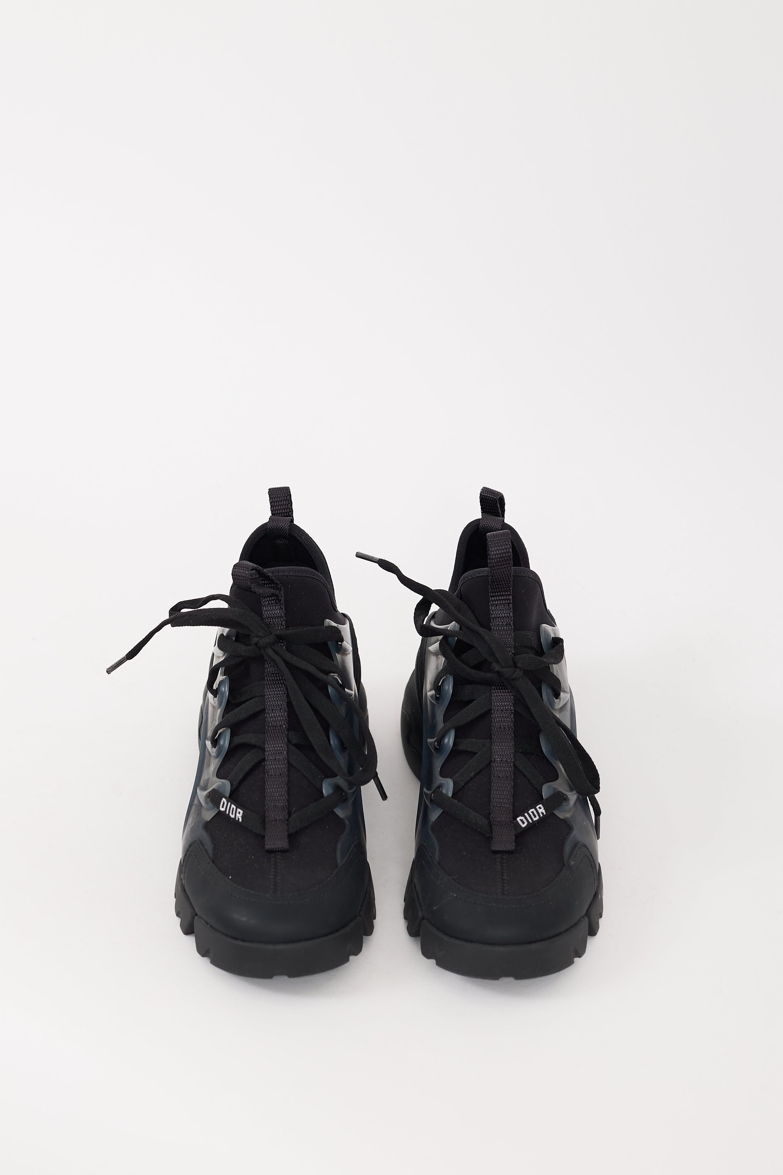 Pre-owned Dior black D-Connect sneakers featuring rounded toe with rubber cap, neoprene upper, lace up front with white logo, clear side rubber panelling, pull tab at tongue and counter, embossed logo at heel, and split rubber outsole. Comes with extra set of shoelaces.
