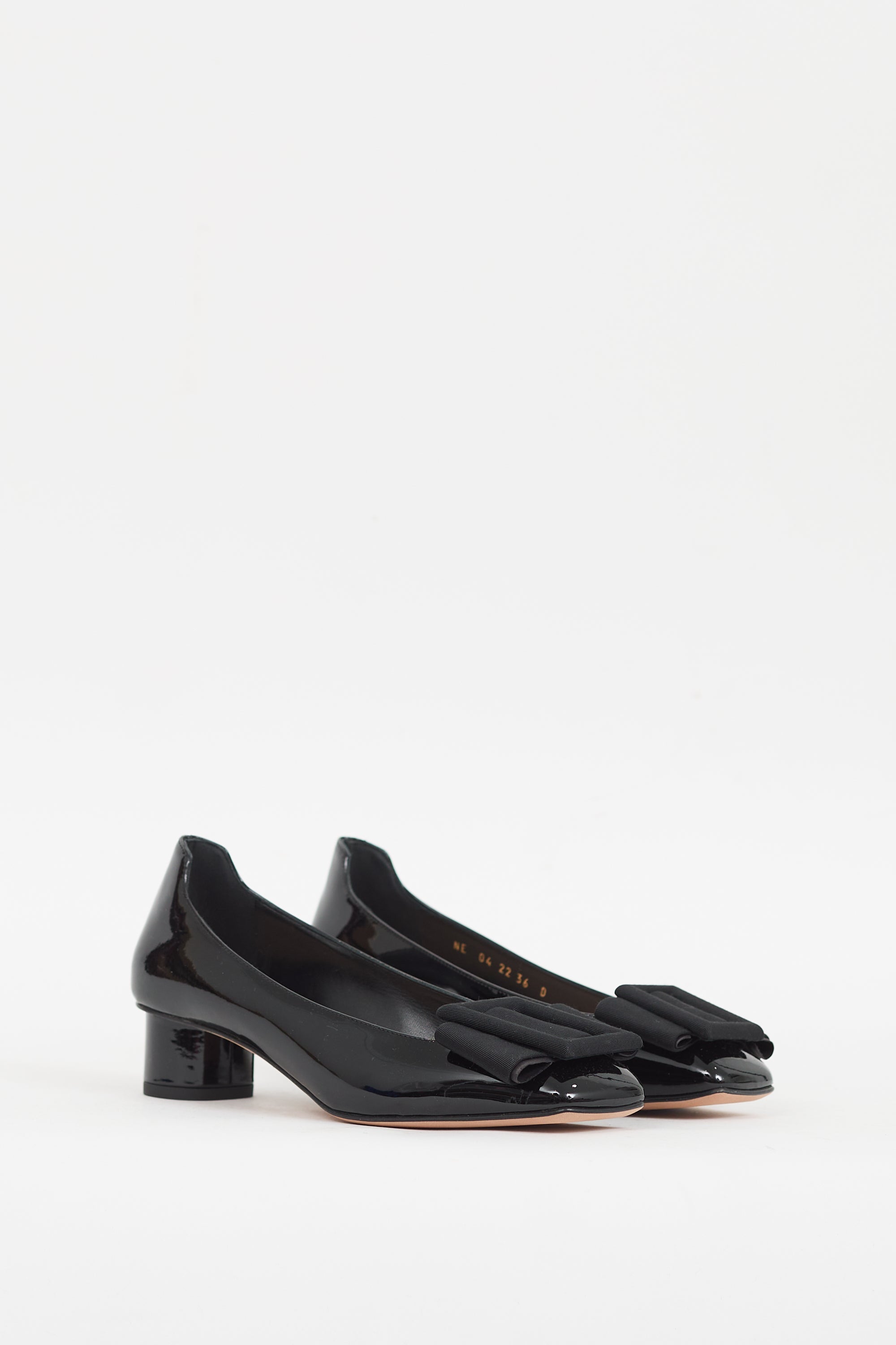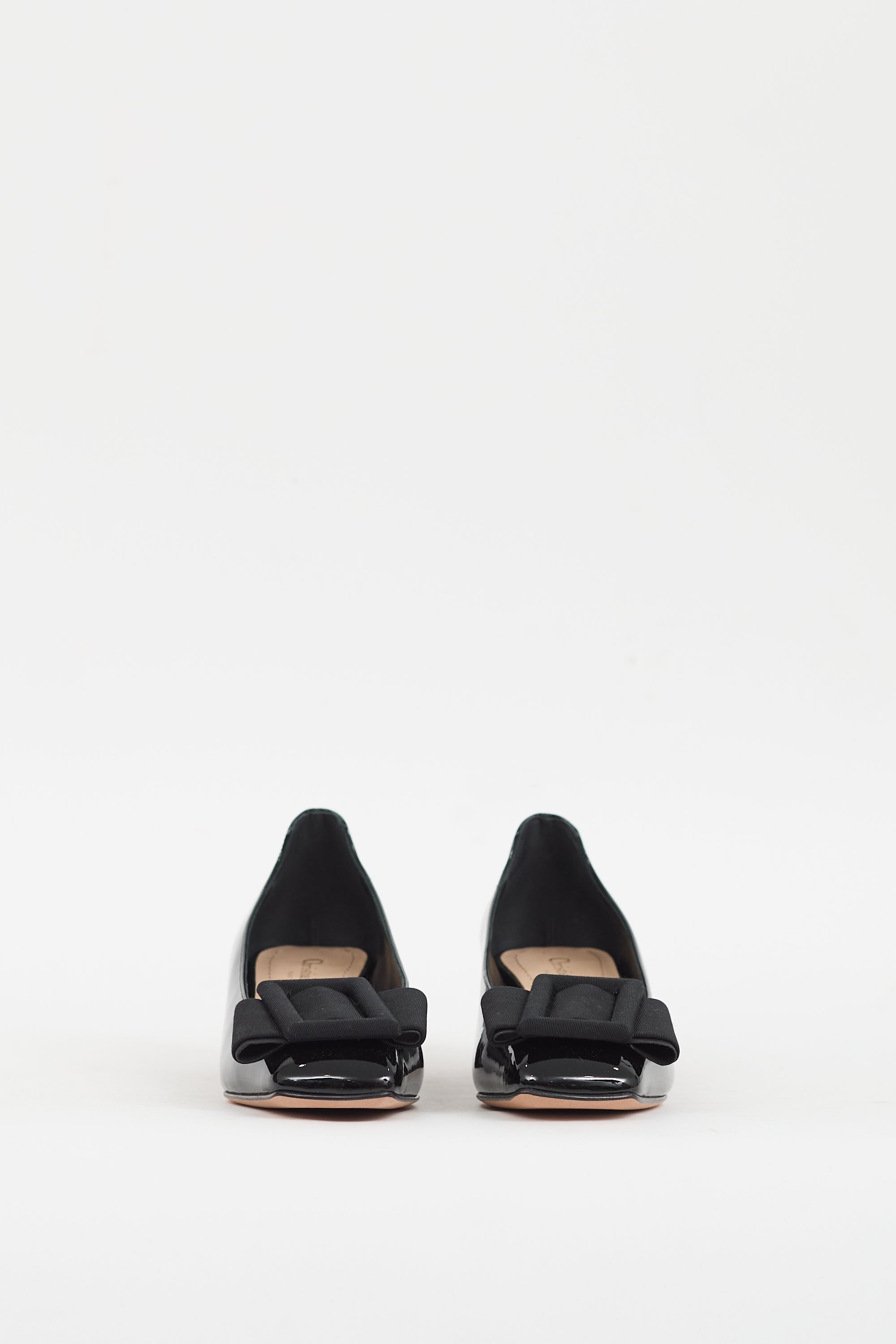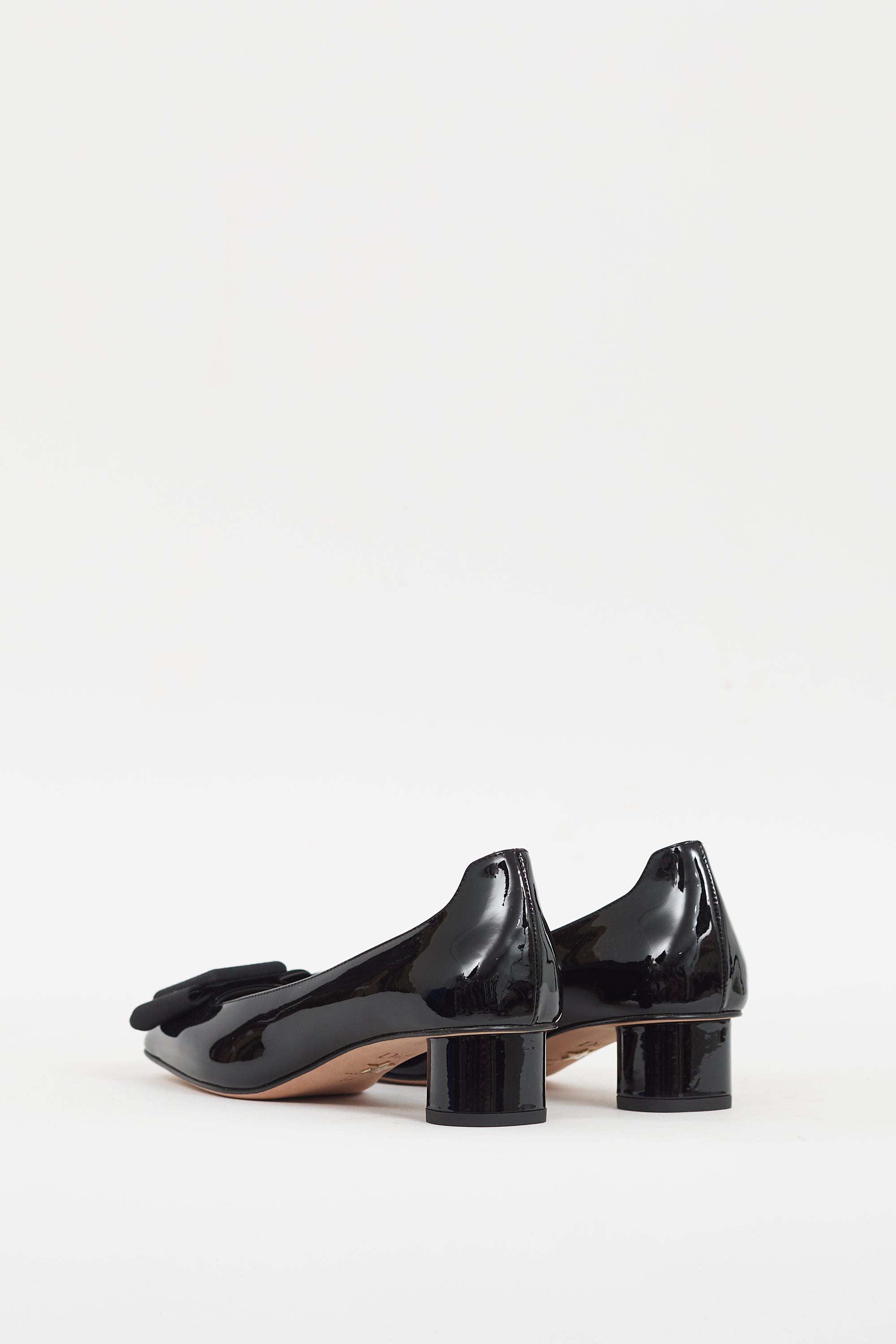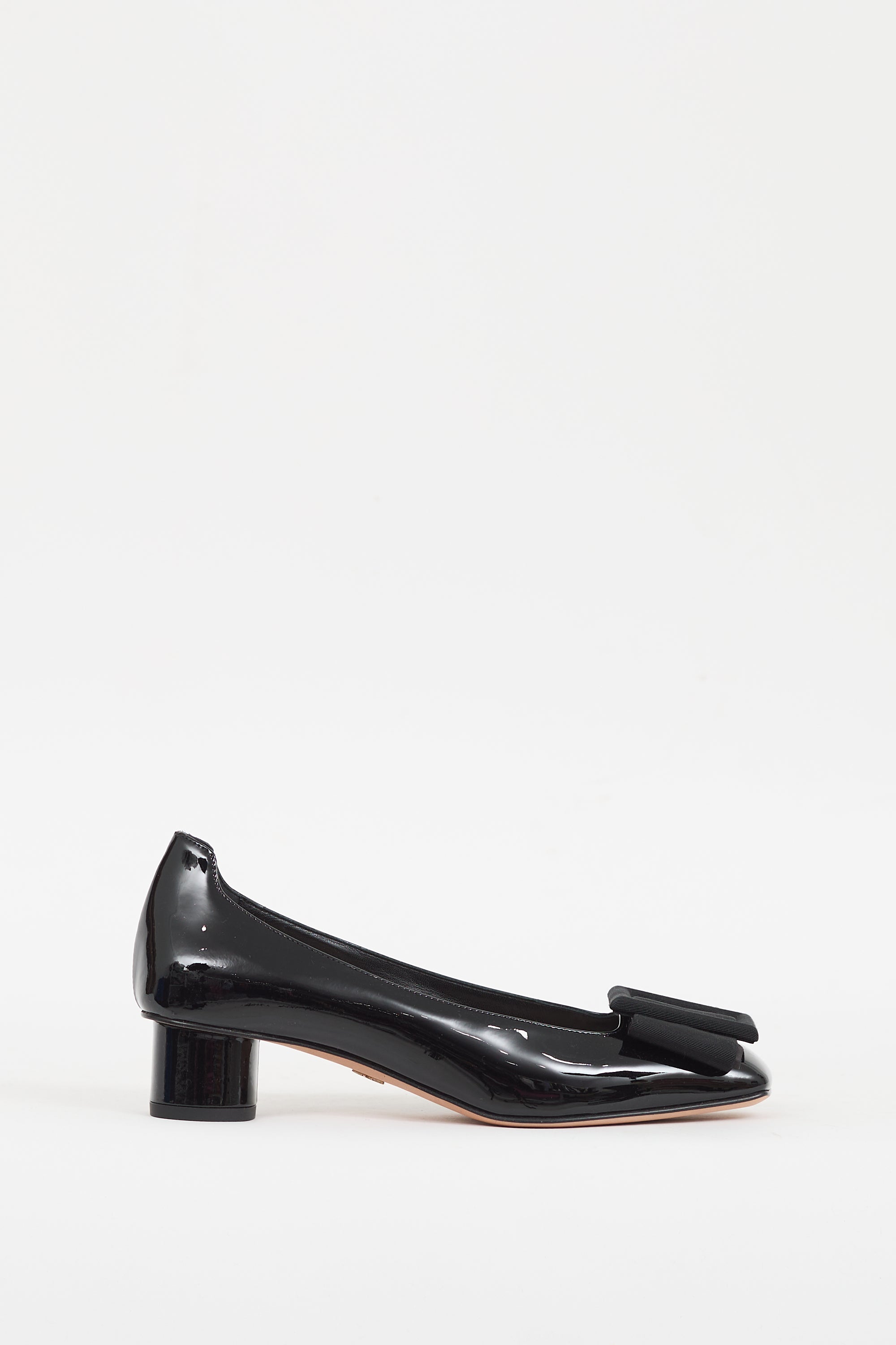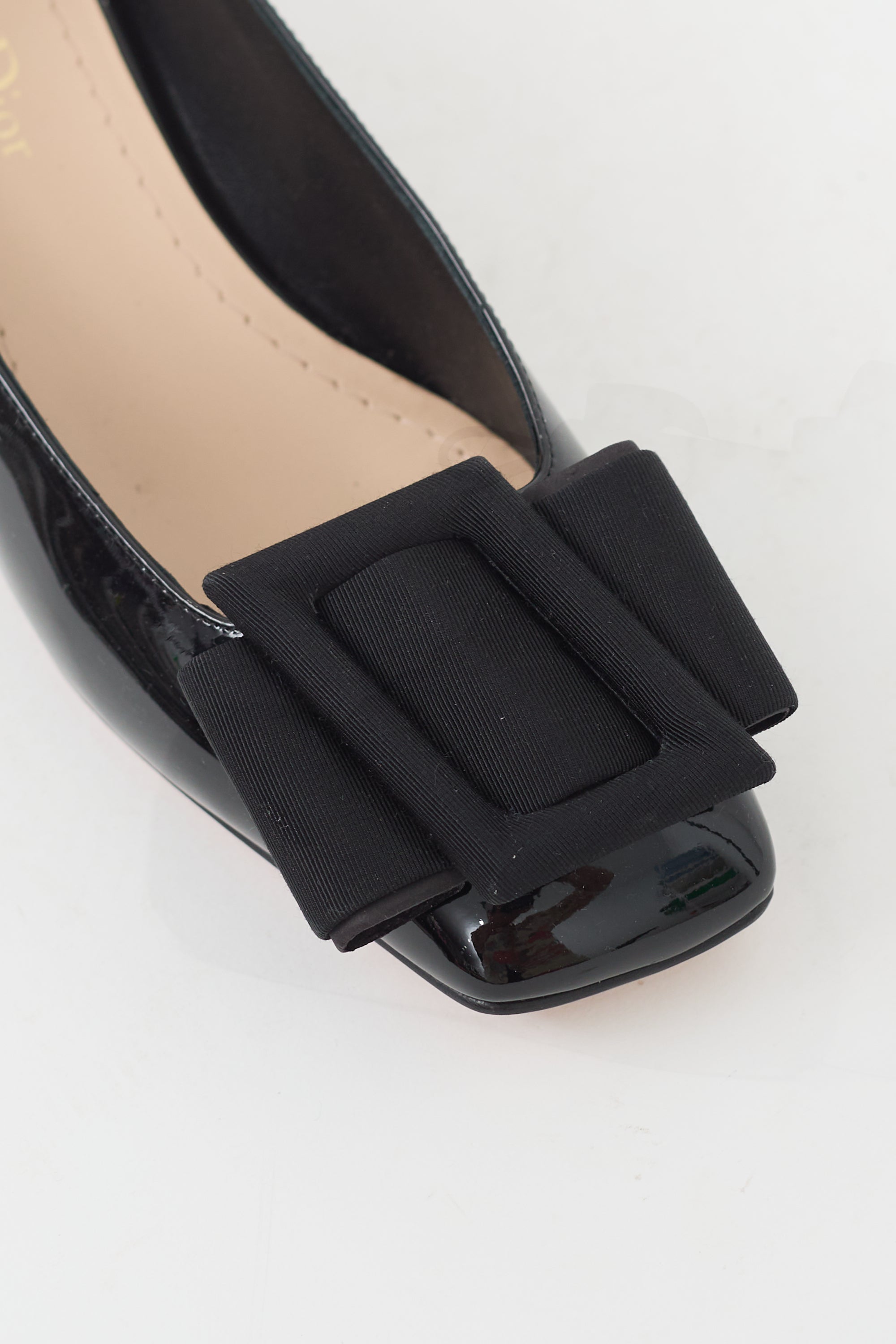 Pre-owned Dior black patent Idylle ballet pumps featuring square toe, webbed bow and buckle at toe, slip on entry, and covered block heel.
