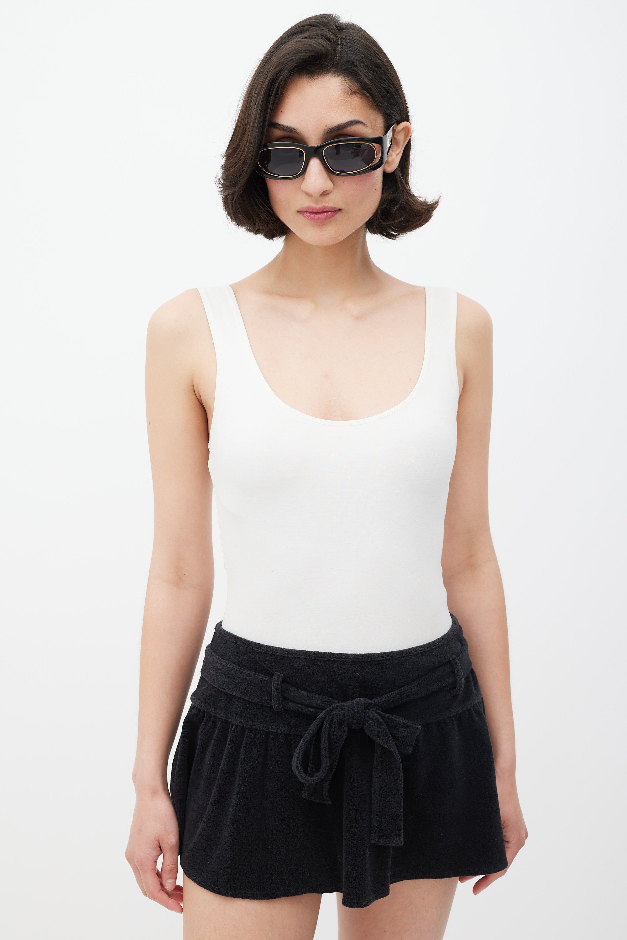 Pre-owned Christian Dior black terrycloth mini skirt featuring an elasticized waist, ruffled hem, and tie belt at waist. Clipped to fit model.