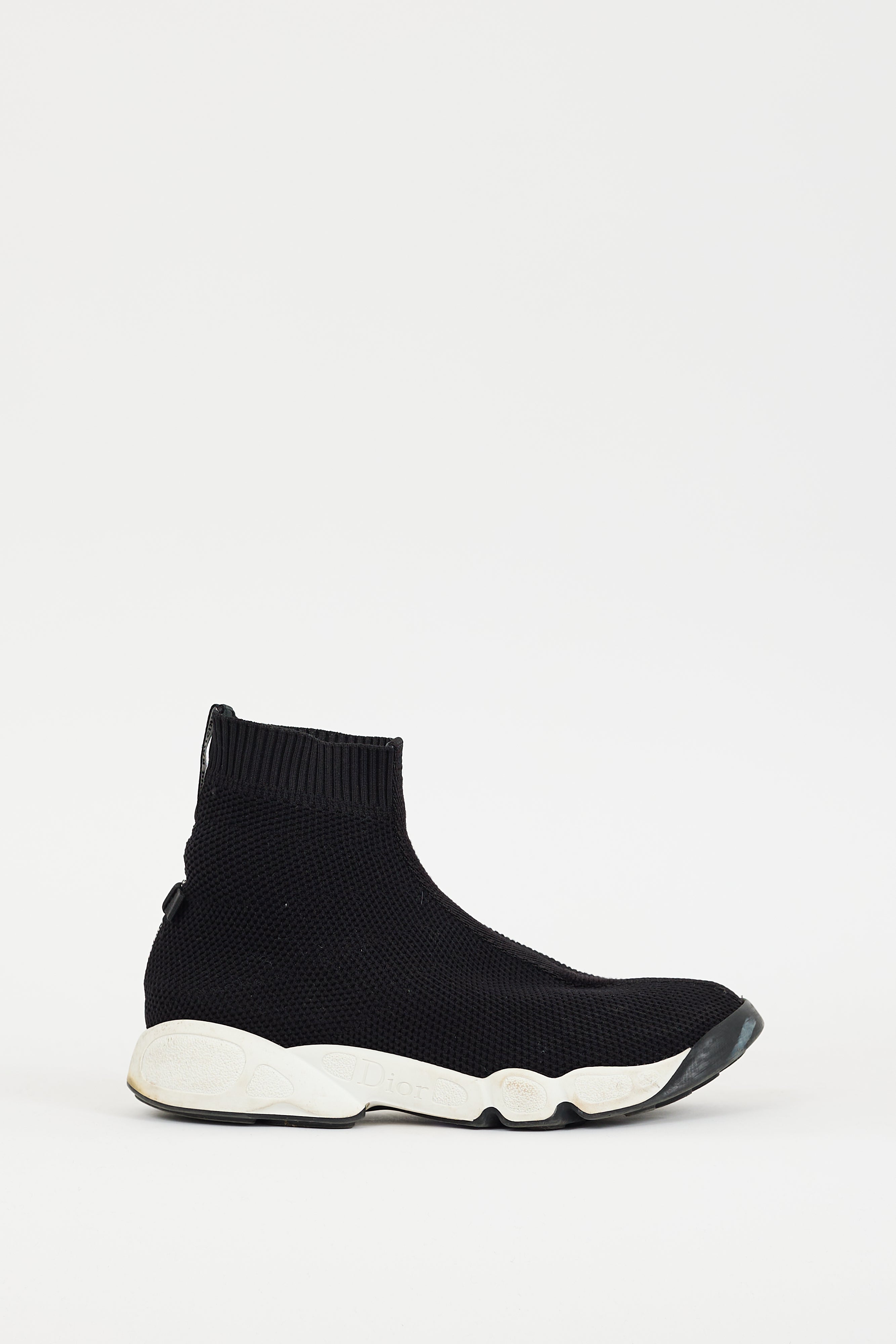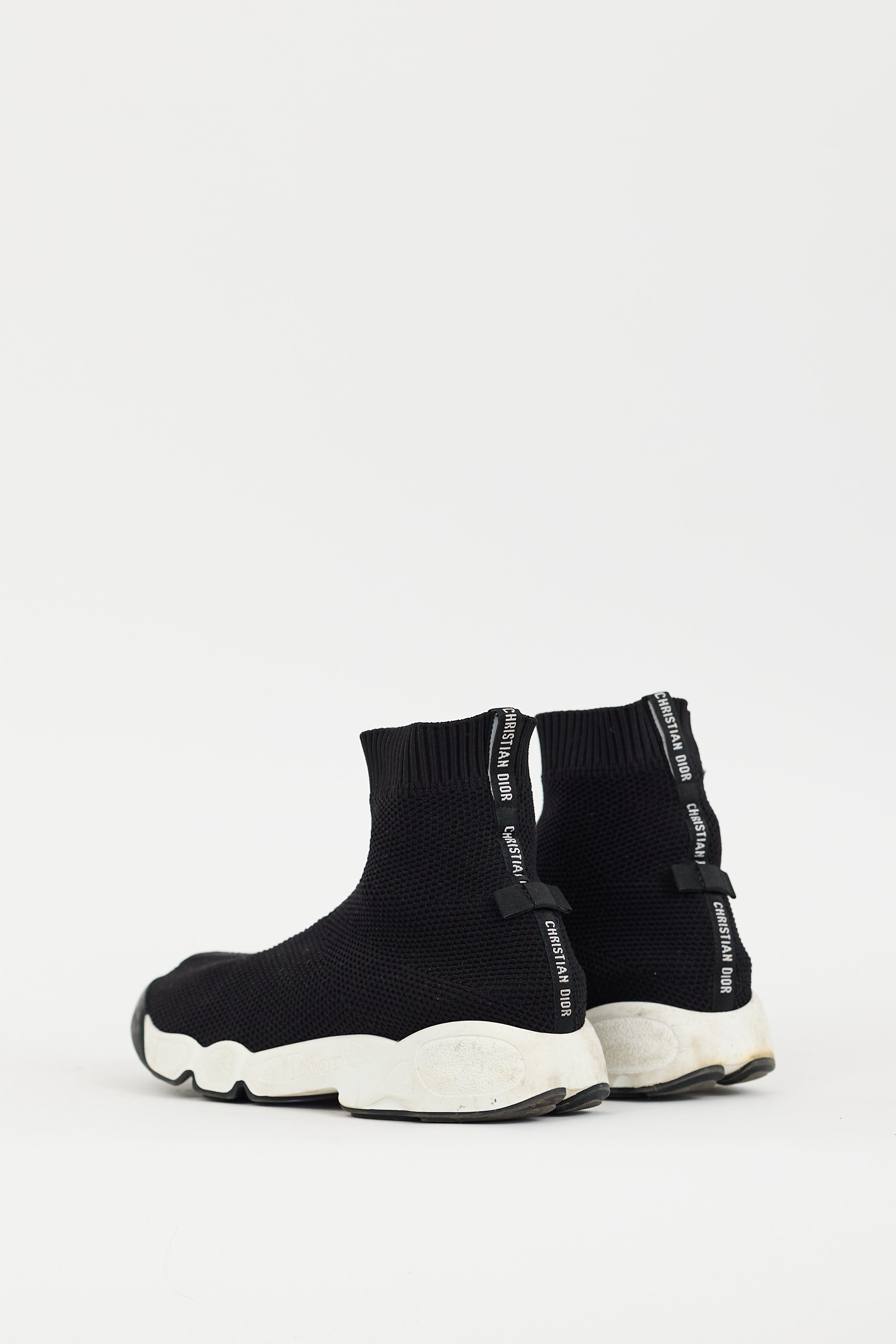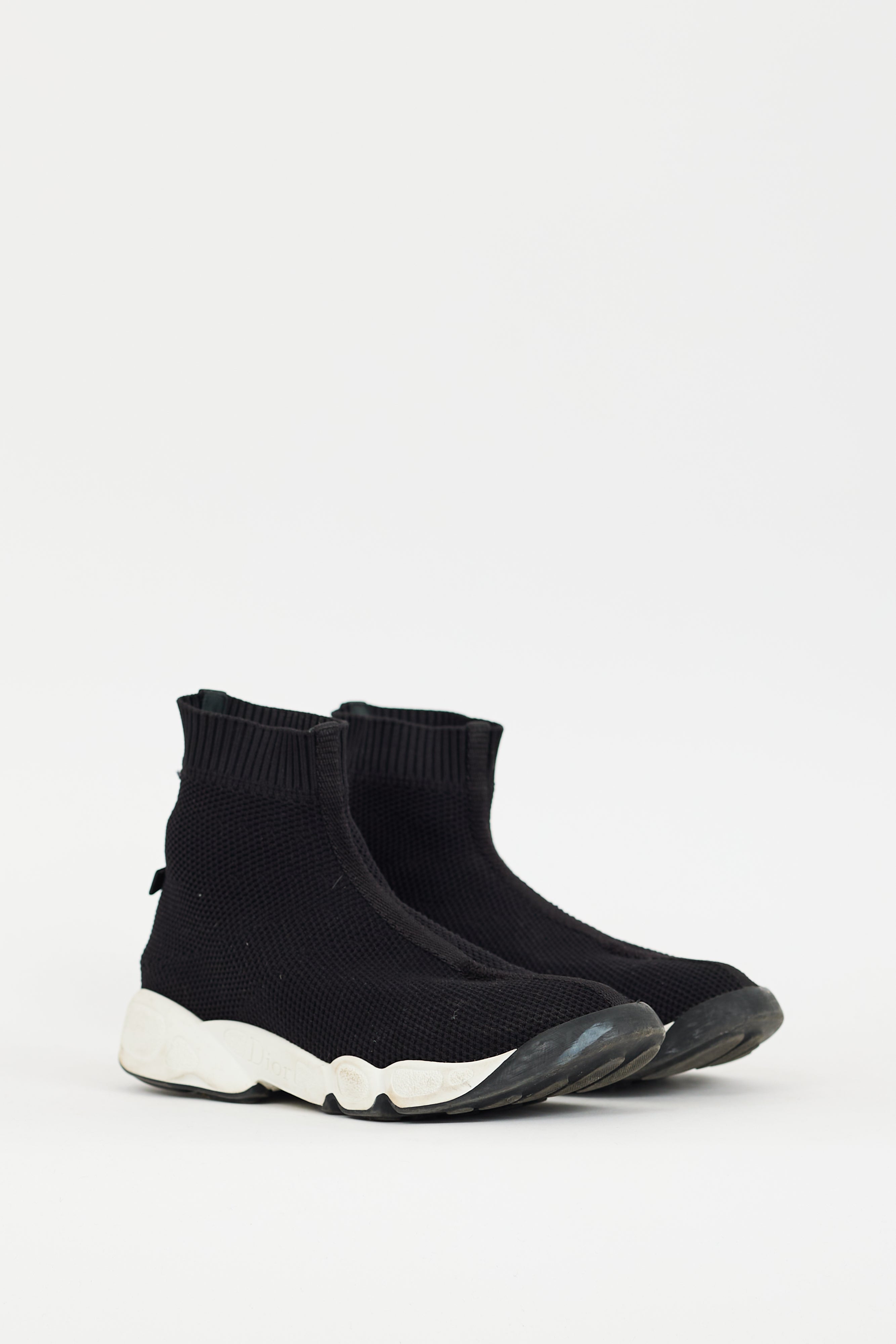 Pre-owned Dior black and white Fusion Technical High Top sneakers featuring a rounded toe, mesh upper, ribbed collar, grosgrain trim at centre front, logo trim with bow detail at centre back, and white rubber sole with debossed logo and textured panelling throughout. Comes with original dust bag.