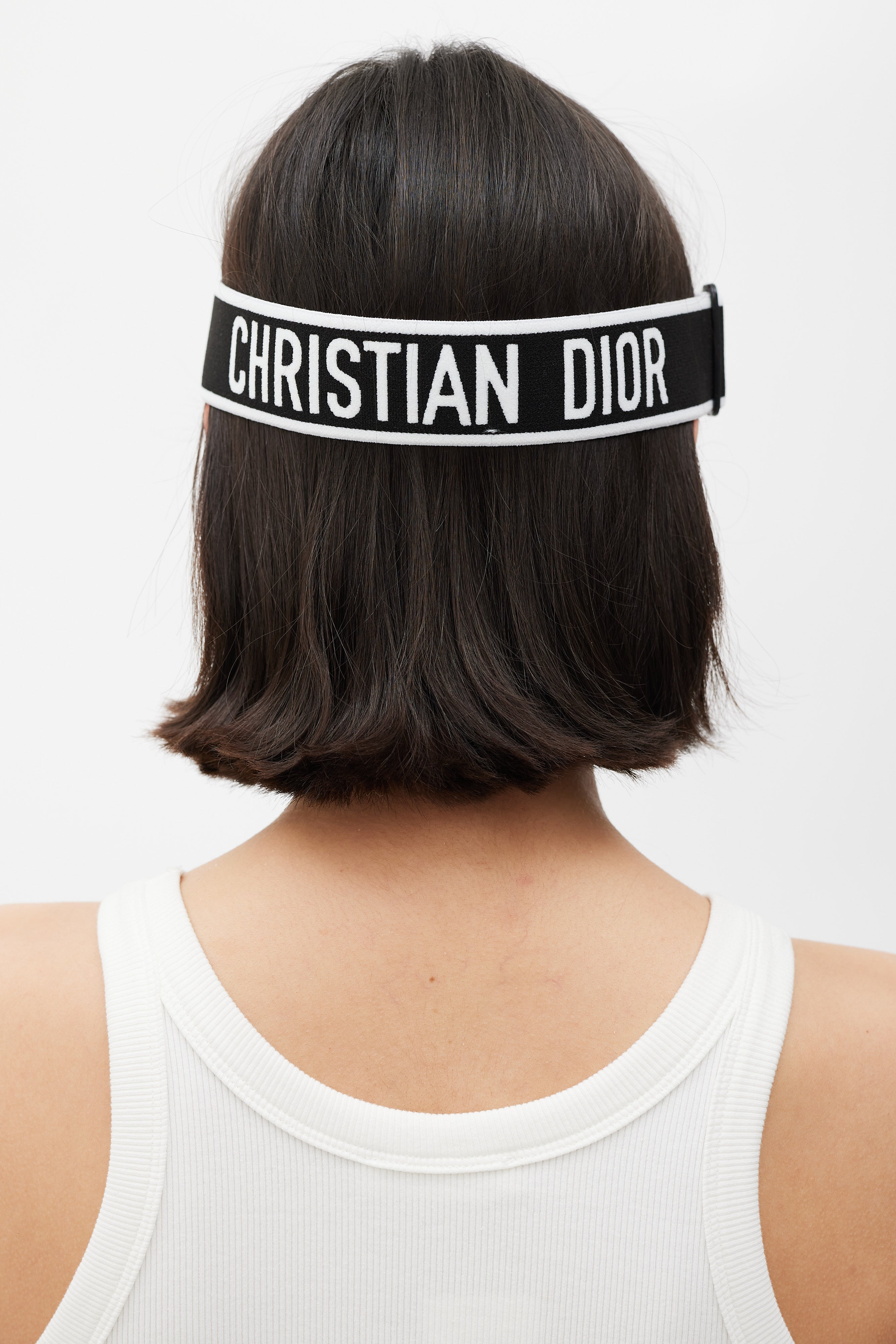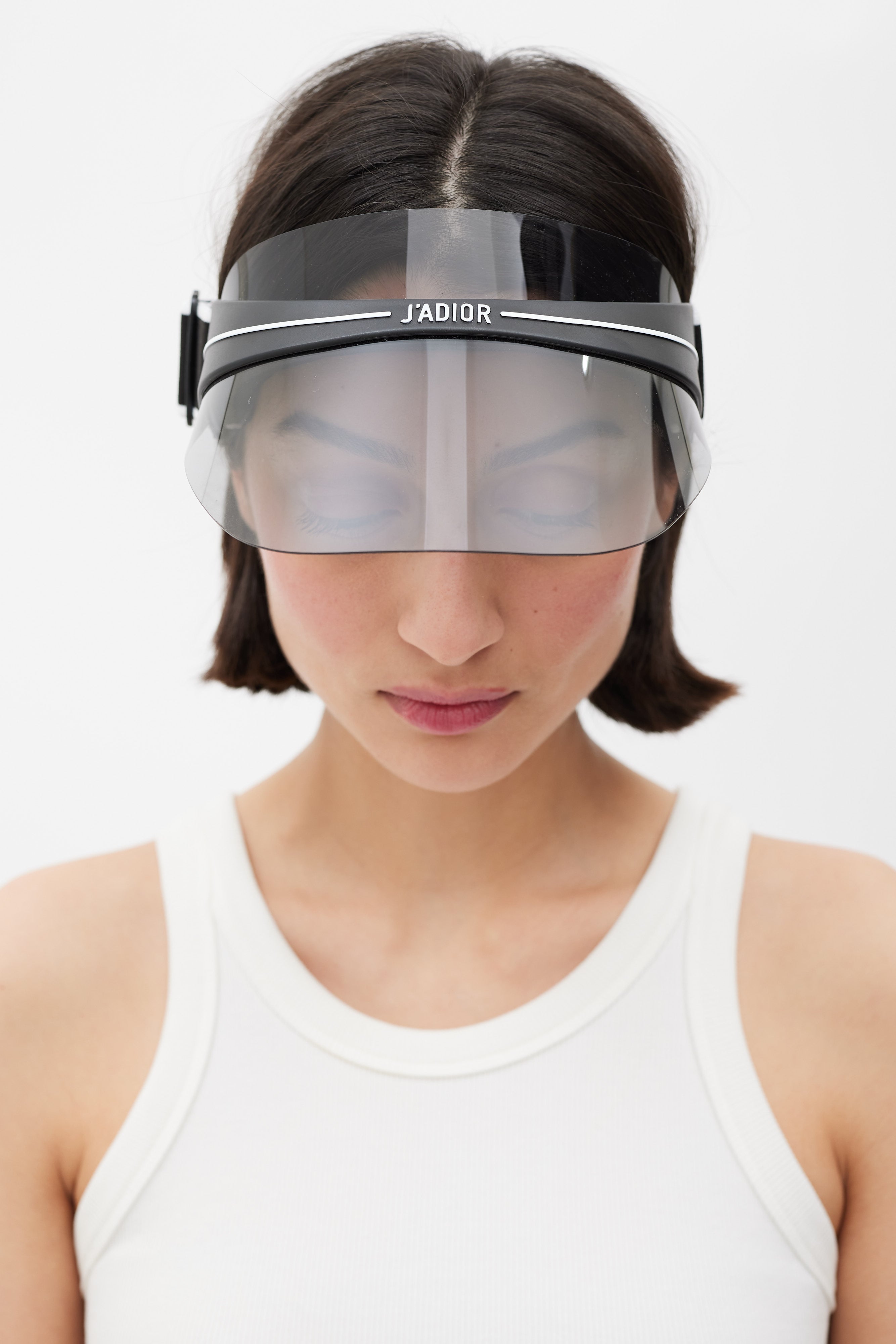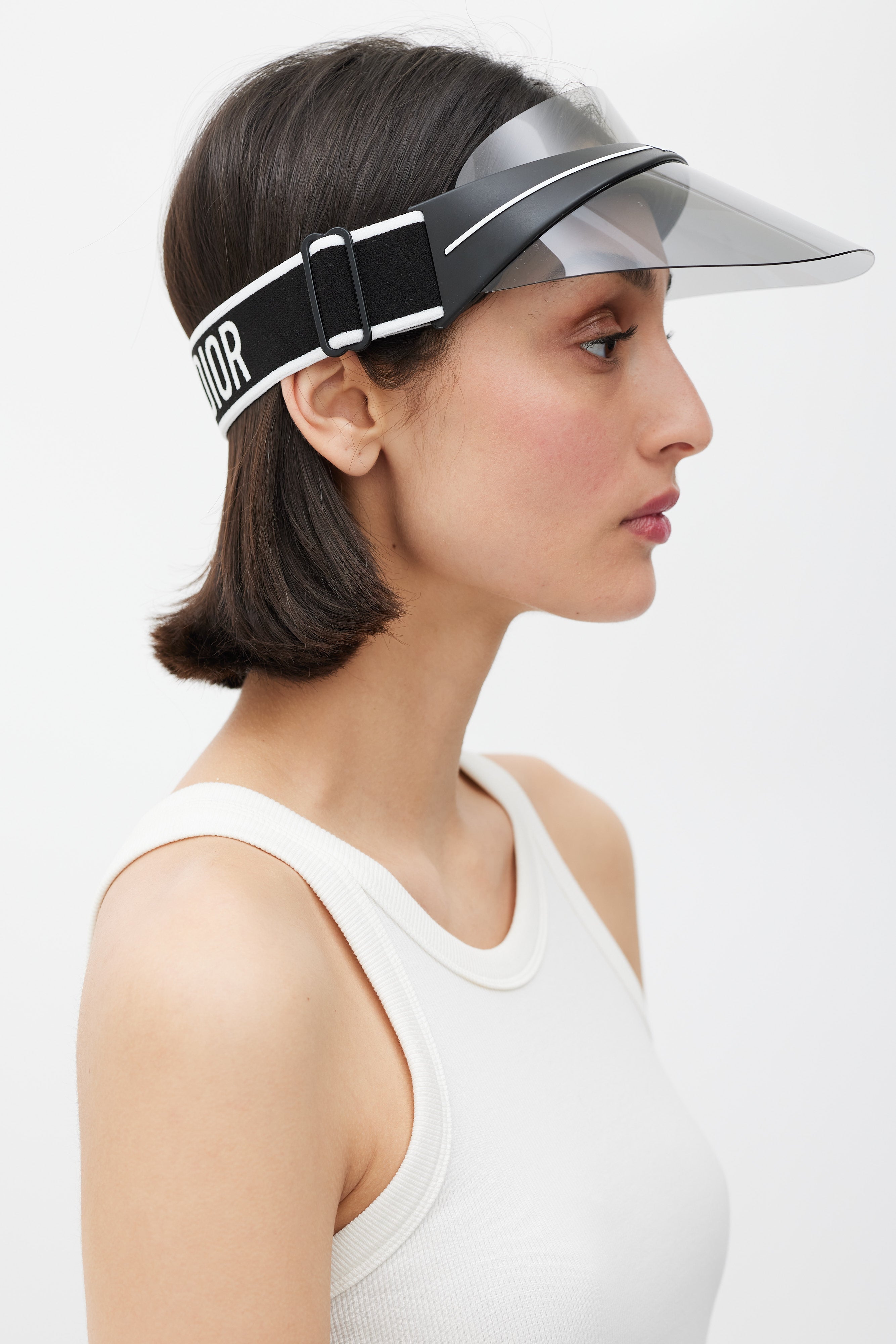 Pre-owned Christian Dior black Diorclub1 visor featuring a tonal tinted acetate brim, adjustable elastic strap with white woven logo, enamel band at face with J'Adior logo, and foam cushion at inner band. Comes with original box and dust bag.