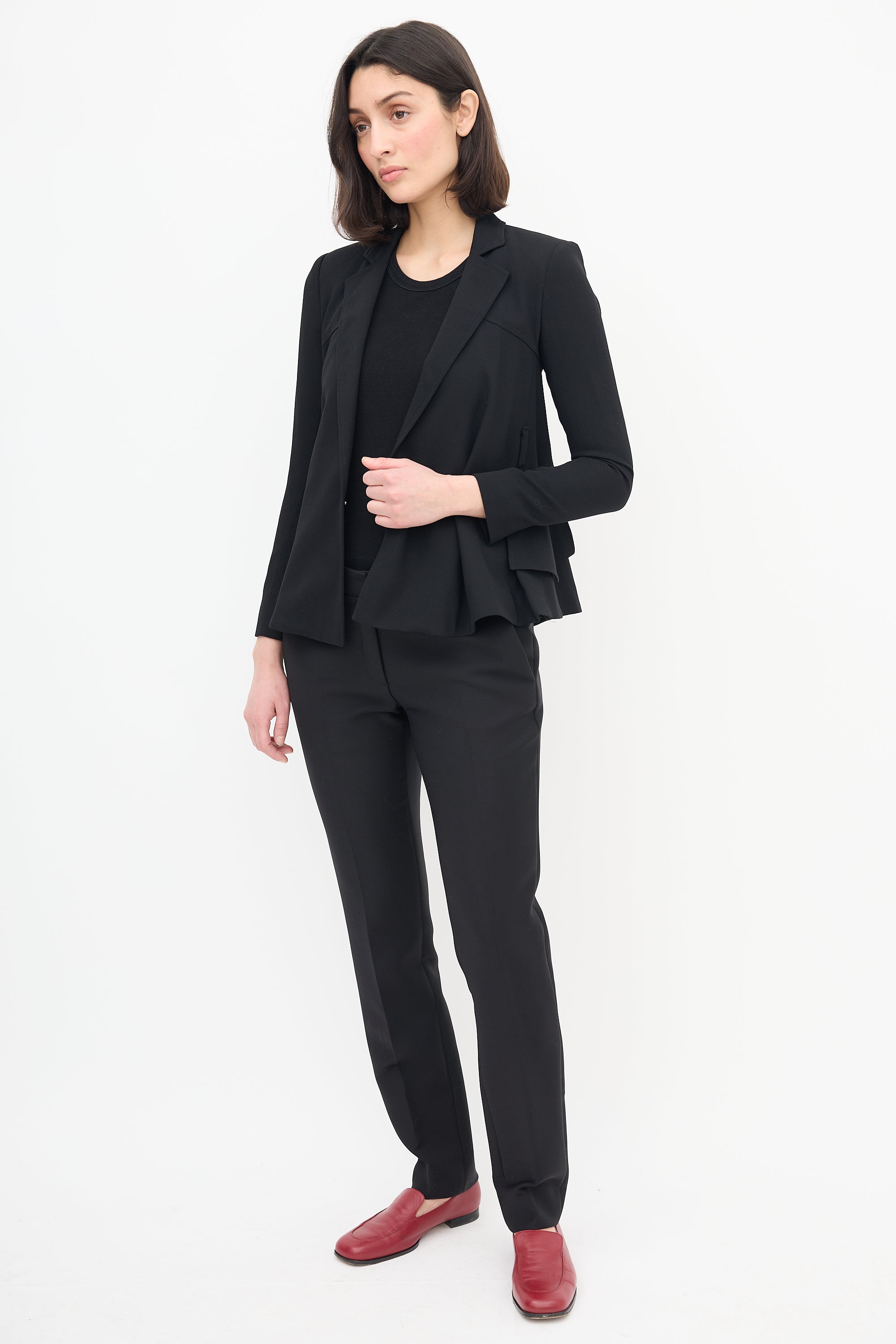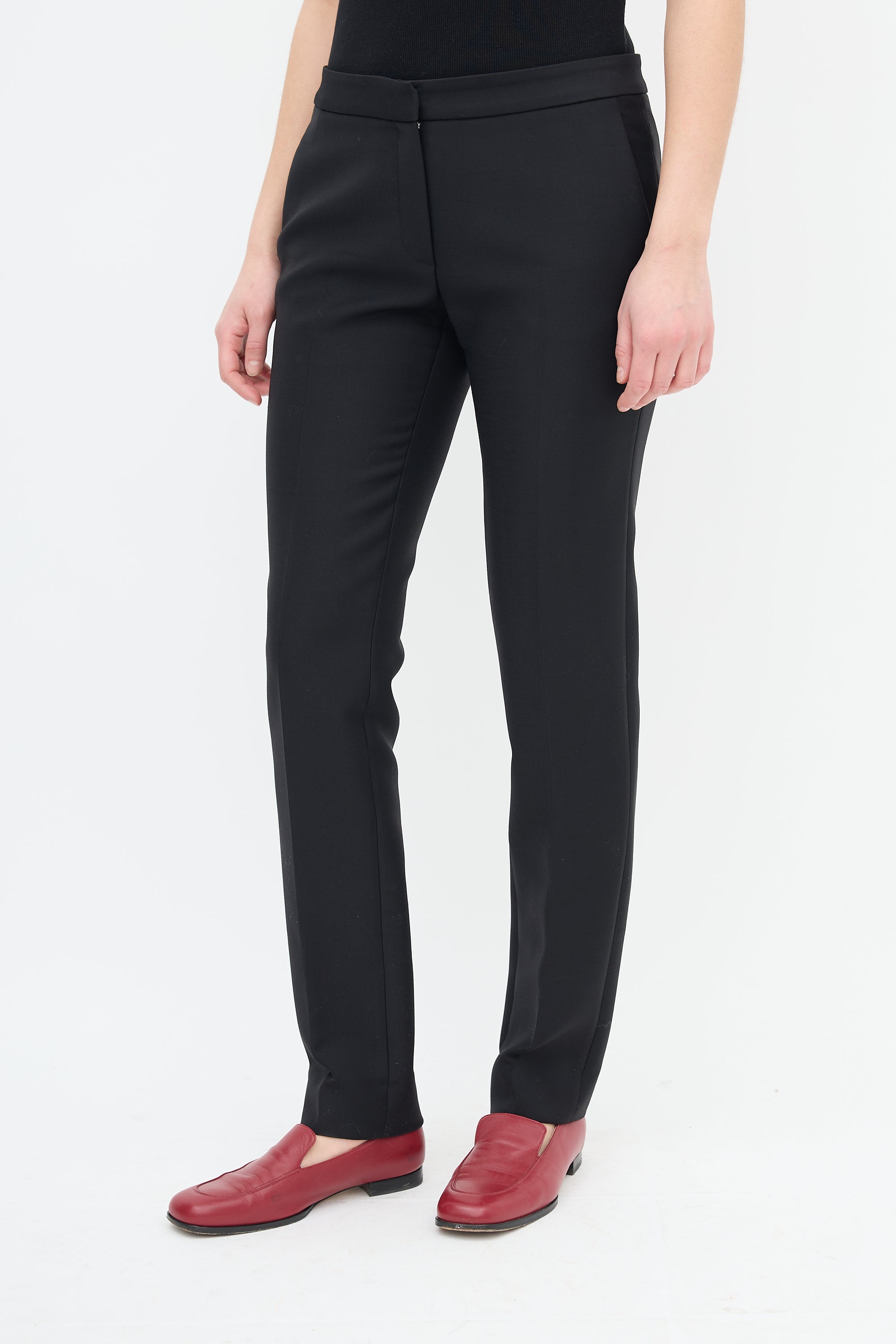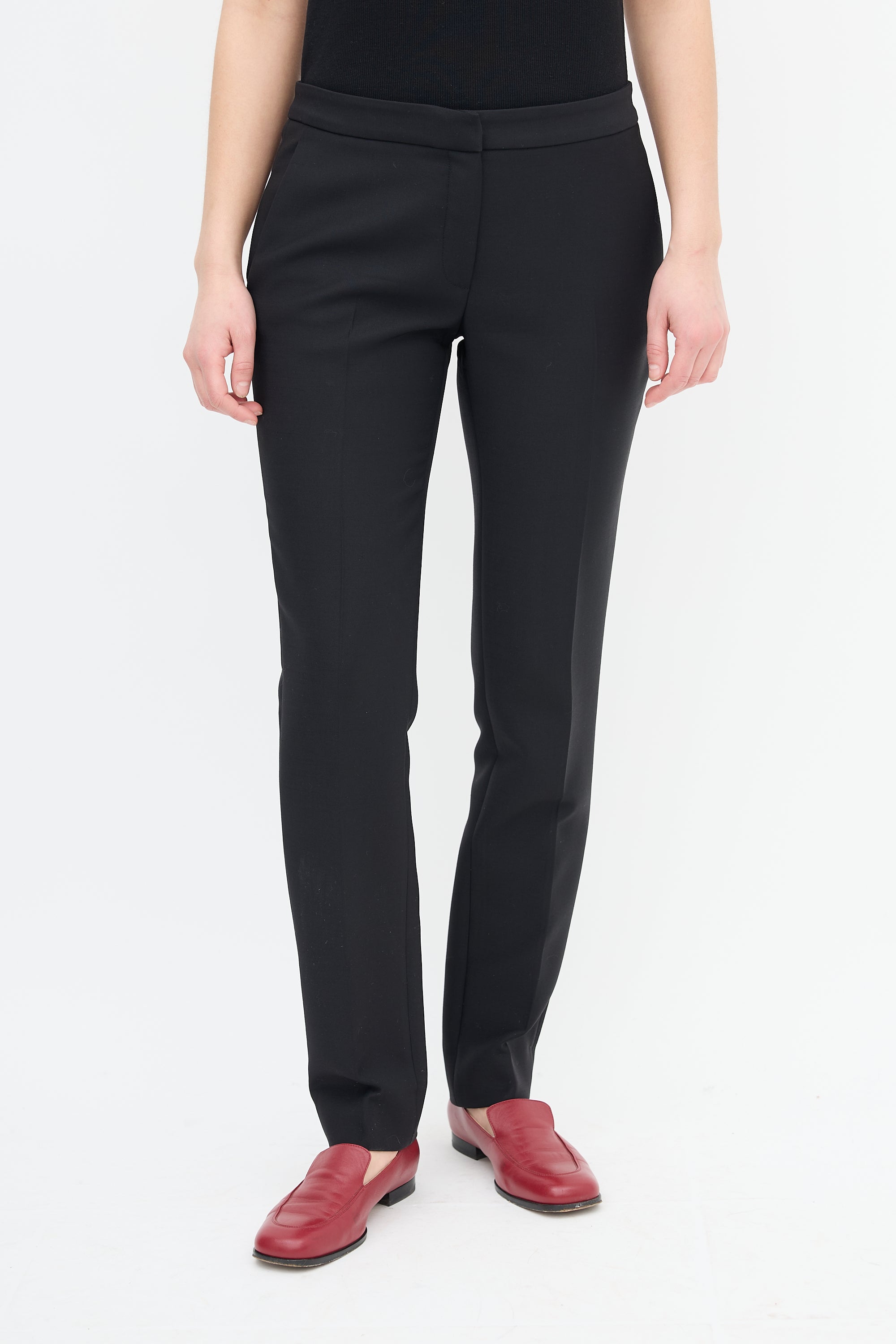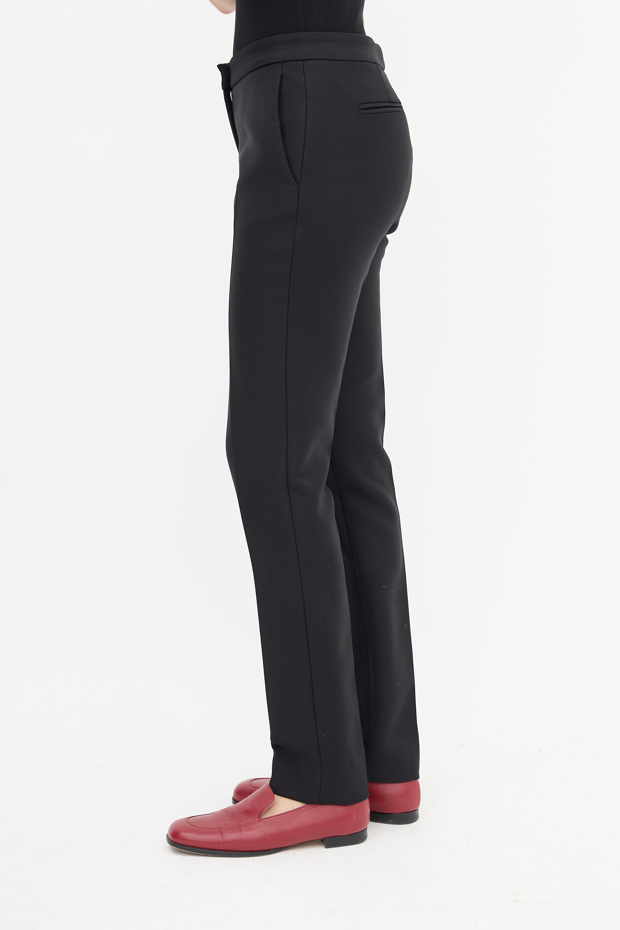 Pre-owned Dior black wool slim fit trousers featuring two slash pockets at front, two welt pockets at back, creased legs, and zip fly with button and hook closure.
