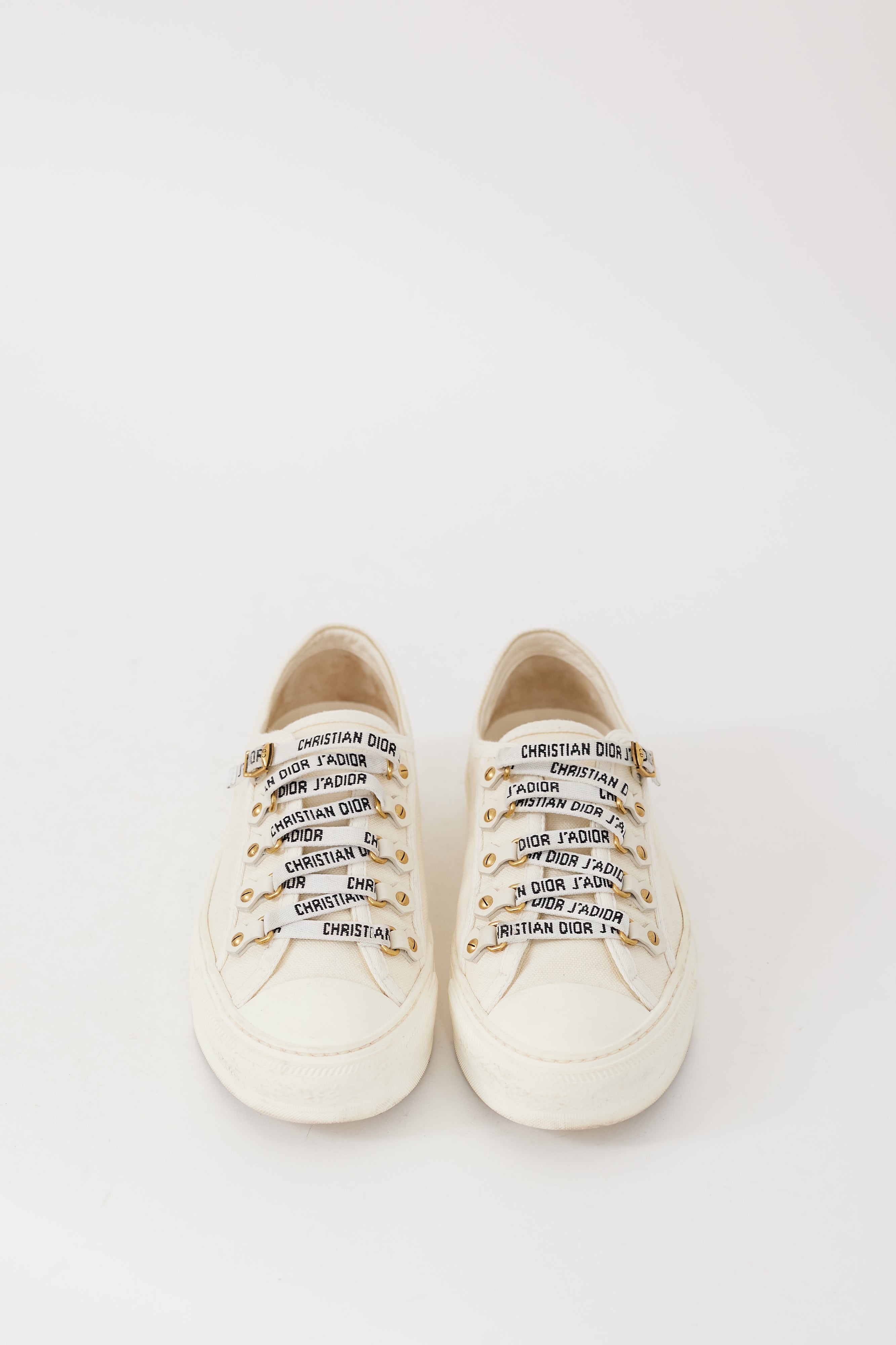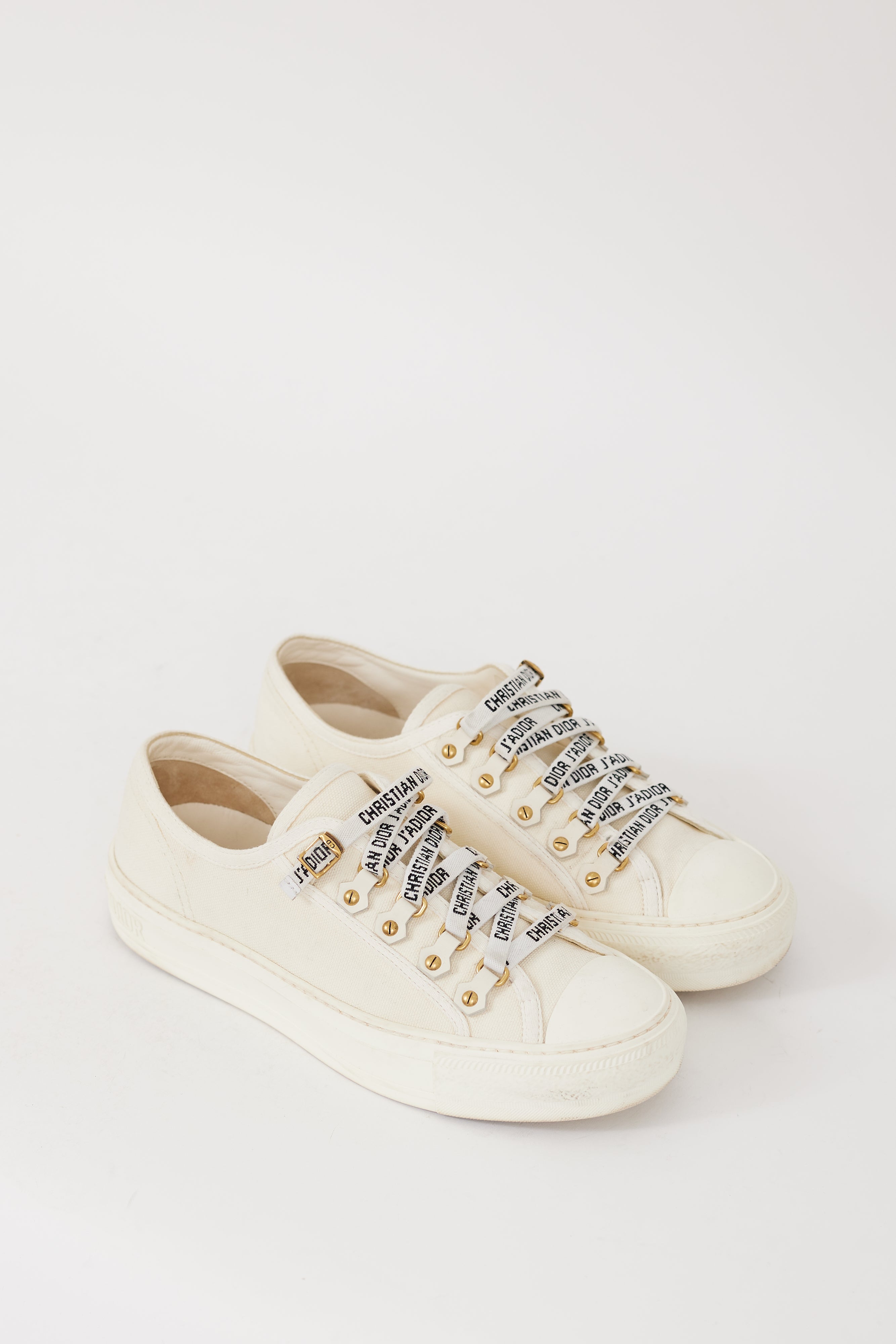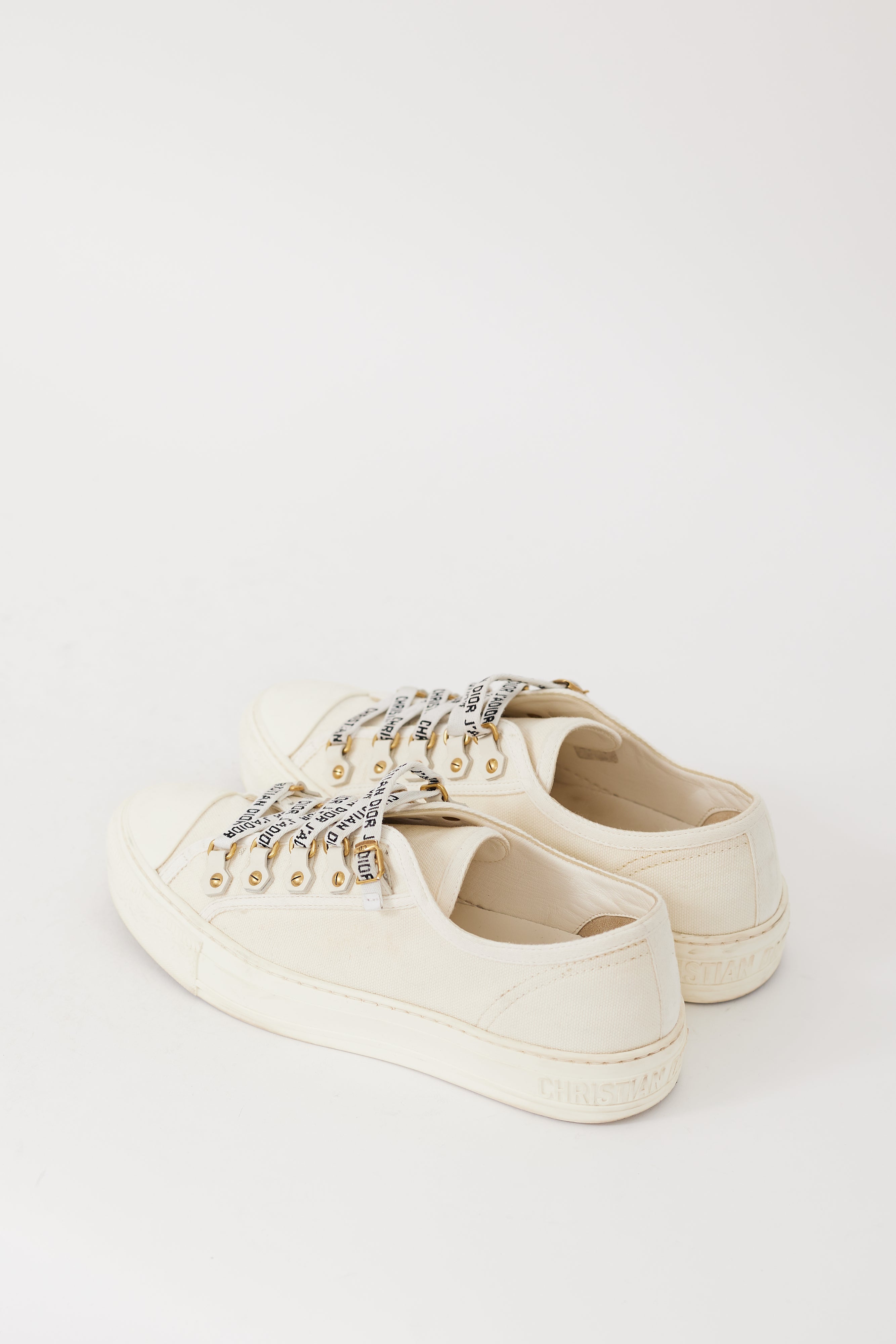 Pre-owned Dior cream Walk'N'Dior canvas sneakers featuring a round cap toe, embossed logo at heel, gold tone eyelet hardware, and lace up closure.