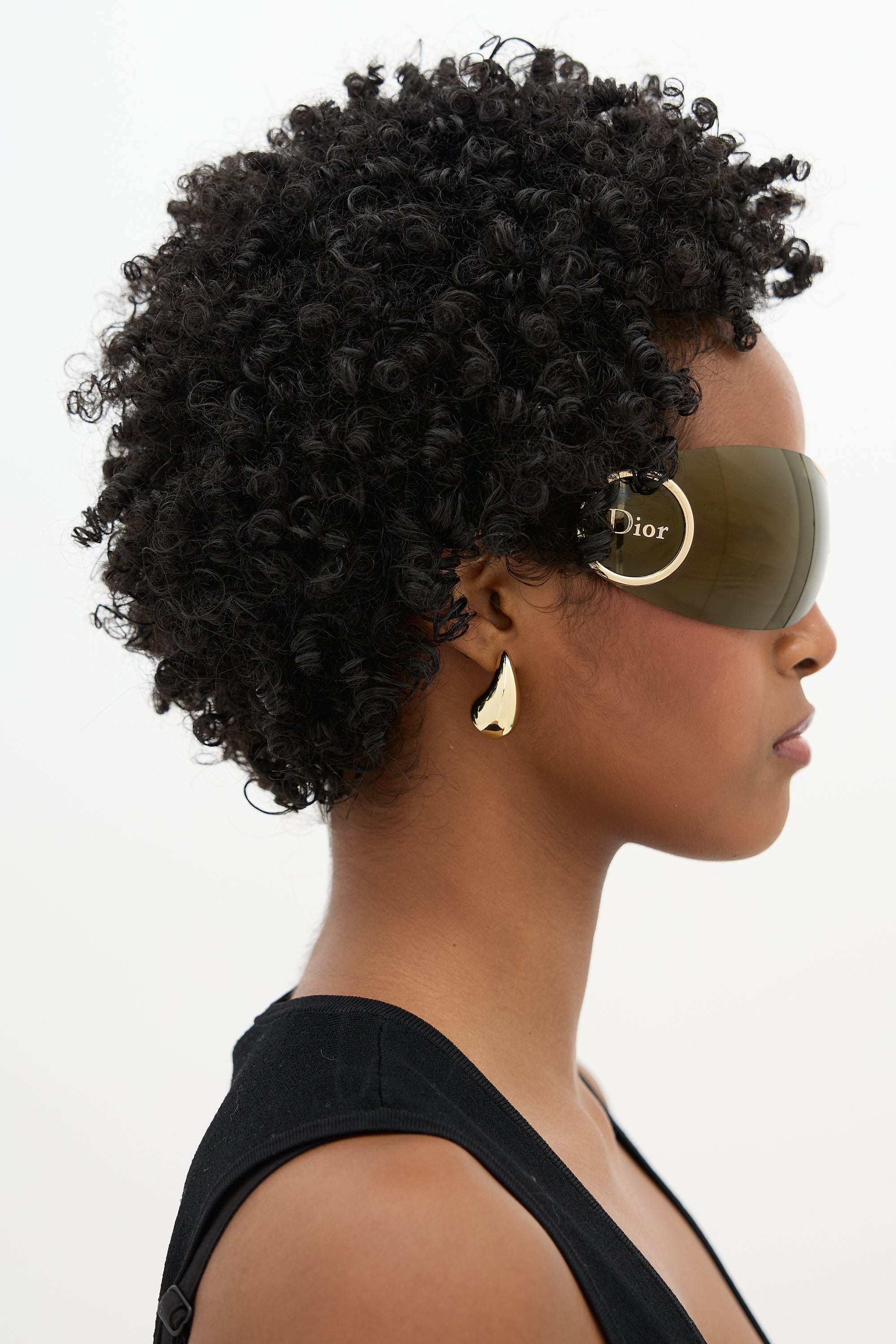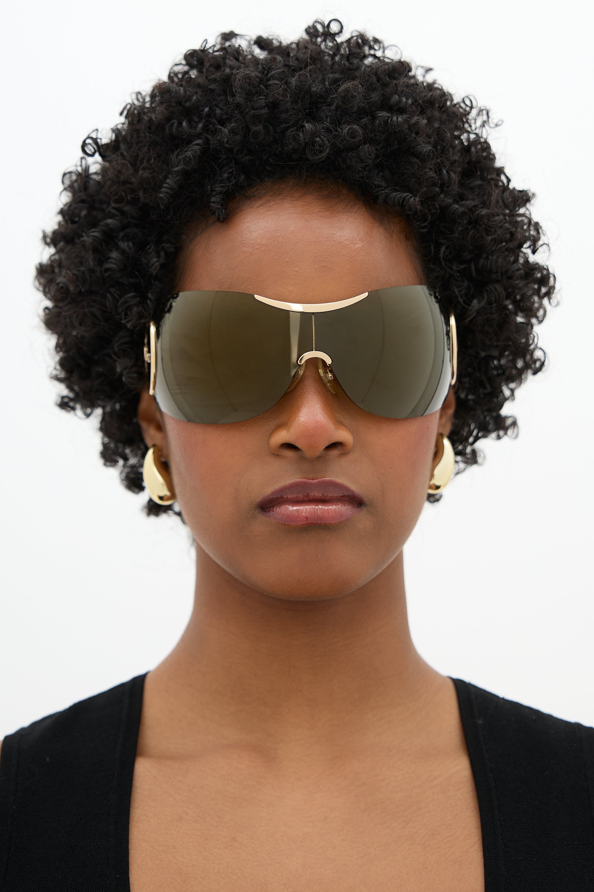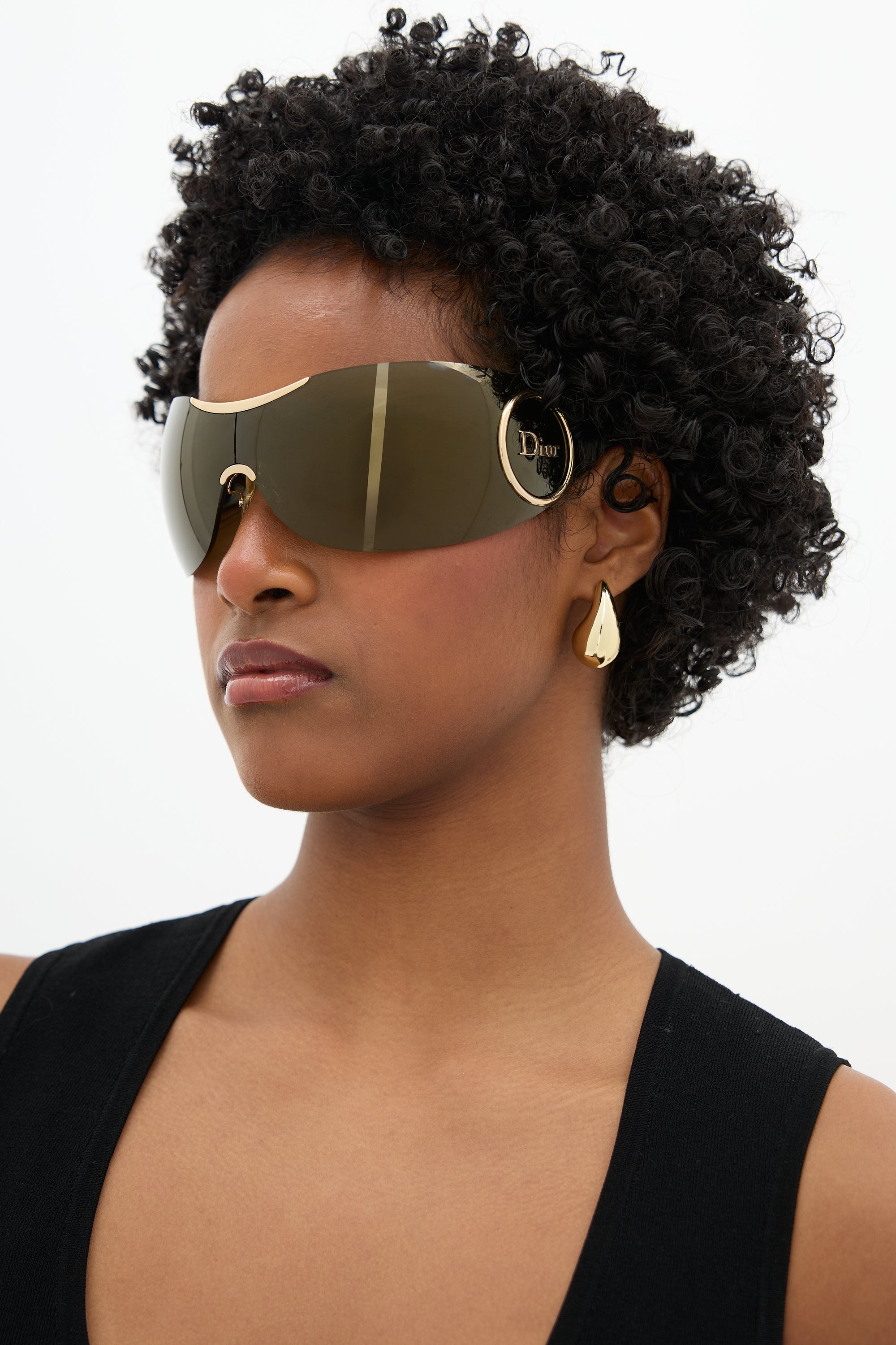 Pre-owned Dior vintage Dior Sport 2 sunglasses featuring grey tinted rimless shield lenses, gold tone circle logo embellishment at sides, and retractable wire arms. John Galliano era design. Comes with original case and care guide.