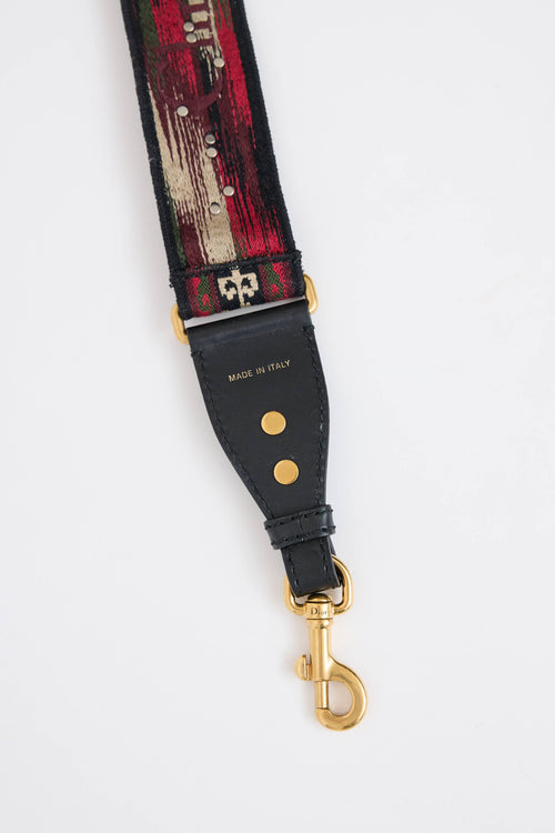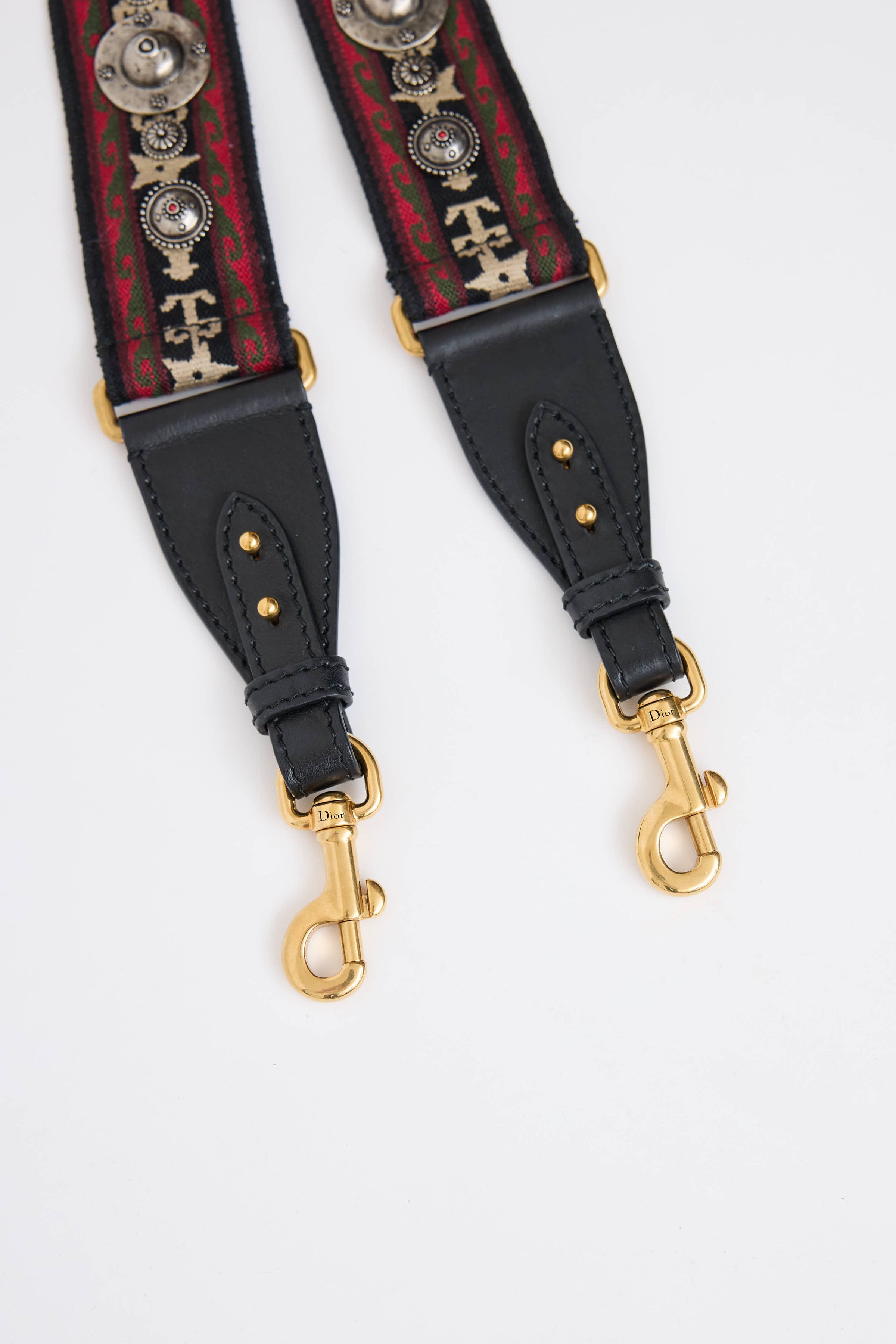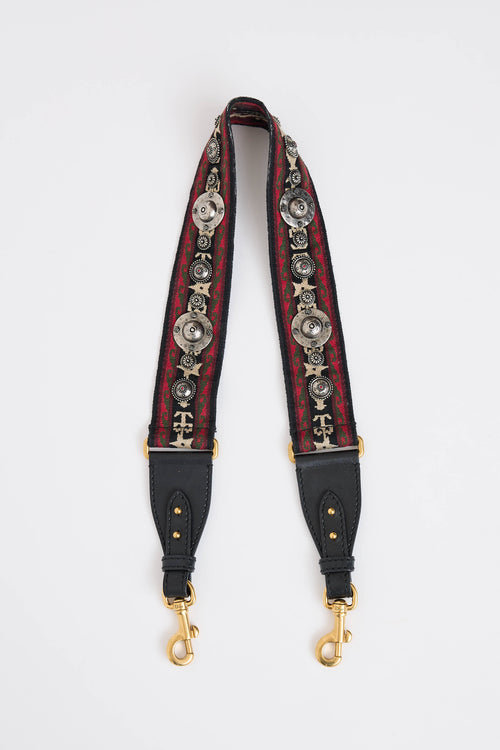 Pre-owned Dior red shoulder strap featuring a multicolour embroidered print throughout, silver tone stud hardware, gold tone lobster clasp, and an embroidered logo at interior.