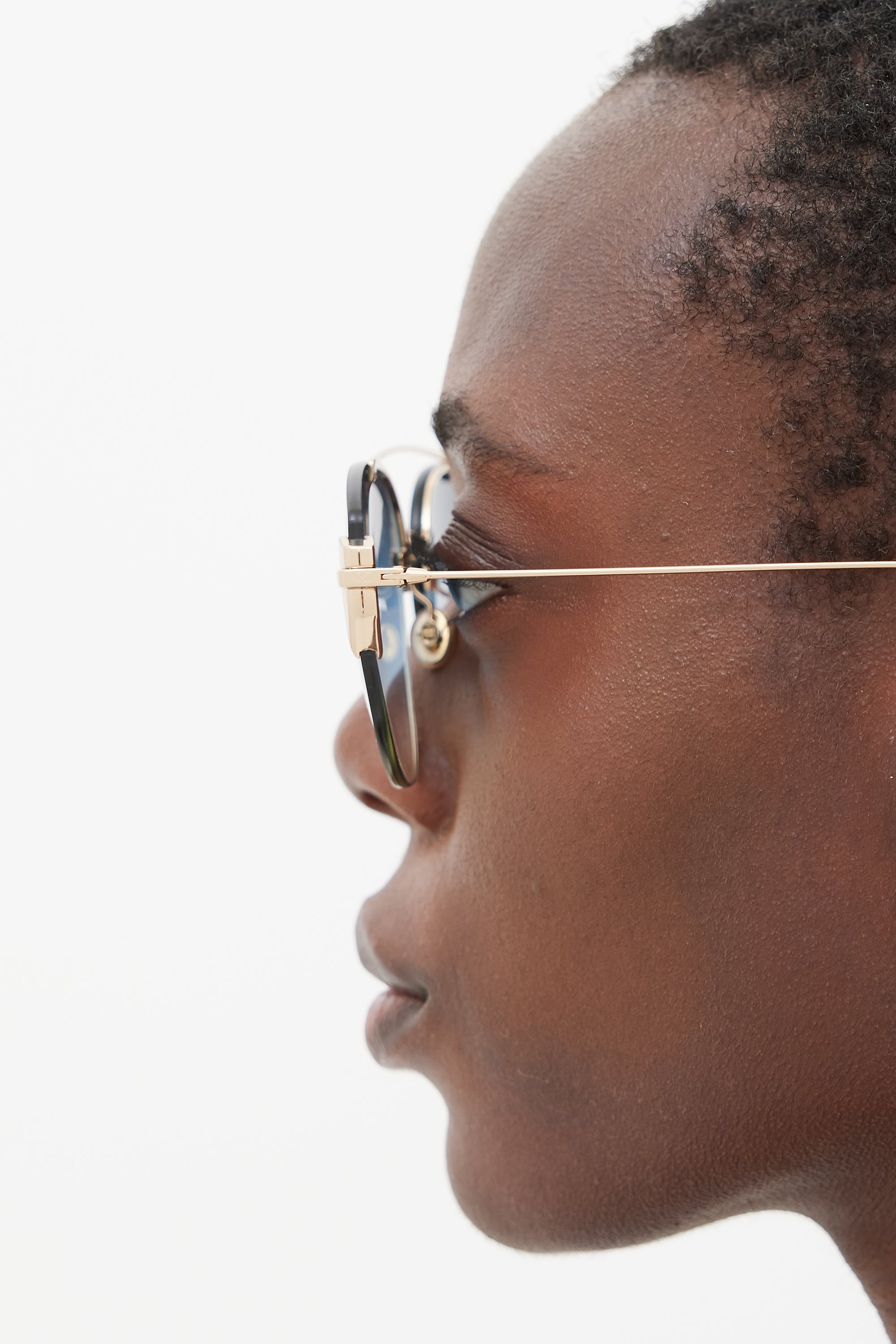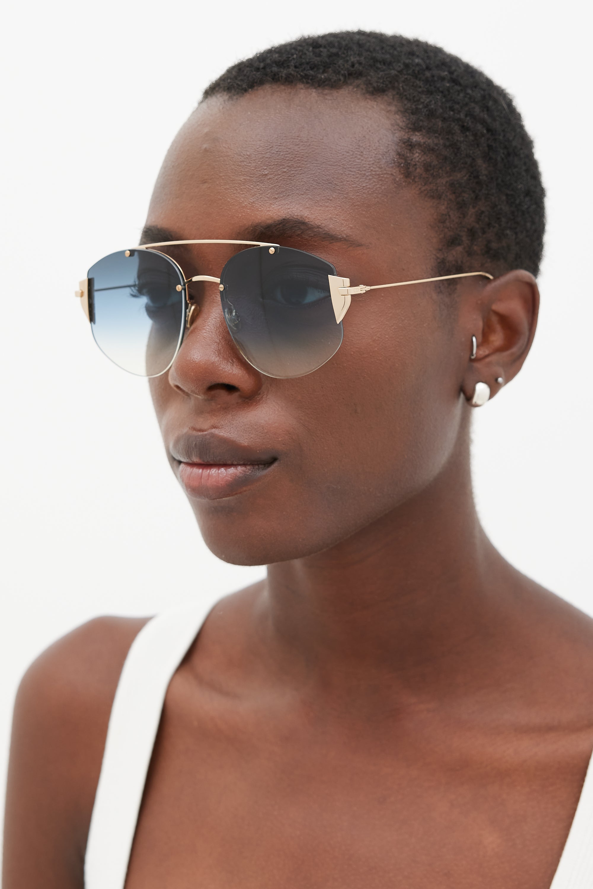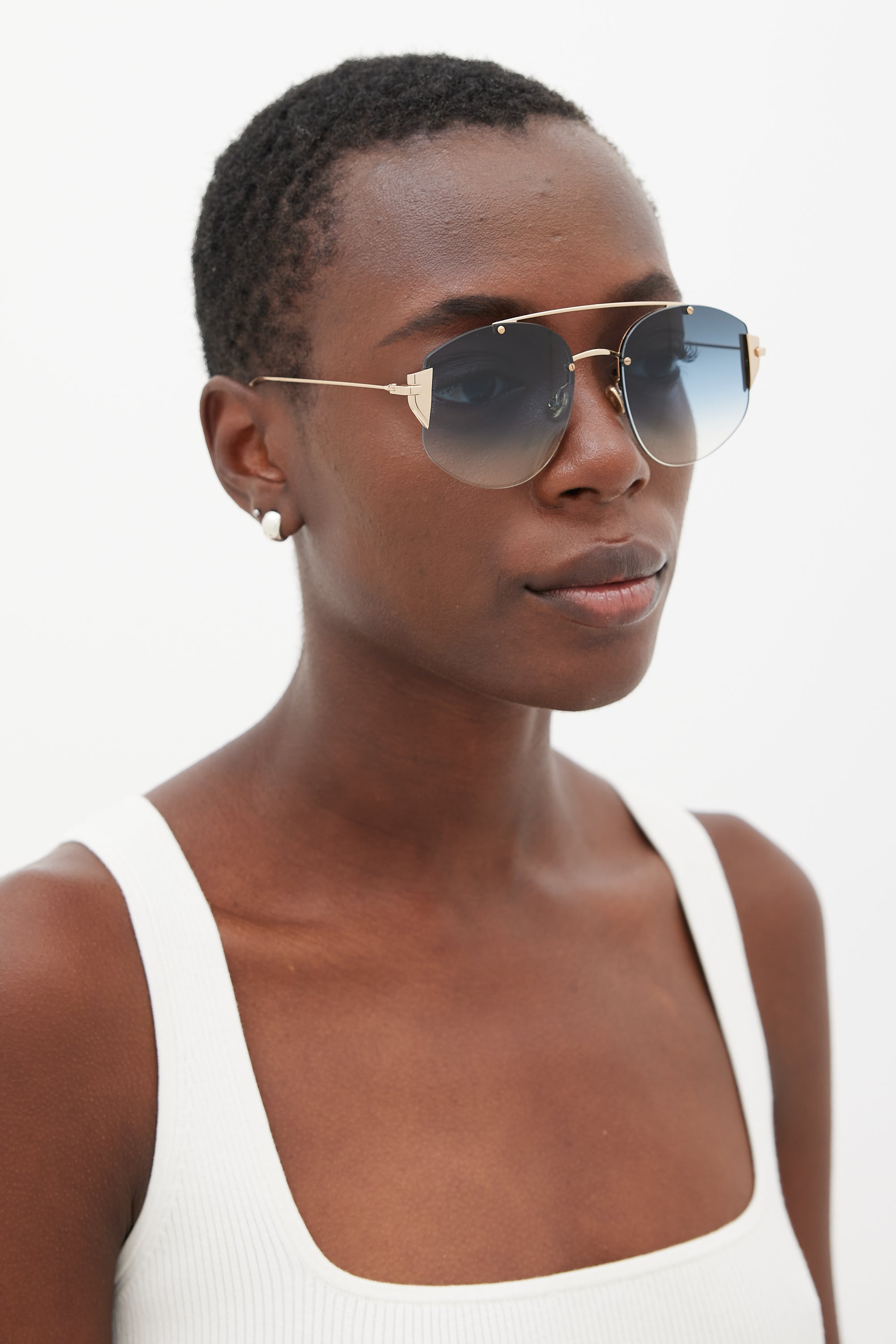 Pre-owned Dior gold 000NE sunglasses featuring a circular rimless frame, tinted lenses, nose pads, double brow bar, and embossed logo at temples. Comes with original case.