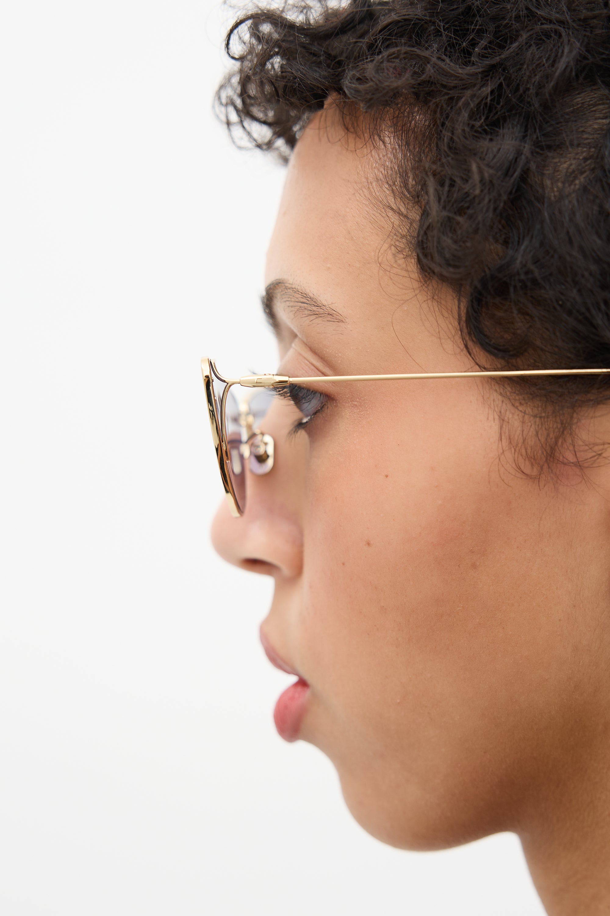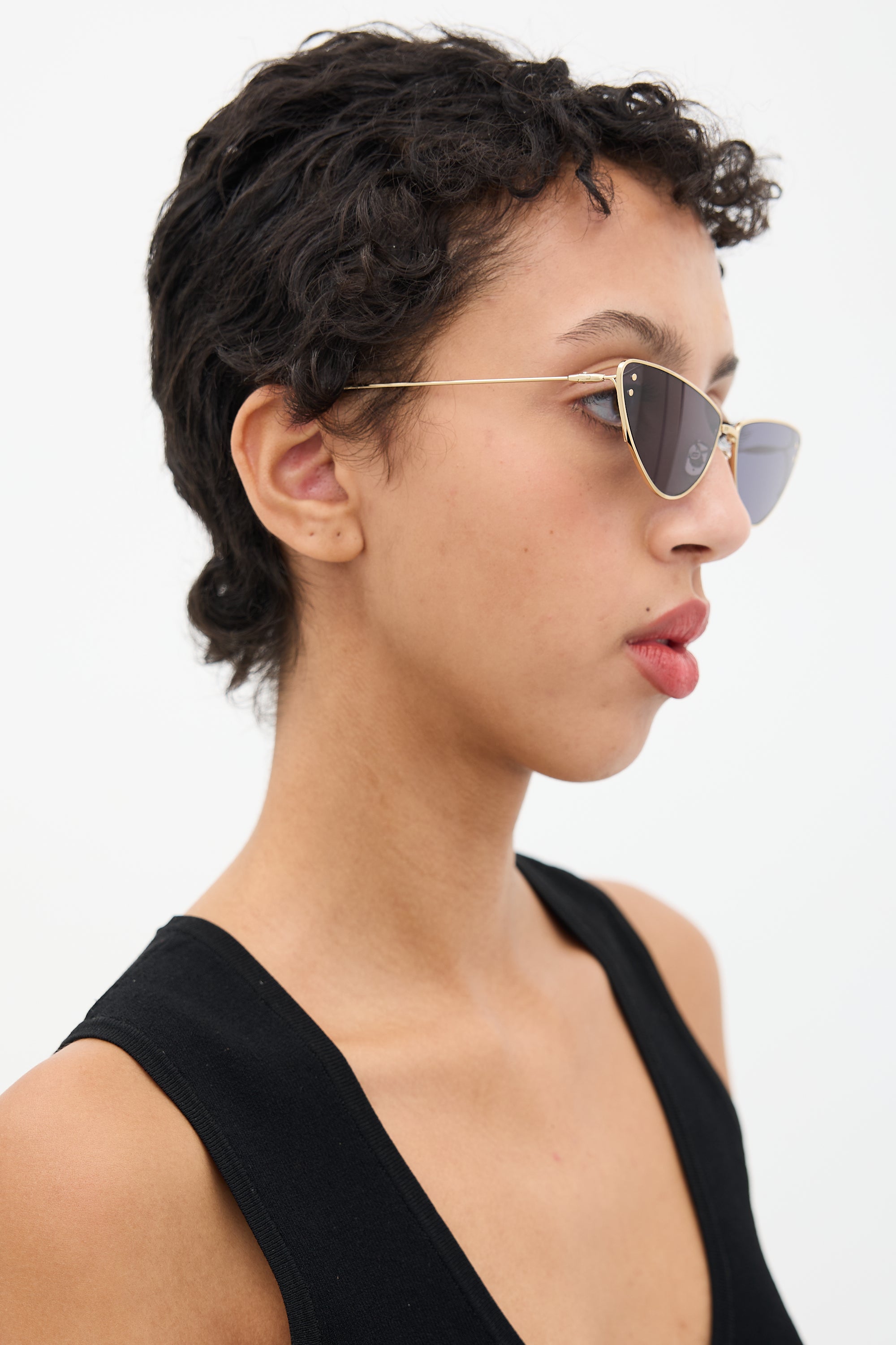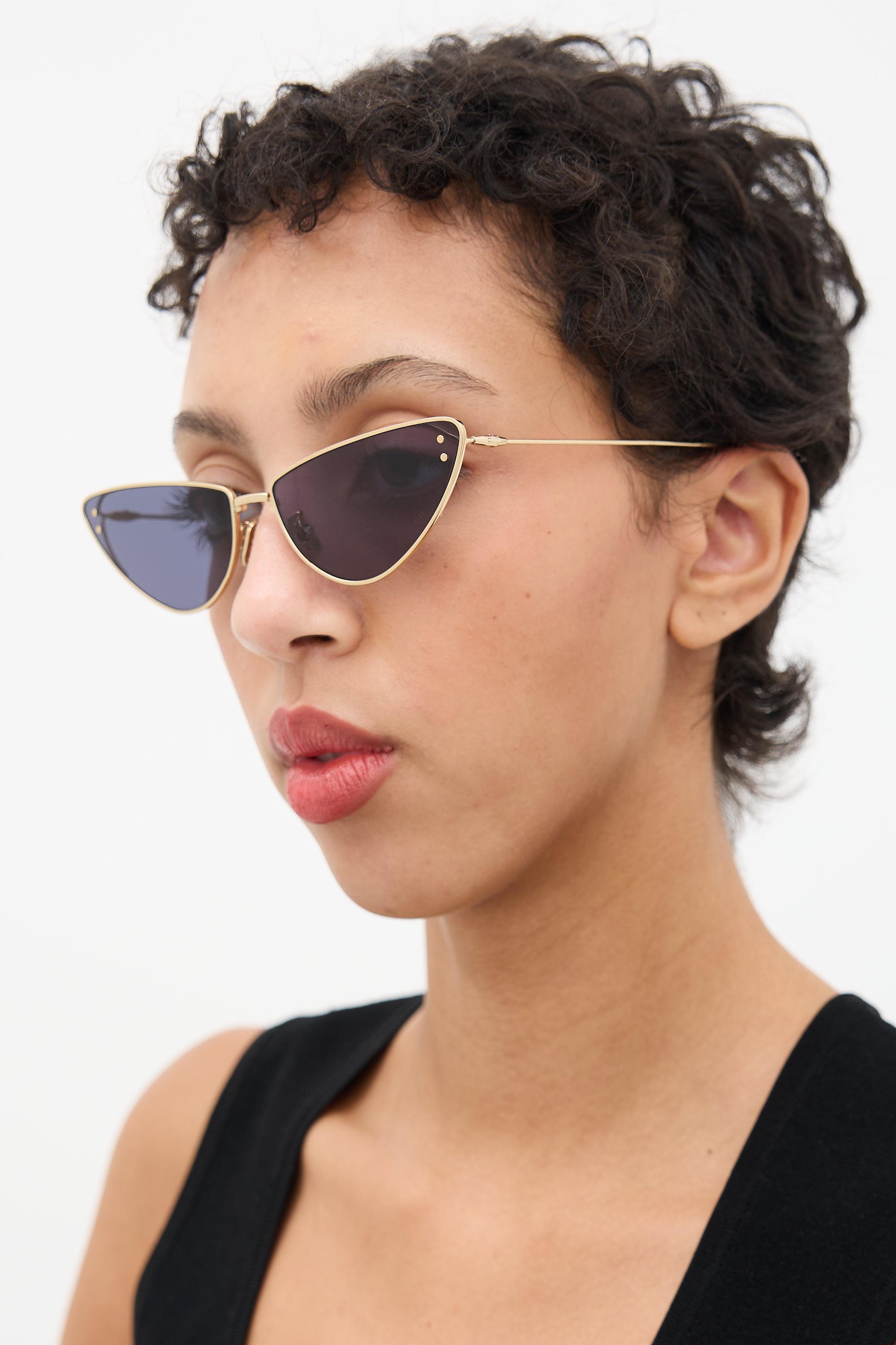 Pre-owned Dior CD40094U sunglasses featuring blue tinted lenses, gold tone wire tapered cat eye frame, and etched logo at bottom corner of left lens. Comes with original case.