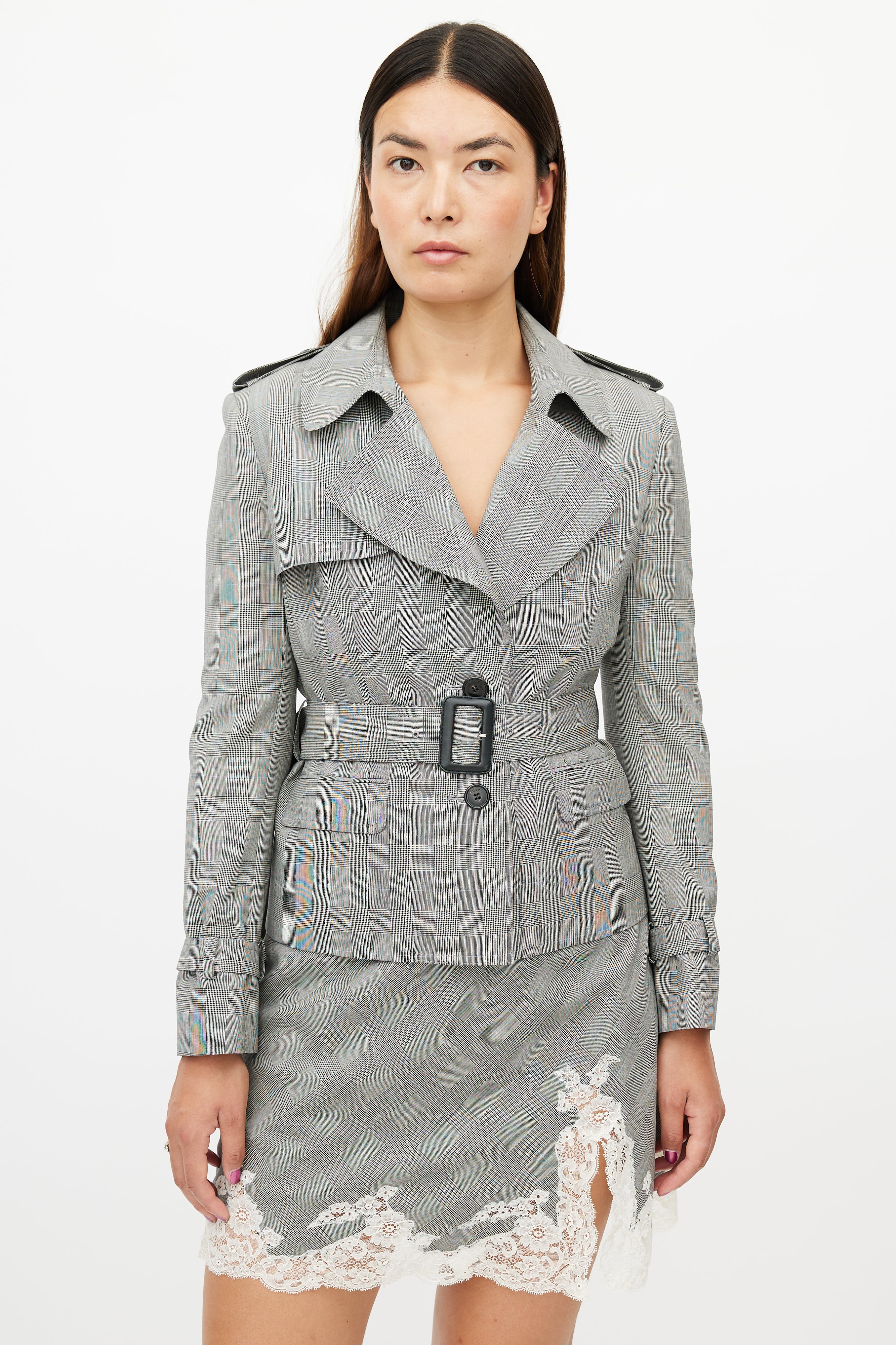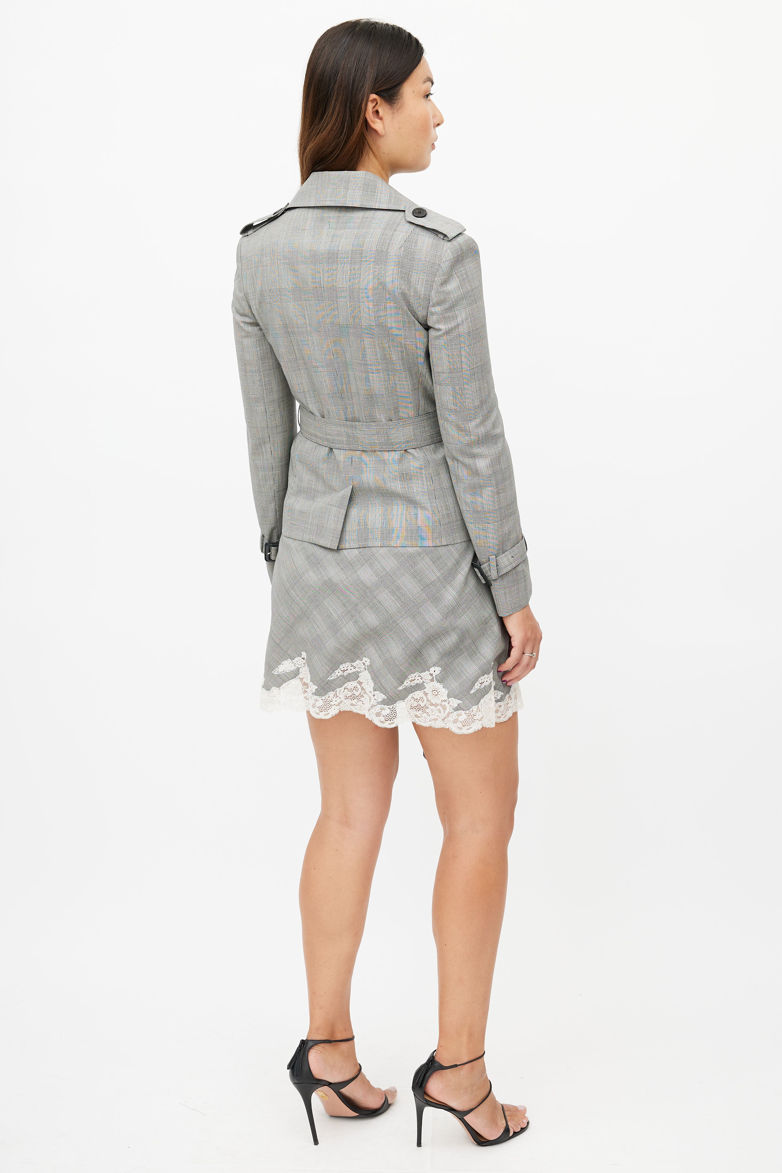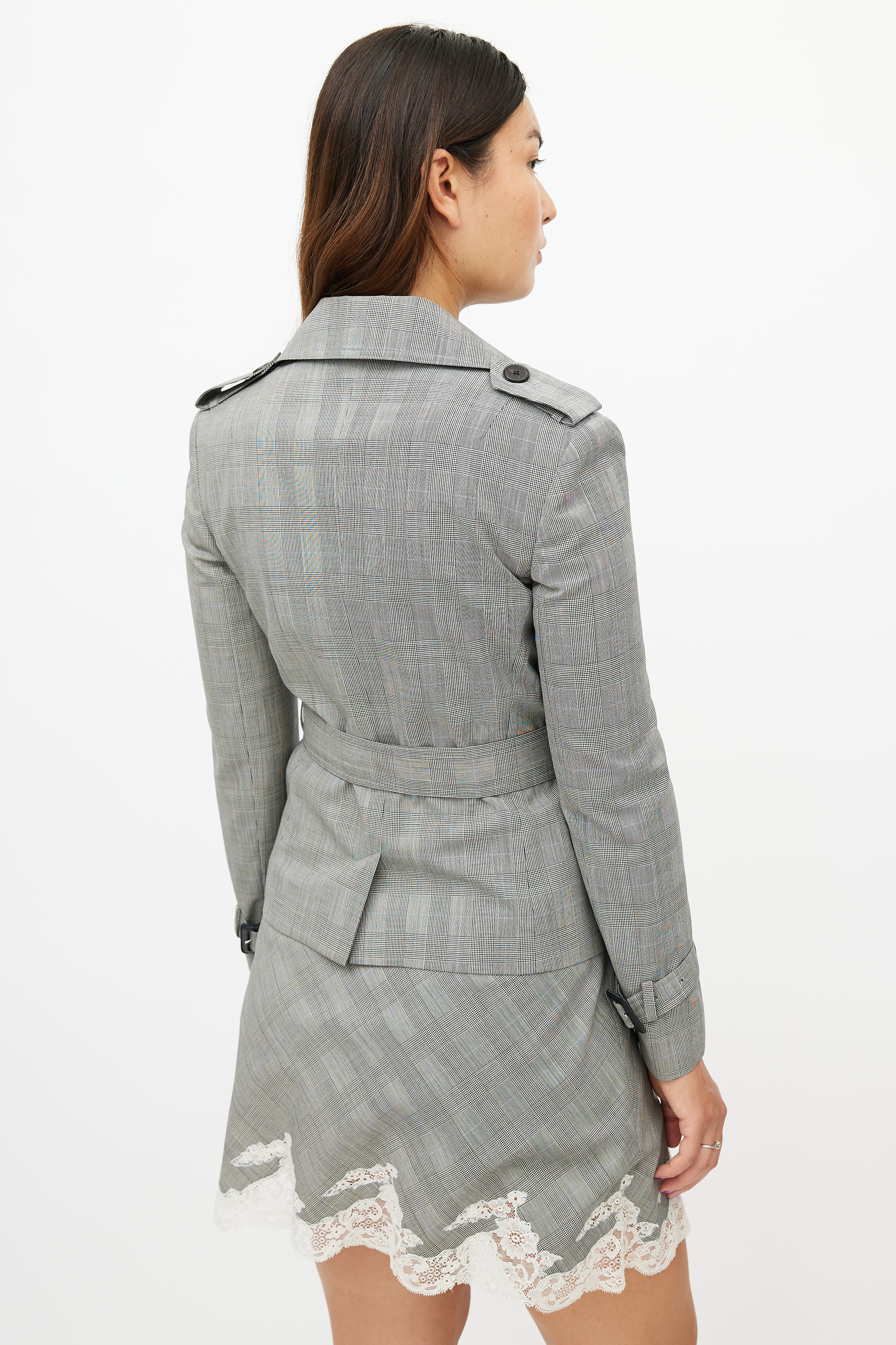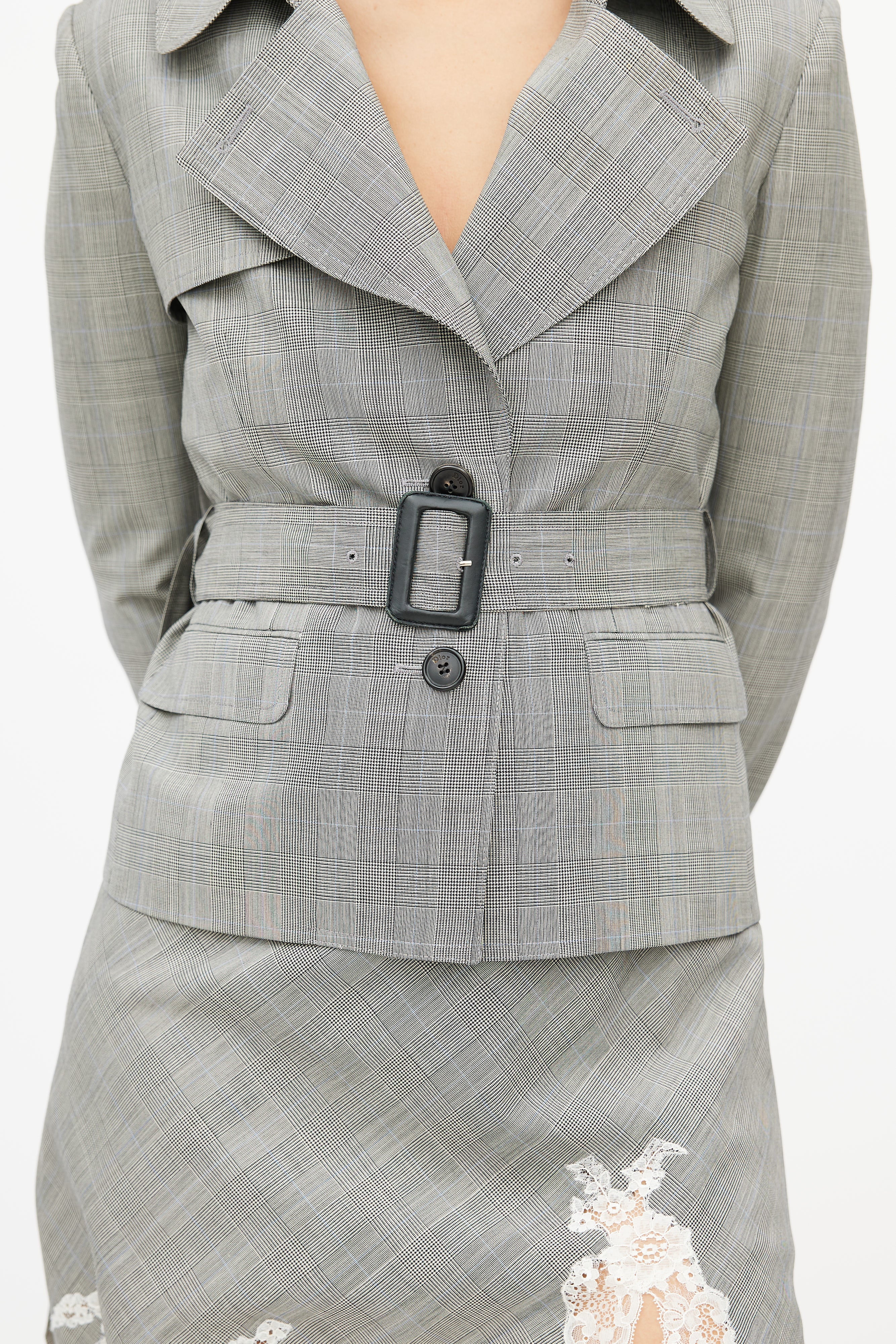 Pre-owned Spring 2010 Dior grey skirt suit featuring glen check print, jacket with notch lapel, shoulder flap, button up front, wrist panel with buckle fastening, two flap pockets, and waist belt. Matching skirt featuring fixed waistband, concealed zip closure at side, and white lace hem. John Galliano era design.