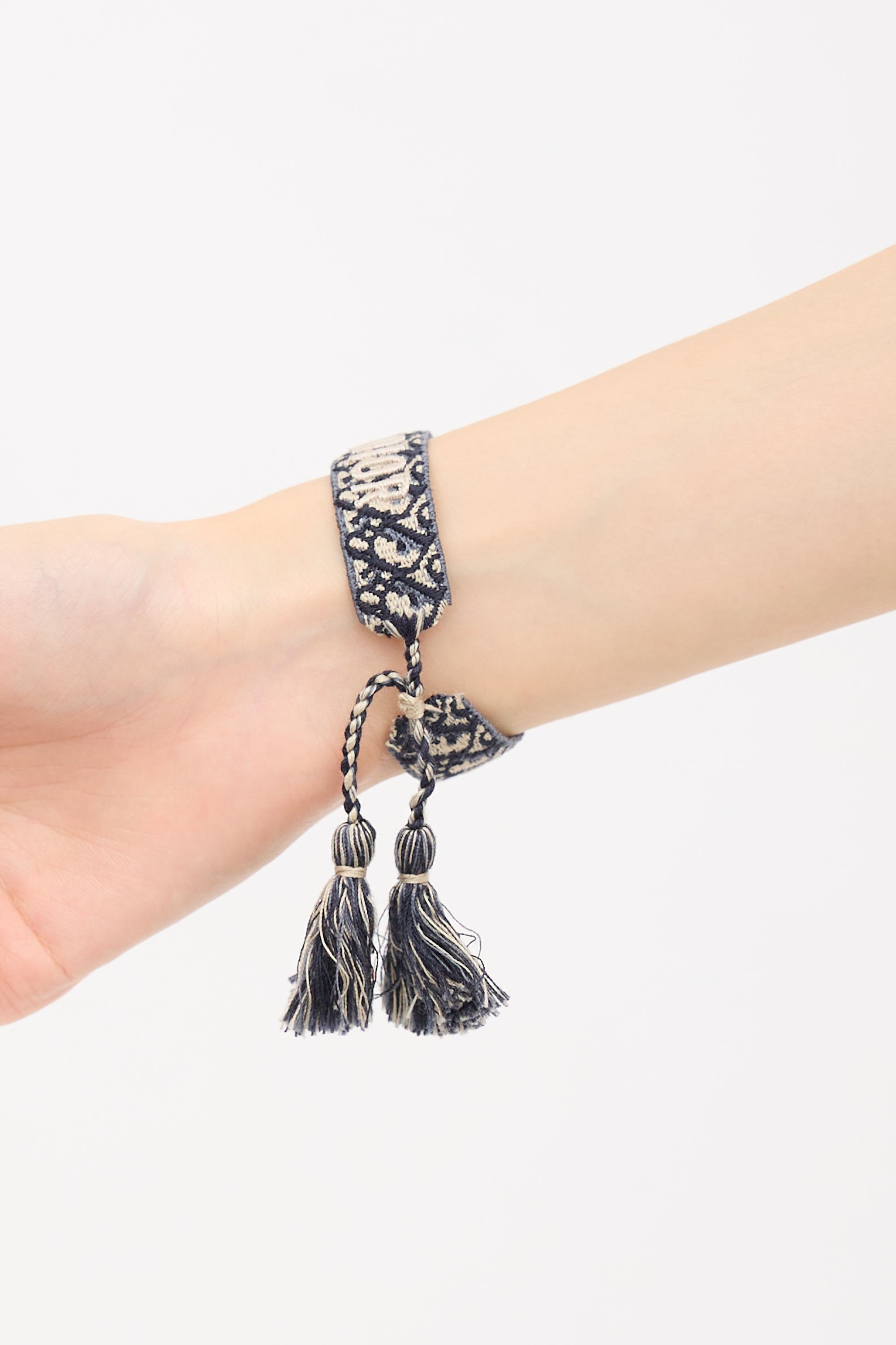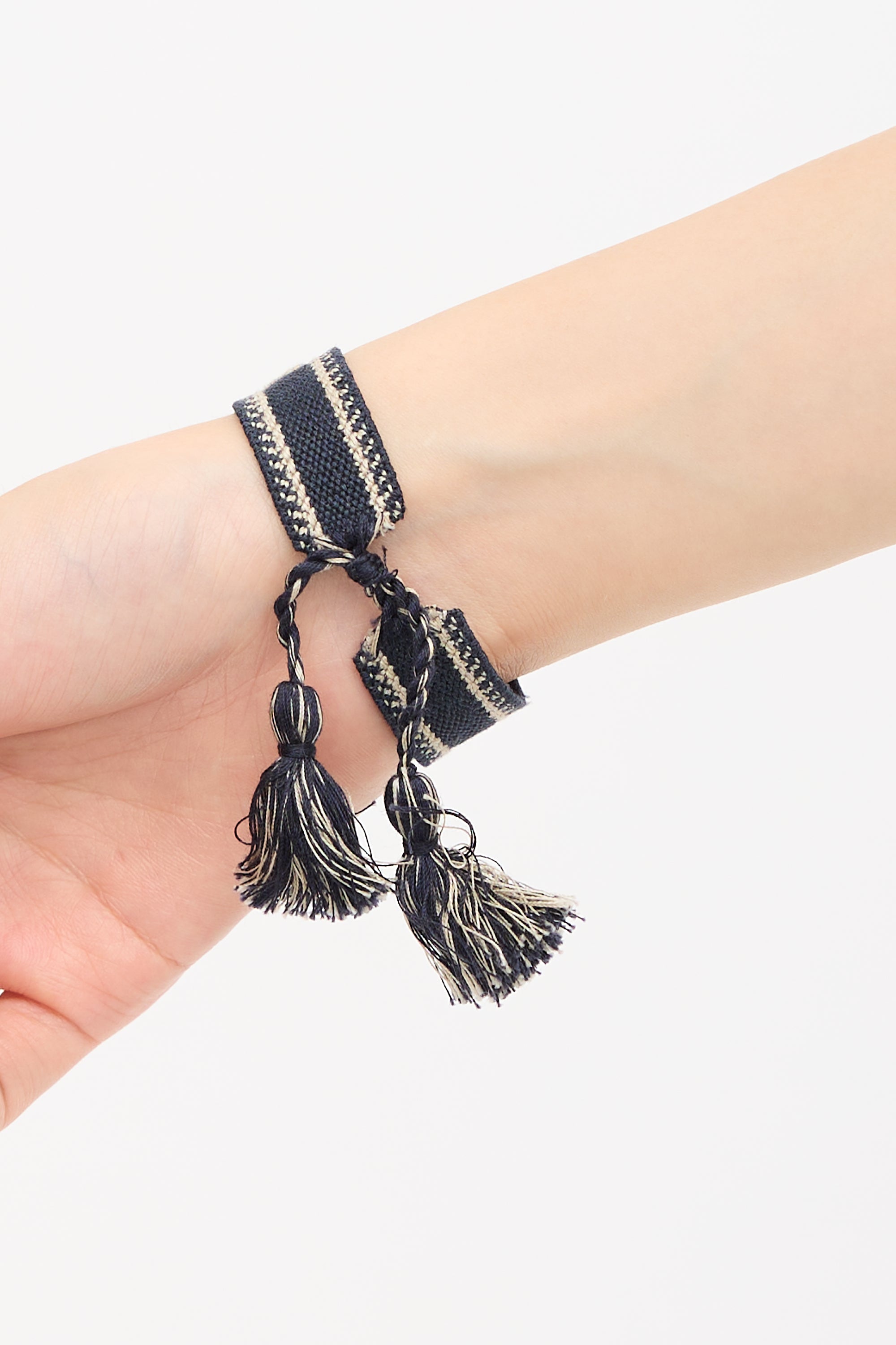 Pre-owned Christian Dior navy and beige J'Adior Friendship bracelet featuring tonal embroidered logo at band and adjustable tassel closure. Matching bracelet with Oblique Jacquard band. Comes with original dust bag.
