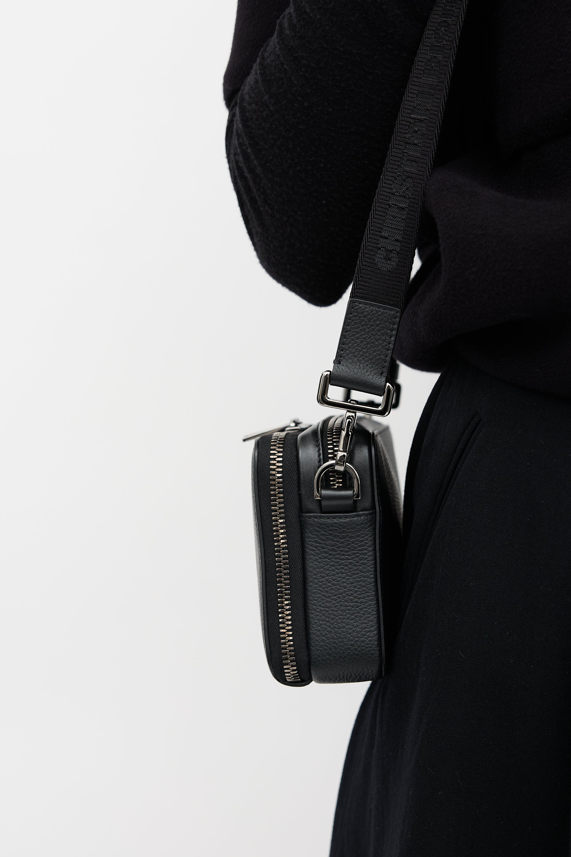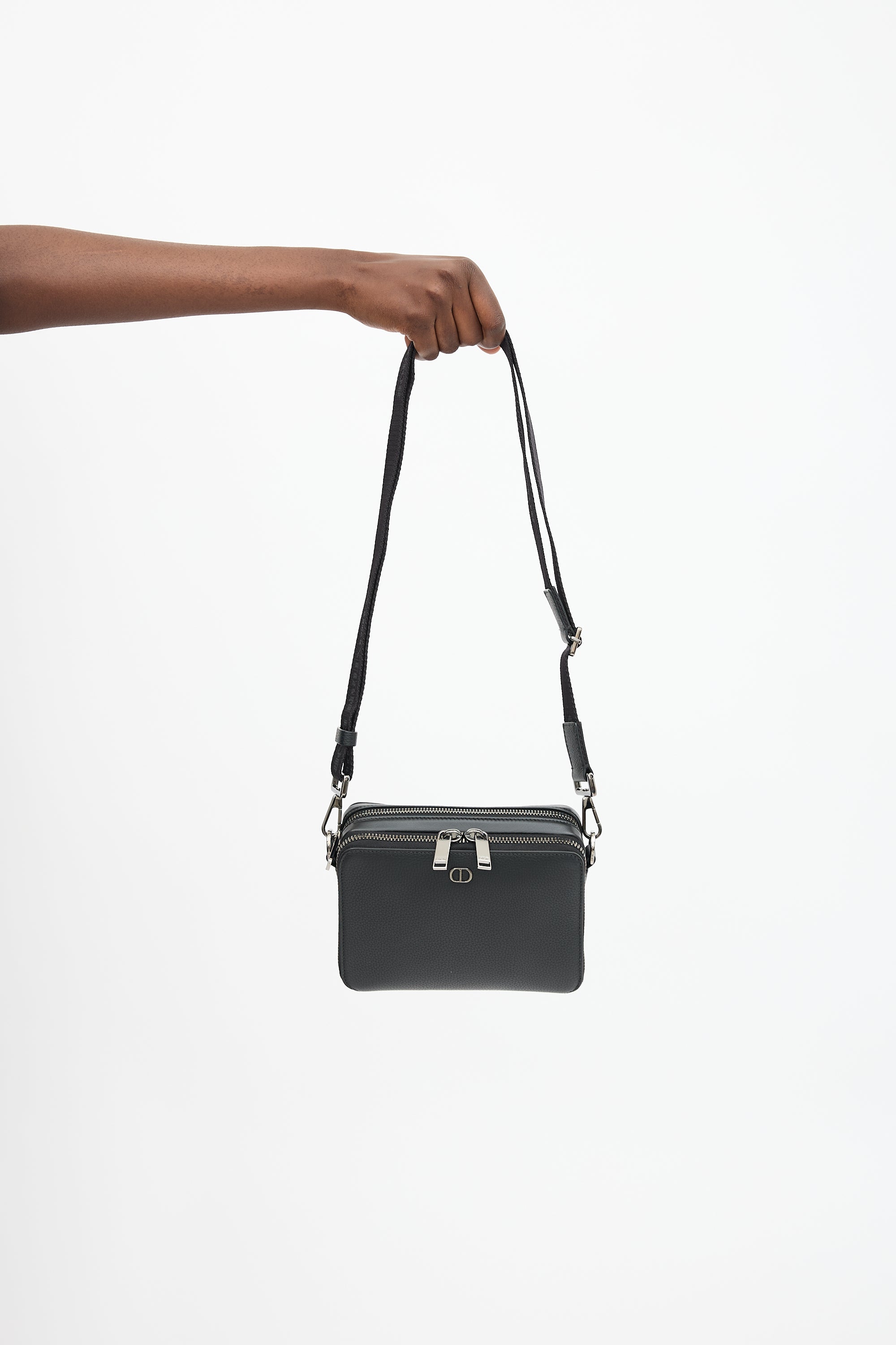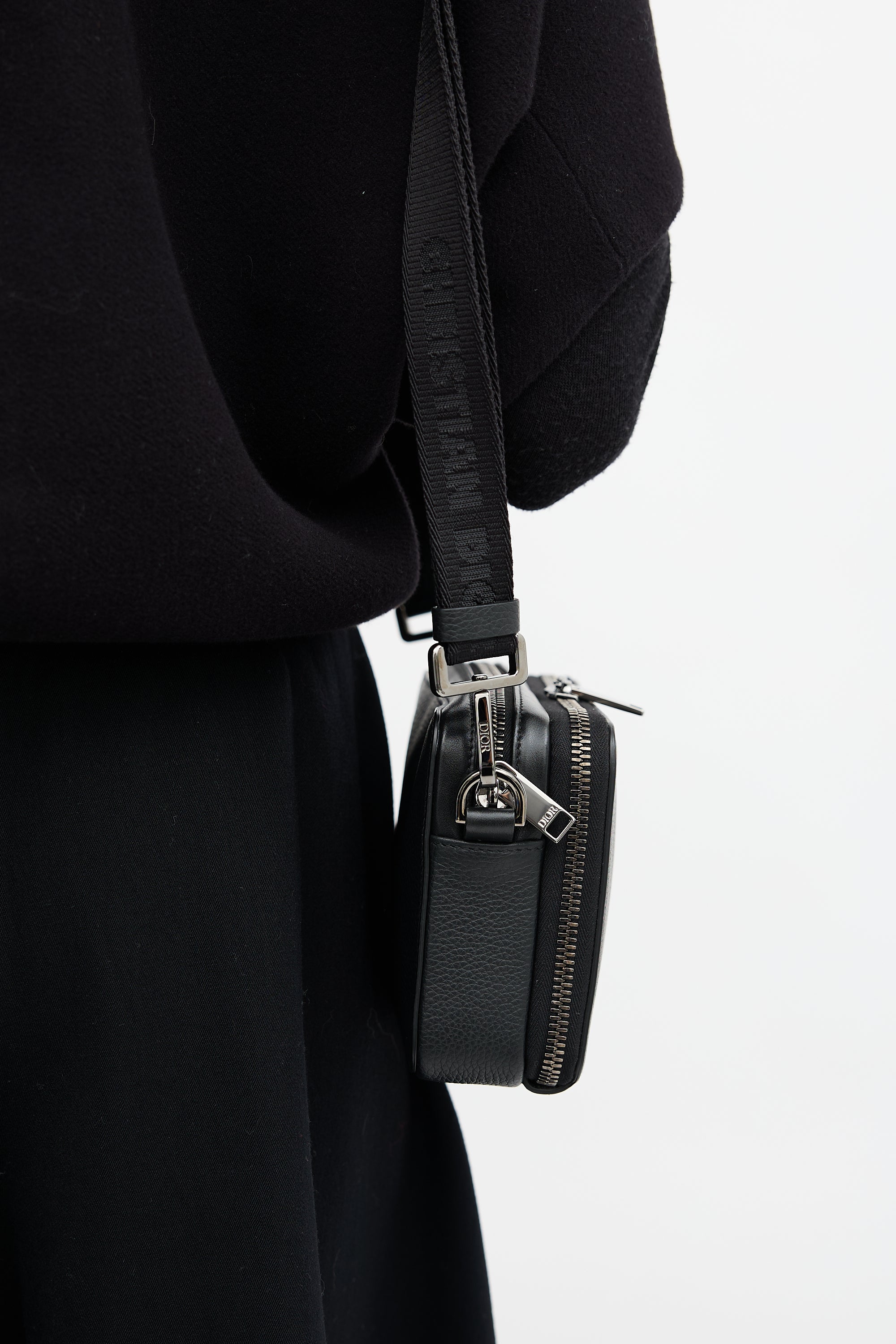 Pre-owned Dior black leather CD Icon Zipped Pouch bag featuring gunmetal hardware, front logo embellishment, adjustable jacquard logo strap, two lined main compartments with zip around closure, and one slip pocket and four card slots at front compartment. Comes with original dust bag and certificate of authenticity card.