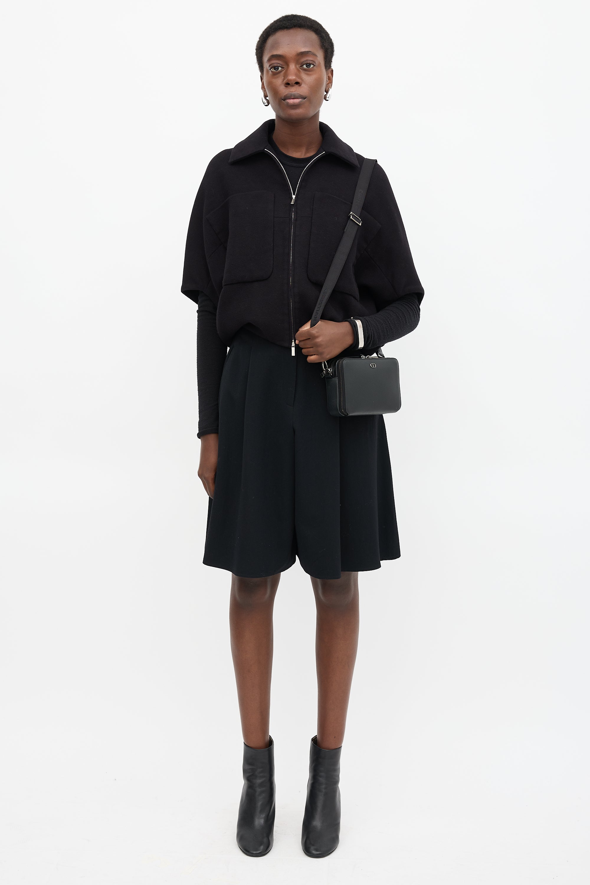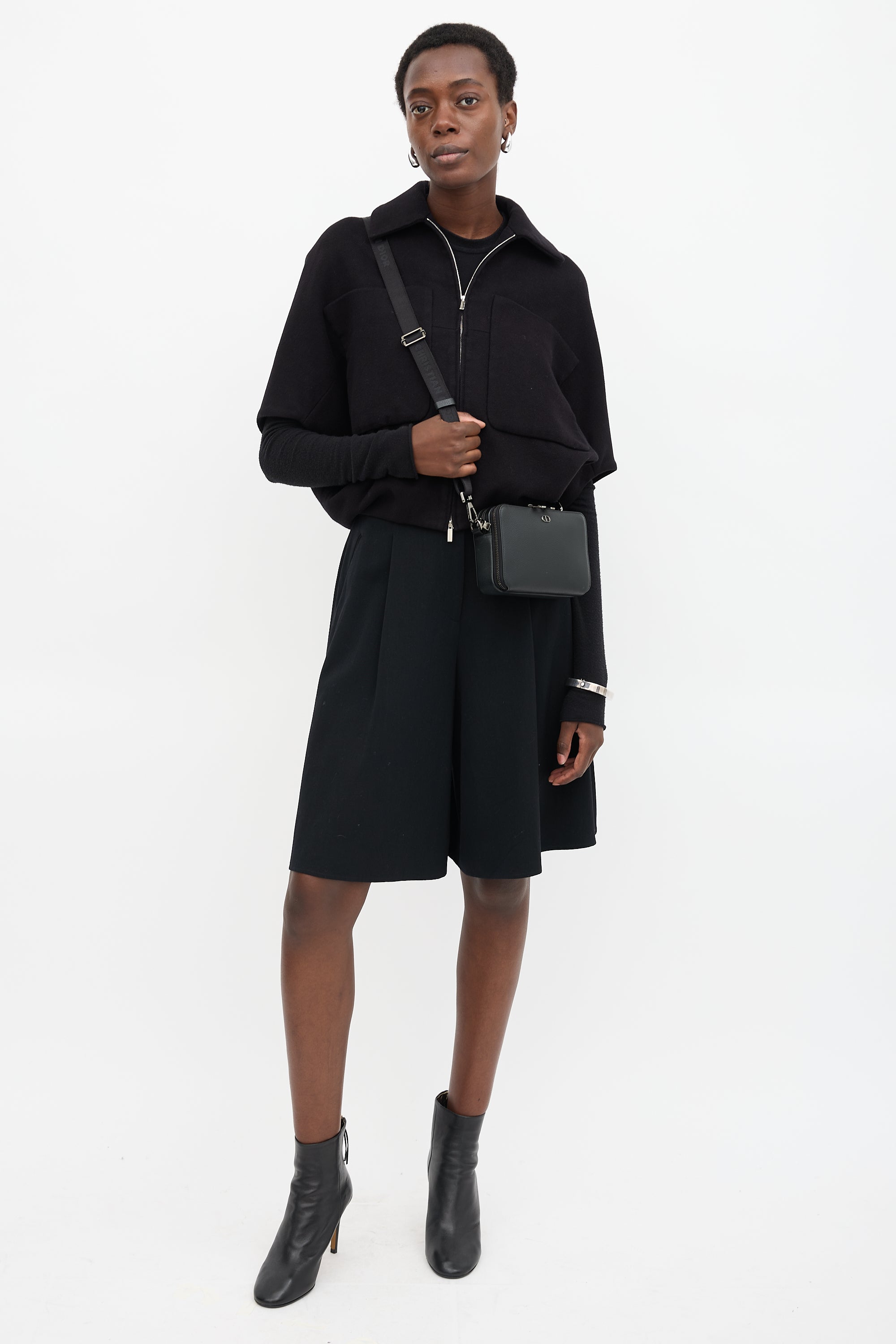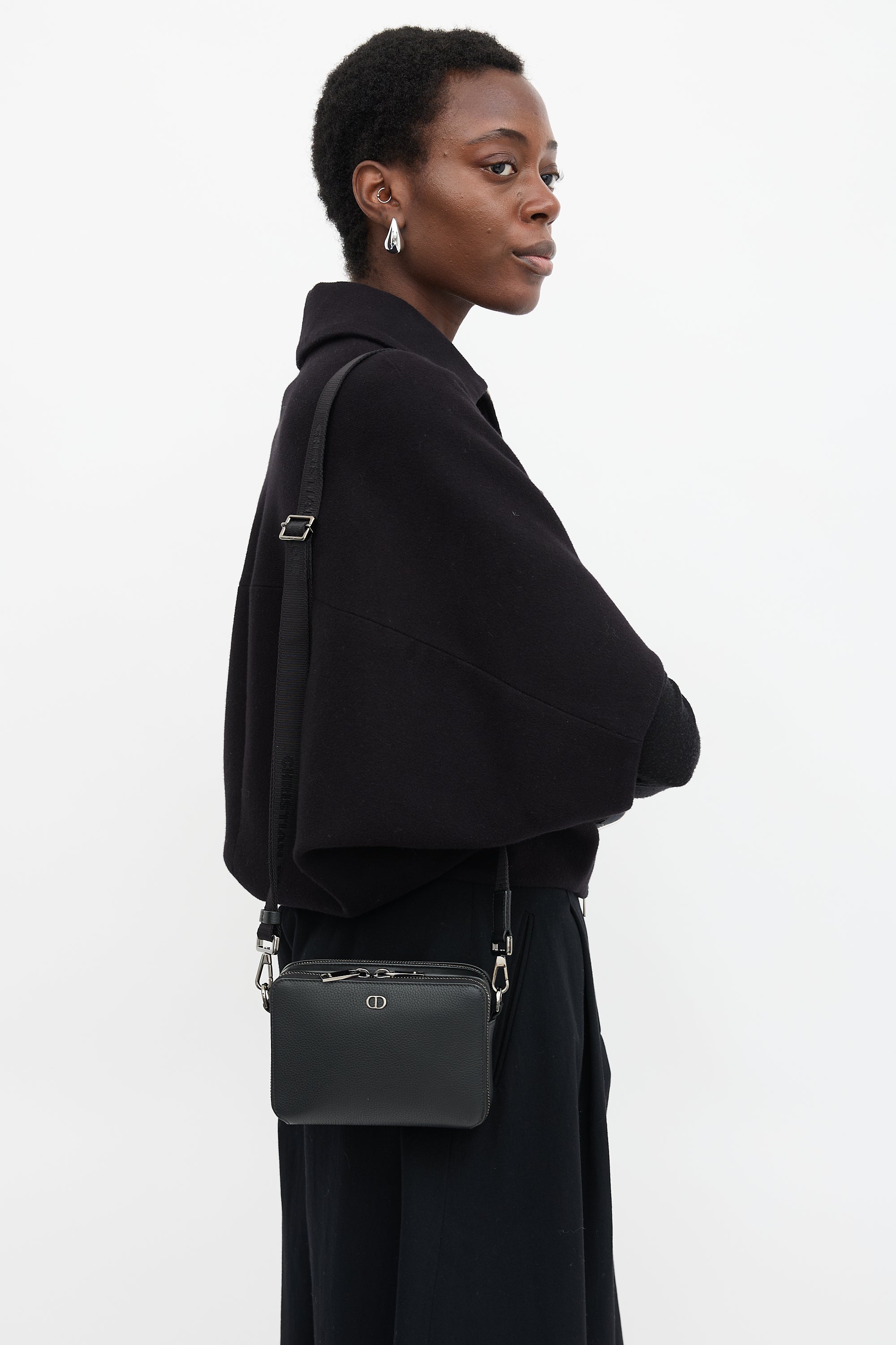 Pre-owned Dior black leather CD Icon Zipped Pouch bag featuring gunmetal hardware, front logo embellishment, adjustable jacquard logo strap, two lined main compartments with zip around closure, and one slip pocket and four card slots at front compartment. Comes with original dust bag and certificate of authenticity card.