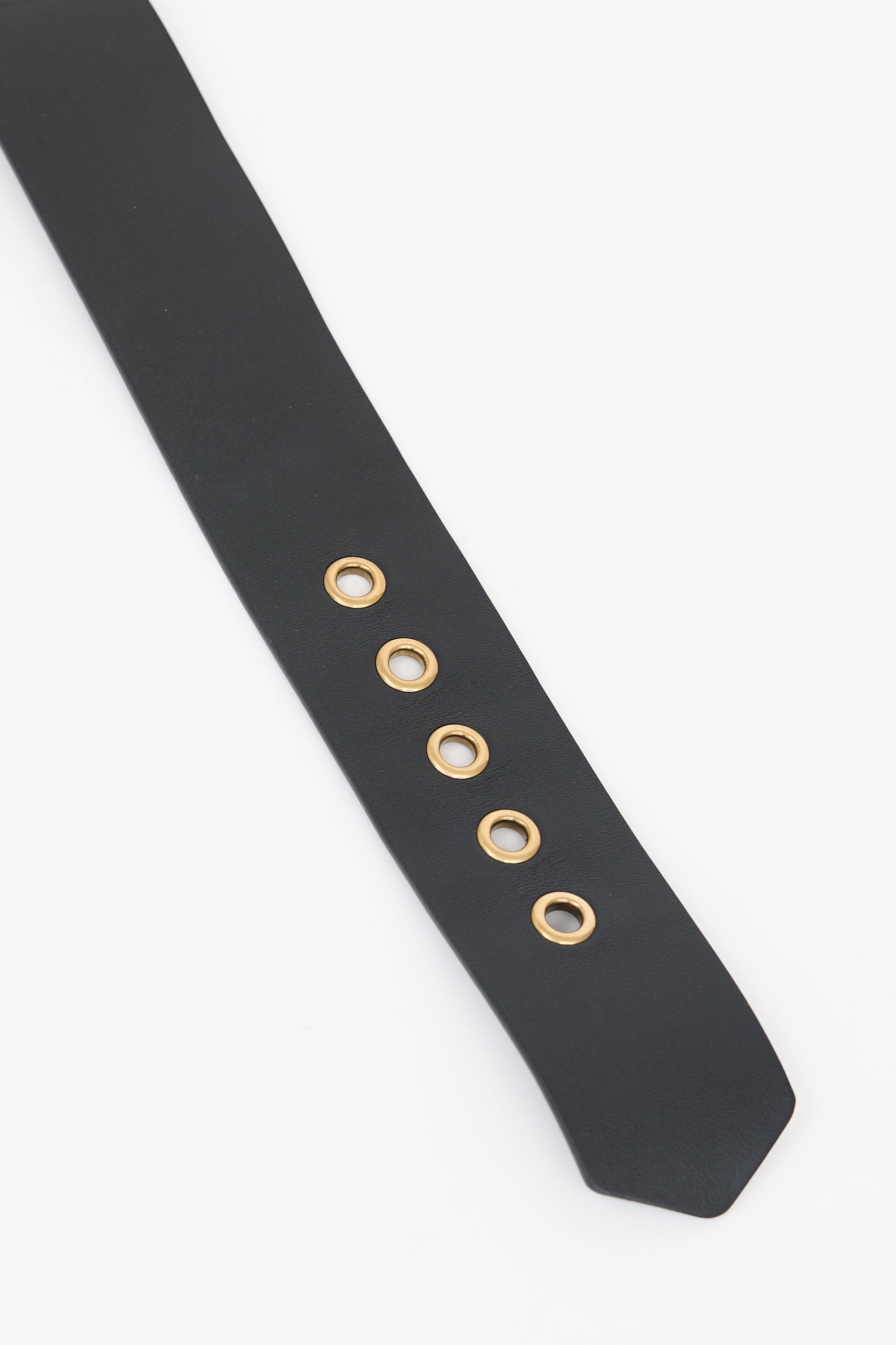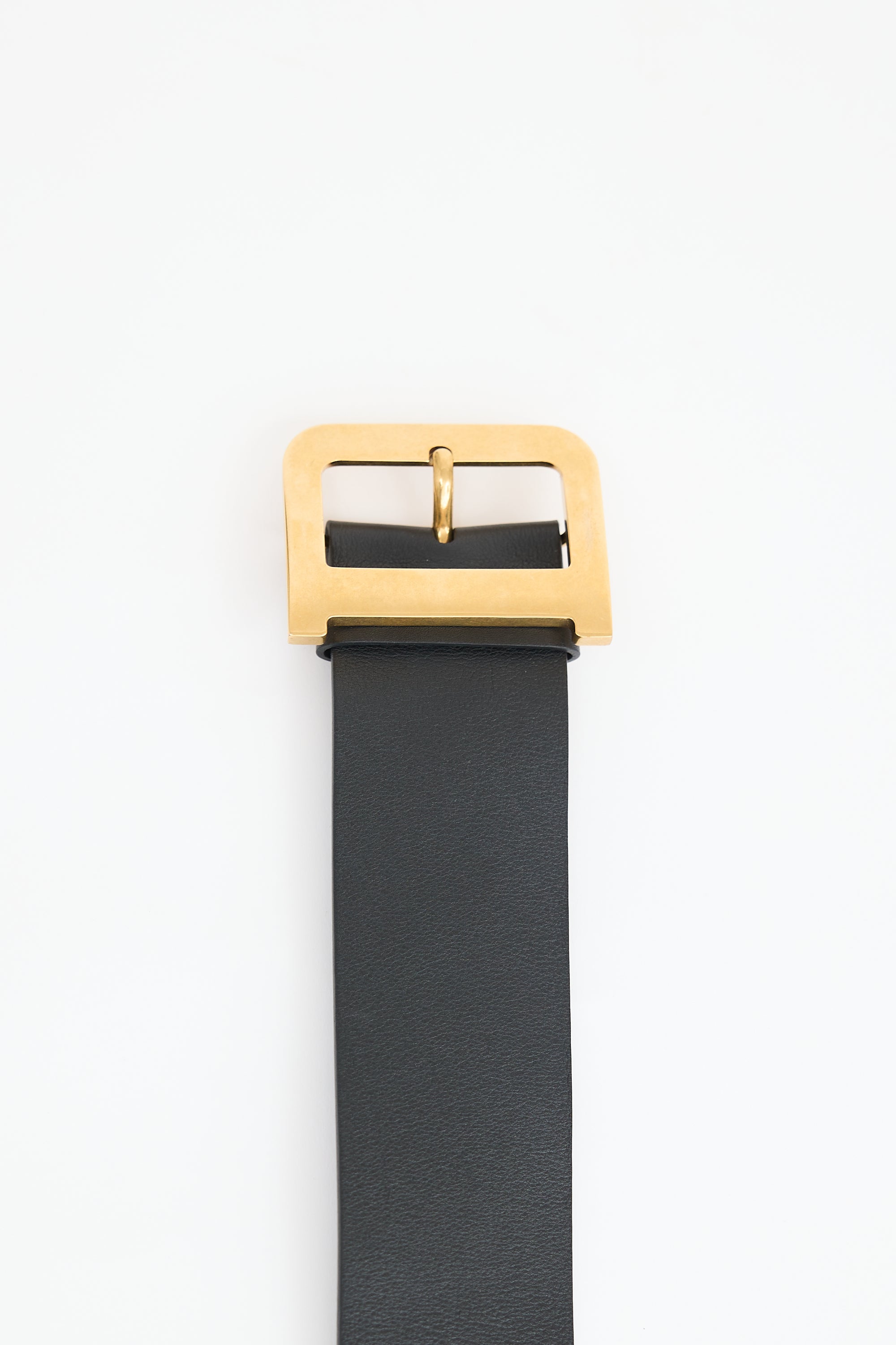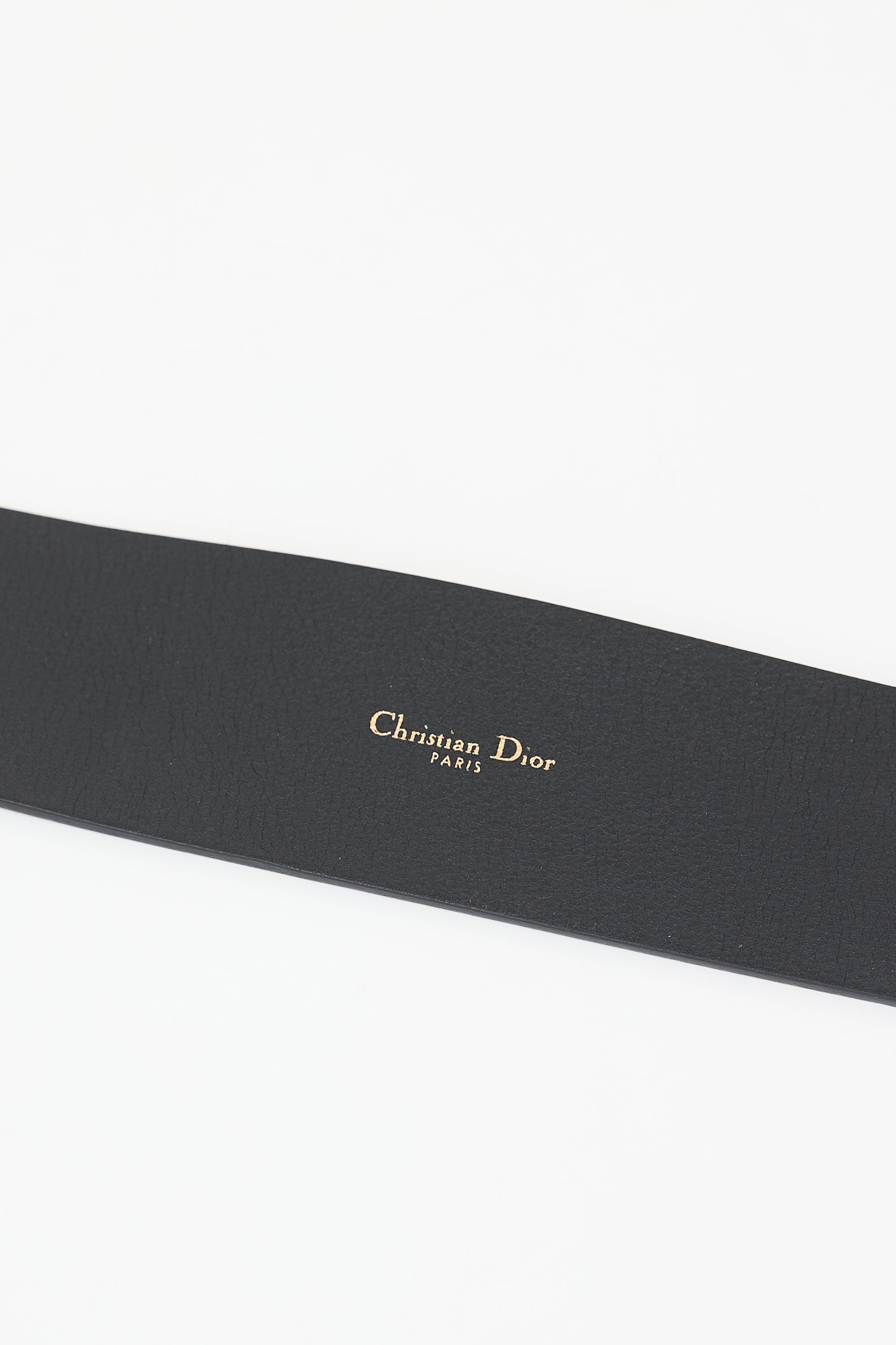 Pre-owned Dior black leather Diorquake wide belt featuring gold tone "D" buckle and stamped logo at reverse.