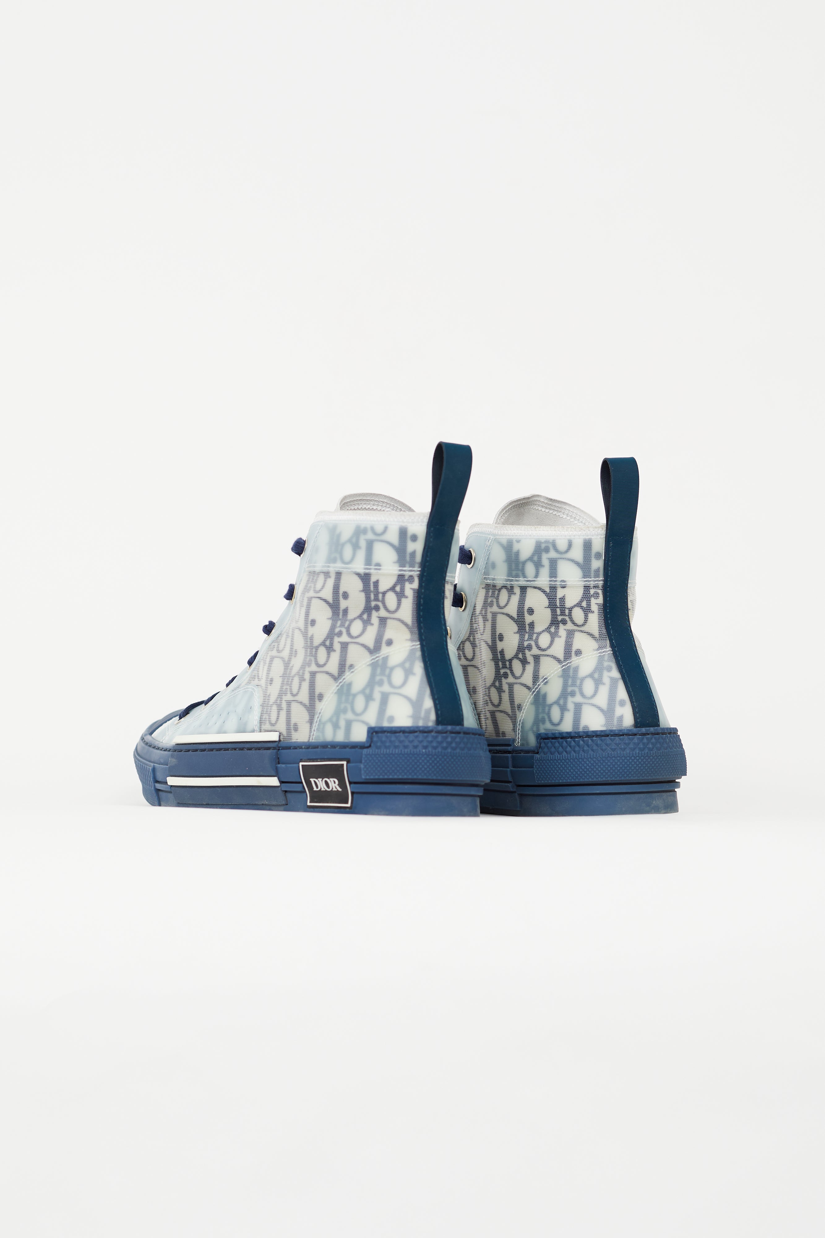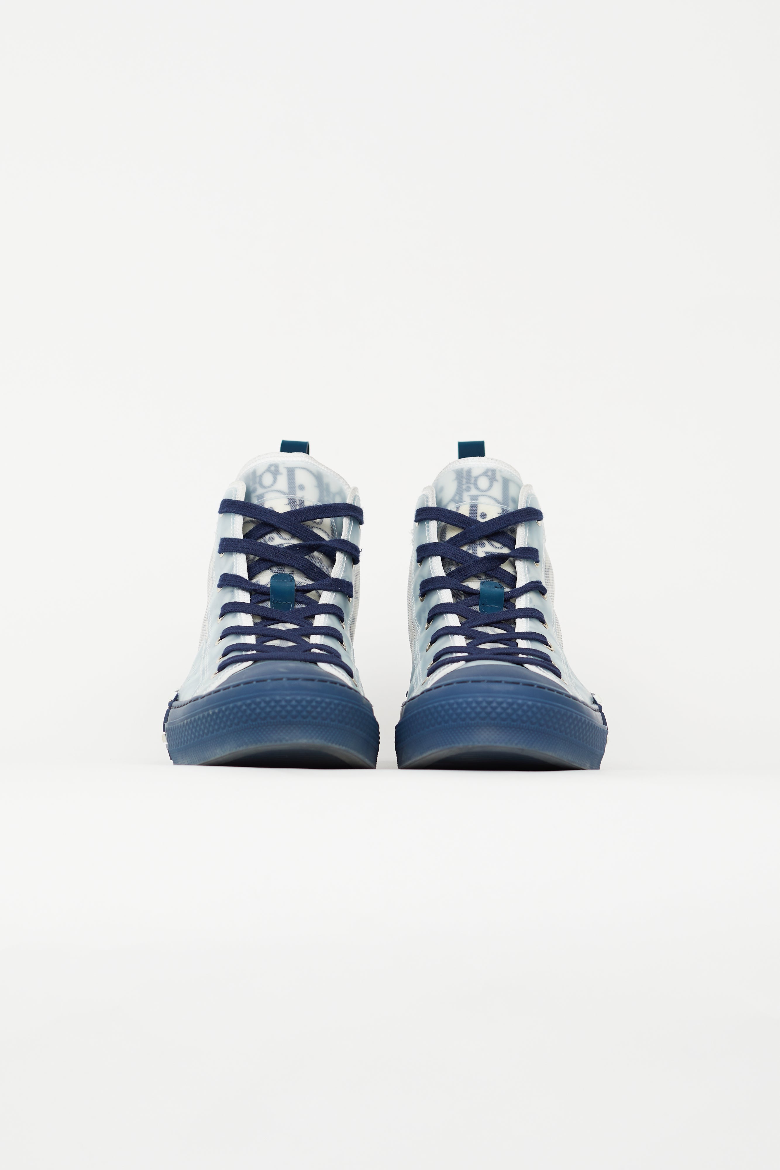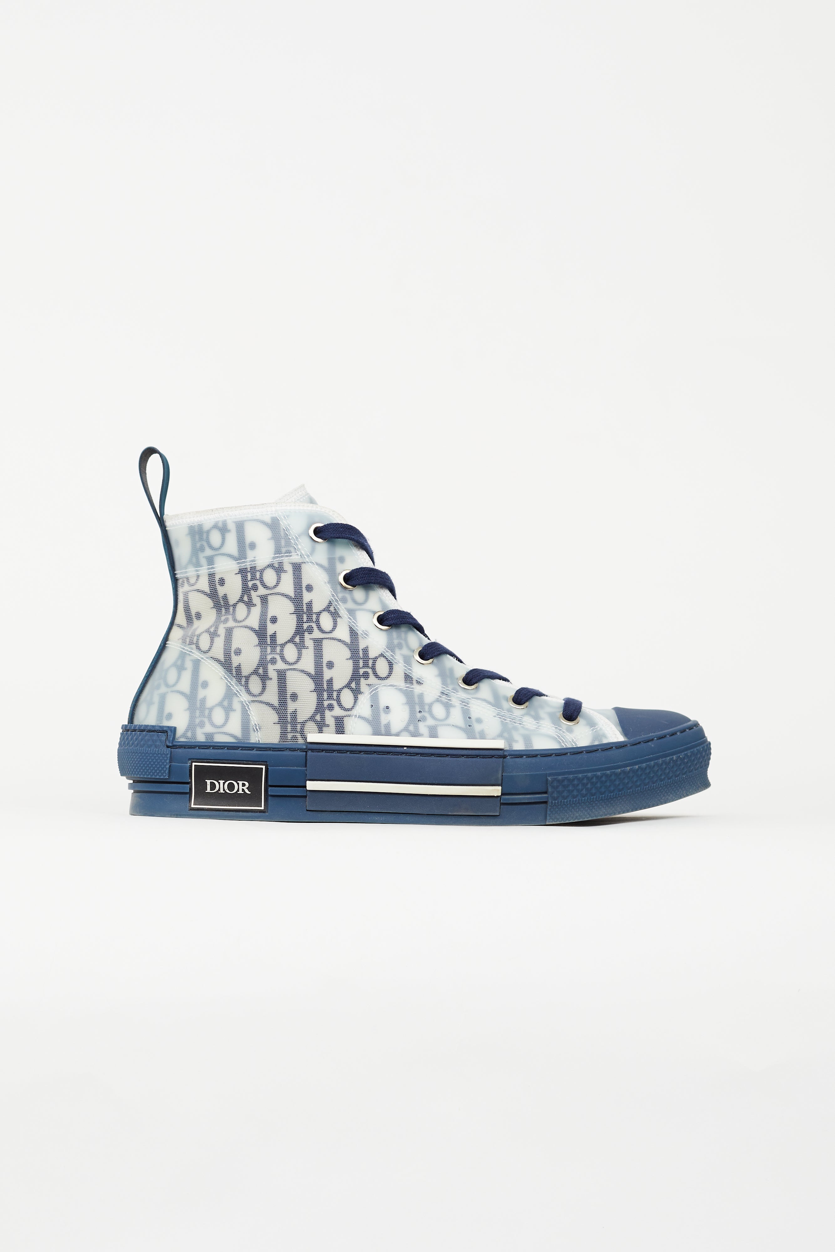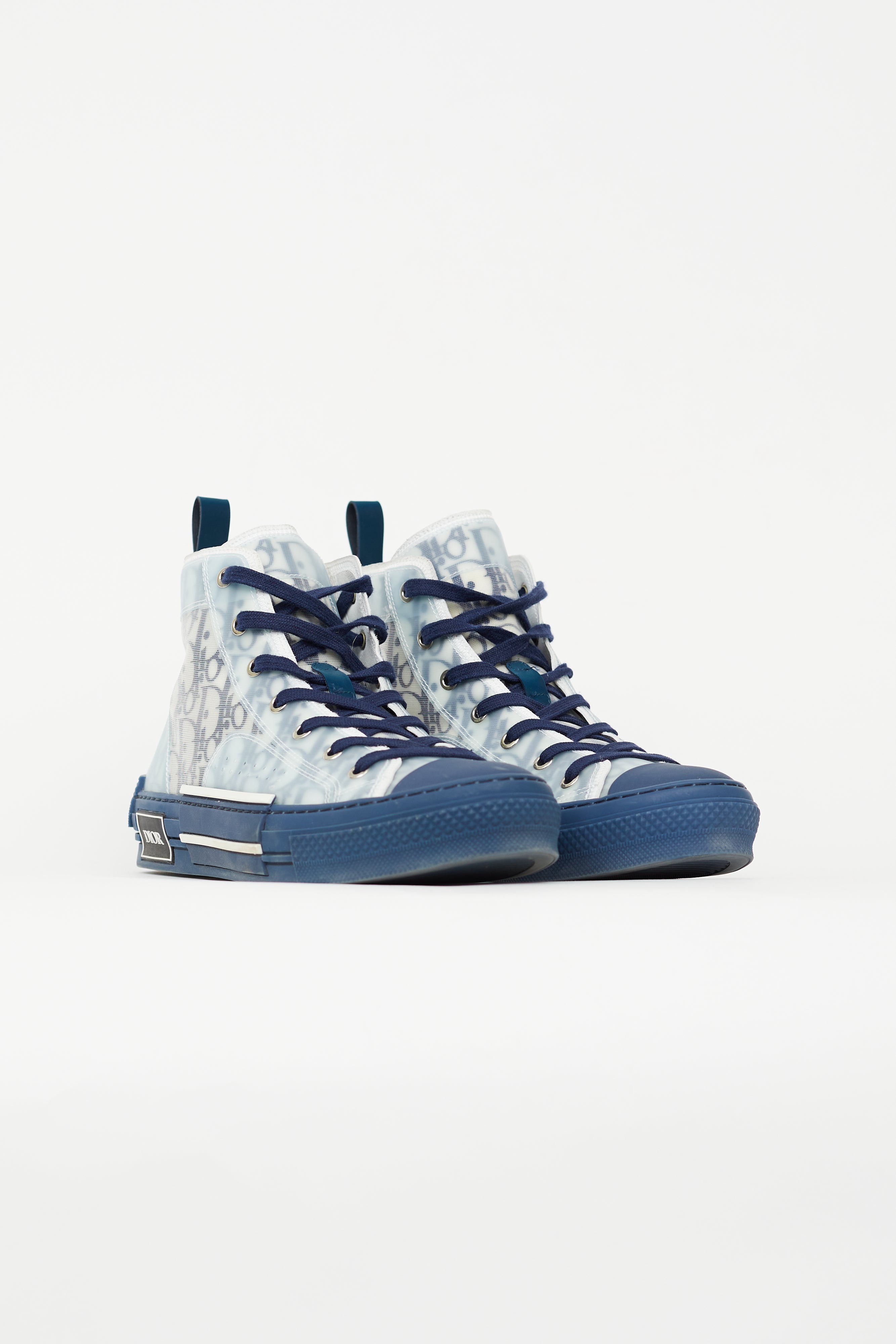 Pre-owned Dior navy B23 sneakers featuring rounded toe, lace up vamp, monogram Dior Oblique mesh upper, navy rubberized tab at back, spliced midsole, and black and white rubberized logo at side. Comes with original box.
