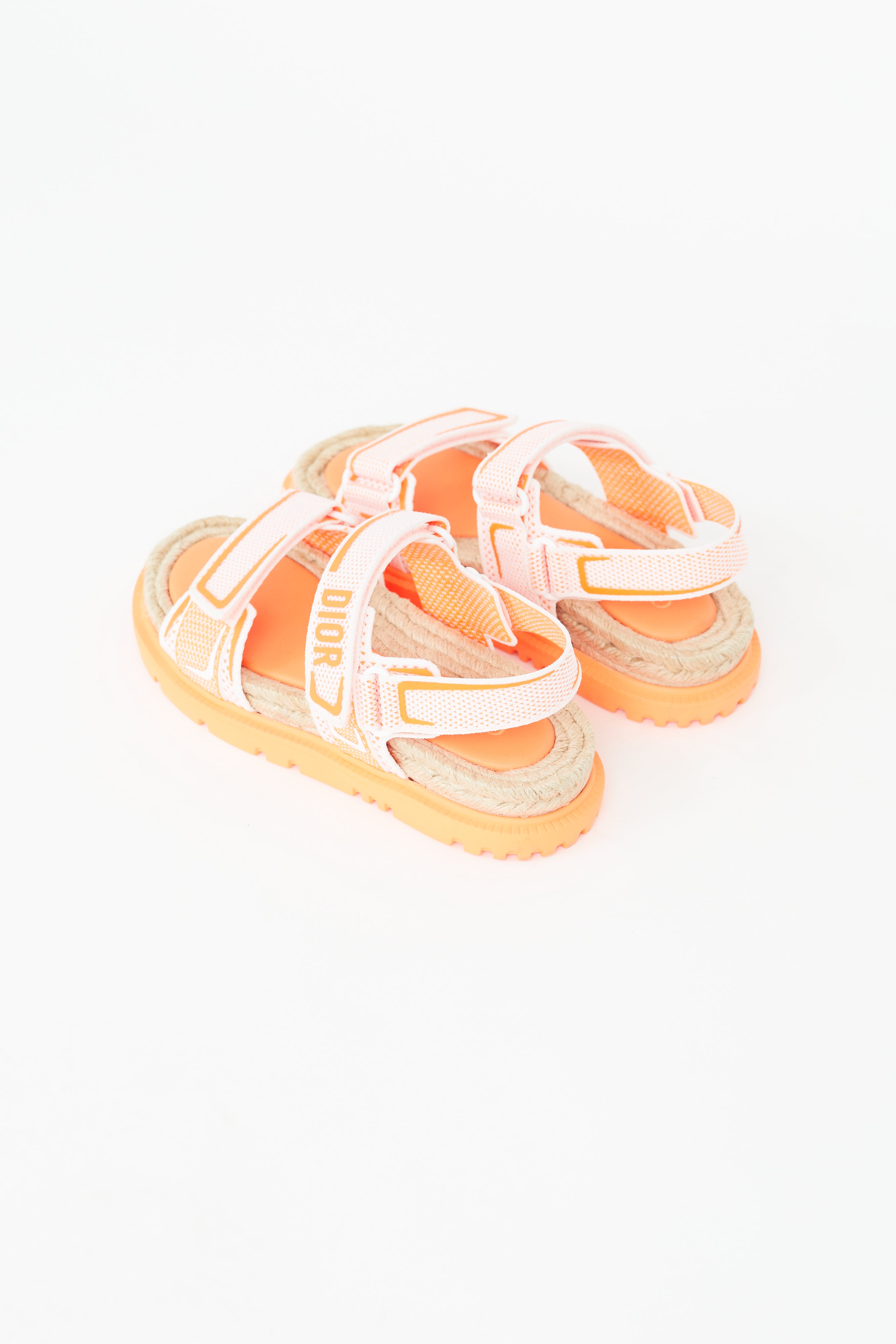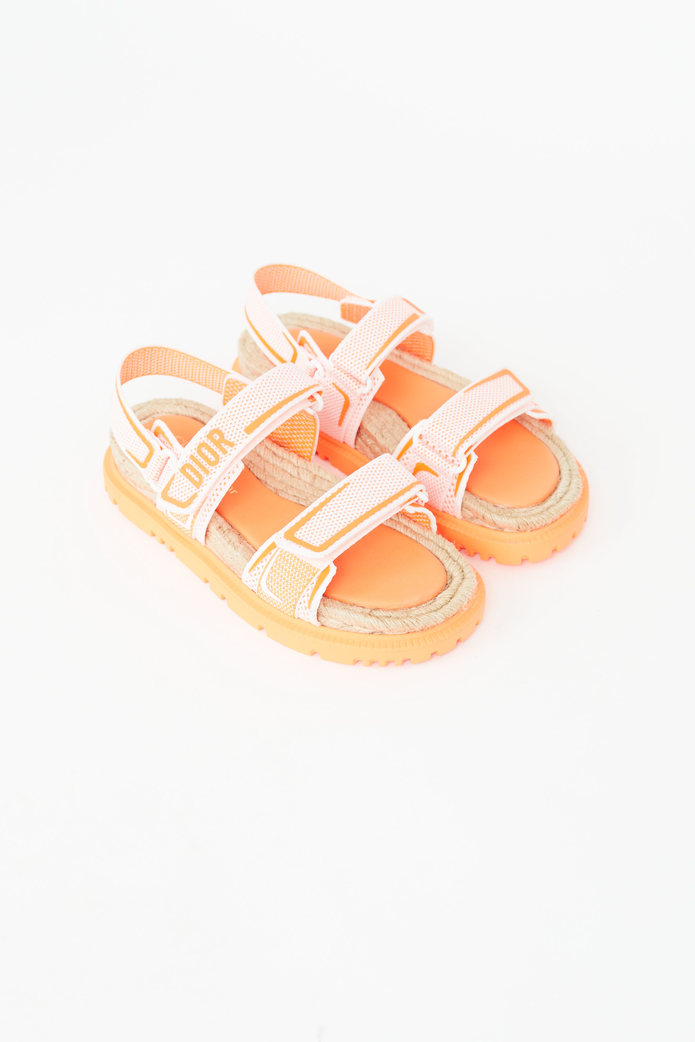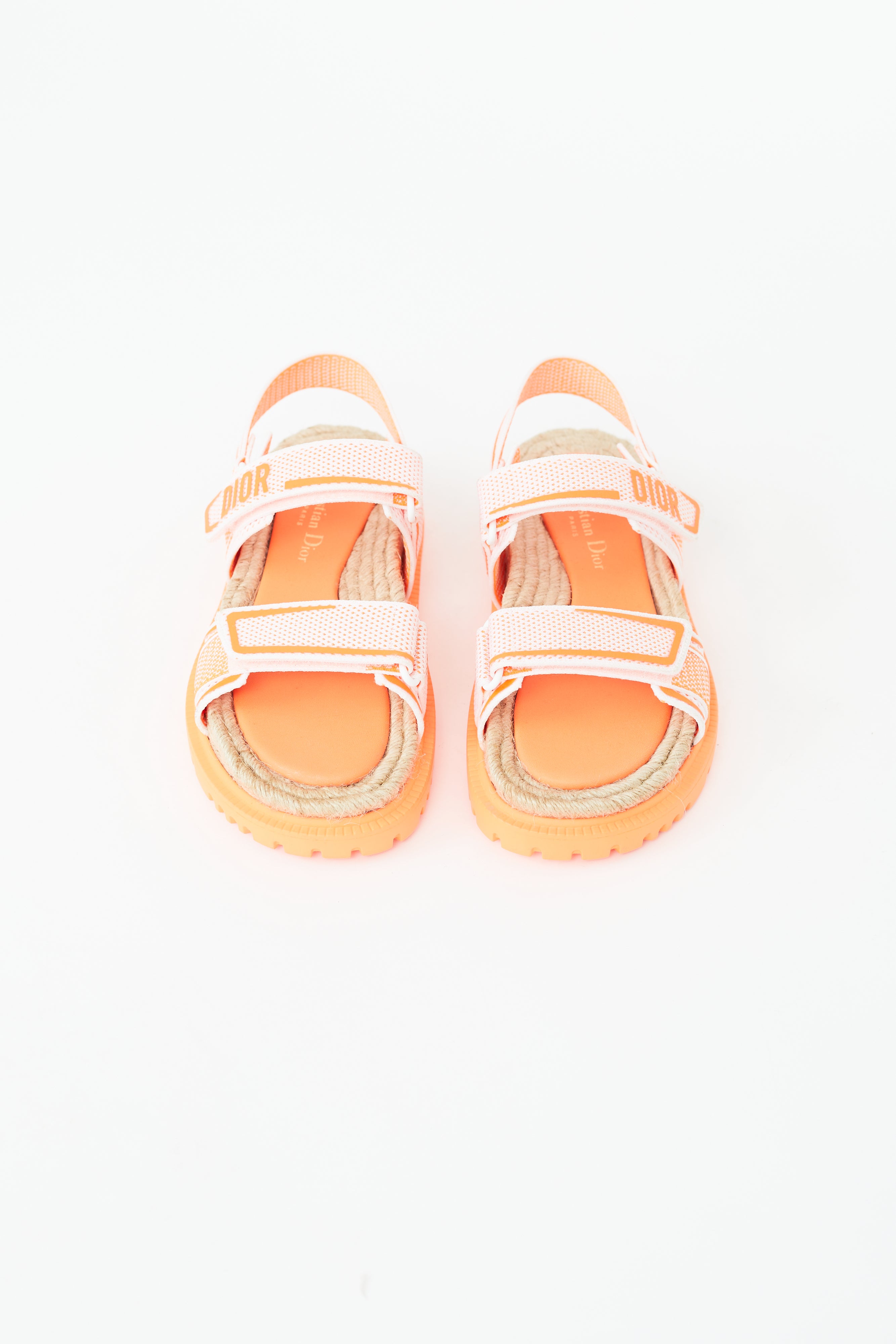 Pre-owned Dior orange Dioract sandals featuring open rounded toe, orange and white Velcro straps with rubberized logo, slingback, braided trim midsole, and neon orange rubber ridged outsole.